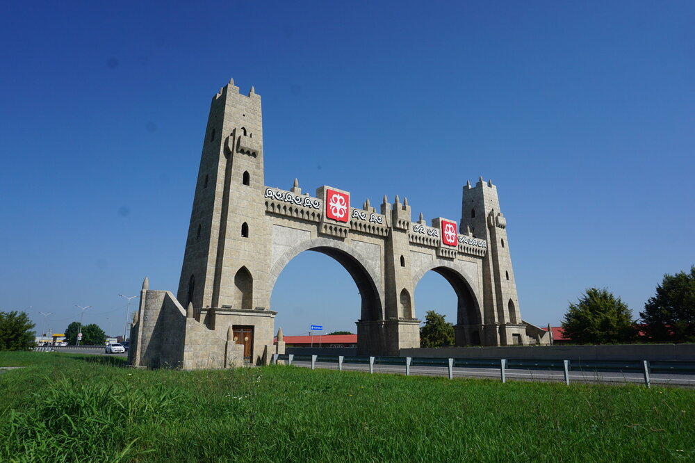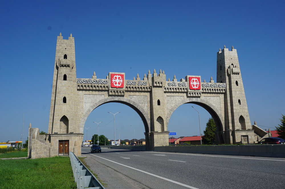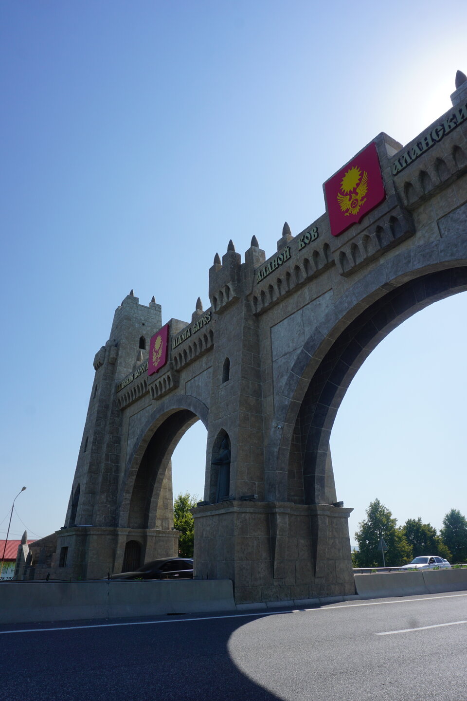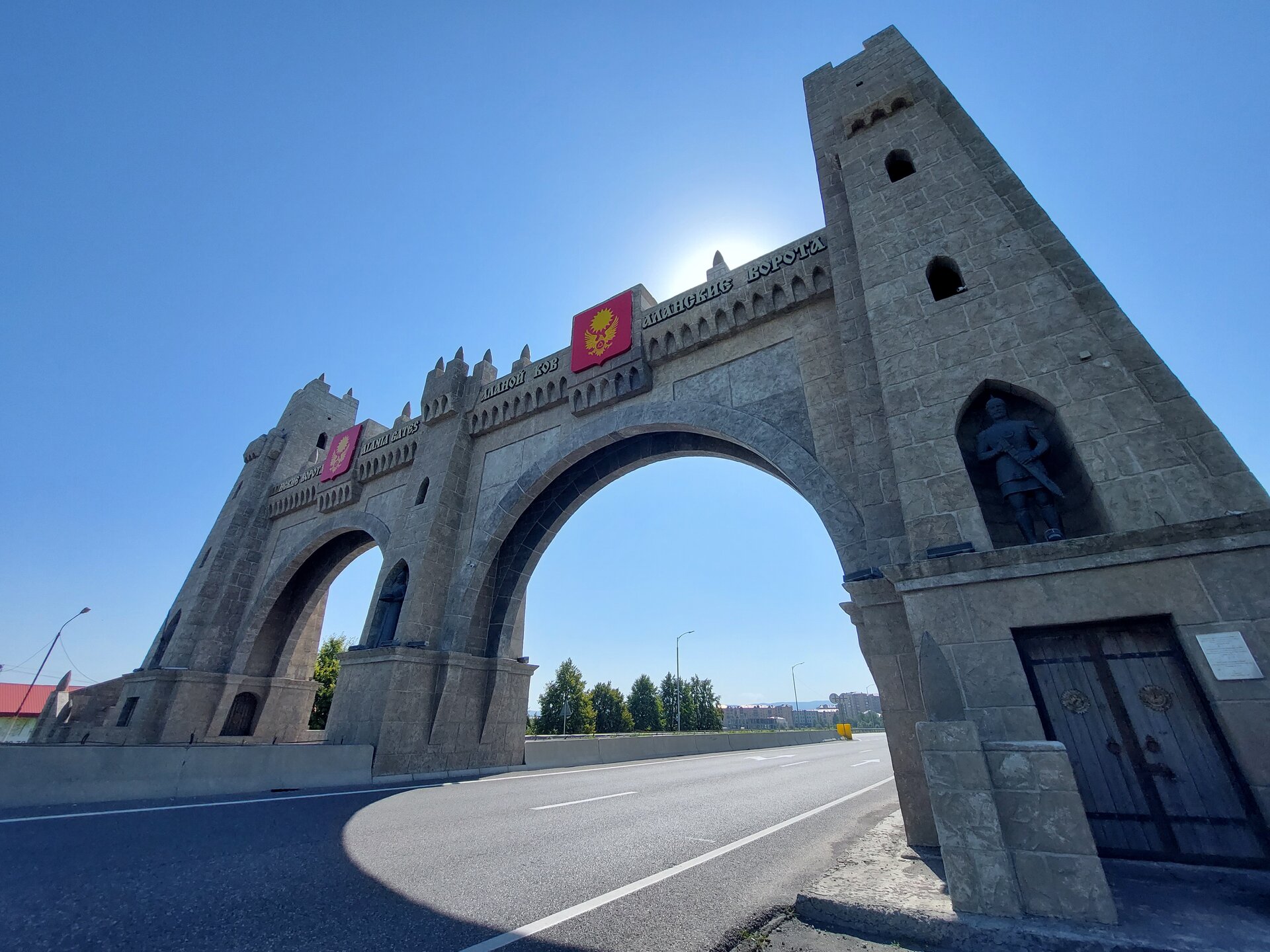 Третий день у нас тоже был выездным, впрочем как и четвёртый, о котором я чуть позже тоже расскажу. Ну, а в этот день мы решили съездить в Ингушетию. Всего-то минут 30-40 и ты уже в соседней республике. Я как порядочная, на всякий случай решила заглянуть в расписание автовокзала Владикавказа. Ну мало ли, всё-таки ехать тут всего ничего. Там вроде бы что-то и было, но до Назрани, но нам была нужна не она. Мы решили съездить в столицу Ингушетии, город Магас, а вот до этого города ничего не было. Ну ладно решили мы, в конце концов такси ещё никто не отменял. Доча посмотрела цену, нас она вполне устроила. В общем едим. Но такси мы вызвали не прям до Магаса, а до въезда в город, там где находятся Аланские ворота. Мы уже в 2021 году были в этом городе, у нас правда его не было в программе, наша гид решила показать нам Магас, сказав, что город обязательно понравится. Но тогда мы в него приехали, немного по нему прошлись, потом мы случайно оказались в одном из самых шикарных отелей города, прошлись по этому отелю, заглянули на смотровую площадку того же отеля и поехали дальше. Сейчас, ну раз мы совсем рядом, грех было не воспользоваться такой возможностью и не съездить в Магас. В запасе у нас было полдня, днём должна была прилететь подруга, а у неё не было ключей от нашей комнаты, но мы уже немного в Магасе ориентировались, решили что успеем. Самое интересное у нас было по дороге. Когда мы уже ехали, наш водитель решил с нами поговорить, честно сказать уже не помню о чём. Но от одних его слов я впала в ступор. Он нам сказал, что водители не очень то любят ездить сюда. Если в Магас ещё можно уехать, то обратно могут быть проблемы. Замечательно, у меня даже слов не было. Я всё, конечно, понимала, но я уже не понимала, как мы будем отсюда выбираться. Ладно, подумала я, не буду думать об этом сейчас, подумаю об этом часов через 6. Ну, а мы через 35 минут были уже у Аланских ворот. Там, где деревянные двери, висит табличка, мы к ней подошли. На табличке было написано, желающие посетить арку "Аланские ворота" просим обращаться по такому то номеру телефона. Честно сказать, табличка была в таком виде, мне казалось она тут висит лет 100 и ни какой указанный на ней номер уже не действует. Но чем чёрт не шутит, раз мы уже здесь, почему бы не попробовать и не позвонить. Звоним. Если сказать что я была удивлена, это ничего не сказать. Было такое ощущение, что на том конце провода сидели и ждали нашего звонка, ответили сразу. Я даже растерялась, а я вообще куда звоню и чего хочу. Когда через пару секунд я вышла из ступора, сказала про эту табличку и что на ней написано. Нам сказали хорошо, что минут 10-15 подъедут. Вот так, всё легко, просто и быстро.