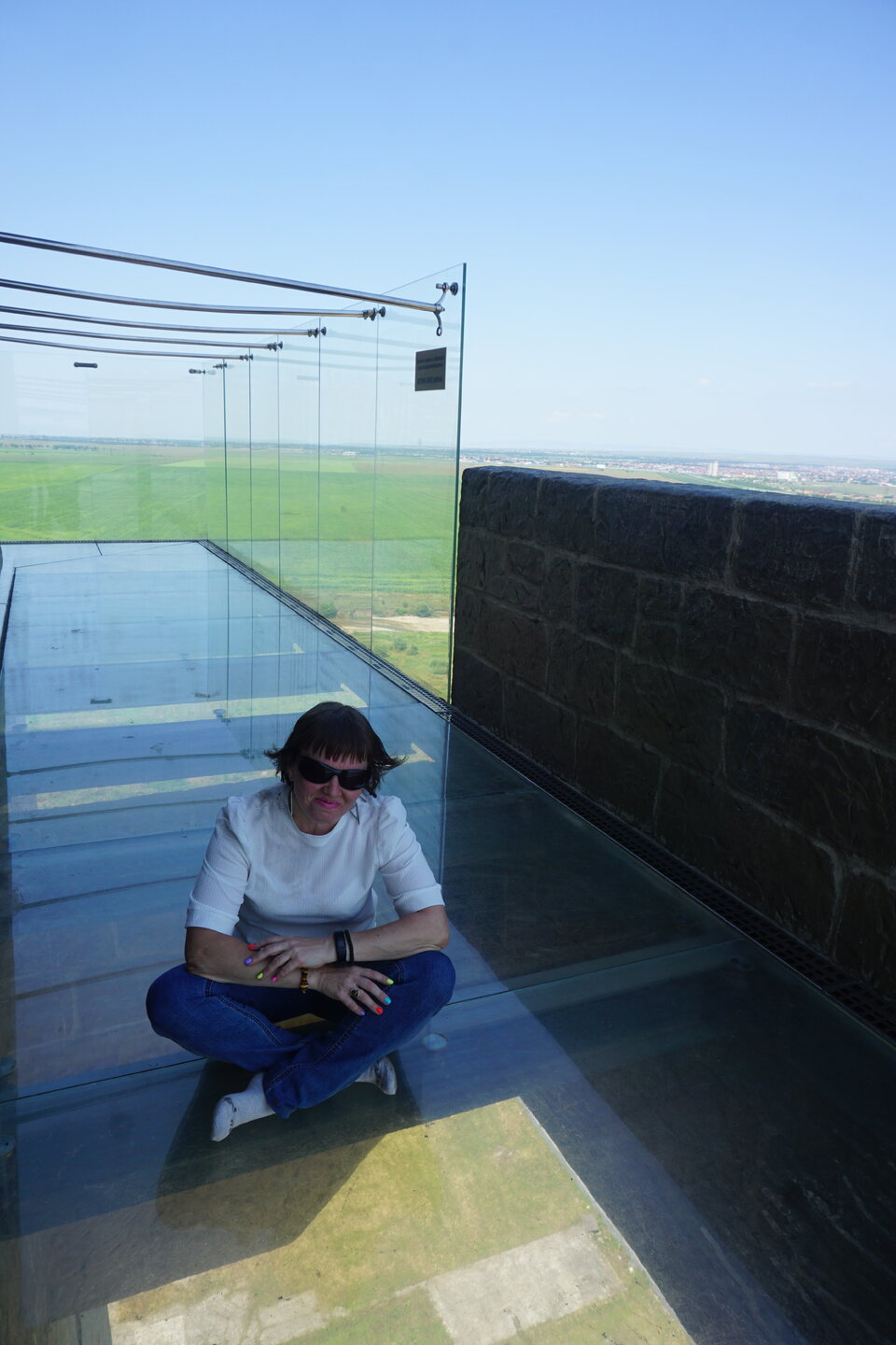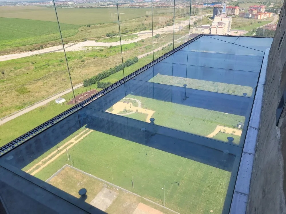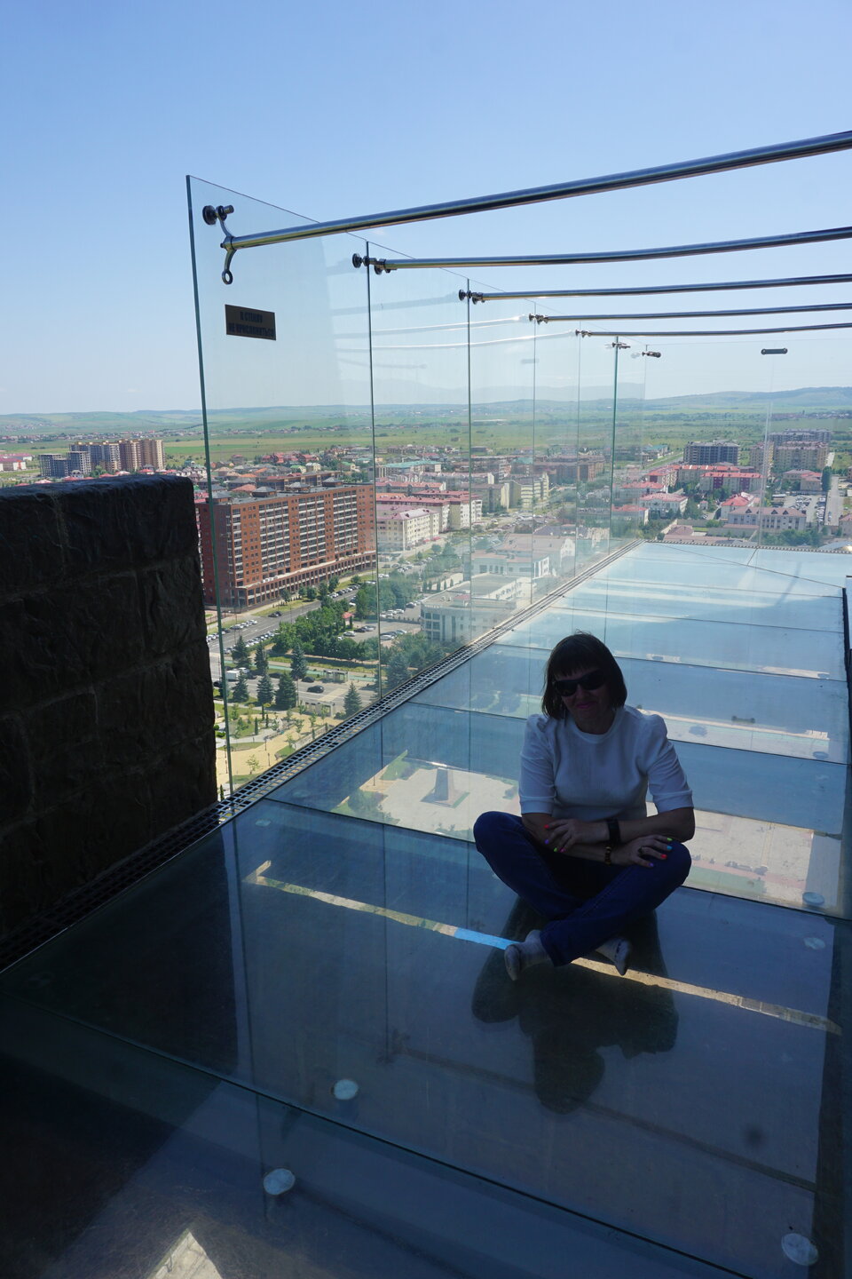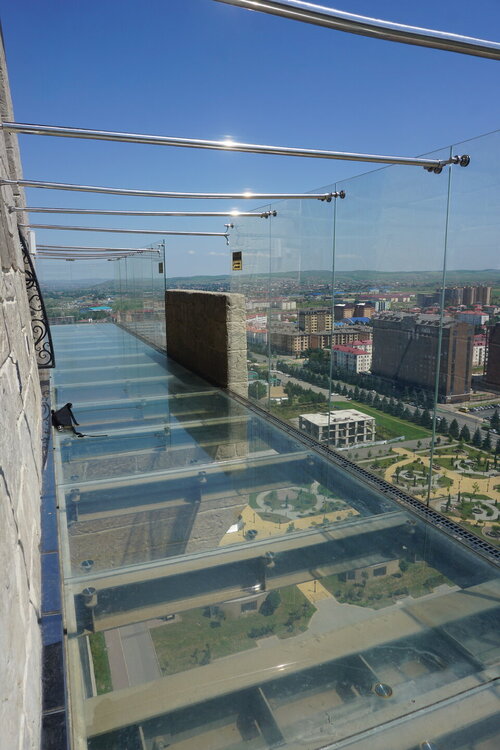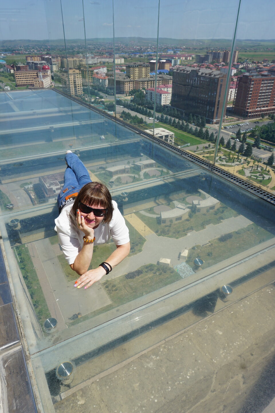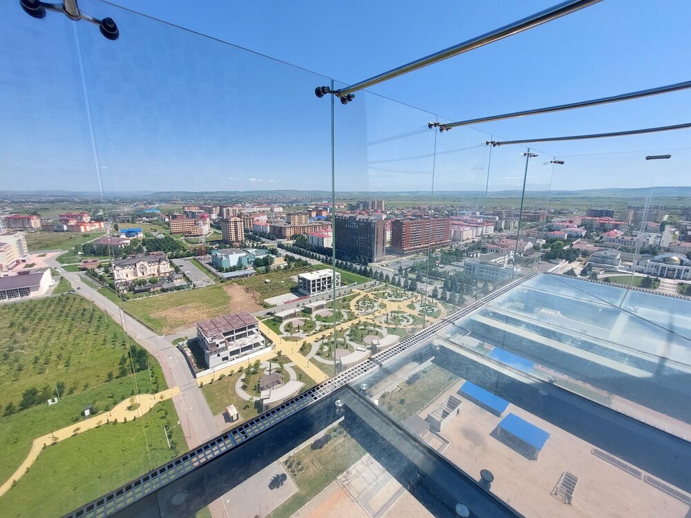 Ажурные ворота выводят на смотровую площадку башни. И такие ворота во все четыре стороны.Если кому страшно будет ходить по стеклянному полу, может зайти обратно, пройти внутри башни на другую сторону. А с непривычки будет страшно ходить, потом как-то немного адаптируешься, но сначала было страшно. Все мы разные, кто-то возможно, и не побоиться с ходу ступить на такой экстремальный пол. По идее это стекло держит до 4 тонн, поэтому тут можно толпой гулять. И самое смешное, вот был бы пол не стеклянный, то легко и просто, гуляй, не хочу, хотя можно подумать что-то изменилось, хотя конечно, изменилось, видно, что у тебя подногами делается. Но как говорят в таких ситуация, надо не смотреть вниз, а как тут не смотреть, интересно же. Голова сама какой-то своей жизнью жила, она взгляда не отрывала от моих ног. Помню, как будучи на Алтае, доча мне сказала: "Мама, надо прыгнуть с тарзанки". С той, которая на чемальской ГЭС. Я решила, что мне ничего не надо, я что, больная на всю голову? В итоге прыгнула, помню, как стояла над пропастью и не смотрела вниз вообще, если бы посмотрела, даже не знаю, что было бы. Хотя может и тогда прыгнула, за всё же уплочено, да и перебороть свой страх, это тоже чего-то значит. Но вспоминаю себя и понимаю, что даже не страшно было когда прыгала сама, было страшно, когда прыгала доча. И в отличие от меня, доча сразу спокойно начала гулять по смотровой площадке. Она ходила, гуляла, сидела, фотографировала. 20230801_110316.mp4 Я нет, я стояла приклеившись в той самой ажурной арке. На всякий случай спросила у дочи:"А может попробовать ползком? Ну, или хотя бы на карачках".
