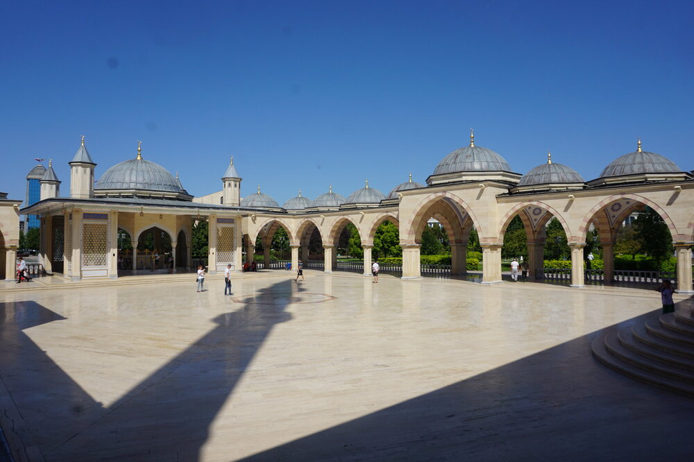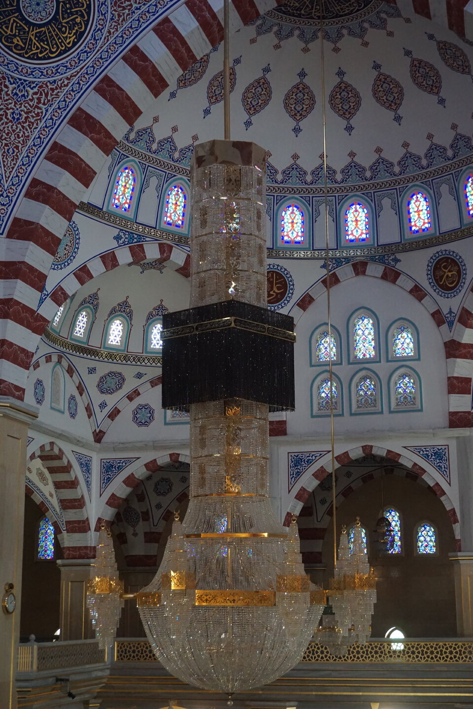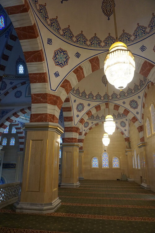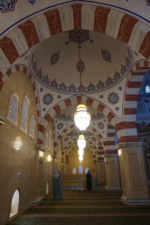 Ну, и, конечно, стоит обратить внимание на территорию около мечети. В своё время важно было не просто построить красивую мечеть, а обустроить территорию вокруг. В Грозном с этим справились на отлично. А это внутренний дворик мечети. Арки красиво украшены чеченским узором "бустам". Также имеются люстры для создания красивой ночной подсветки. Ну что можно сказать про мечеть? Хоть мечеть и новодел, но меня она сильно впечатлила своей красотой и детальной проработкой. Читала что мечеть шикарно смотрится вечером, когда уже темно, но это мы уже проверить не могли.