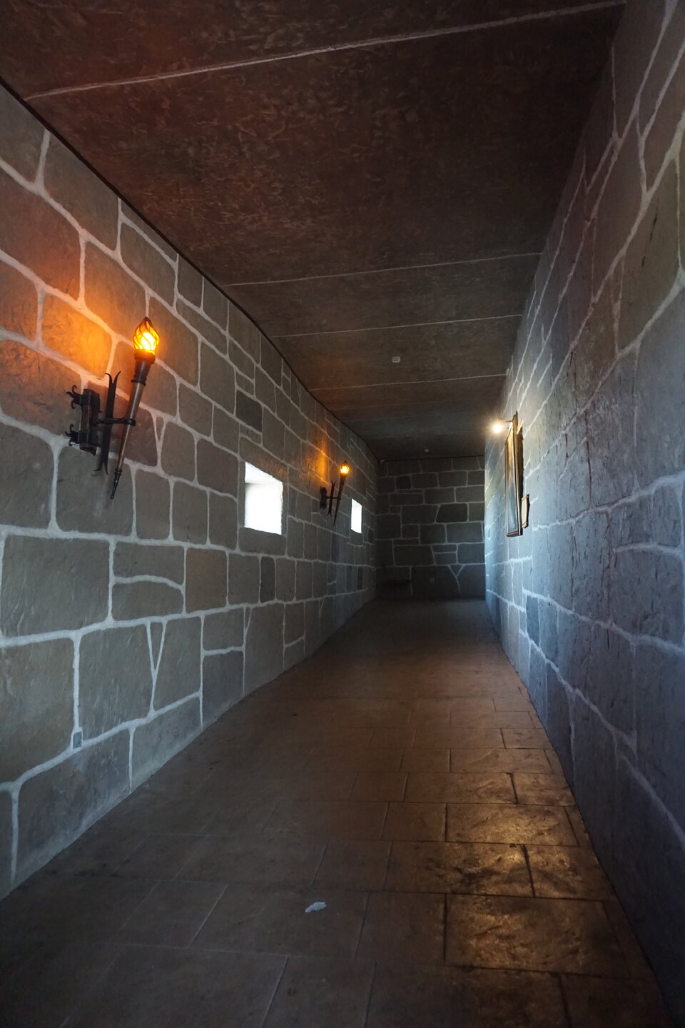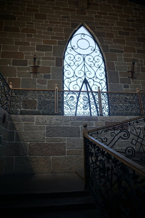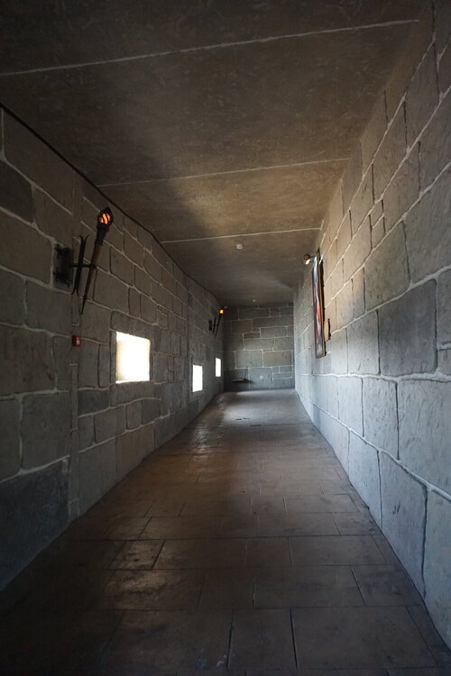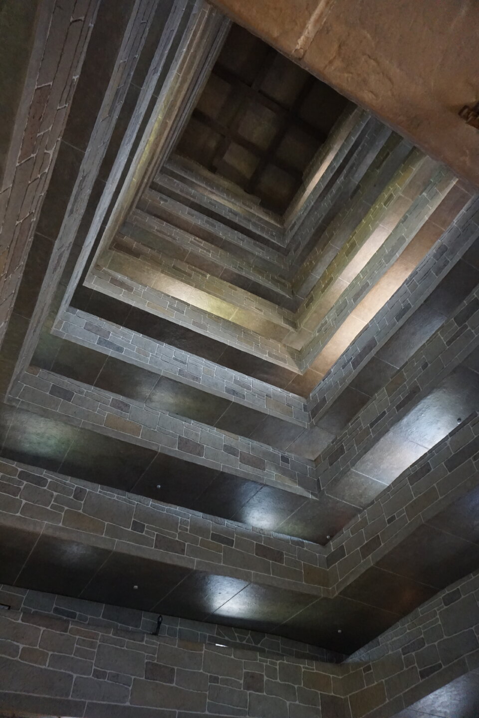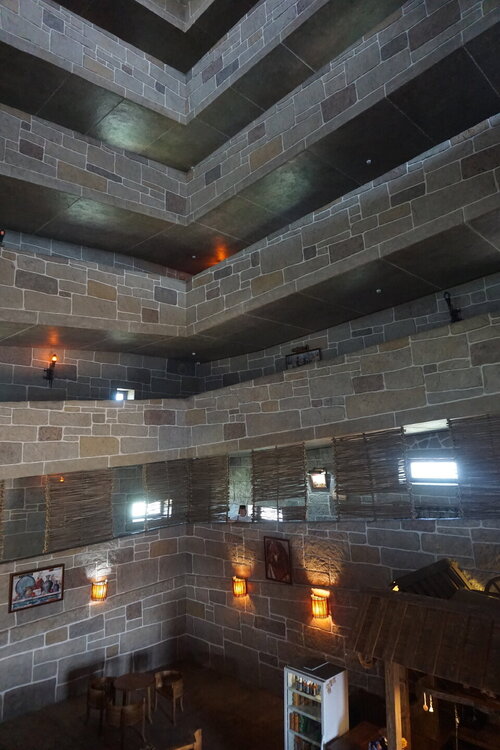 Ну что, настало время и нам подняться на башню. Наверх ведут не лестницы, а пологие пандусы. По пути можно увидеть стенды о дикой природе республики и многочисленные картины на исторические сюжеты. Мне наш подъём казался бесконечным, но читала, что путь равен всего километру. Не знаю насколько это так, мне казалось мы прошли километров 5, не меньше. Мы шли по бесконечным коридорам, и если бы ни какие-то просветы, то было ещё более романтичнее. Между этажами, хотя даже не знаю между чем, где тут граница между одним этажом и другим, в общем, периодически, где-то в уголочке, были вот такие стульчики. Устал, присел отдохнул, но нам отдыхать было некогда, но на фотопаузы иногда оставливались, а всё потому, что где-то в окошечках были очень интересные виды на город. И это один из таких видов на Президентский дворец. Вдалеке видно несколько подъёмных кранов, это говорит о том, что город продолжает строиться, пройдёт лет 20 и Магас будет совсем не узнать. А вот далее, пандусы Башни Согласия выводят к запертой этно-кафешке, за которой поднимаются уже не коридорами, а лоджиями. Впереди ещё 13 ярусов, но сужается башня весьма ощутимо. Высота становится всё ниже и ниже. Я не знаю как тут подниматься людям высокого роста, может пригнувшись? Проверить никак не могла, так как, что я, что доча невысокого роста. Но высота лоджий была реально вот такая, потолок можно рукой достать. И вот мы пришли, подъём мне понравился, насколько помню, у нас таких подъёмов ещё не было. Ни на лифте, ни по лестнице, ни по винтовой лестнице, а какими-то коридорами.