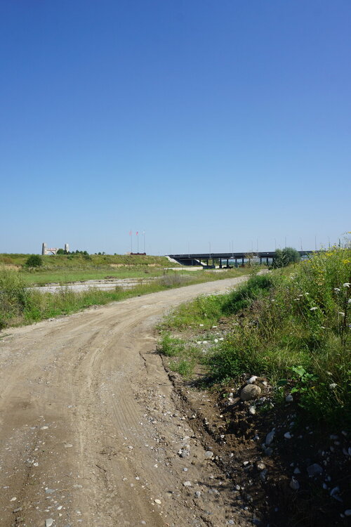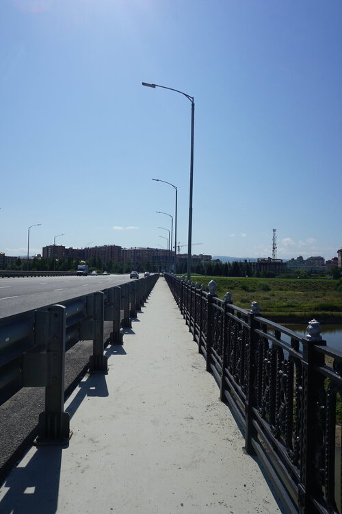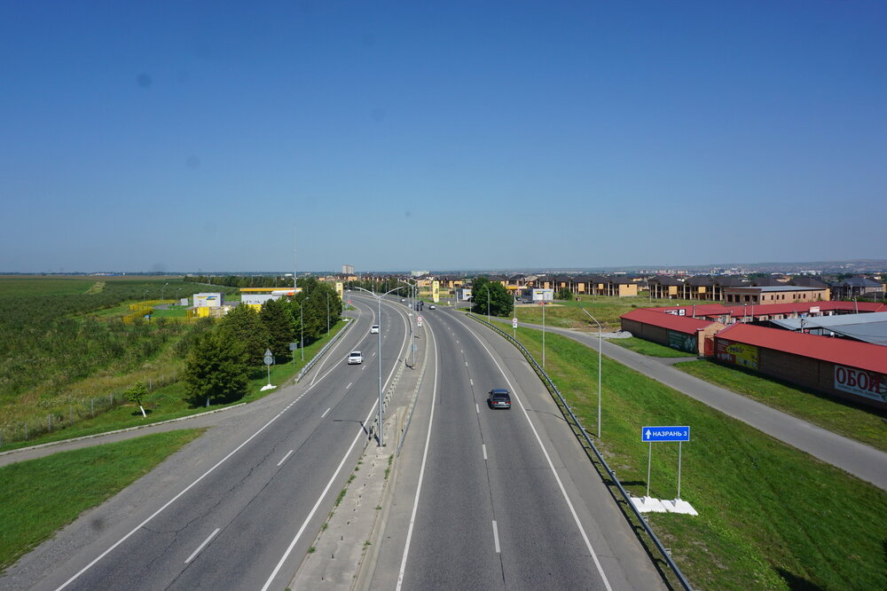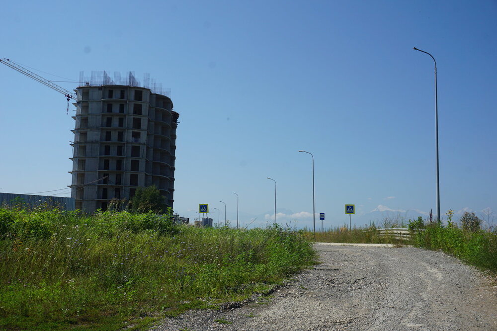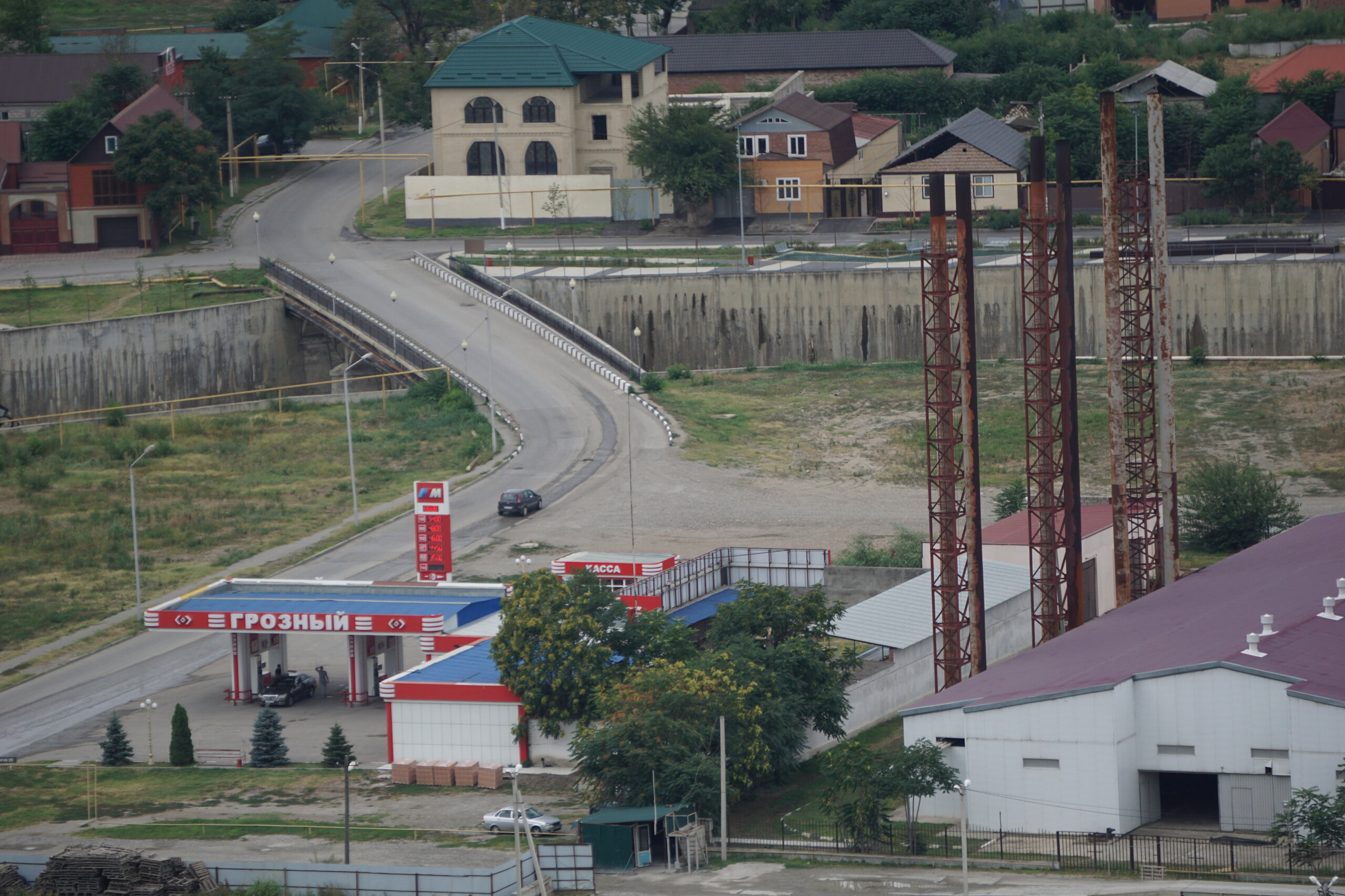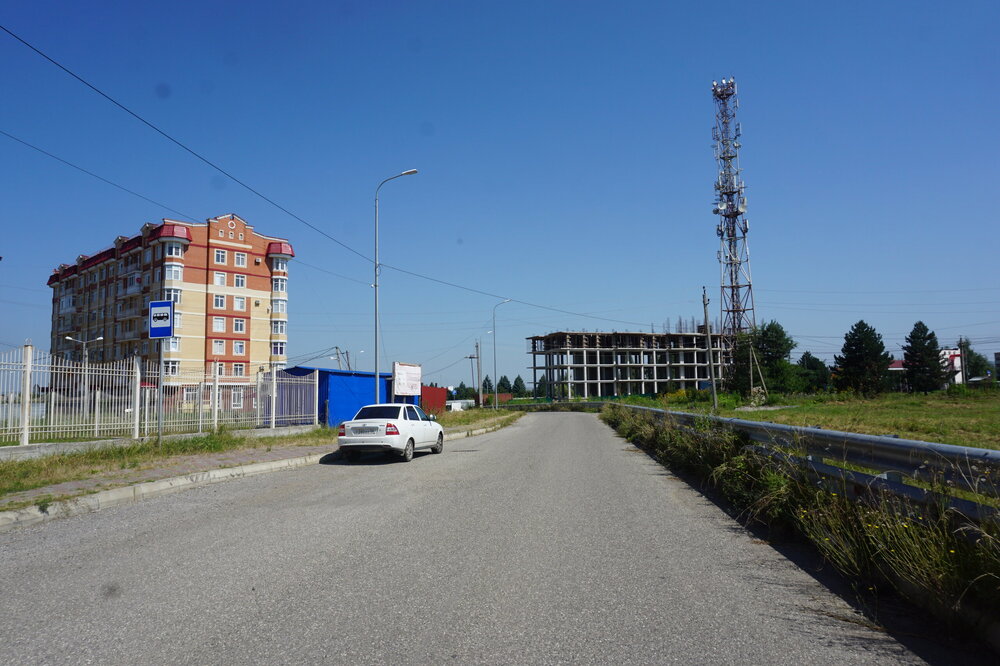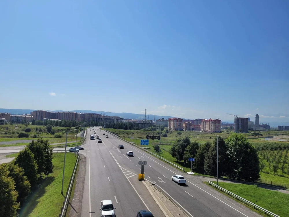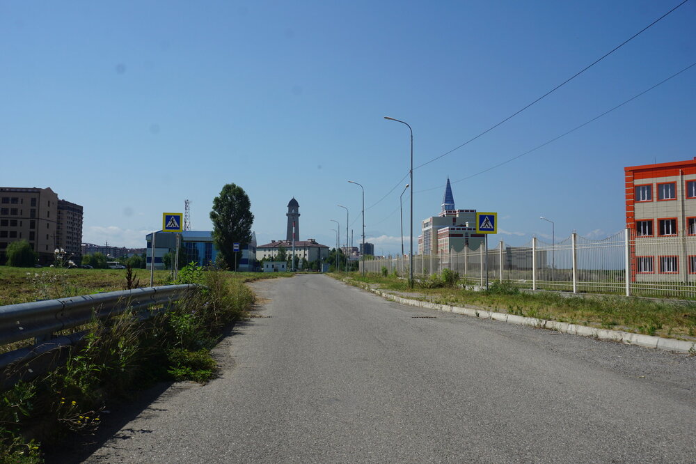 Молодой человек нам предложил довезти нас до нужного места, мы любезно отказались, хотелось ещё погулять рядом, да и думали, вдруг что-то интересное пропустим и что-то не увидим. В общем, до Магаса решили идти пешком. Просто идти и всё фотографировать. Не знаю насколько это было правильным решением, может и стоило согласиться, время бы сэкономили. Но тем не менее, в принципе не жалеем, что выбрали прогулку пешком. Нас, конечно, занесло бог знает куда. Но если бы никуда не занесло, я бы удивилась. Нас и не занесло? Мы прошли по мосту, от которого начинается проспект Идриса Зязикова. Протяжённость проспекта 2.3 километра. Строительство проспекта напрямую связано со строительством города Магаса, являющего новой столицей Ингушетии и единственным городом в России возведённый в постсоветский период абсолютно с нуля Когда я готовилась к поездке, на карте видела этот мост, видела, что здесь протекает река Сунжа. И я даже не предполагала, что она будет вот такая. Вода в Сунже всегда бывает в значительном количестве. После сильных и продолжительных дождей уровень может подняться на 4 метра. Половодье в реке бывает в апреле-мае, когда тают зимние снега и выпадает много дождей. Но мы были в августе, поэтому Сунжу увидели такой. Но где-то может она и другая, всё-таки длина реки 278 километров. И да, Сунжа - это приток Терека, того самого, который протекает по Владикавказу. Ну, а Сунжа, как я уже выше писала, протекает по Грозному. И если ещё писать про Сунжу, то когда-то, в 19 - 20 веках, река замерзала практически вся, за исключением быстрых участков. Были примеры, когда русские войска переправлялись через Сунжу по льду с артиллерией и тяжестями, но в последние десятилетия река не замерзает из-за смягчения климата на Кавказе. Ну, а мы идём дальше, и после моста спустились вниз. Где шли, не знаю, но понимали, что путь свой держим в сторону Магаса, да и карта нам тоже об этом говорила. Ушли уже прилично от Аланских ворот. И снова какие-то дебри. Хотя какие дебри? Тут даже знак есть пешеходный переход, значит уже не дебри. Я не знаю для чего тут эти знаки. Ни машин, ни людей, может на опережение работают, сначала знак, а потом уже всё остальное. И вот наконец-то появилась цивилизация. Мы до неё дошли. А вдалеке уже видна башня Согласия.