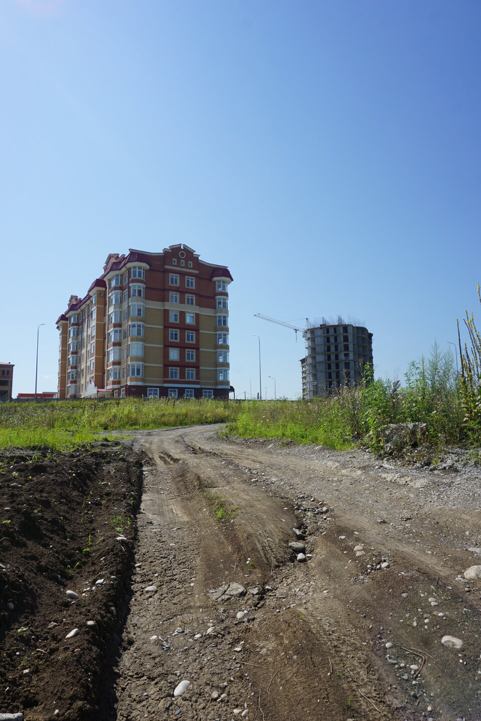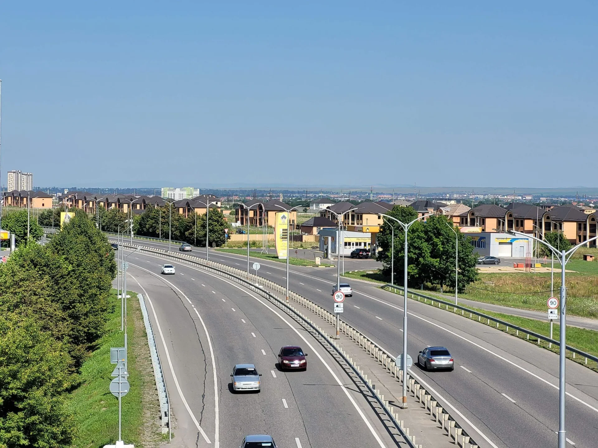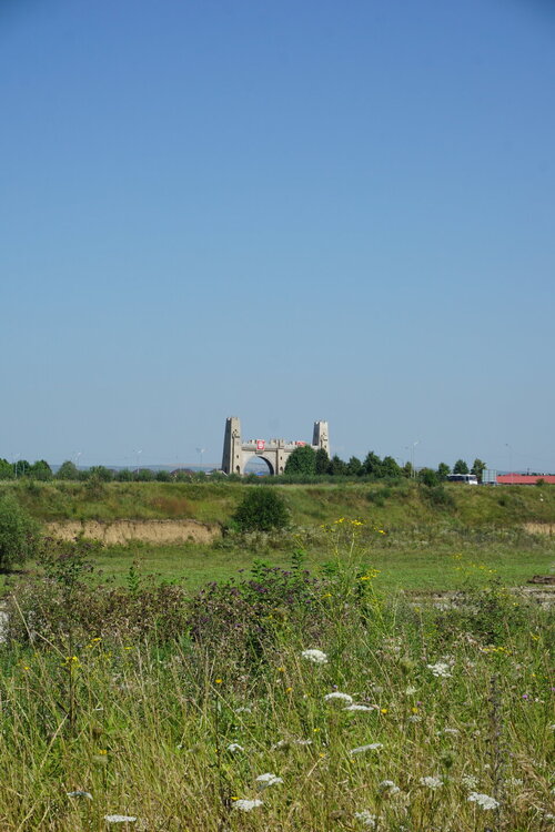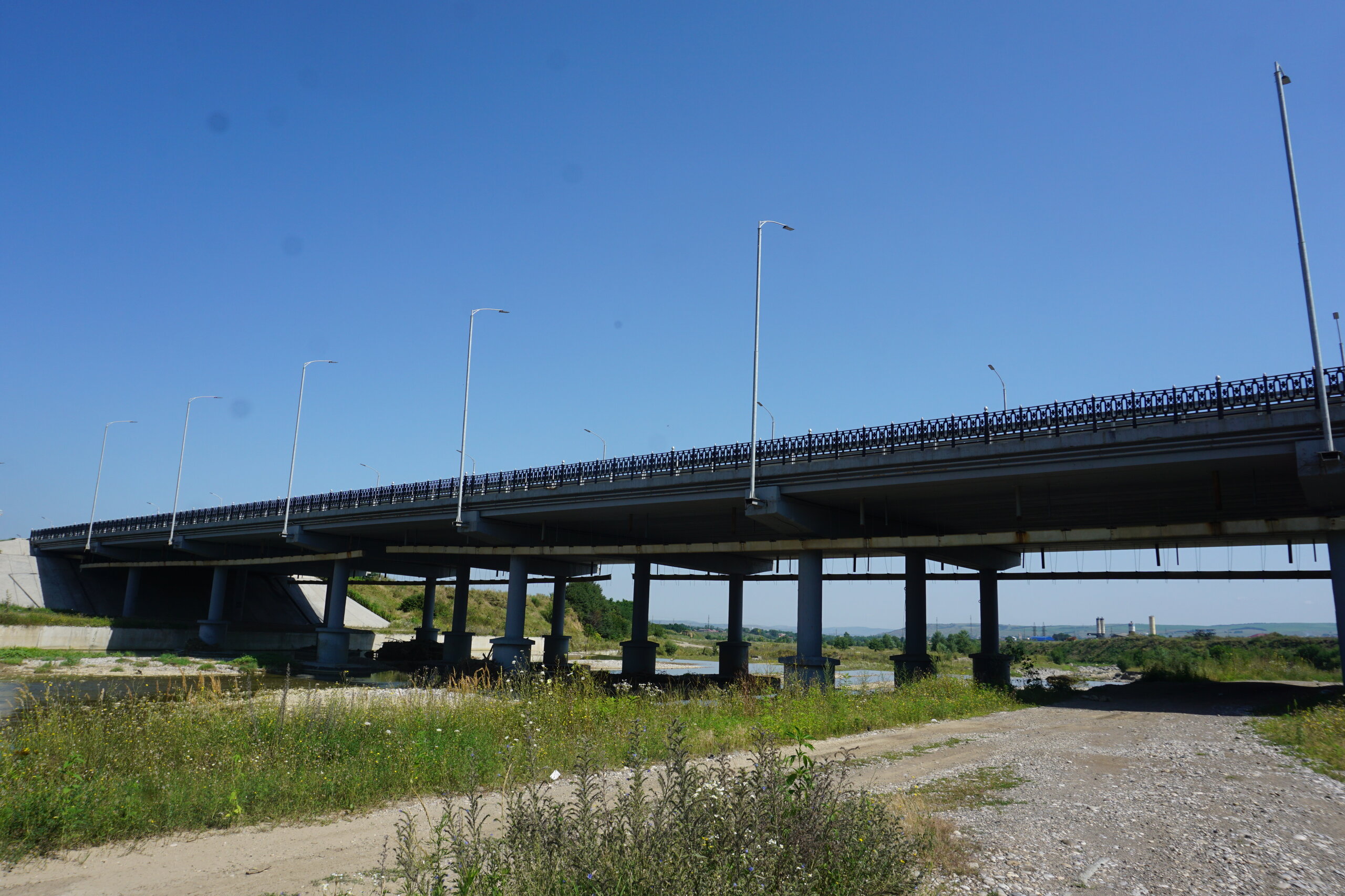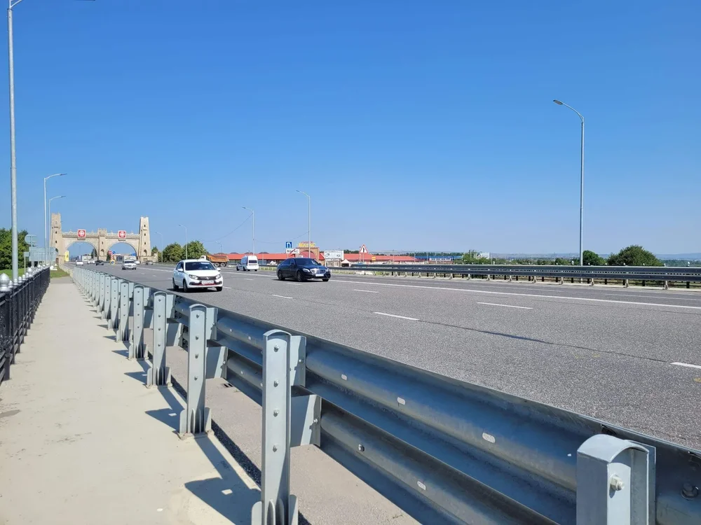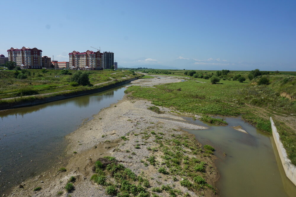 Молодой человек нам предложил довезти нас до нужного места, мы любезно отказались, хотелось ещё погулять рядом, да и думали, вдруг что-то интересное пропустим и что-то не увидим. В общем, до Магаса решили идти пешком. Просто идти и всё фотографировать. Не знаю насколько это было правильным решением, может и стоило согласиться, время бы сэкономили. Но тем не менее, в принципе не жалеем, что выбрали прогулку пешком. Нас, конечно, занесло бог знает куда. Но если бы никуда не занесло, я бы удивилась. Нас и не занесло? Мы прошли по мосту, от которого начинается проспект Идриса Зязикова. Протяжённость проспекта 2.3 километра. Строительство проспекта напрямую связано со строительством города Магаса, являющего новой столицей Ингушетии и единственным городом в России возведённый в постсоветский период абсолютно с нуля Когда я готовилась к поездке, на карте видела этот мост, видела, что здесь протекает река Сунжа. И я даже не предполагала, что она будет вот такая. Вода в Сунже всегда бывает в значительном количестве. После сильных и продолжительных дождей уровень может подняться на 4 метра. Половодье в реке бывает в апреле-мае, когда тают зимние снега и выпадает много дождей. Но мы были в августе, поэтому Сунжу увидели такой. Но где-то может она и другая, всё-таки длина реки 278 километров. И да, Сунжа - это приток Терека, того самого, который протекает по Владикавказу. Ну, а Сунжа, как я уже выше писала, протекает по Грозному. И если ещё писать про Сунжу, то когда-то, в 19 - 20 веках, река замерзала практически вся, за исключением быстрых участков. Были примеры, когда русские войска переправлялись через Сунжу по льду с артиллерией и тяжестями, но в последние десятилетия река не замерзает из-за смягчения климата на Кавказе. Ну, а мы идём дальше, и после моста спустились вниз. Где шли, не знаю, но понимали, что путь свой держим в сторону Магаса, да и карта нам тоже об этом говорила. Ушли уже прилично от Аланских ворот. И снова какие-то дебри. Хотя какие дебри? Тут даже знак есть пешеходный переход, значит уже не дебри. Я не знаю для чего тут эти знаки. Ни машин, ни людей, может на опережение работают, сначала знак, а потом уже всё остальное. И вот наконец-то появилась цивилизация. Мы до неё дошли. А вдалеке уже видна башня Согласия.
