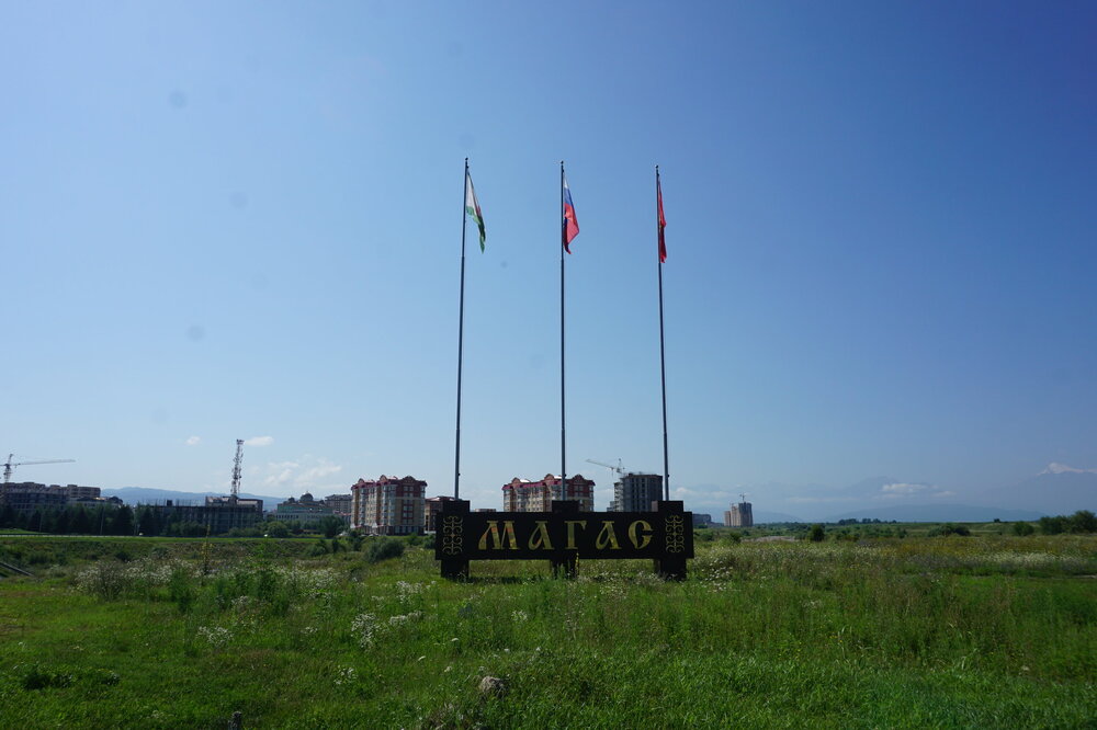 Вот так Аланские ворота выглядят наверху. Ну, а это по сути компромат. Когда я что-то фотографирую или просто стою, доча фотографирует меня. Обычно, когда мы уже приезжаем и начинам пересматривать фотографии, много чего интересного вижу. Но честно сказать, я уже привыкла к этому и порой даже удивляюсь, в смысле нет компромата? Это как? В общем, вот такие они Аланские ворота, которые встречают каждого, кто приезжает в Магас. А по-ингушски они произносятся как Аланой ков. И каждый кто проезжает под воротами, замечает, как вдалеке виднеются дымчатые силуэты гор – природного символа Ингушетии. Мы, конечно, под ними не проехали, но горы видели. А уже будучи внизу, решили сфотографироваться на фоне вот такой таблички, которая нам говорит, что мы в Магасе.