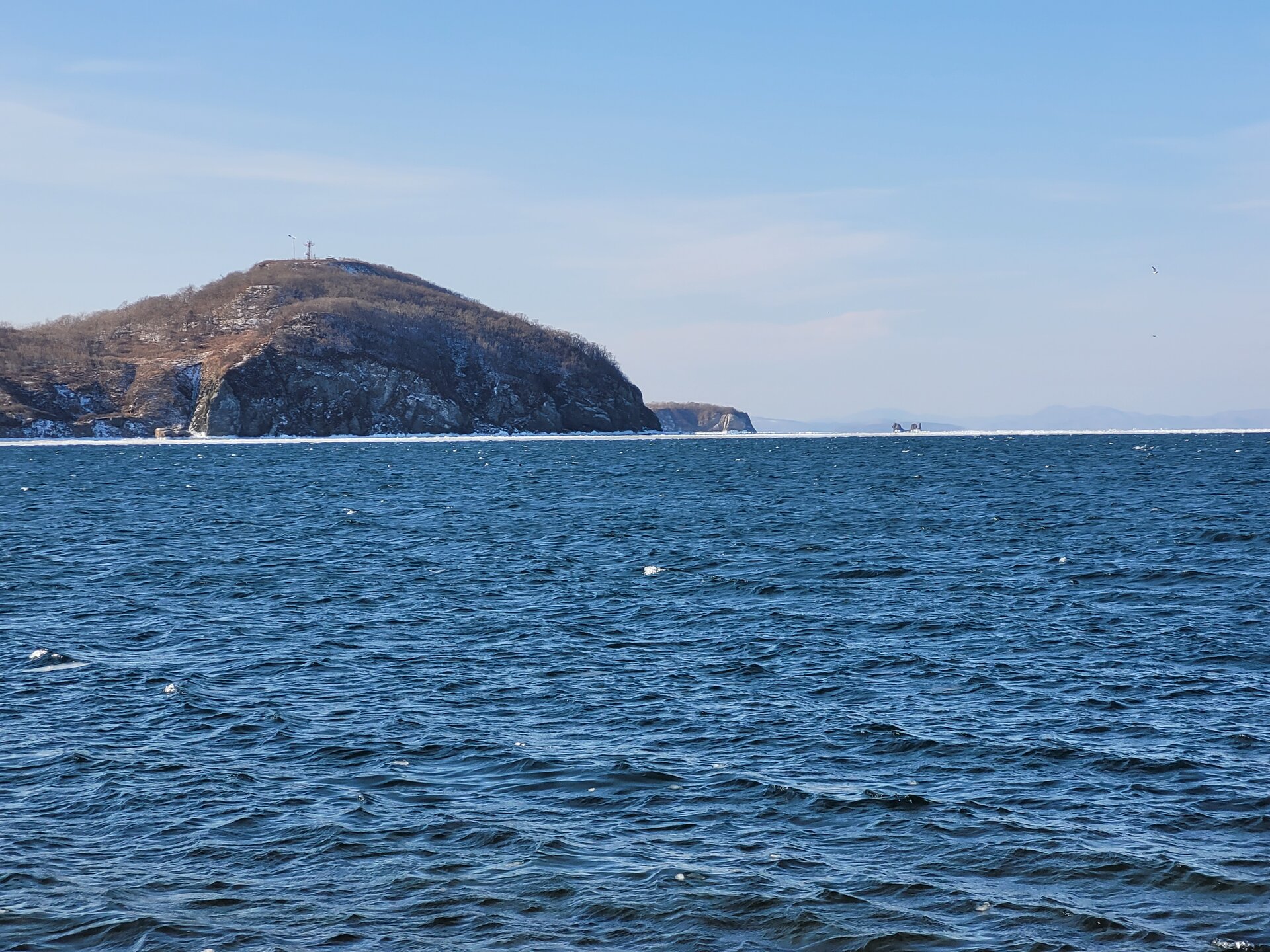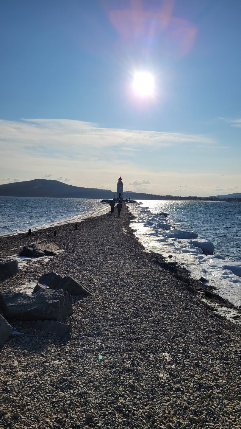 Поездка на новогодние каникулы, особенно 1 января, имеет свои плюсы, людей практически не было. Возможно, такая картина вообще зимой бывает. Как нам говорили, лушее посещение для Владивостока - это с середины июля до середины или даже до конца сентября. Если ехать летом, то в июне часто идут дожди, часто бывают туманы и тайфуны. В общем, этот период не стоит выбирать для поездки в этот город. И ещё на что мы обратили внимание, здесь всегда светит солнце. Опять же, как нам говорили, а общались мы много, и на экскурсиях, где-то в магазинах, в кофейнях, которых тоже посетили предостаточно, в общем нам говорили, что здесь 90 % солнечных дней. И мы на сей факт обратили внимание, оно тут светило всегда, все 6 дней, что мы были во Владивостоке, солнышко нас радовало. Как я говорила :"Хоть здесь на солнышко насмотрюсь". У нас с этим прям беда, если ударят морозы, то солнышко есть, как только теплеет до -10, всё, солнышко мы не видим, а если вообще потеплеет до 0, ещё и снег не переставая идёт. Отсюда вывод, люблю морозы. И ещё, здесь намного раньше светлеет, в 8.30 уже светло, у нас к часам 10 утра только хоть что-то проясняется. В общем, опять плюс. Ну, а мы тем временем начали свой экстремальный путь к маяку, именно так назову нашу дорогу. Сильнющий ветер обдувал нас со всех сторон, было ощущение, что нас сейчас сдует в открытое море. А на фотографии смотришь, так хорошо, солнышко светит, снега нет, ляпота. Но это было далеко не так. Но не приехать сюда...такое нельзя допустить. Мы когда поехали на маяк, не предполагали, что здесь будет именно так. Конечно, открытая местность, влияние воды, всё это сказывалось на погоду. Но мы шли, закрывались от ветра, делали небольшие остановки на фотопаузы, снимали видео. Нам предстояло пройти 800 метров по когда-то сделанной искусственной косе, которая во время прилива исчезает под водой и пройти к маяку уже не получится. А я сразу вспомнила Мон-Сен- Мишель. Видела фотографии, когда Токаревская "кошка" частично скрывается под водой и люди проходят к маяку по колено в в воде. Это ещё более экстремальный проход к маяку. А бывает и так. Но нам повезло, дорога была очень кофортная, никакой воды на песчаной косе не было, ни какого льда. И если бы не ветрище, вообще было идти одно удовольствие, но тем не менее мы дошли.