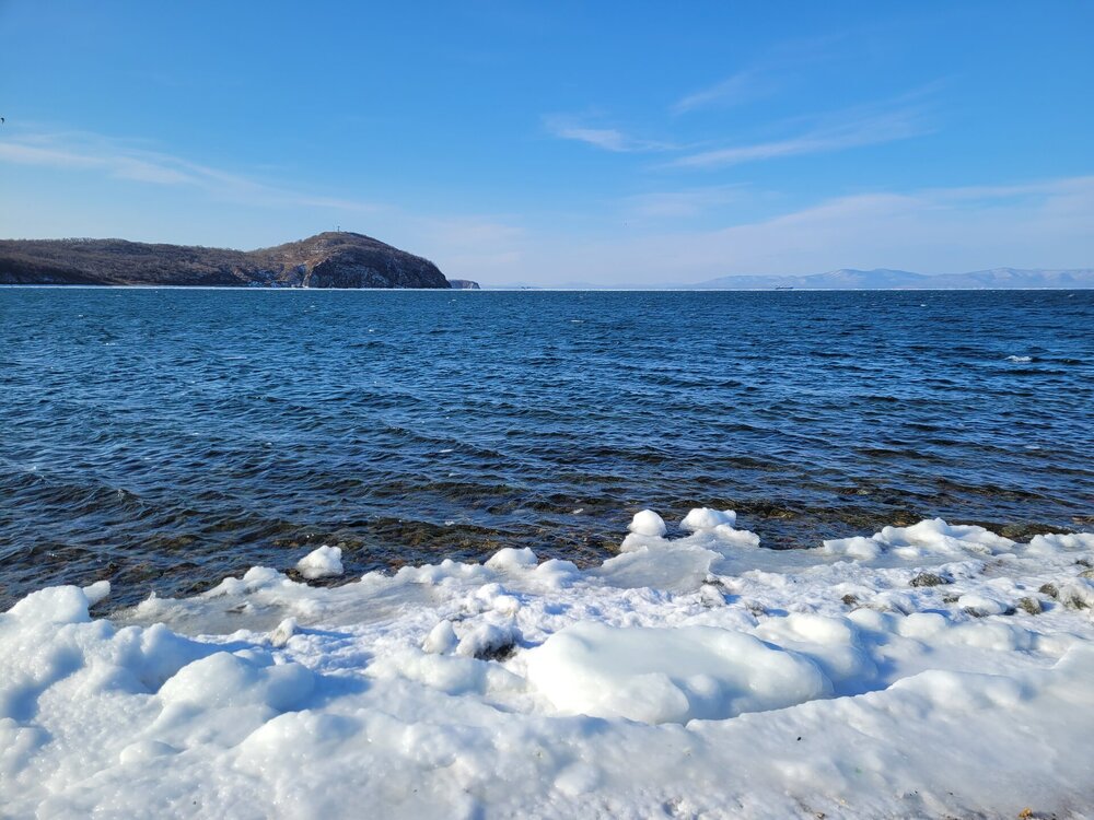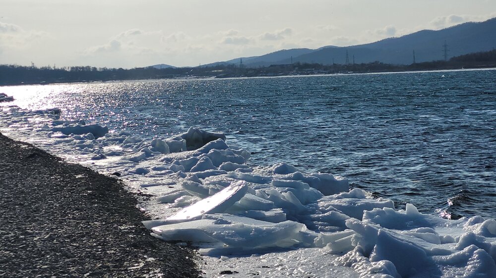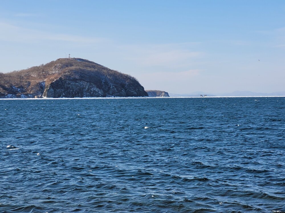 А чтобы поехать и посмотреть эту достопримечательность, мы не стали ничего изобретать, вызвали такси. До поездки я, конечно, смотрела как туда добраться и общественный транспорт был, но не прям до маяка, от остановки надо было ещё пройти. Хотя, если туда ещё можно было так сделать, то обратно нет, так как необходимо было подниматься в гору. В общем, мы поступили проще. Нас довезли до самой парковки, а вот дальше надо было ещё идти пешком, и это я вам скажу было ещё то испытание. И вон там, в самом конце, виднеется тот самый Токаревский маяк. Дойти до него можно спокойно, хотя и кажется, что далеко, но именно 1 и 2 января на город обрушился ураганный, колючий, пронизывающий до костей ветер. Поэтому нам и говорили, что мы бесстрашные, выбрали день, чтобы отправиться на маяк. Ветер дул с такой силы, я и не знала, что делать, то ли от него кутаться, то ли фотографировать. А тут такая красота вокруг. Поэтому выбора у нас не было, мы и кутались и фотографировали и удивлялись. Ну как так? Вода замёрзла, а снега нет. Да, было всё не просто, ветер обжигал лицо, надо быть аккуратным, так как дорога неровная. В общем, не знала куда смотреть, или вокруг или под ноги, я пыталась делать всё одновременно. Выбора у нас не было. Не ехать же сюда ещё раз. И мы здесь были не одни, народ приходил, уходил, и в основном все китайцы. Ну, а это, правда я немного увеличила, тот самый Русский мост - одна из самых главный и узнаваемых достопримечательностей Владивостока, позже я и о нём расскажу. Честно сказать, тогда я ещё плохо разбиралась, где какой мост, мы только приехали в город, какое тут разбираться. Потом, конечно, поняла.