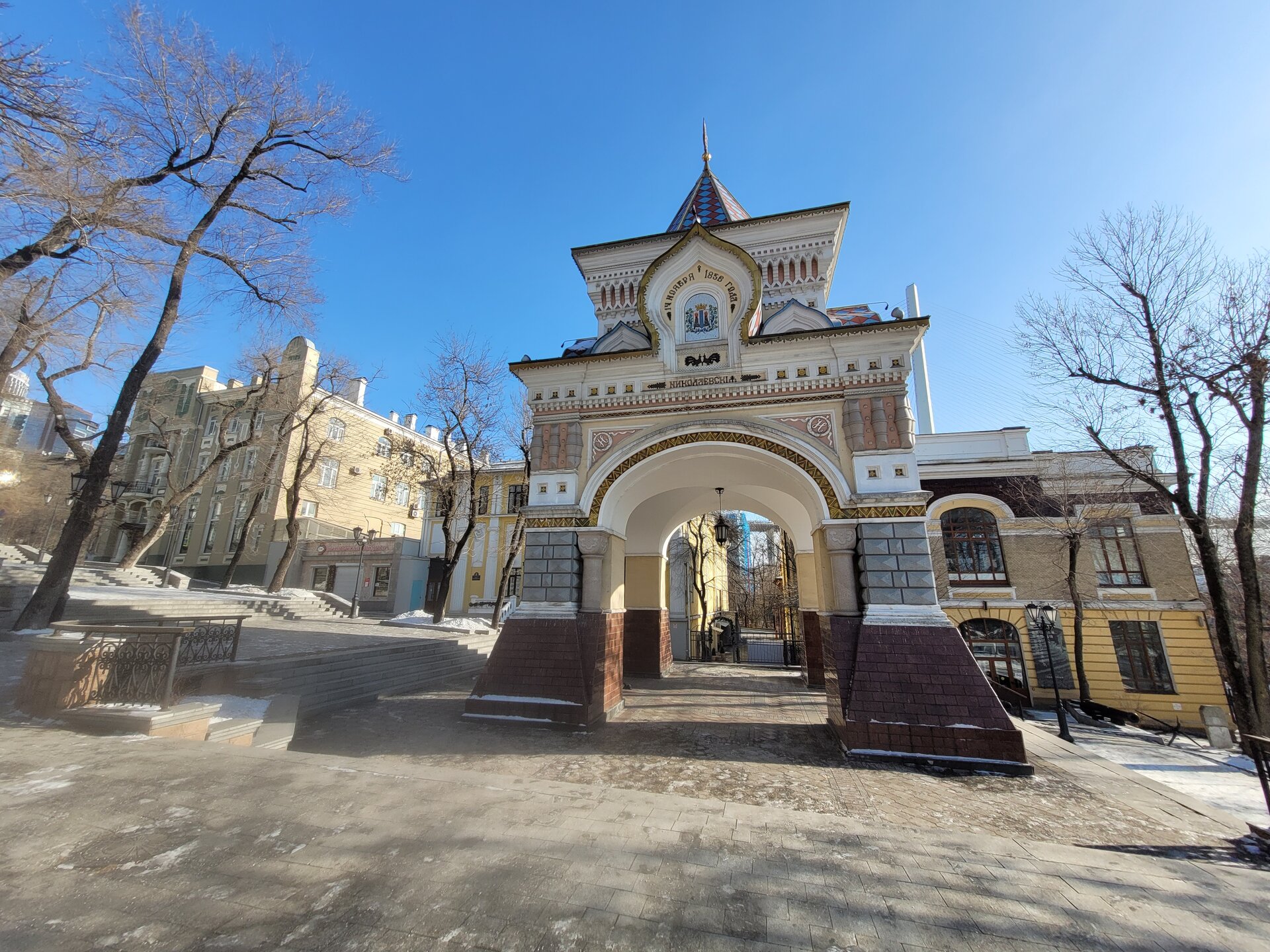 Владивосток, в силу своего довольно молодого возраста и географической удалённости от центра России, не часто встречался с первыми лицами государства. Но один такой визит подарил городу прекрасное сооружение – Арку цесаревича, именно к ней мы и подошли. И так, на дворе октябрь 1890 года. 22-летний наследник престола, будущий император Николай II, отправляется в длительное заграничное путешествие. Такие поездки были важной частью обучения членов российского дома ещё со времен Петра I. Но обычно царевичи путешествовали по Европе, а Николай отправился в турне по восточным странам. Сопровождали наследника престола пять спутников. Путешественники посетили Грецию, Египет, Индию, Сингапур, Яву, Сиам, Цейлон, Китай и Японию. Везде русских встречали очень дружелюбно. Но без приключений не обошлось – в Японии на цесаревича было совершено покушение, в результате которого он чуть не погиб. Японцы не хотели международного конфликта и постарались замять неприятный инцидент. На высшем уровне были принесены извинения, простые люди желали Николаю скорейшего выздоровления, а власти начали судебный процесс над Цуда Сандзо, которого приговорили к пожизненному заключению. Официальной причиной его поступка было якобы унижение, которое русские нанесли своим визитом Японии. Мол, нечего тут ездить всяким иностранцам. И если цесаревич спокойно воспринял покушение на свою жизнь, то его отец император Александр III болезненно отреагировал на эту ситуацию и велел наследнику немедленно возвращаться в Россию через Владивосток. Во Владивостоке наследника уже давно ждали. Ещё за пять месяцев до его прибытия городская дума приняла решение построить напротив Адмиральской пристани триумфальную Арку или Николаевские ворота. На финансирование строительства из городской казны было выделено 5 тысяч рублей и ещё 4 тысячи рублей пожертвовало местное купечество. Автором проекта арки стал инженер-капитан Николай Васильевич Коновалов. Работы производились днём и ночью, при двойной смене рабочих, что позволило закончить строительство к 11 мая 1891 года, когда Николай прибыл во Владивосток. Арка, судя по всему, будущему императору понравилась. Она была выдержана в строгом византийско-русском стиле и поражала современников своей лёгкостью и воздушностью. Мне нравится рассматривать старые фотографии и с некоторых пор стала вставлять их в свои отзывы. А это фотография арки с видом на ту самую Адмиральскую пристань, в честь которой и был назван Адмиральский сквер. Но, к сожалению, после отъезда будущего императора арка продолжила украшать Владивосток совсем не долго. Сразу после революции сооружение потеряло своего двуглавого орла, а в 1923 году было переименовано в Комсомольскую арку. В 1927 году Владивостокский окружной комитет постановил арку разобрать, как не имеющую исторической ценности и мешающую проезду транспорта по улице 1-го Мая. К 1930 году постановление было выполнено. В начале 2000-х годов общественность Владивостока решила Николаевские триумфальные ворота восстановить. Правда, чертежи этого сооружения не сохранились и строителям пришлось опираться только на старые фото и описания. 20 марта 2002 года состоялась торжественная закладка новых Николаевских триумфальных ворот, а открытие - 16 мая 2003 года, к 135-й годовщине со дня рождения Николая II. Сейчас эта историч