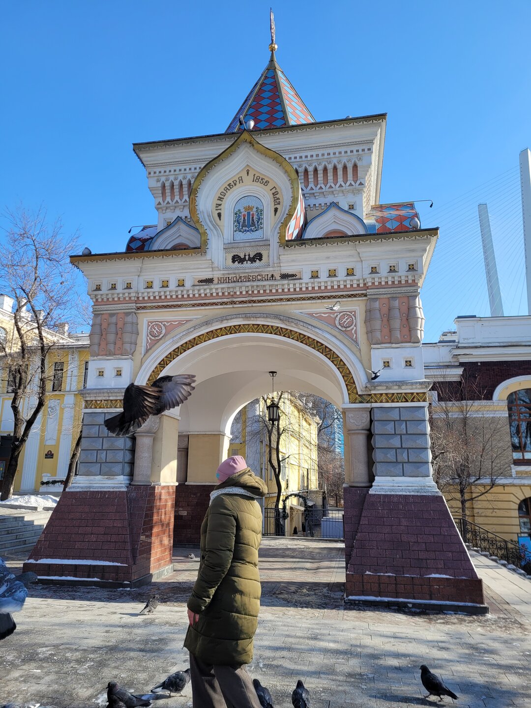 Когда я писала, что все дороги ведут на площадь Борцов Революции, а также на улицу Светланскую и улицу Фокина, забыла добавить, что все дороги ещё ведут на Корабельную набережную. Я даже не знаю сколько раз мы были в этом месте, три раза точно из шести дней. По сути, тот первый день был больше ознакомительный, ну раз ничего не работало, что оставалось делать? Ну, конечно, гулять, не в номере же сидеть. Мы и гуляли. Я ещё даже детскую песенку вспомнила, что мне снег, что мне зной, что мне дождик проливной, в нашем случае не хватало слов, что мне ветер ураганный. Я про этот ветер по ходу ещё 500 раз напишу. Он не забываем. А мы тем временем решили вернуться на Светланскую улицу. Но нас заинтересовал один дом, какой-то необычный он был. Потом посмотрели, что же это за дом. Но никак не ожидали, что в этом доме с 1919 -1925 гг. с семьёй жил исследователь края В. К. Арсеньев. Да и честно сказать, фамилия Арсеньев нам в первый день пребывания во Владивостоке ни о чём не сказало. Но чуть позже мы, конечно, и узнали и посетили один музей, связанный с этим удивительным, на мой взгляд, человеком. Я осталась под большим впечатлением. Ну, а это трёхэтажное здание было построено в 1914 - 1916 году. И именно в этом доме Арсеньев написал и издал свою первую книгу - "По Уссурийскому краю". В этом здании, где Арсеньевы провели самые счастливые годы, сегодня располагаются различные учреждения. А за домом, чуть далее, мы увидели один из самых известных мостов и пожалуй не только Дальнего Востока. А когда мы вернулись к арке, тут было оживлённо, и одни китайцы, переждать их, чтобы сфотографировать, это дело неблагодарное, поэтому фотографируем прямо с ними. Проходим, но уже с другой стороны часовню Святого апостола Андрея Первозванного. И здесь же, на улице Петра Великого 8, расположен театр кукол. Здание совсем не большое, но тем менее это историческое здание. Наверное, и в новогодние каникулы актёры не отдыхают, но что-то не подумали о том, чтобы посетить этот театр. Вернее подумали, но уже поздно.