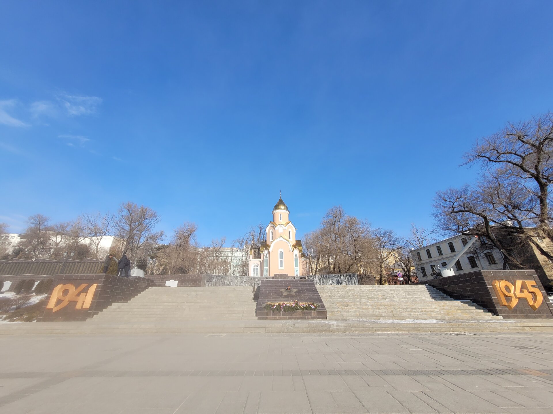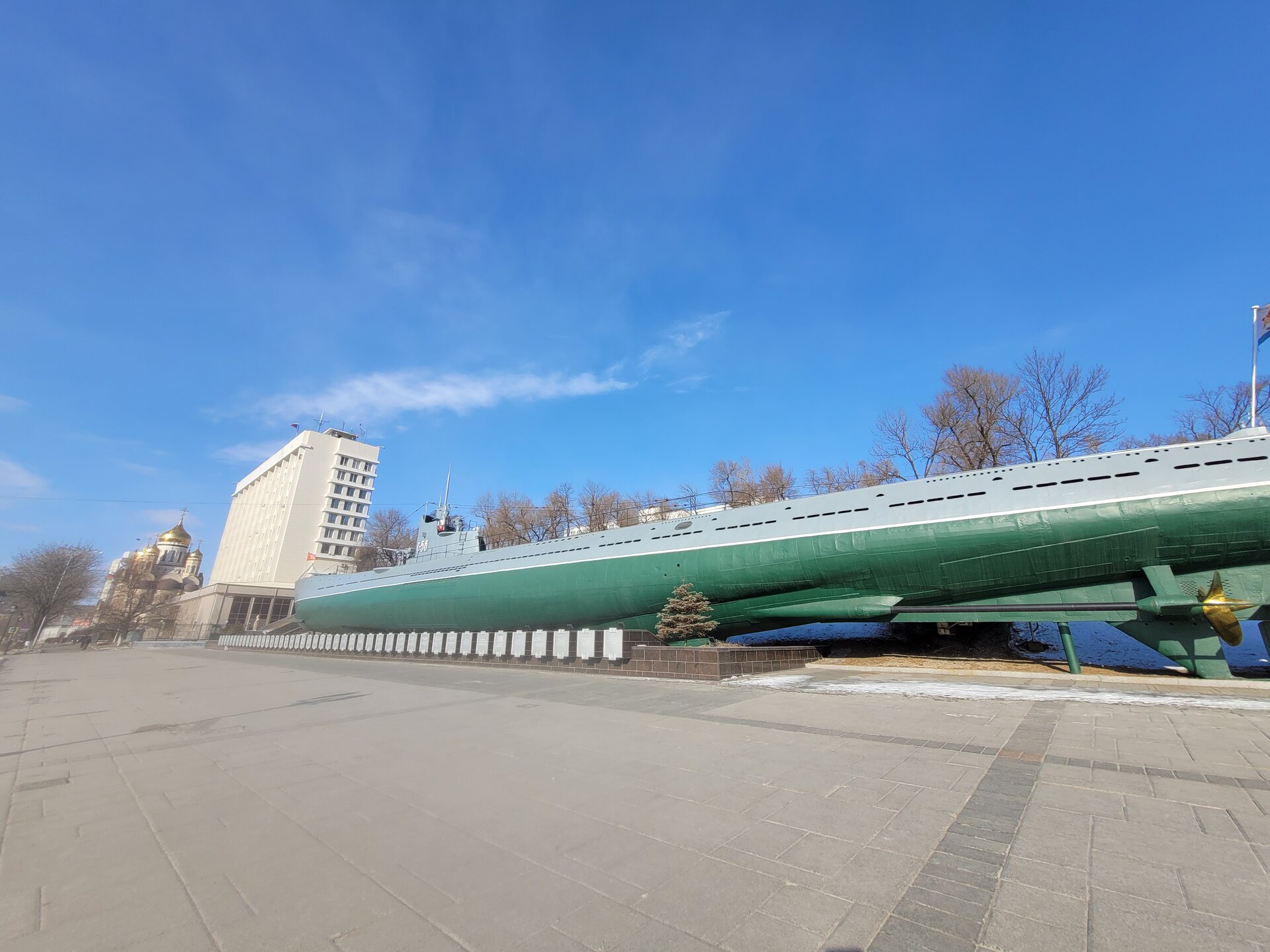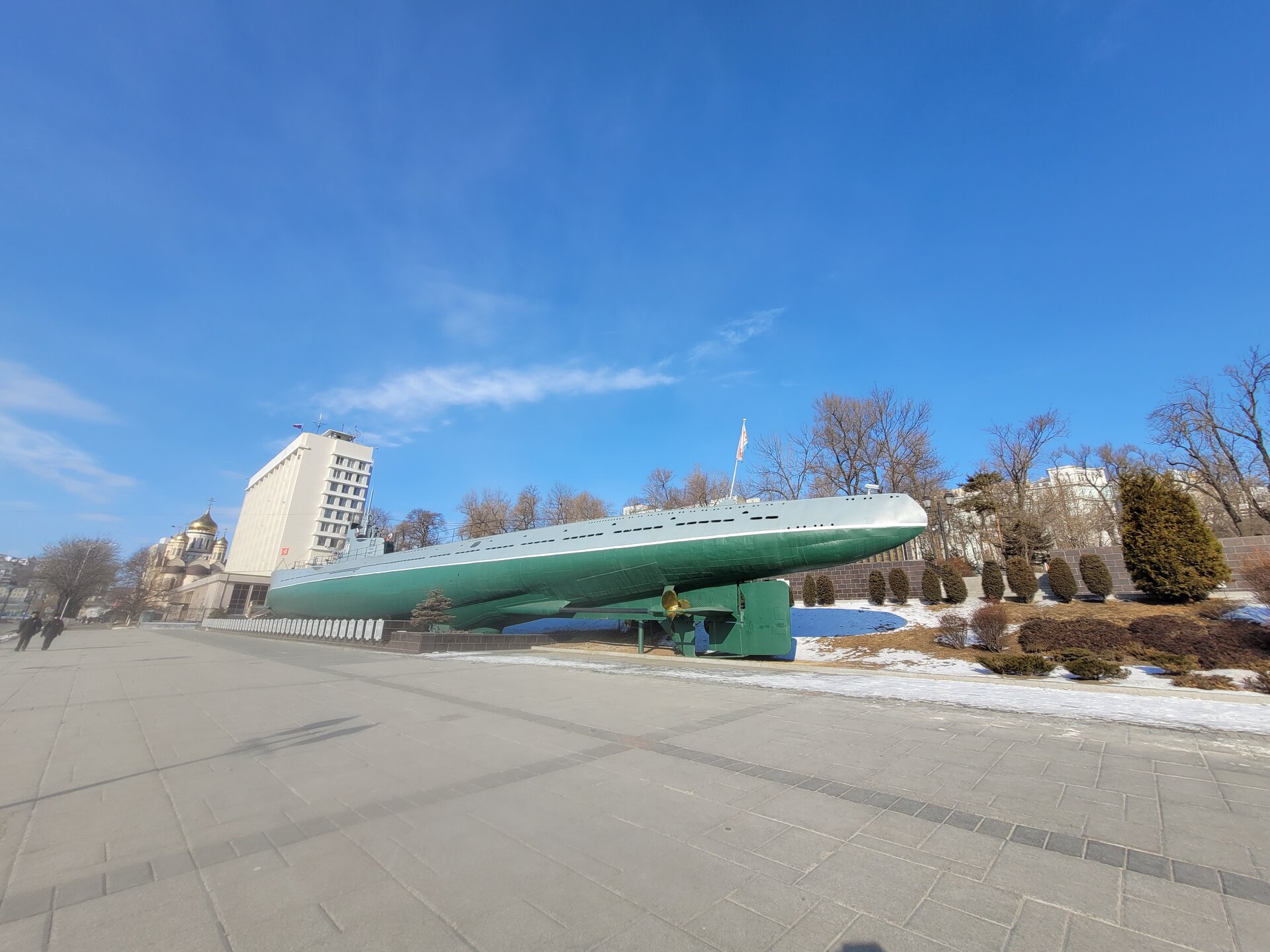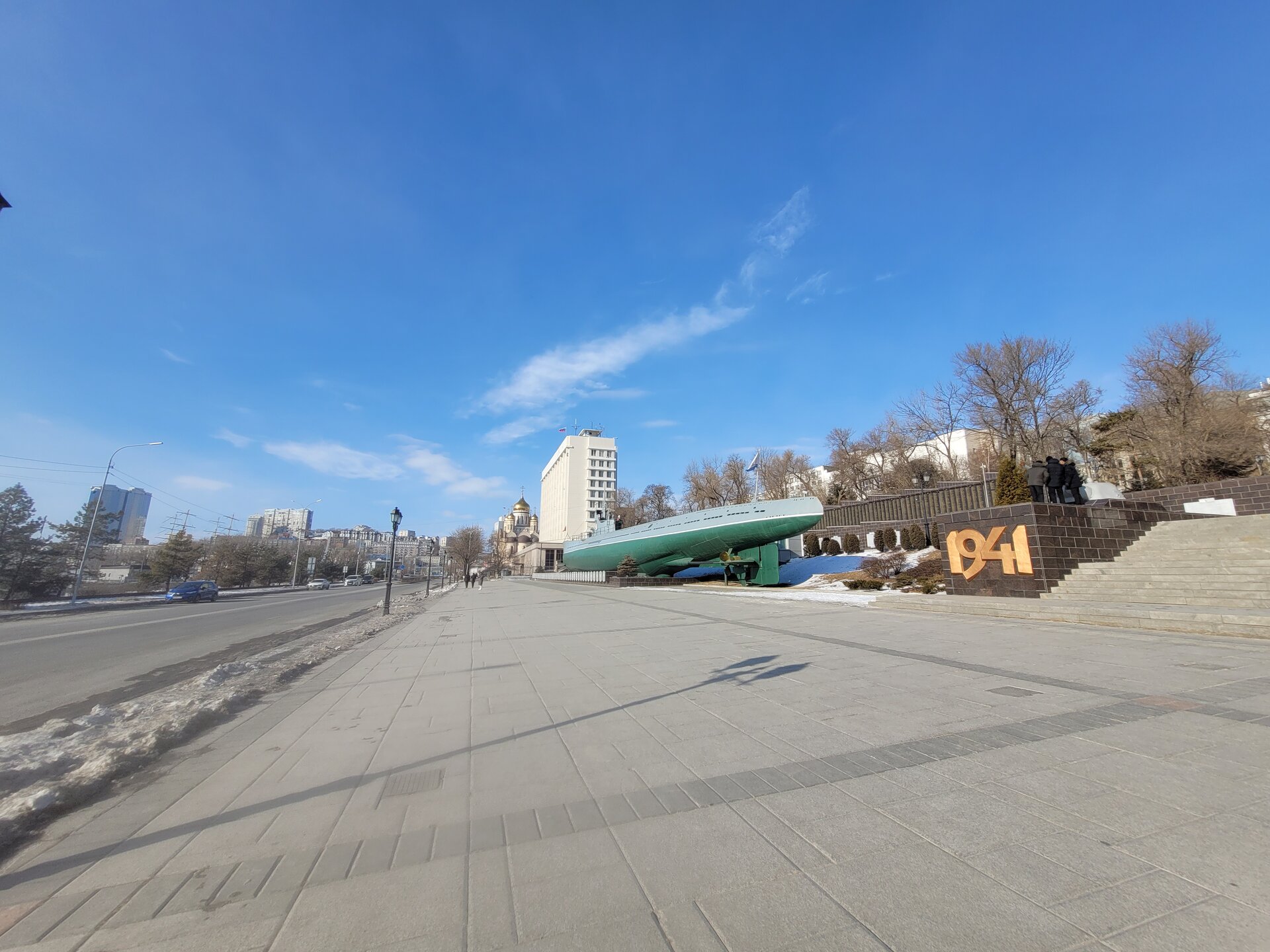 Далее мы спустились к набережной, которая имеет название Корабельная. Именно там находится ещё одна достопримечательность Владивостока, музей Подводная лодка. Но 1 января ничего не работало, поэтому был только внешний осмотр лодки. Рядом с музеем находится мемориал, посвящённый подвигу жителей и воинов Тихоокеанского флота в годы Великой Отечественной войны. И здесь можно увидеть не только Вечный огонь, который был зажжён 9 мая 1975 года в честь 30-летия Победы, став символом памяти о павших защитниках Отечества, но и памятные плиты с именами погибших, а также барельефы, отражающие военную тематику. Этот мемориал служит местом проведения торжественных церемоний, возложения цветов и минут молчания, объединяя поколения и напоминания о героизме советских солдат и моряков. И тут же ещё одна достопримечательность. Часовня Святого апостола Андрея Первозванного является неотъемлемой частью Мемориального комплекса на Корабельной набережной. А ведь совсем недавно по историческим меркам её здесь не было. Решение строить в этом знаковом для города месте часовни принято по просьбе командования Тихоокеанского флота. Строительство и торжественная закладка первого камня началось в августе 2004 года. И 12 мая 2005 года, во время празднования 60-летия Великой Победы, состоялось торжественное открытие храма.
