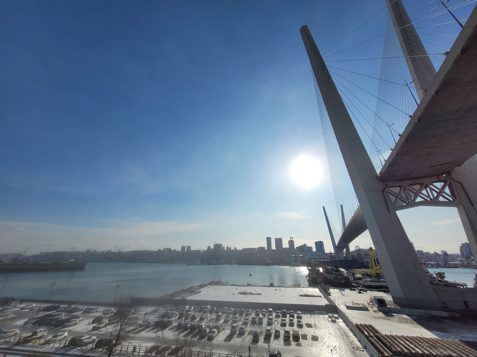 А вот и он, тот самый Золотой мост. И уже подойдя поближе, я понимаю, что всё-равно не впечатляет, но тем не менее, Золотой мост - одна из главных достопримечательностей Владивостока, идея строительства которого была ещё выдвинута в конце 19 века. В разное время её реализации мешали русско- японская война, Первая мировая, Вторая мировая и перестройка. Вот что за солнышко? Неправильно в тот день светило, и не получилось нормально сфотографировать мост. К мосту я ещё вернусь и покажу его совершенно с другого ракурса, на мой взгляд самого удачного. Ну, а нас настало время заселяться. Хотя мне кажется, мы уже часа два как могли заселиться, но раз уже были здесь, вот и решили дойти до моста. Обратно тоже шли пешком. Честно сказать, по Владивостоку было приятно ходить, тут не было снега. А ветер? Да бог с ним, пережили как-то те первые два дня. Но у Владивостока есть одна особенность. И эту особенность мы заметили сразу же в первый день. А всё дело в том, что Владивосток - это одни сплошные подъёмы или спуски, в этом городе практически нет равниных участков. Как нам потом говорили, они есть, но очень мало. В общем, надо быть готовым, что всё время придётся подниматься или спускаться. Нам в этом плане повезло, снега не было. Но я даже с трудом не представляла, если тут выпадет снег и начнёт потихоньку таять, это будет один сплошной каток. У нас в городе такое явление часто бывает, тоже катаемся, но хотя бы по равнине, а тут..... В общем, вот такой он Владивосток - город на сопках.