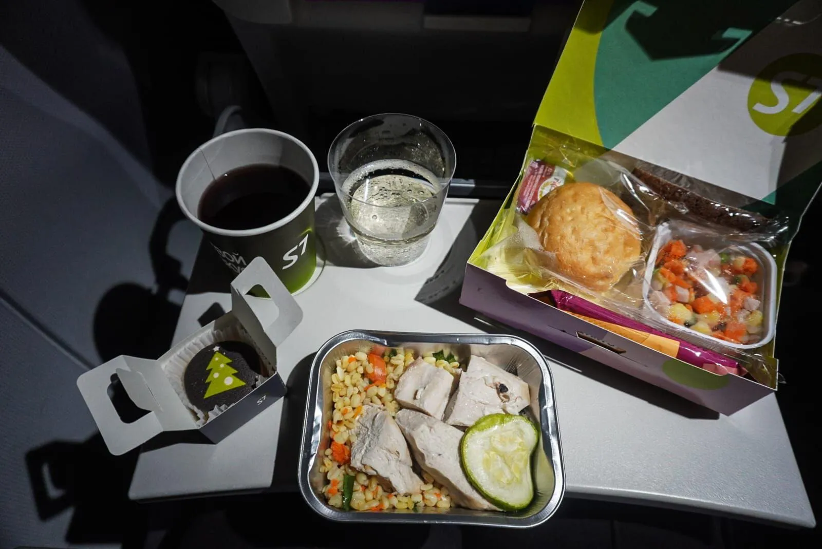 И прежде чем продолжу, ещё несколько фотографий из самолёта. До Владивостока от нас лететь 5.35 минут, и раз лететь более 5 часов, то в самолёте кормят полноценно. Но ведь ещё и Новый год, поэтому нас ещё можно было и напоить, по желанию, конечно. И чему я была крайне удивлена, никаких соков не предлагали в этот раз. Было вино, белое, красное, шампанское, кофе, чай, вода с газом и без. А ещё обожаю их "макароны", очень вкусные. Ну и вот он Новый год. Грех было не выпить шампанское, хоть и не очень приветствую этот напиток. А тут что-то меня любопытство разобрало. А сколько сейчас стоят билеты до Владивостока? Честно сказать, я даже слов приличных не нашла, чтобы выразить свои эмоции. Не, за такие деньги никогда бы не полетела в этот регион. Если обратно ещё более менее, то туда это ужас ужасный.