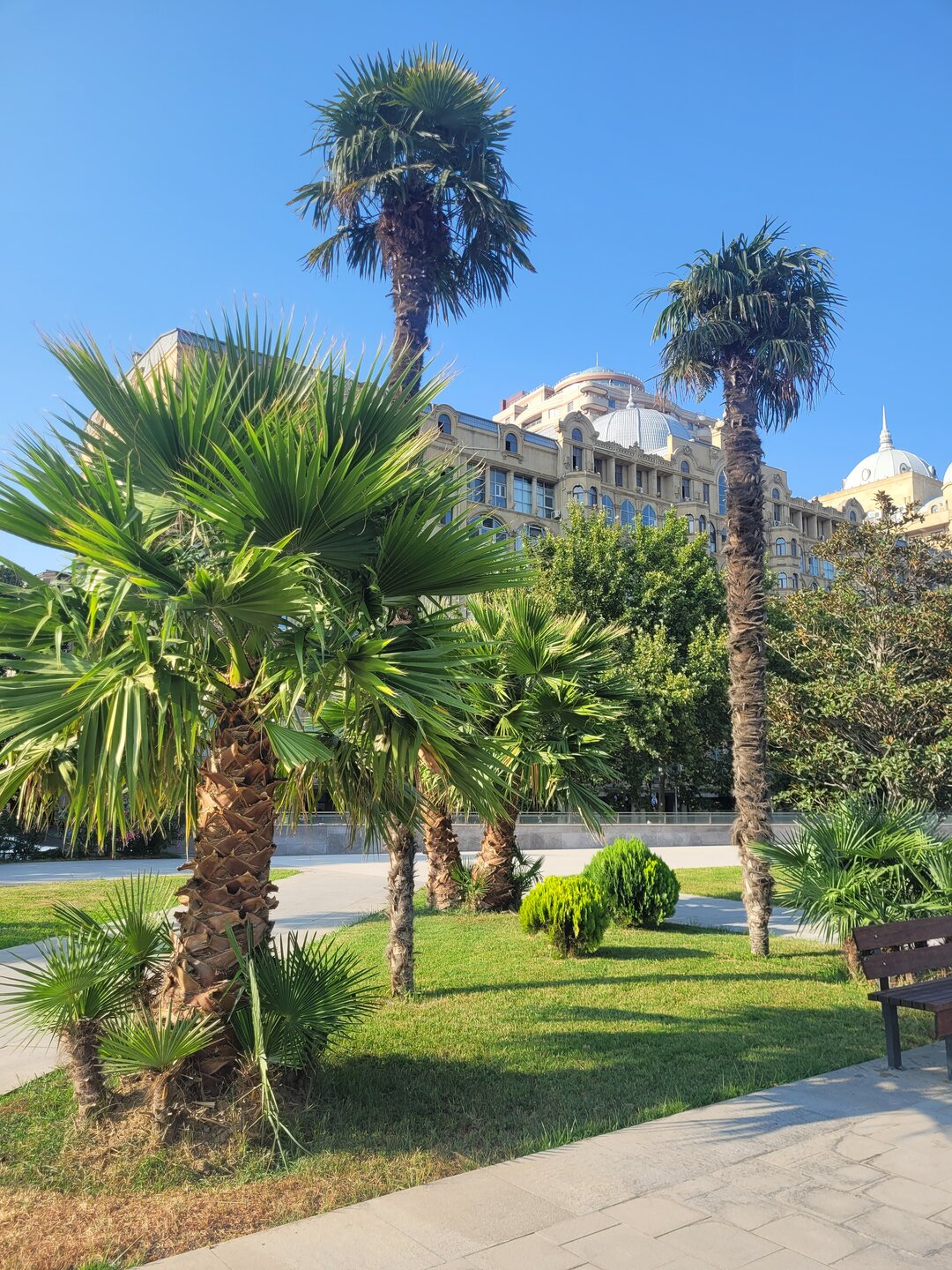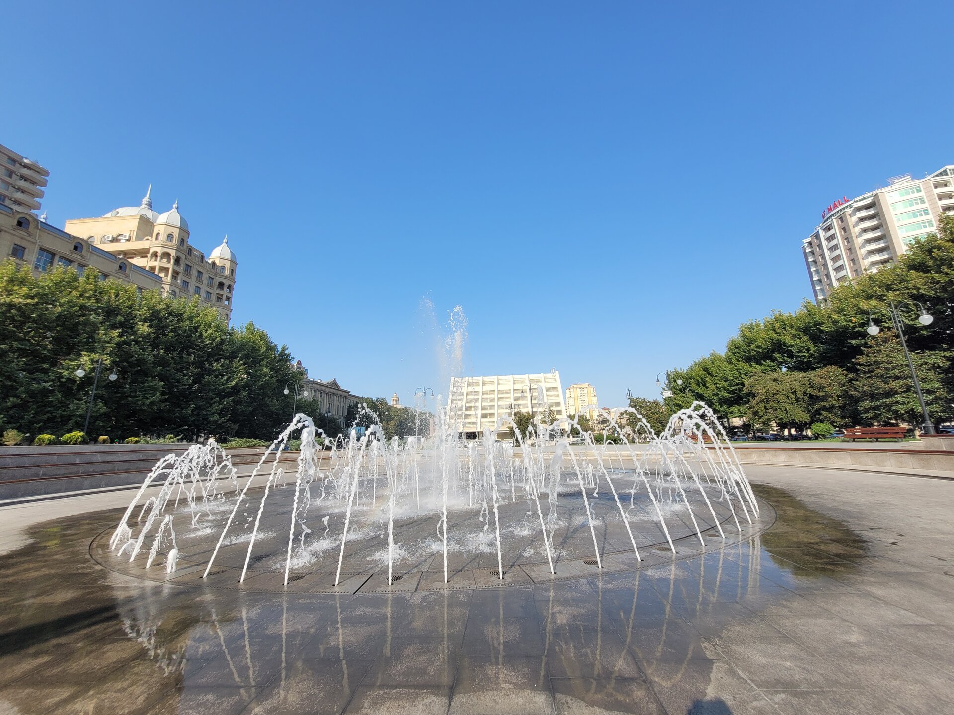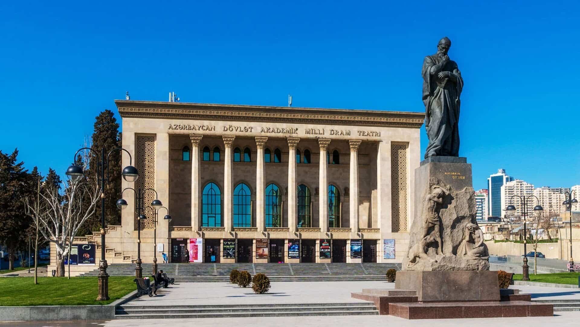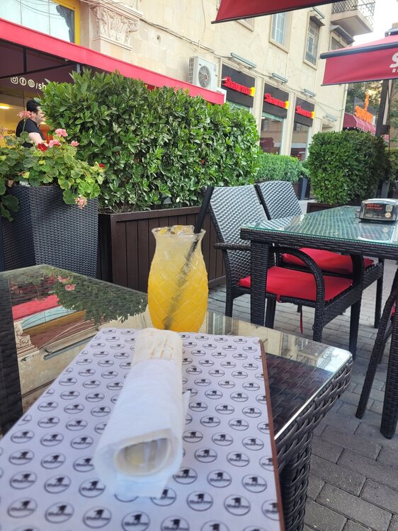 От нашего дома до этой локации около 5 минут. И называется эта достопримечательность Центральный парк имени Г. Алиева. На мой взгляд, парком это, конечно, назвать сложно, больше похоже на площадь, но тем не менее, это парк. И первое, что мы увидели, это был памятник Гейдару Алиеву, открытие которого состоялось в 2005 году. В торжестве по случаю открытия монумента принимал участие сын и преемник Гейдара Алиева, нынешний президент Азербайджана Ильхам Алиев. Также на открытие были приглашены различные представители министерств страны, общественные деятели города и международные дипломаты. Сразу за памятником расположен дворец имени Гейдара Алиева. Дворец функционирует с 1972 года, как дворец имени В.И. Ленина. В 1991 году был переименован во дворец Республики. И уже в 2004 году согласно указу президента Ильхама Алиева был переименован во дворец имени Гейдара Алиева. И сейчас дворец является главной музыкальной музыкальной площадкой Баку, вмещающей 2500 человек. Здесь наряду с концертами и другими культурными программами проводятся также государственные мероприятия. И именно здесь проходила инаугурация президентов Азербайджана Гейдара Алиева в 1993 и в 1998 годах., а также Ильхама Алиева в 2003 и в 2008 годах. И сразу за дворцом начинается Зимний парк. Такое непривычное нашему слуху название, учитывая, что по сути такой зимы, как у нас, в Баку нет. Пожалуй это даже не парк, а сквер расположенный с центре Баку, на месте старой не так давно еще действующей проезжей дороги, такой продолговатый и длинный. Исходя из данного факта, понимаете, что парк достаточно молодой и был открыт каких то 11 лет назад. Протяжённость парка довольно приличная, километра 1.5. На территории парка есть несколько кафе, где можно уютно посидеть, и в это время глазеть на прохожих и на фонтаны. А мне уж очень понравились вот такие столики и стульчики, ну очень креативно, но был существенный минус, невыносимая жара и духота на улице, всё-таки в помещении будет комфортней, везде работают кондиционеры. Но тем не менее, несмотря на жару, здесь приятно погулять в окружении вот таких интересных и красивых домов. Сюда специально я бы точно не поехала, но раз рядом жили, почему бы и нет. И закончили мы нашу прогулку Национальным драматическим театром, история которого начинается в 1873 году. Фотографию взяла из интернета. Национальный академический драматический театр располагается в здании, которое играет ключевую роль в формировании неповторимого облика Баку. Автором проекта стал талантливый архитектор Газанфар Ализаде, который придерживался редкой гармонии, сочетая в своих работах фрагменты типичной азербайджанской и классической западной архитектуры. В 2008 г. Азербайджанский государственный академический драматический театр закрылся на реставрацию. Работы проводились самым тщательным образом, главной задачей реставраторов было не повредить изначальную архитектуру строения. В 2010 г. обновленный театр принял первых зрителей. А памятник, который расположен перед театром, это памятник азербайджанскому поэту и мыслителю Физули. Довольно оригинальный постамент. Хорошо вписан в пространство площади, которая носит имя этого писателя.. А когда мы были на нашей первой выездной экскурсии, наш водитель нам рекомендовал сходить в заведение "Шаурма №1, её мы проезжали мимо, и расположена она был