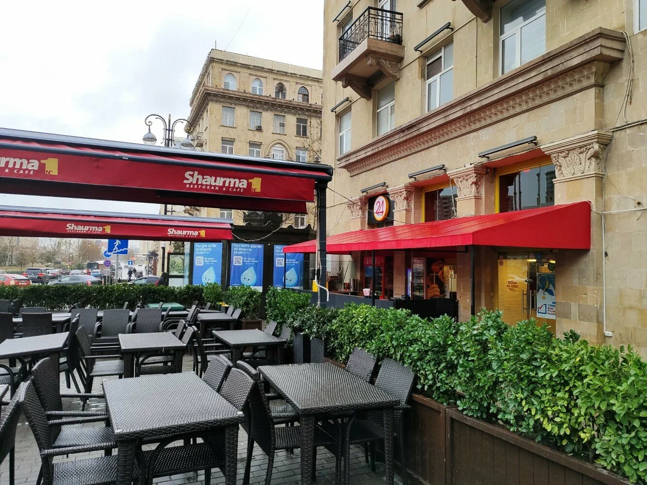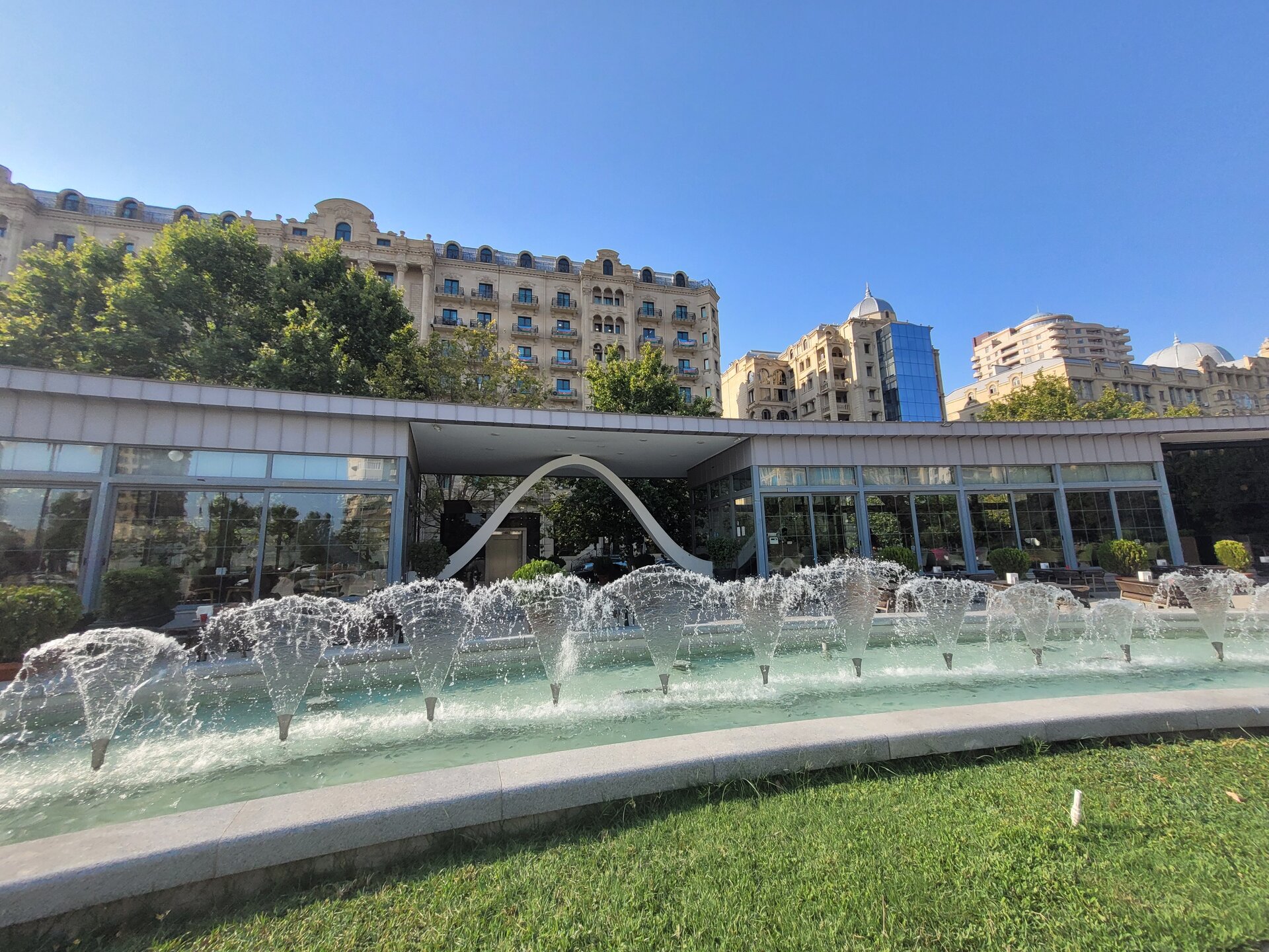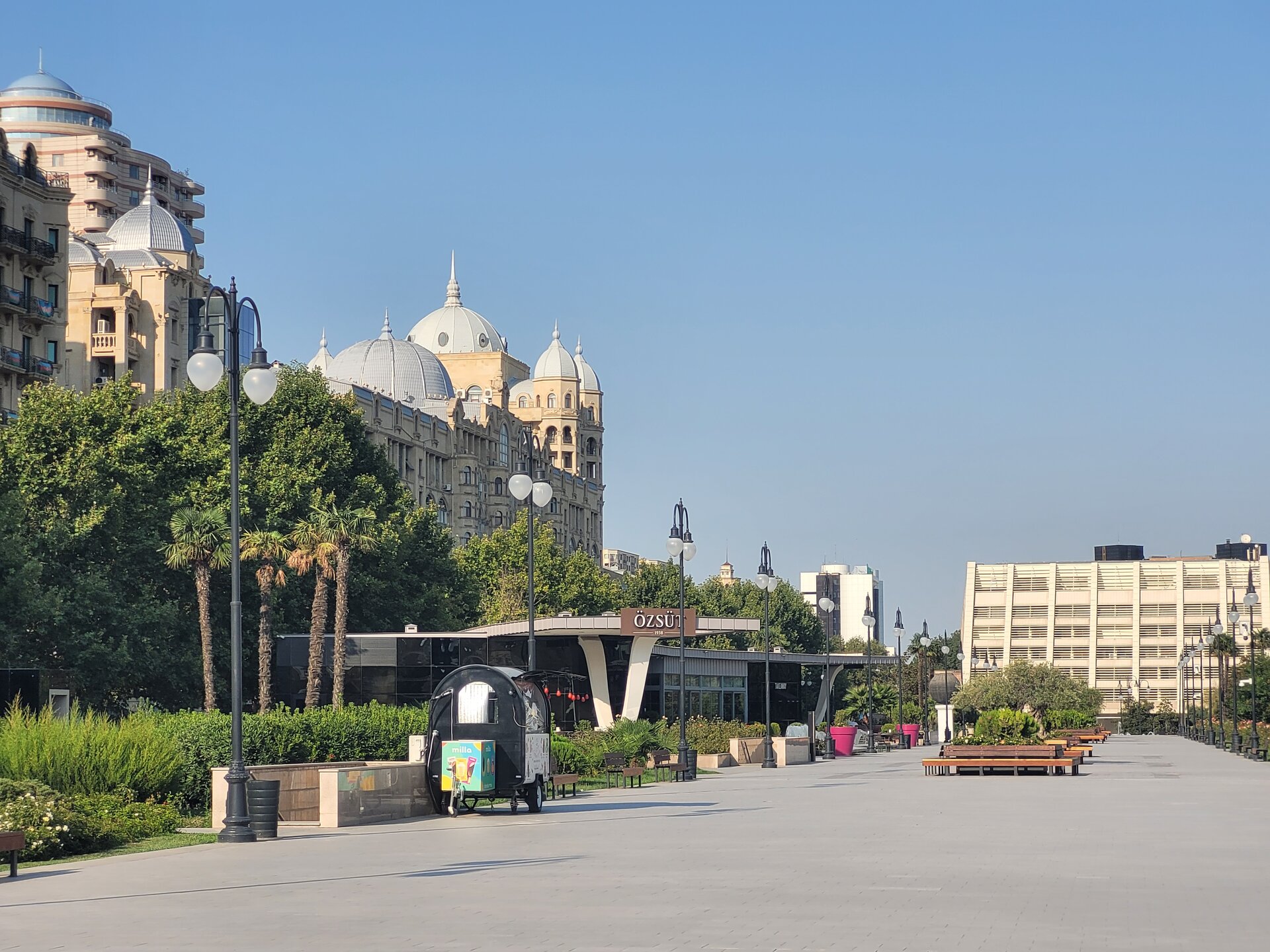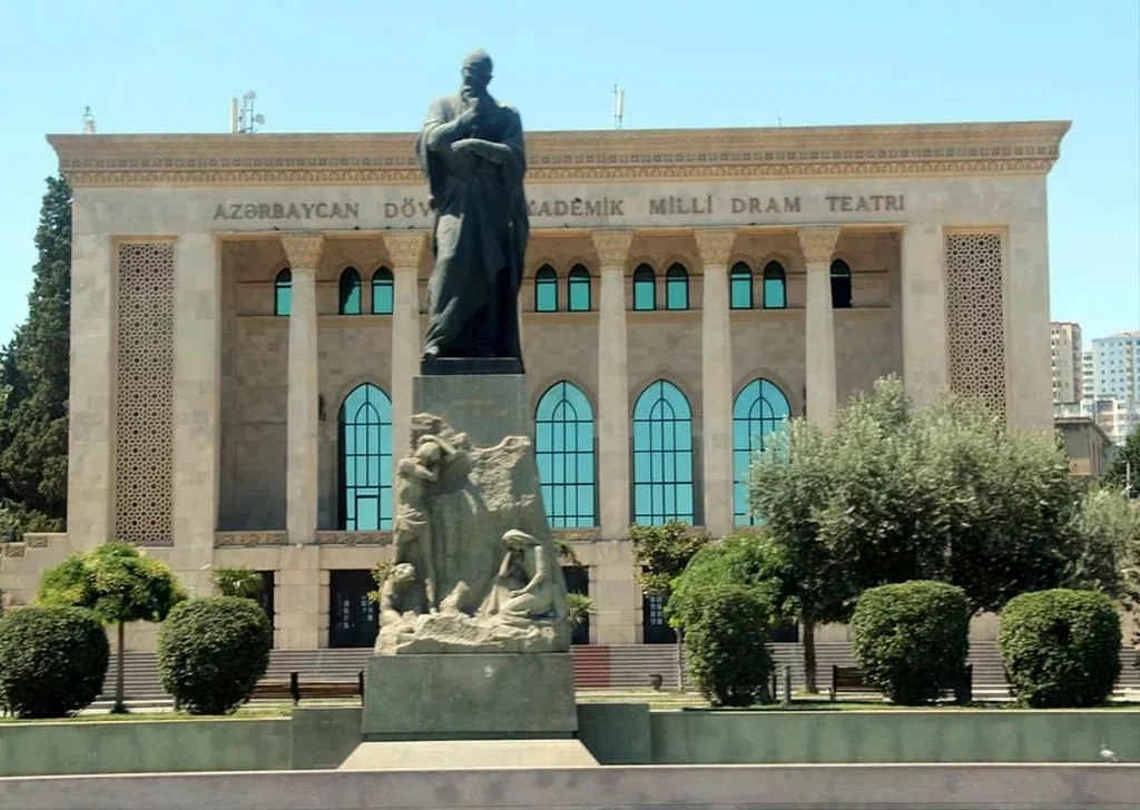 От нашего дома до этой локации около 5 минут. И называется эта достопримечательность Центральный парк имени Г. Алиева. На мой взгляд, парком это, конечно, назвать сложно, больше похоже на площадь, но тем не менее, это парк. И первое, что мы увидели, это был памятник Гейдару Алиеву, открытие которого состоялось в 2005 году. В торжестве по случаю открытия монумента принимал участие сын и преемник Гейдара Алиева, нынешний президент Азербайджана Ильхам Алиев. Также на открытие были приглашены различные представители министерств страны, общественные деятели города и международные дипломаты. Сразу за памятником расположен дворец имени Гейдара Алиева. Дворец функционирует с 1972 года, как дворец имени В.И. Ленина. В 1991 году был переименован во дворец Республики. И уже в 2004 году согласно указу президента Ильхама Алиева был переименован во дворец имени Гейдара Алиева. И сейчас дворец является главной музыкальной музыкальной площадкой Баку, вмещающей 2500 человек. Здесь наряду с концертами и другими культурными программами проводятся также государственные мероприятия. И именно здесь проходила инаугурация президентов Азербайджана Гейдара Алиева в 1993 и в 1998 годах., а также Ильхама Алиева в 2003 и в 2008 годах. И сразу за дворцом начинается Зимний парк. Такое непривычное нашему слуху название, учитывая, что по сути такой зимы, как у нас, в Баку нет. Пожалуй это даже не парк, а сквер расположенный с центре Баку, на месте старой не так давно еще действующей проезжей дороги, такой продолговатый и длинный. Исходя из данного факта, понимаете, что парк достаточно молодой и был открыт каких то 11 лет назад. Протяжённость парка довольно приличная, километра 1.5. На территории парка есть несколько кафе, где можно уютно посидеть, и в это время глазеть на прохожих и на фонтаны. А мне уж очень понравились вот такие столики и стульчики, ну очень креативно, но был существенный минус, невыносимая жара и духота на улице, всё-таки в помещении будет комфортней, везде работают кондиционеры. Но тем не менее, несмотря на жару, здесь приятно погулять в окружении вот таких интересных и красивых домов. Сюда специально я бы точно не поехала, но раз рядом жили, почему бы и нет. И закончили мы нашу прогулку Национальным драматическим театром, история которого начинается в 1873 году. Фотографию взяла из интернета. Национальный академический драматический театр располагается в здании, которое играет ключевую роль в формировании неповторимого облика Баку. Автором проекта стал талантливый архитектор Газанфар Ализаде, который придерживался редкой гармонии, сочетая в своих работах фрагменты типичной азербайджанской и классической западной архитектуры. В 2008 г. Азербайджанский государственный академический драматический театр закрылся на реставрацию. Работы проводились самым тщательным образом, главной задачей реставраторов было не повредить изначальную архитектуру строения. В 2010 г. обновленный театр принял первых зрителей. А памятник, который расположен перед театром, это памятник азербайджанскому поэту и мыслителю Физули. Довольно оригинальный постамент. Хорошо вписан в пространство площади, которая носит имя этого писателя.. А когда мы были на нашей первой выездной экскурсии, наш водитель нам рекомендовал сходить в заведение "Шаурма №1, её мы проезжали мимо, и расположена она был