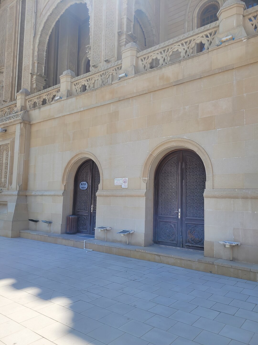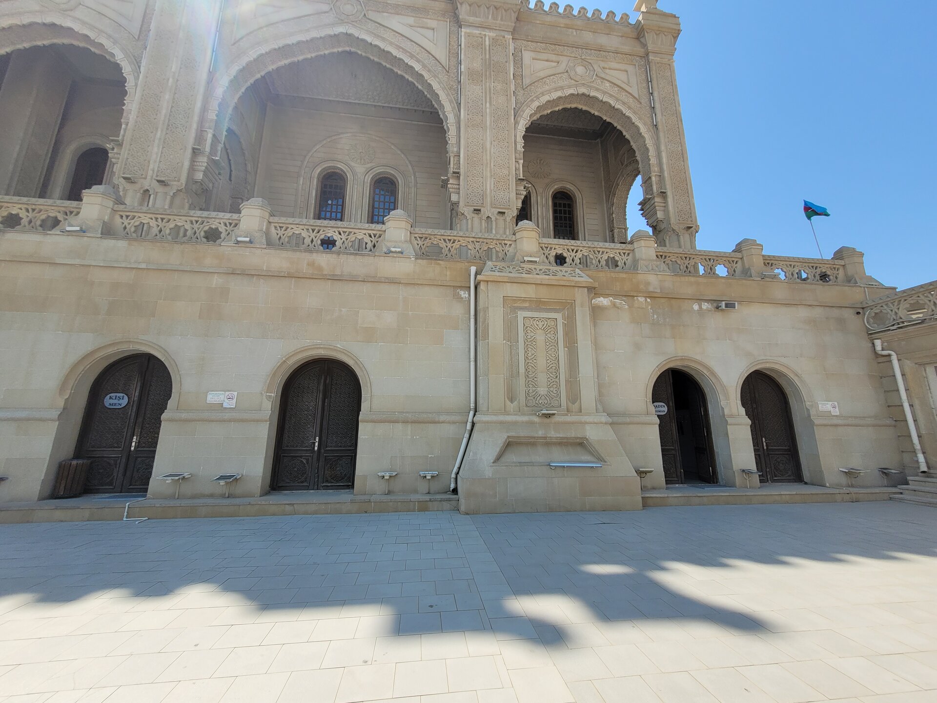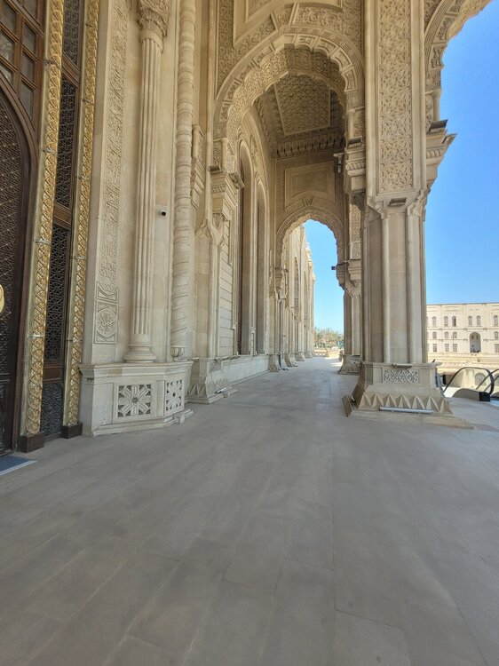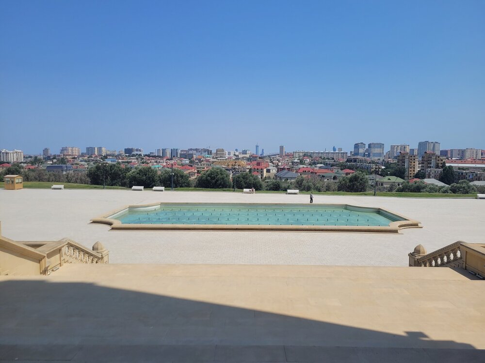 Мечеть Гейдара Алиева расположена не прям около станции и найти её без помощи карты или местных жителей не так то и просто. Мы обращались и к карте и к местным жителям, которые нас направляли в нужном направлении. В итоге мы пришли сюда. Конечно, было непонятно, как рядом с такой мечетью, вот такая территория. В общем, мы не поняли, то ли это парк какой-то, то ли просто территория, которую пока ещё не довели до ума. 20250729_133431.mp4 А вот у самой мечети всё было совершенно по другому. И так, распоряжение о строительстве Мечети Гейдара было дано сыном и преемником Гейдара Алиева, президентом Азербайджана Ильхамом Алиевым в середине 2012 года. Название мечети связано с распространённым в Азербайджане культом личности Гейдара Алиева — в честь него названы аэропорт, нефтезавод и многие другие объекты. Как я уж выше писала, в Азербайджане с уважением относятся к Гейдару Алиеву, считается, что именно с его приходом и наступил новый период истории в этой стране, а также установился порядок. Строительные работы мечети были начаты в сентябре 2012 года и завершены к концу 2014 года. 26 декабря 2014 года состоялась официальная церемония открытия мечети, в которой приняли участие глава Азербайджана Ильхам Алиев, его супруга Мехрибан Алиева и другие высокопоставленные чиновники. И то, что мы попали внутрь мечети, это можно назвать каким-то чудом. Когда мы поднялись наверх, дёрнули дверь, но она оказалась закрыта. Мы когда поднялись на территорию мечети, то уже понимали, что-то не так. Уж как-то слишком тихо было около мечети, никто не поднимался по лестнице, никто не спускался, никого не было на эскалаторах, да и около самой мечети было как-то тихо. Где народ? Такого быть не может, что главная мечеть в городе, а рядом никого. Этого дяденьку около фонтана можно и не считать. И ещё про удалённость мечети от центра города. Возможно, такая удаленность от центра для того, чтобы установить мечеть на холме, чтобы она возвышалась над городом. И отсюда открывается неплохой вид, в общем, в какой-то степени смотровая площадка. Но нас волновал вопрос, как в эту мечеть попасть? Спустились вниз, немного прошлись, увидели мужчин, спросили:" А как попасть в мечеть? Она вообще работает? Как нам ответили, да всё работает, там есть зал для мужчин и для женщин. Всё было легко и просто, только было непонятно, почему мечеть закрыта? Где эти залы? Вопросов было больше, чем ответов.