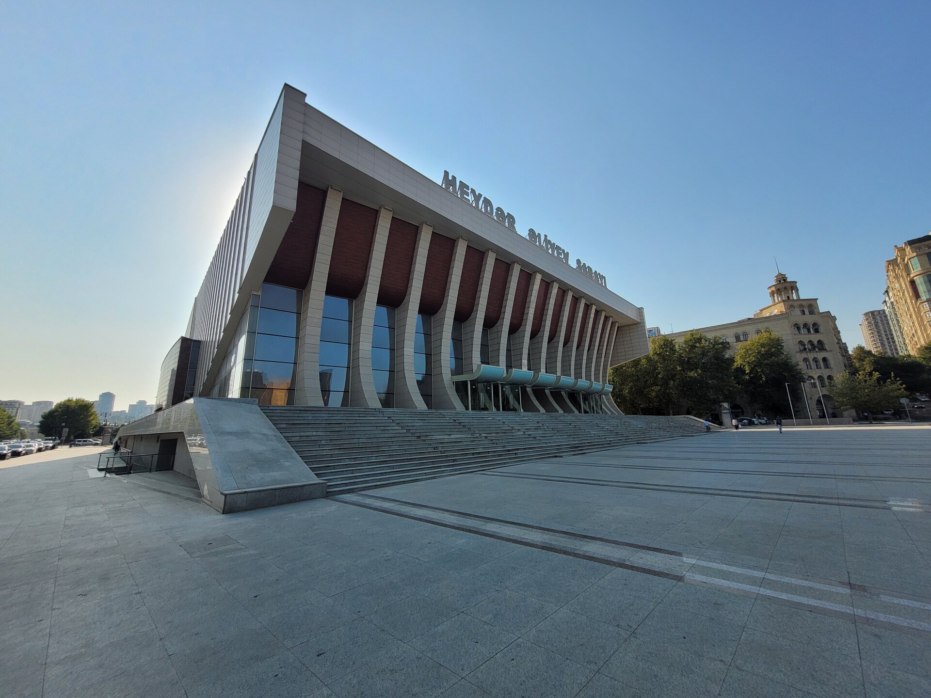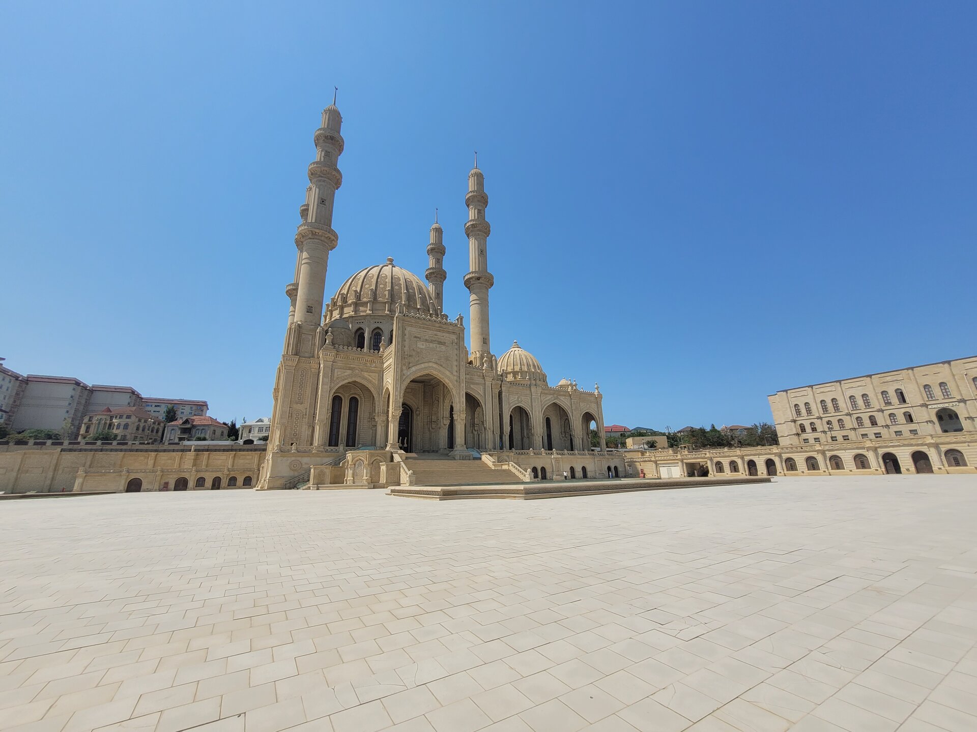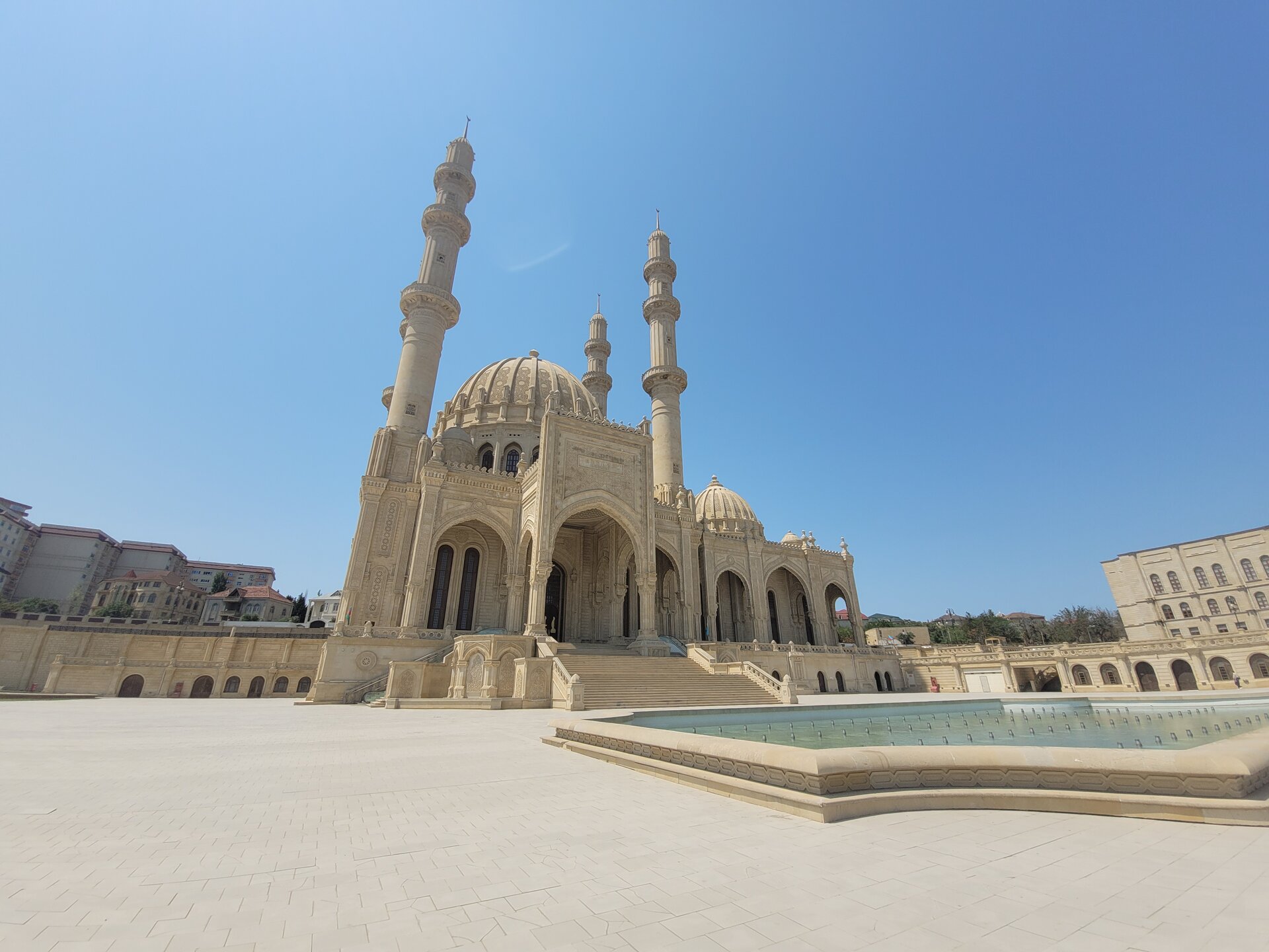 Мечеть Гейдара Алиева расположена не прям около станции и найти её без помощи карты или местных жителей не так то и просто. Мы обращались и к карте и к местным жителям, которые нас направляли в нужном направлении. В итоге мы пришли сюда. Конечно, было непонятно, как рядом с такой мечетью, вот такая территория. В общем, мы не поняли, то ли это парк какой-то, то ли просто территория, которую пока ещё не довели до ума. 20250729_133431.mp4 А вот у самой мечети всё было совершенно по другому. И так, распоряжение о строительстве Мечети Гейдара было дано сыном и преемником Гейдара Алиева, президентом Азербайджана Ильхамом Алиевым в середине 2012 года. Название мечети связано с распространённым в Азербайджане культом личности Гейдара Алиева — в честь него названы аэропорт, нефтезавод и многие другие объекты. Как я уж выше писала, в Азербайджане с уважением относятся к Гейдару Алиеву, считается, что именно с его приходом и наступил новый период истории в этой стране, а также установился порядок. Строительные работы мечети были начаты в сентябре 2012 года и завершены к концу 2014 года. 26 декабря 2014 года состоялась официальная церемония открытия мечети, в которой приняли участие глава Азербайджана Ильхам Алиев, его супруга Мехрибан Алиева и другие высокопоставленные чиновники. И то, что мы попали внутрь мечети, это можно назвать каким-то чудом. Когда мы поднялись наверх, дёрнули дверь, но она оказалась закрыта. Мы когда поднялись на территорию мечети, то уже понимали, что-то не так. Уж как-то слишком тихо было около мечети, никто не поднимался по лестнице, никто не спускался, никого не было на эскалаторах, да и около самой мечети было как-то тихо. Где народ? Такого быть не может, что главная мечеть в городе, а рядом никого. Этого дяденьку около фонтана можно и не считать. И ещё про удалённость мечети от центра города. Возможно, такая удаленность от центра для того, чтобы установить мечеть на холме, чтобы она возвышалась над городом. И отсюда открывается неплохой вид, в общем, в какой-то степени смотровая площадка. Но нас волновал вопрос, как в эту мечеть попасть? Спустились вниз, немного прошлись, увидели мужчин, спросили:" А как попасть в мечеть? Она вообще работает? Как нам ответили, да всё работает, там есть зал для мужчин и для женщин. Всё было легко и просто, только было непонятно, почему мечеть закрыта? Где эти залы? Вопросов было больше, чем ответов.