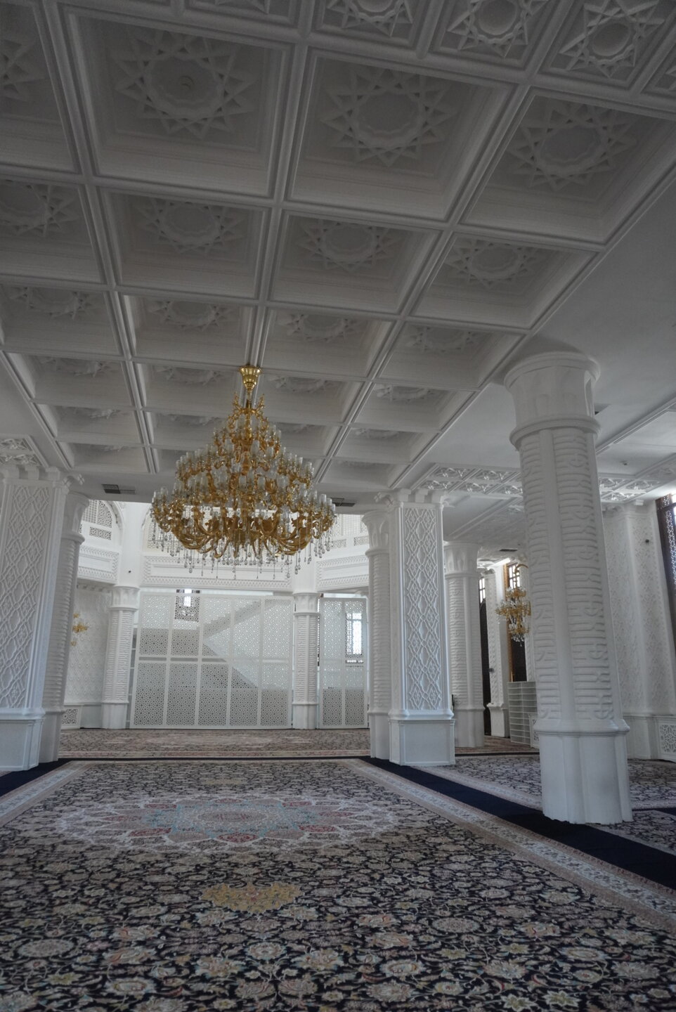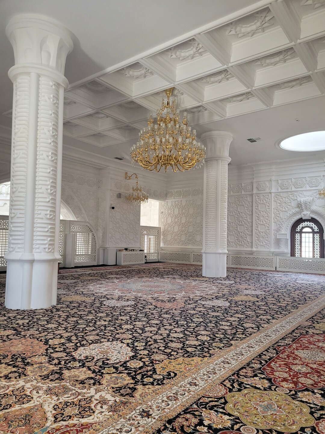 И именно в этом видео я и рассказываю как нам удалось в эту мечеть попасть. 20250729_135153.mp4 Понятно, что мы на своём веку посетили столько мечетей, что, возможно, от непосещения одной, ничего не потеряли бы, учитывая и то, что мы не знали как там внутри, может и не очень прям вау. Но это было прям вау. Нам очень понравилось. Понравилось и то, что мы просто чуть ли не в каждую дверь ломились, никак не могли понять, где вход, а если он там, то почему закрыт. В общем ходили около мечети и увидели женщину, которая сидела на лавочке, у которой и спросили, как в мечеть попасть? И это было просто везение, она оказалась дежурной в этой мечети и любезно нас пригласила, но не с главного входа, сбоку была дверь, вот в неё мы и зашли, тут же сразу была гардеробная, лестница ведущая на второй, в женскую её половину. Ну, а мы прошли туда, куда женщинам вход закрыт. Внутри мечеть очень светлая (только преобладает уже не бежевый цвет, как практически все здания в городе, а белоснежный цвет) и как можно видеть на видео и на фотографиях, мечеть внутри такая же нарядная, как и снаружи. На полу постелены традиционные азербайджанские ковры, а залы и холлы храма освещают позолоченные люстры. Молиться в окружении этой красоты могут последователи двух главных течений ислама: сунниты и шииты.
