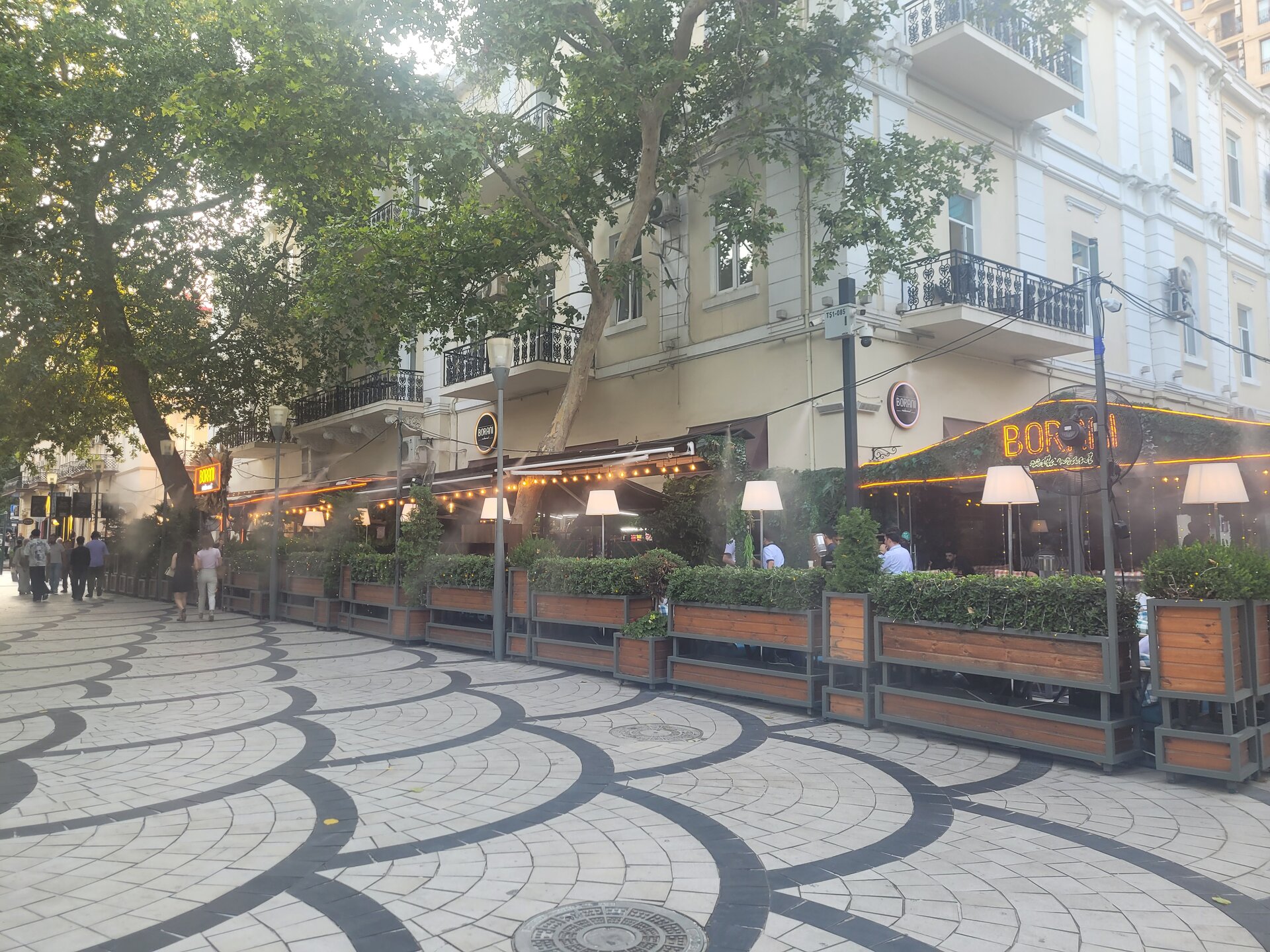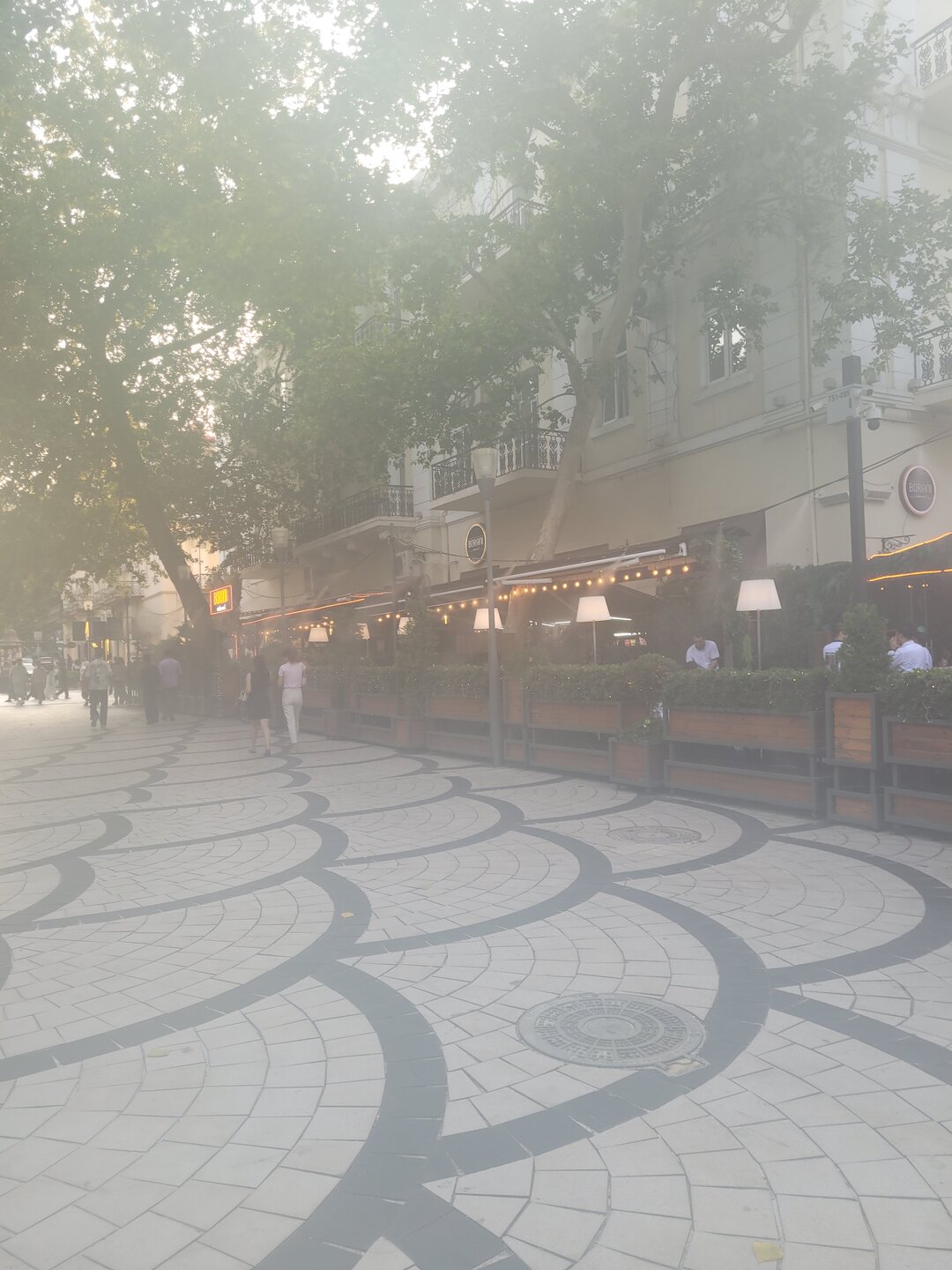 А вот дальше было очень интересно, смотрю я фотографии что у нас было дальше? А дальше у нас была площадь Фонтанов. Я спрашиваю у дочи: "А мы ещё раз были на этой площади? А как мы туда попали?" Вот хоть убейте, не помню, чтобы мы ещё раз сюда приходили. Я и так и сяк напрягала свою память, которая мне уже начала говорить: "Ты бы ещё через год начала вспоминать, где была. Тебя носит не пойми где, а мне напрягаться надо". Но благо есть фотографии и видео, которые говорили, мы тут были. 20250729_194450.mp4 На фотографии такое ощущение, как будто туман. Но все мы знаем, что в дни жары, многие кафе используют такие конструкции, от которых брызгаются мелкие капельки воды на посетителей кафе, да и на прохожих тоже. Вот такой своеобразный уличный кондиционер. Но площадь Фонтанов не стала заключением в тот наш день, так что, идём дальше.