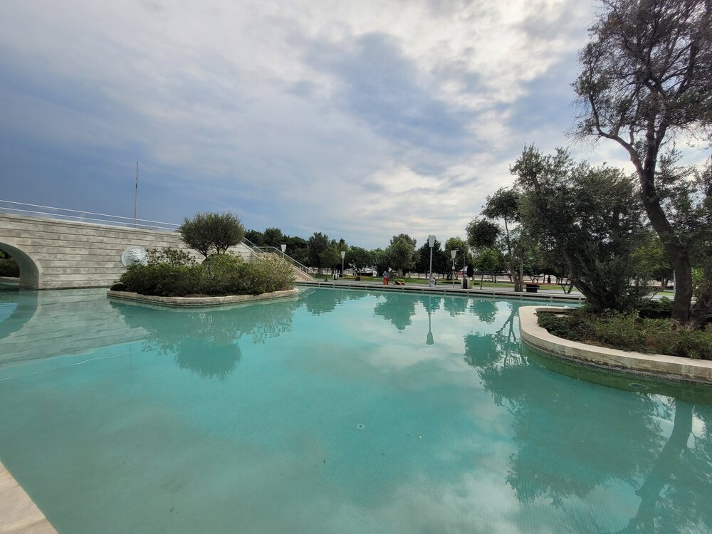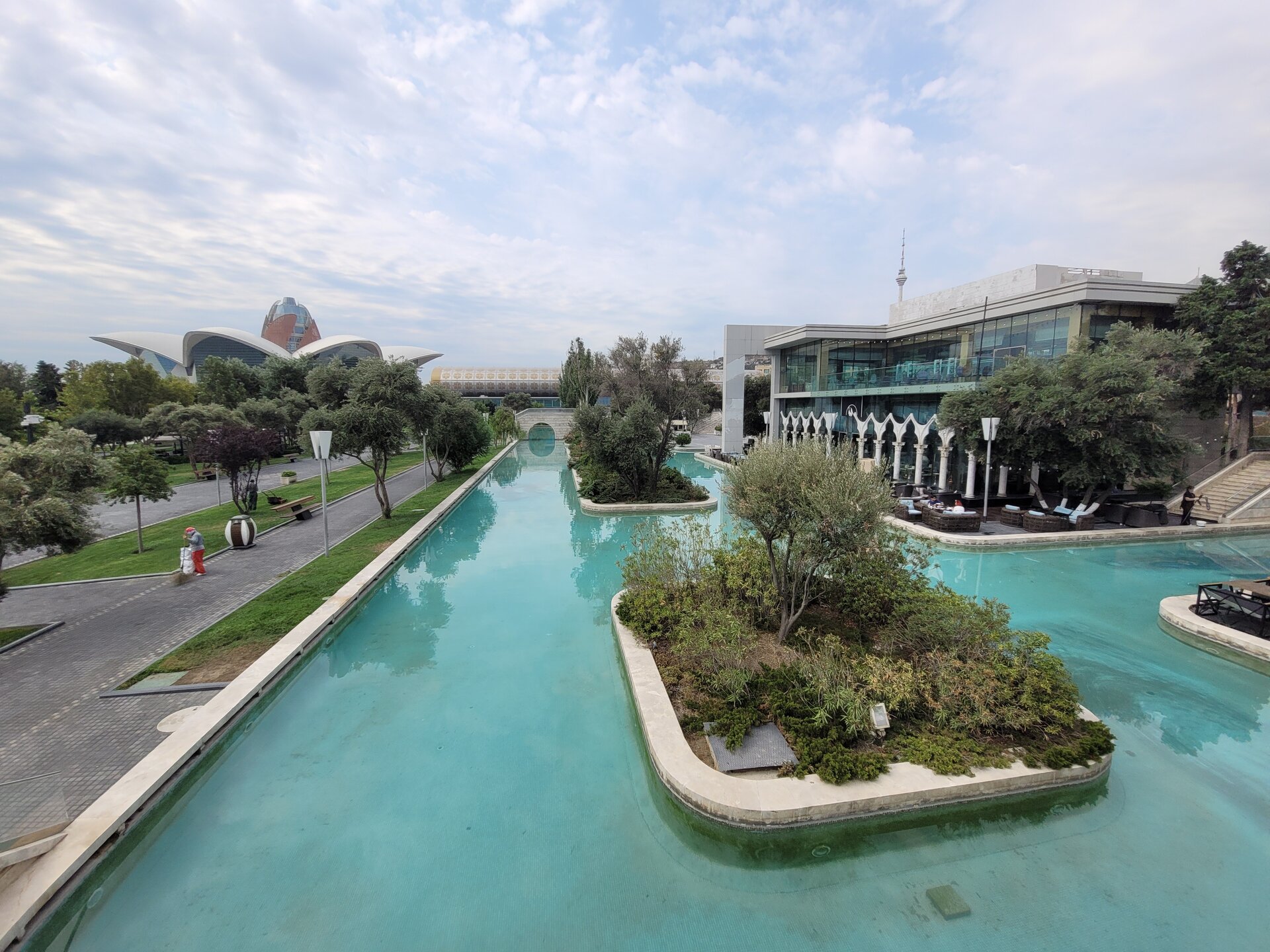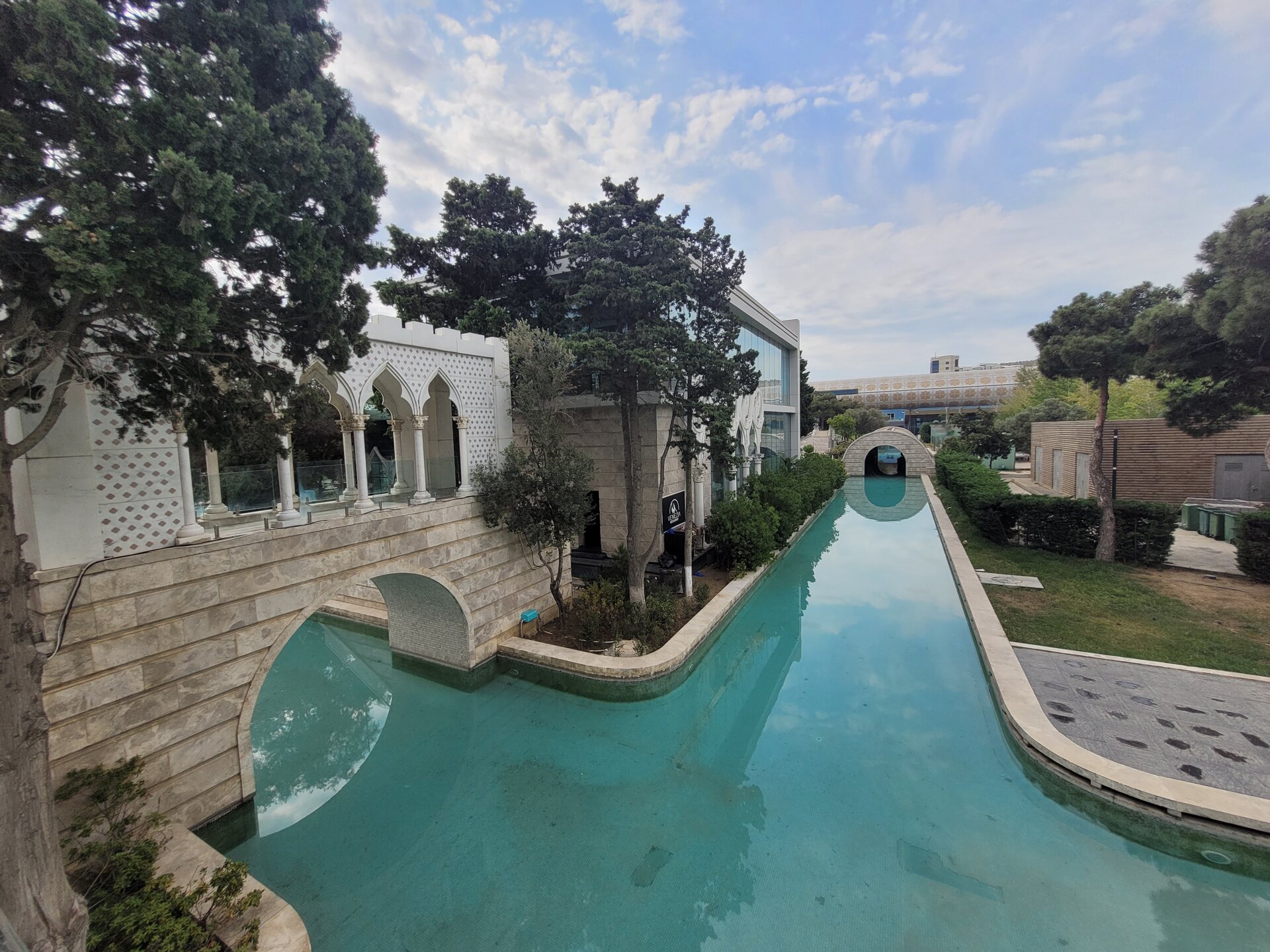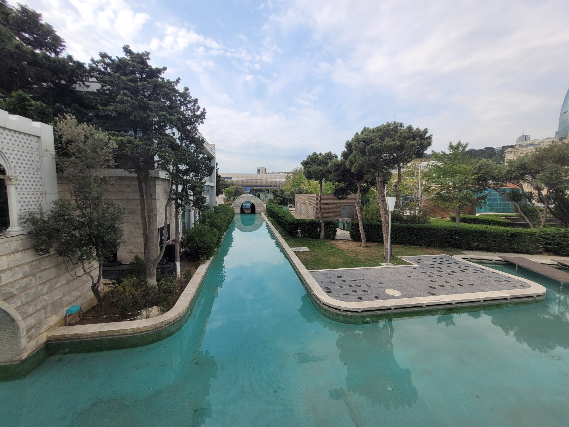 Неизвестно, как бы дальше сложилась судьба каналов, если бы в 2011 году бульвар не посетил Президент Ильхам Алиев. Президент проверял, как идёт строительство здания музея ковра и народно-прикладного искусства и обратил внимание на «Малую Венецию». Поручение о реконструкции было выдано мгновенно. Работа закипела, и через год произошло праздничное открытие обновленного уголка Италии. Реконструкция позволила вернуть привычный облик зоне отдыха и привнесла в неё новые черты. С берега на берег перекинулись новые мосты, а по каналам заскользили настоящие гондолы, доставленные из Италии. Протяженность каналов азербайджанской «Венеции» составляет 1350 метров, а глубина достигает 1,3 метров. И как понимаю, от желающих почувствовать себя настоящим итальянцем, нет отбоя. Чтобы получить в распоряжение лодку, придётся постоять в очереди. Увы, когда мы здесь гуляли, было ещё рано, не то что от боя не было, ещё не было ни каких желающих. Жаль, конечно, а так прокатились бы на лодочке, галочку поставили, что мы здесь были и продолжили бы знакомиться с другими достопримечательностями Баку. Ну и, конечно, как, если ни здесь устроить себе масштабную фотосессию. Побывать здесь и обойтись парой кадров не получится. Поверьте на слово, что так оно и есть. Мне кажется мы фотографировали каждый кусочек этого удивительного места. И как видно по фотографиям никто нам не мешал. Национальный архитектурный колорит, белоснежные мраморные лестницы, стеклянные перила достойны того, чтобы быть запечатленными на фотографиях. Неслучайно в парк приезжают молодожены. Жених и невеста фотографируются на фоне изумрудных каналов экзотических деревьев. В солнечном Азербайджане нет недостатка в хорошей погоде, которая так необходима для удачных кадров. «Маленькую Венецию» любят люди разных поколений. Одни вспоминают Баку своей молодости, другие наслаждаются красотой и самобытностью современного парка. Равнодушных среди тех и других точно нет. "Малая" Венеция в Баку — это оазис романтики, искусно вписанный в городской пейзаж. Она привлекает туристов своей необычностью и позволяет на мгновение забыть о шуме большого города, погружаясь в атмосферу венецианской элегантности. Забегая вперёд напишу, сюда мы чуть позже ещё вернёмся. И не трудно догадаться зачем? Ну, конечно, чтобы прокатиться на самой настоящей гондоле и почувствовать себя итальянцем в Баку.