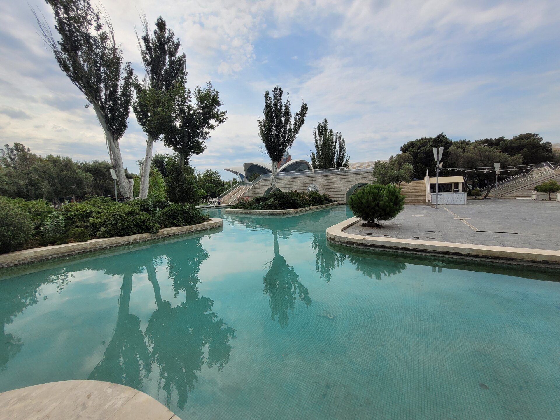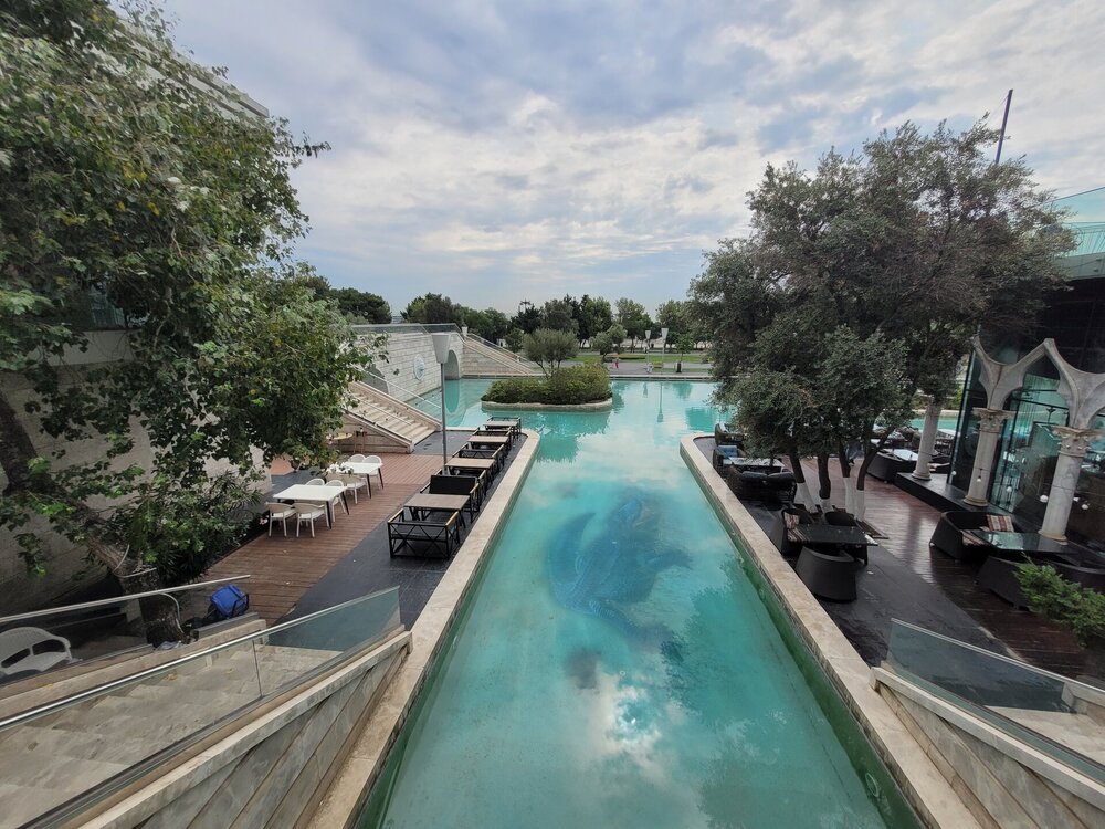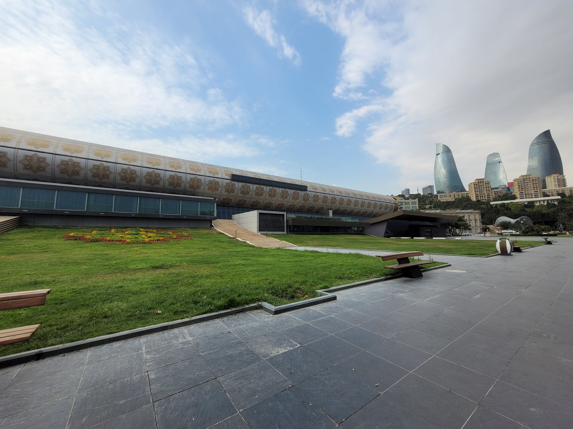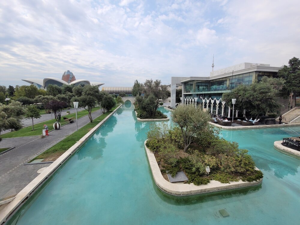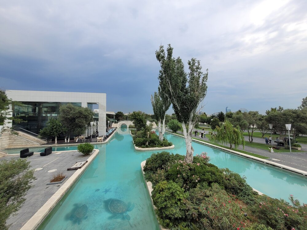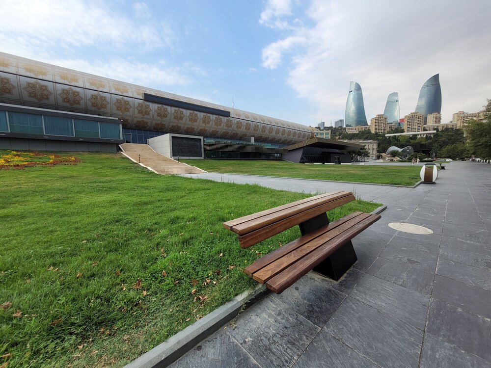 Вот такая она "Малая" Венеция в Баку. Очень интересное, атмосферное место. Не знаю как здесь бывает вечером, когда мы утром гуляли, как я уже выше писала, не было никого, нам никто не мешал и мы никому не мешали. Пару человек видели в ресторанах Венеции, да сотрудника, который убирал территорию, на этом пожалуй и всё. 20250726_095657.mp4 Музей ковра невозможно не узнать. Если знать как он необычно выглядит, то его можно увидеть издалека. Ну очень оригинальное здание. Можно даже сказать, что музей ковра находится в ковре, именно так, в виде свёрнутого ковра, и было построено этот здание. Восток и ковры — это неразрывные части одного целого, поэтому вовсе не удивительно, что в Баку существует музей, посвященный ковроткачеству. Это декоративно-прикладное искусство появилось в Азербайджане ещё в древнейшие времена, и с тех пор ковры не утратили популярность. В залах музея представлено около 6 000 ковров и бытовых предметов из ковровой ткани, коллекция национальной одежды, вышивки. Старейшие изделия созданы в 17 веке. Тут же установлены старинные ткацкие станки, можно понаблюдать за рабочим процессом. На мой взгляд достойный музей. Но нам многие говорили, если вы планируете посетить центр Гейдара Алиева, то музей ковра можно и не посещать. Но нам же всегда необходимо убедиться самим, так это или нет. А ещё наше внимание привлекли вот такие скамейки. Я не знаю правильно я подумала или нет, но мне показалось, что эта и скамеечка и столик. Можно и посидеть и перекусить чего-нибудь. Если сесть и кушать, то можно любоваться оригинальным зданием музея, А если сесть спиной к музею и просто посидеть, то можно любоваться Венецией. В общем, прикольные скамеечки. Мне понравились. Ну, а в музей мы, к сожалению, с первого раза не попали. Почему? Причину непопадания я рассказываю в своём видео. Поэтому повторяться не буду. А мне так и хочется спросить, вот как так? На гондолах с первого раза не прокатились, в музей не попали. В общем, на ходу меняли свои планы. 20250726_100950.mp4