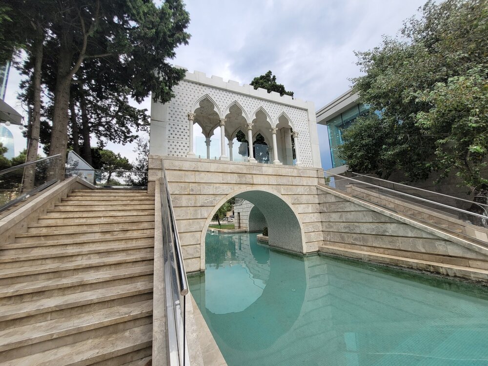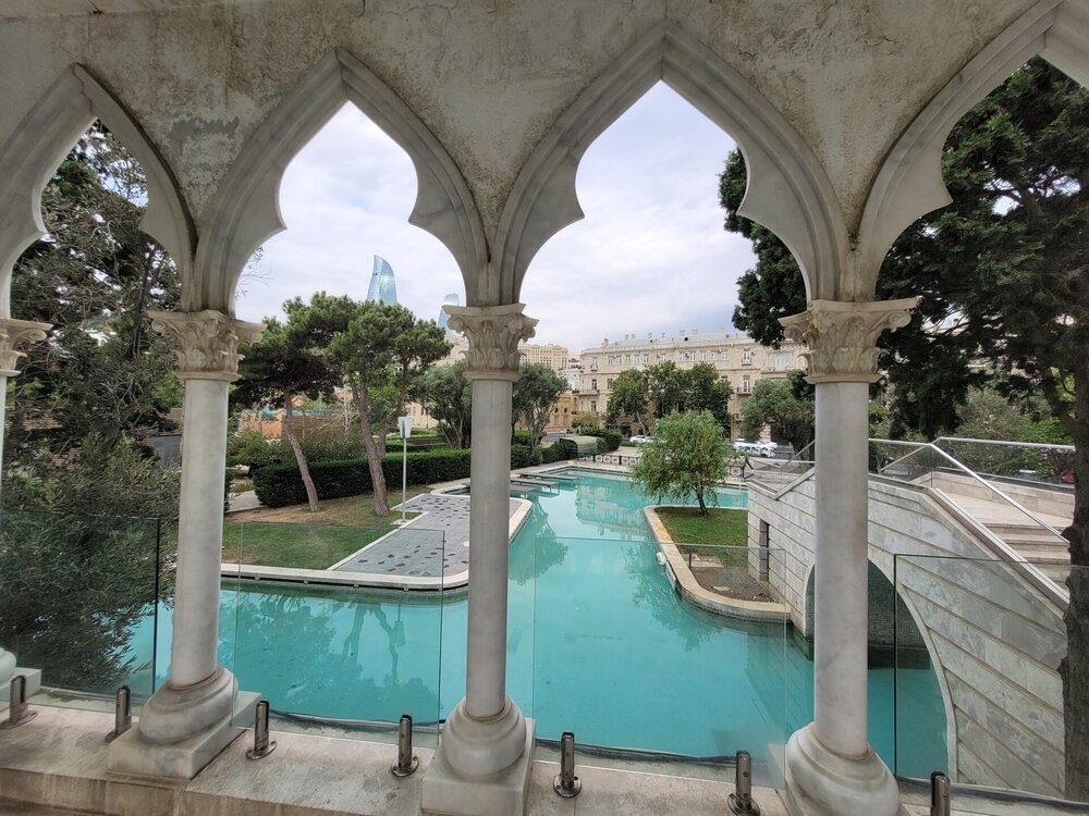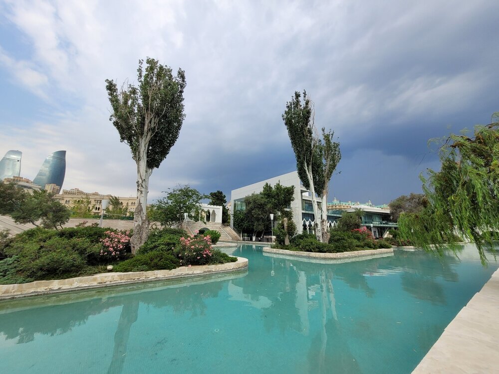 Вот так и закончилось наше знакомство с садом Филармонии, который начинается почти сразу от метро Ичери-Шехер и тянется вдоль знаменитой улицы Истиглалият. Как я уже писала Истиглалият - это улица с оживленным движением и изумительными по красоте домами. Нас на этой улице волновал парк на противоположной стороне, как сказала доча, после изучения карты, что именно вон там и находится Губернаторский парк. Вот нет, чтобы успокоиться, и ехать домой, но мы же не ищем лёгкий путей. И самое интересное, карта, нам, действительно, показала, что та зелёная зона и есть тот самый парк. Но это на одной, другая карта нам показывала, что это Музейный парк. В общем, запуталась окончательно. Ладно сама, но ещё и полицейских запутала, которые кажется ничего не поняли, но делали вид, что всё понимают и что они в теме. В общем, мы решили, что нам срочно надо туда, должна же я понять, что там за парк. Но на нашем пути возникло одно препятствие - это дорога. Решили, что не будем думать сейчас как эту дорогу перейти, подумаем об этом минут через 10. Тем более на противоположной стороне мы увидели не только какой-то парк, но и музей. Национальный музей искусств Азербайджана по своим размерам и масштабу коллекции вряд ли сравнится с теми же Лувром и Эрмитажем, тем не менее здесь найдут чем удивить посетителей. Конечно, большая часть выставки посвящена работам азербайджанских живописцев. Помимо отечественных творцов, в музее искусств широко представлены работы западноевропейских и русских художников. Поклонники живописи будут в восторге, а если вы далеки от искусства, то посещение галереи в Баку станет отличным поводом для знакомства. В этом музее, который был основан в 1936 году, а в 1943 году был назван в честь видного азербайджанского театрального художника Рустама Мустафаева, хранятся свыше 17000 произведений искусства. В настоящее время музей располагается в двух построенных в конце 19 века старинных зданиях, которые находятся по соседству. Я рассматривала этот музей для посещения, но как поняла, что информации на русском языке нет, насколько это соответствует действительности не знаю. Читала, что если идти в музей, то лучше взять экскурсию. А ещё, именно здесь, к сентябрю готовили трассу для проведения этапа "Формулы 1". Во многих местах города мы видели вот такие трибуны для зрителей. А ещё, именно здесь находится Администрация президента, за зданием администрации видны Пламенные башни, ещё одна достопримечательность Баку, чуть позже мы с ней поближе познакомимся. Строительство дворца началось в 1978 году. 1986 году здание сдано в эксплуатацию. Почему дворец? Всё очень просто. 25 июня 2003 года на основании распоряжения Президента Азербайджанской Республики Гейдара Алиева зданию был присвоен статус Президентского дворца. Фотографировать здание нельзя, делают замечание, но это если в открытую. Я просто юмора не поняла, полицейские стояли только около здания, а что мешает с противоположной стороны фотографировать? Если уж нельзя, значит надо расставить полицейских везде. А так, как-то не серьёзно А ещё наше внимание привлёк вот это розовый дом, мне кажется фотография не передаёт насколько это здание красивое. Глядя на это здание, я понимала, что оно никак не может быть современным, так оно и оказалось. Это дом братьев Садыховых, который был построен в 1910-1912 гг. И где-то здесь мы