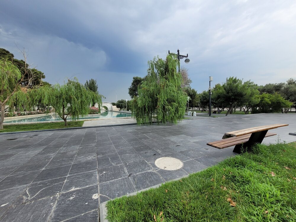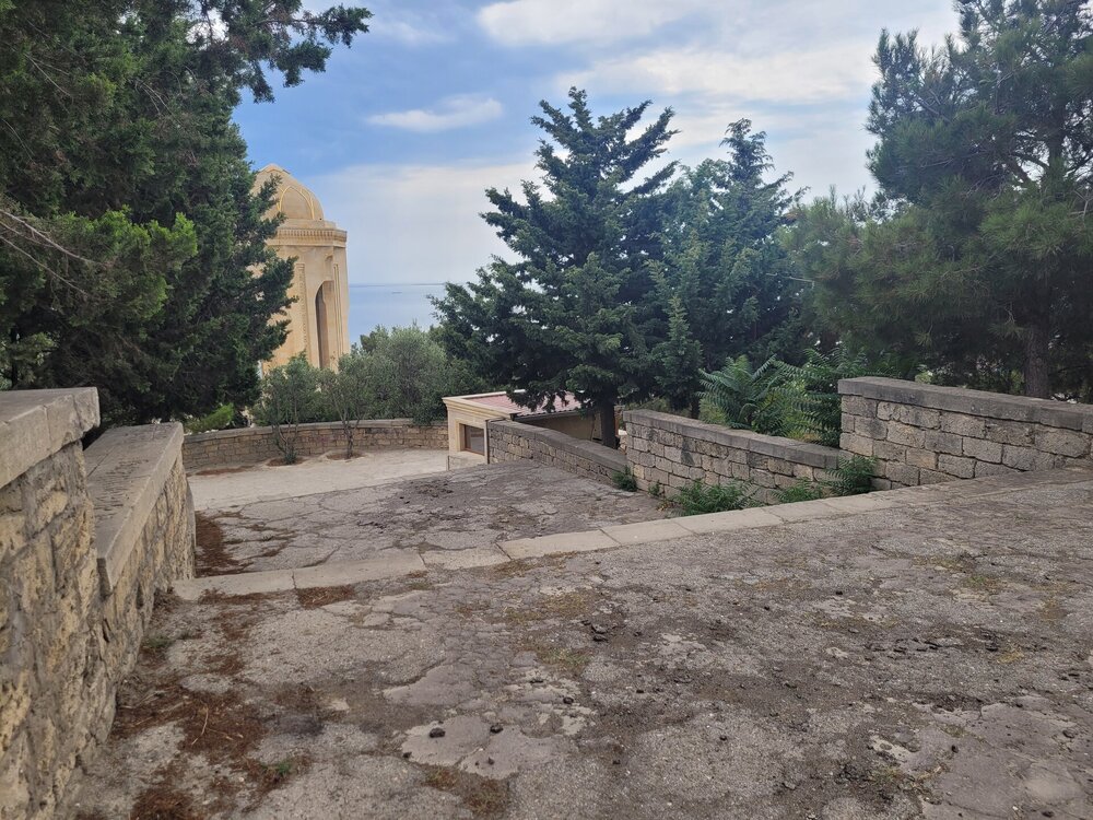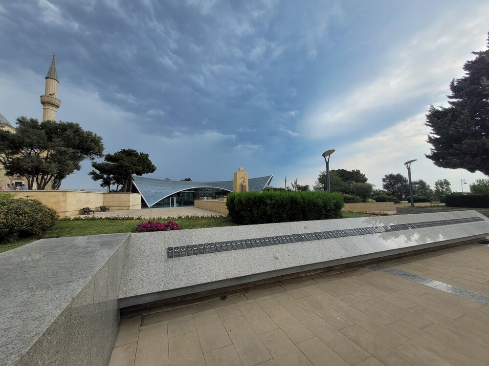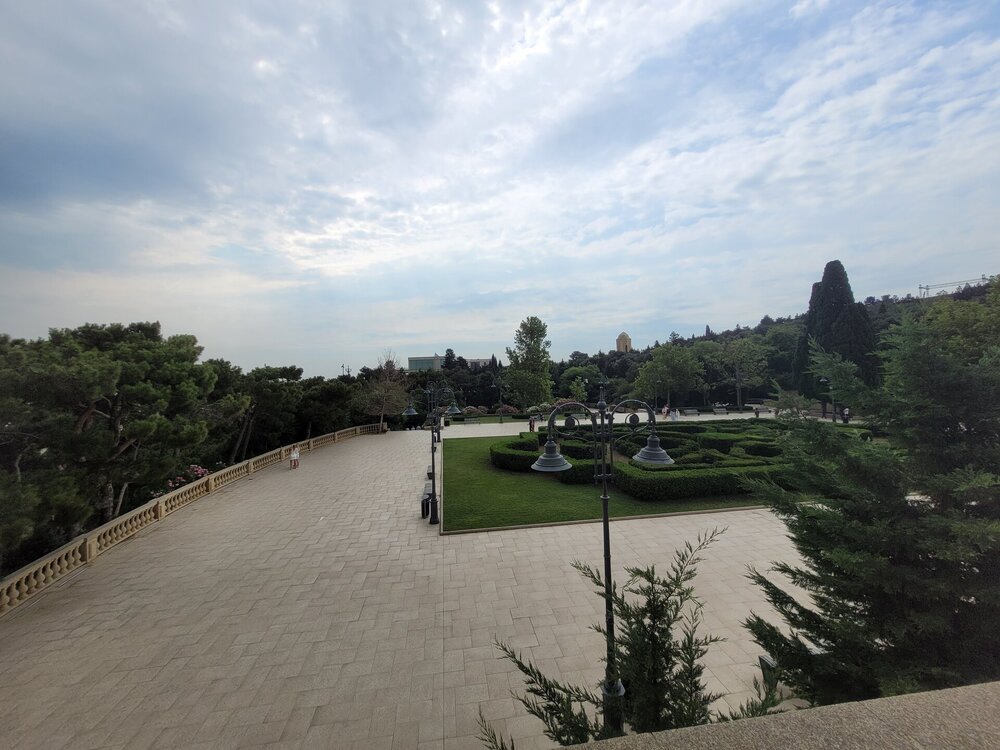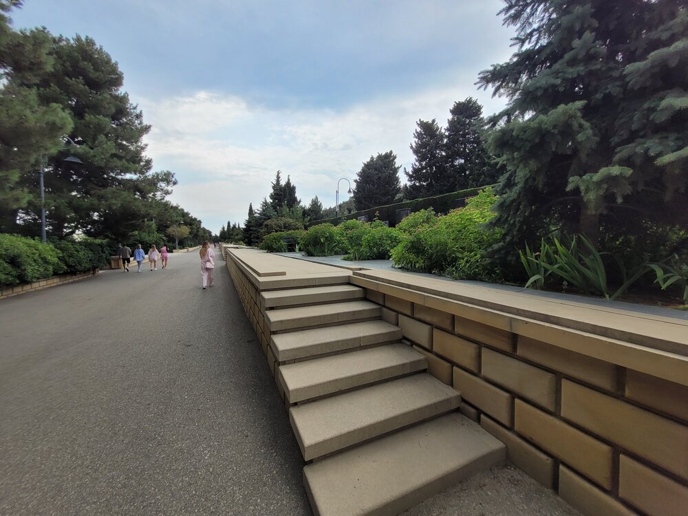 Для чего нужно подняться в Нагорный пак? Наверное, каждый скажет, что эта одна из интересных и главных достопримечательностей Баку, ну и во-вторых, именно с высоты Нагорного парка открывается потрясающая панорама на Бакинскую бухту, и, конечно, на сам город. И именно в Нагорном парке находятся немало достопримечательностей, которые тоже необходимо увидеть. После поездки, когда я делилась своими впечатлениями о Баку и о Азербайджане в целом, и если меня спрашивали, что понравилось, что не понравилось? Ну бывает же такое, вот не зацепило, вроде бы и ничего, но вот этого самого вау не случилось. О Баку такого не скажешь, после посещения этого города, могу сказать только то, что мне понравилось всё. А какое чувство гордости распирало у бакинцев за свой город, когда после их вопроса: "Как вам Баку?" - они слышали, что Баку очень, что город настолько красивый и душевный, что с первых минут ты чувствуешь себя здесь комфортно. И местным жителям очень нравились такие слова, им было важно знать наше впечатление о городе. И как я уже выше писала, они рады гостям, рады, что туристы из России к ним приезжают. Нас везде, где мы только решили перекусить, попить кофе, что-то купить, или будучи в музее, спрашивали, откуда мы. Ну интересно же было знать, с какой части России к ним приезжают. И когда узнавали, что мы из Сибири, местных жителей ещё больше распирала гордость за свою страну. Ничего себе, к нам даже так издалека приезжают. Не каждый ведь знает, что у нас есть прямое сообщение, 4 часа и ты уже в Баку. Возможно, кто-то думал, что мы несколько дней добирались до столицы Азербайджана. Ну, а меня радовало, что даже в Азербайджане знают такой город, как Новосибирск. Тем временем мы поднялись в Нагорный парк. И честно сказать, меня пугала вон та страшная туча. Очень хотелось верить в то, что туча понимала, что дождь нам вот совсем не нужен. Я как могла с ней поговорила, как могла её постаралась убедить, что нам солнышко нужно, в общем, надеялись на лучшее. Как я выше в своём видео говорила, фуникулёру есть альтернатива - это лестница, которая тоже ведёт в Нагорный парк. Сначала подъём будет идти параллельно фуникулёру, а вот потом лестница пойдёт какими-то зигзагами. Мы когда поднялись на фуникулёре я наивно думала, что здесь будет и лестница, но нет, насколько помню, лестница сразу приводит на смотровую площадку. Но кто-то всё же выбирает такой экстремальный подъём, а когда на улице жара, подъём становится ещё более экстремальней. Наверное, эта лестница создана для того, чтобы проверить на выносливость местных жителей, а заодно и туристов. Поднялся по лестнице, значит ты выносливый и можешь собой гордиться. Как я когда-то поднялась по лестнице здоровья в Алматы. Я так понимаю, та лестница создана для того, чтобы проверить здоров человек или нет. Поднялся, значит ты абсолютно здоров. Когда мы поднялись, все куда-то разбрелись. Возможно, кто-то на фуникулёре поднимается и для работы, но вроде бы это был выходной, в общем, не знаю кто куда разбрёлся, но людей поначалу не было совсем. И первое, что поражает наверху — это тишина. Звуки города — гудки машин, шум толпы — все остается где-то далеко внизу. Здесь, на высоте, слышно только пение птиц и легкий шелест листвы. Запахи здесь другие — свежие, почти горные. Это место, где можно перевести дух и взглянуть на Баку с высоты птичьего пол
