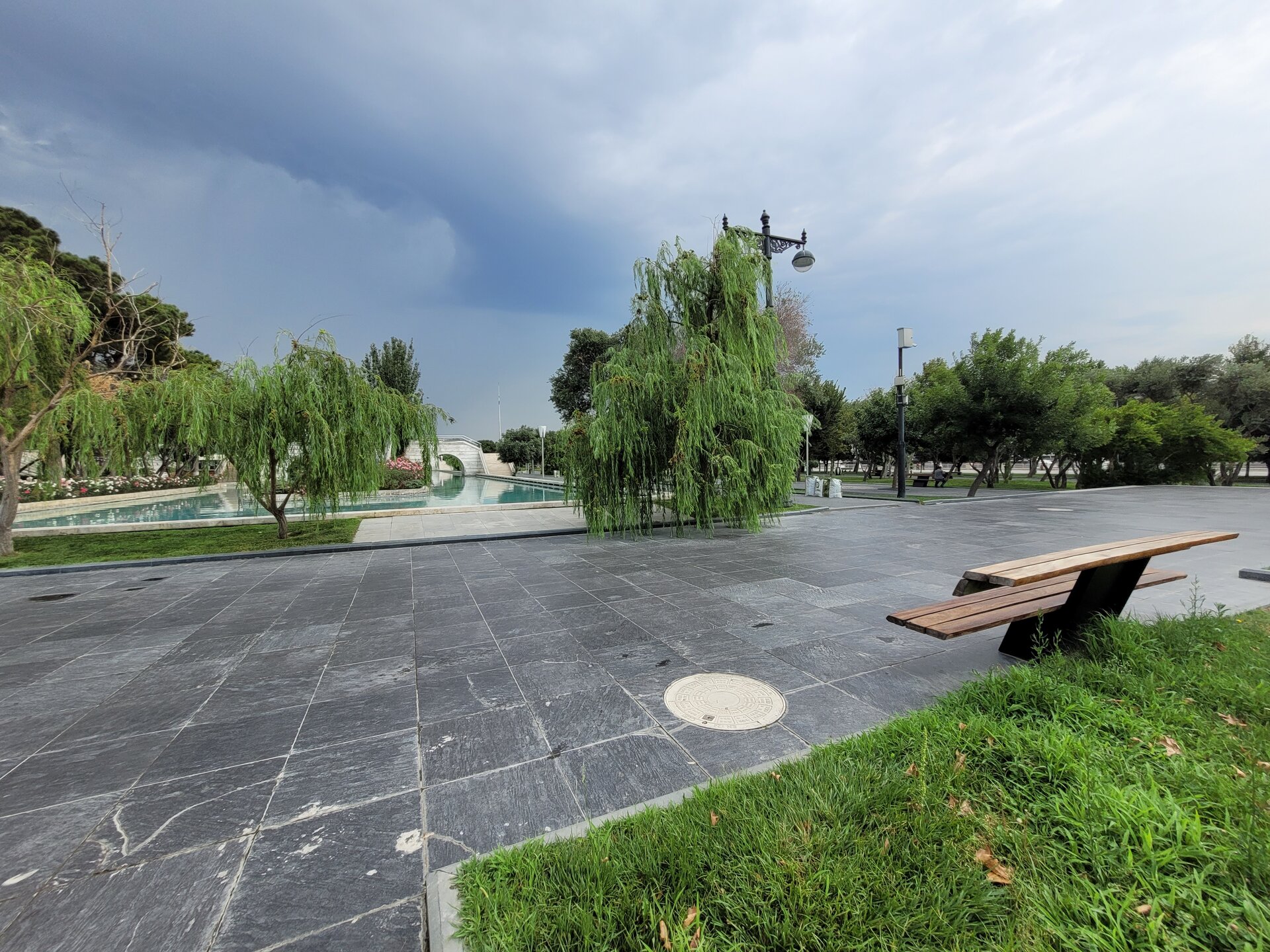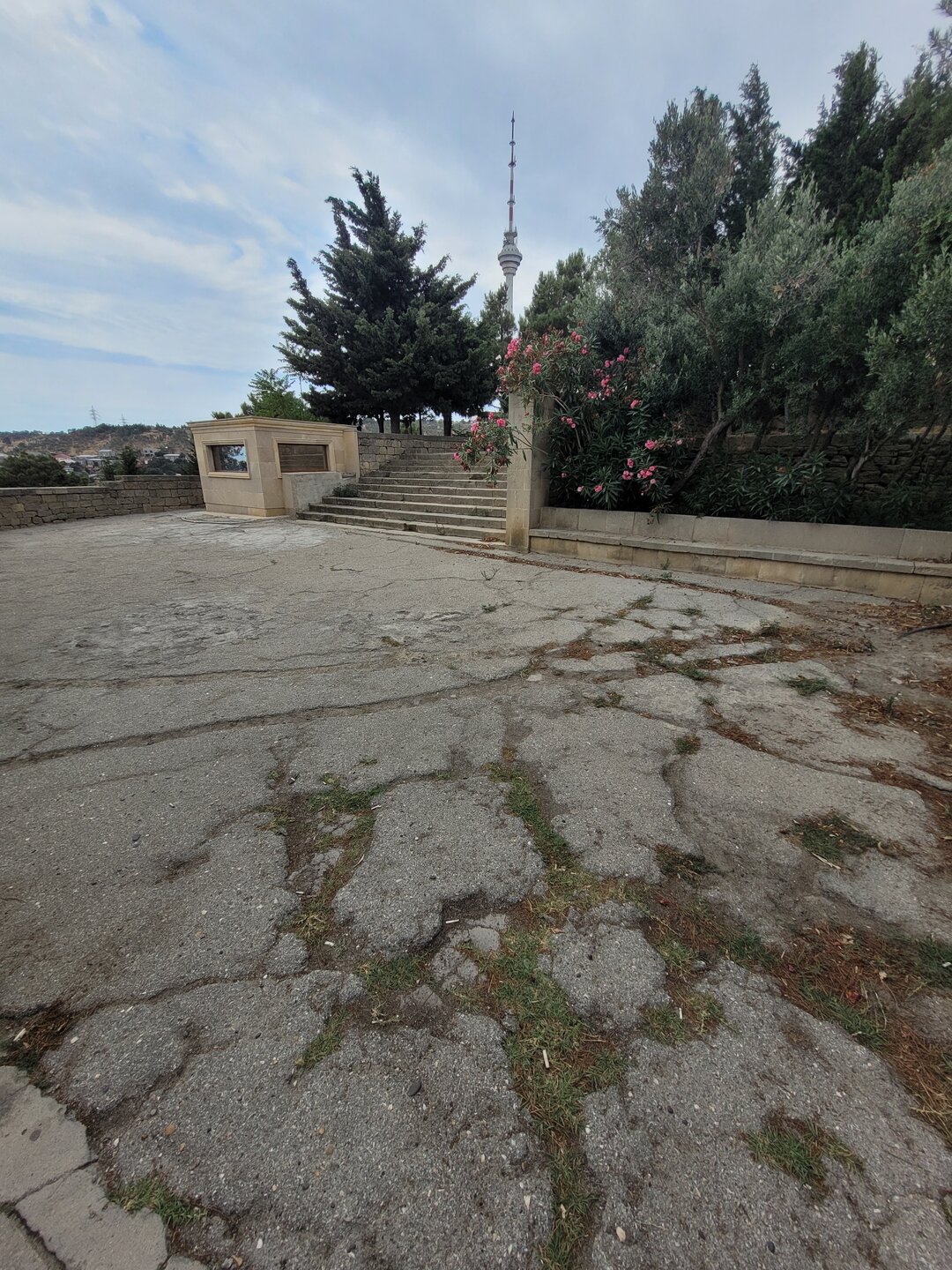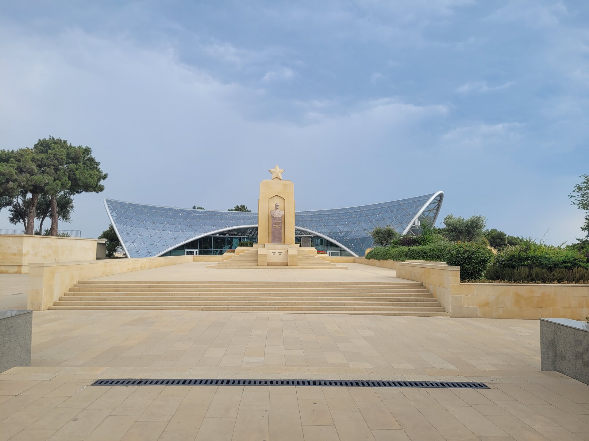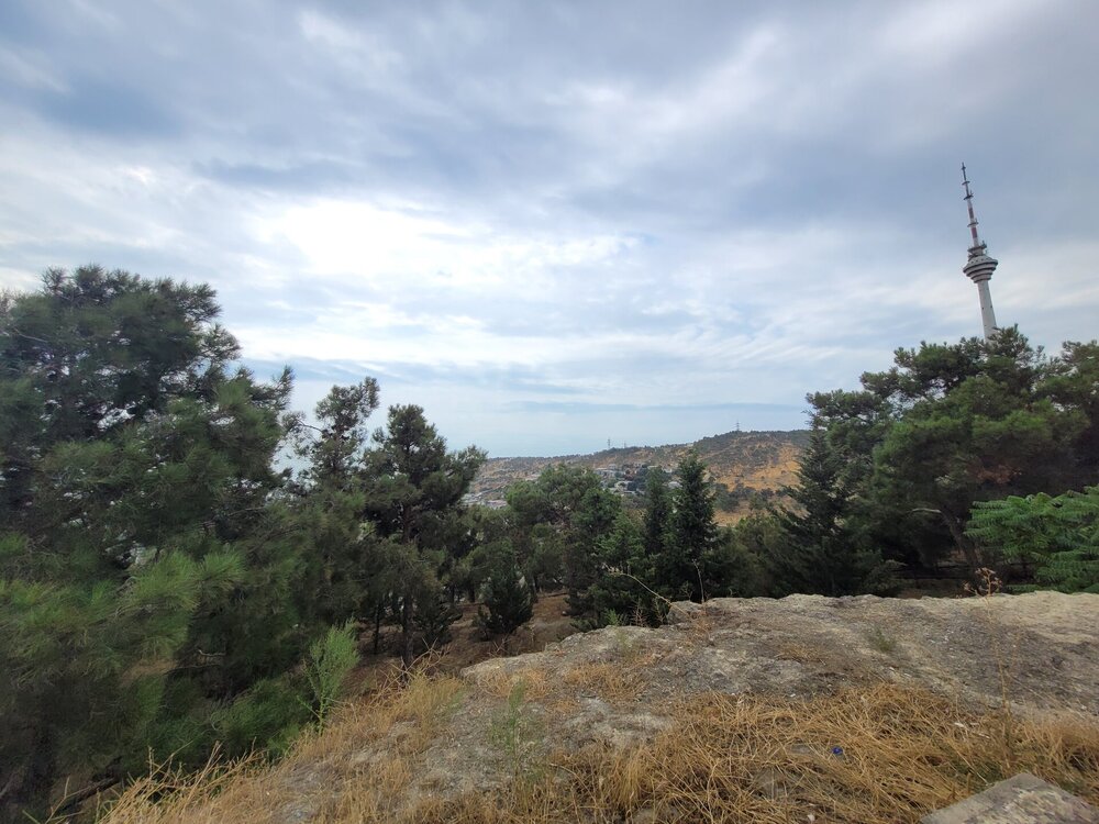 Для чего нужно подняться в Нагорный пак? Наверное, каждый скажет, что эта одна из интересных и главных достопримечательностей Баку, ну и во-вторых, именно с высоты Нагорного парка открывается потрясающая панорама на Бакинскую бухту, и, конечно, на сам город. И именно в Нагорном парке находятся немало достопримечательностей, которые тоже необходимо увидеть. После поездки, когда я делилась своими впечатлениями о Баку и о Азербайджане в целом, и если меня спрашивали, что понравилось, что не понравилось? Ну бывает же такое, вот не зацепило, вроде бы и ничего, но вот этого самого вау не случилось. О Баку такого не скажешь, после посещения этого города, могу сказать только то, что мне понравилось всё. А какое чувство гордости распирало у бакинцев за свой город, когда после их вопроса: "Как вам Баку?" - они слышали, что Баку очень, что город настолько красивый и душевный, что с первых минут ты чувствуешь себя здесь комфортно. И местным жителям очень нравились такие слова, им было важно знать наше впечатление о городе. И как я уже выше писала, они рады гостям, рады, что туристы из России к ним приезжают. Нас везде, где мы только решили перекусить, попить кофе, что-то купить, или будучи в музее, спрашивали, откуда мы. Ну интересно же было знать, с какой части России к ним приезжают. И когда узнавали, что мы из Сибири, местных жителей ещё больше распирала гордость за свою страну. Ничего себе, к нам даже так издалека приезжают. Не каждый ведь знает, что у нас есть прямое сообщение, 4 часа и ты уже в Баку. Возможно, кто-то думал, что мы несколько дней добирались до столицы Азербайджана. Ну, а меня радовало, что даже в Азербайджане знают такой город, как Новосибирск. Тем временем мы поднялись в Нагорный парк. И честно сказать, меня пугала вон та страшная туча. Очень хотелось верить в то, что туча понимала, что дождь нам вот совсем не нужен. Я как могла с ней поговорила, как могла её постаралась убедить, что нам солнышко нужно, в общем, надеялись на лучшее. Как я выше в своём видео говорила, фуникулёру есть альтернатива - это лестница, которая тоже ведёт в Нагорный парк. Сначала подъём будет идти параллельно фуникулёру, а вот потом лестница пойдёт какими-то зигзагами. Мы когда поднялись на фуникулёре я наивно думала, что здесь будет и лестница, но нет, насколько помню, лестница сразу приводит на смотровую площадку. Но кто-то всё же выбирает такой экстремальный подъём, а когда на улице жара, подъём становится ещё более экстремальней. Наверное, эта лестница создана для того, чтобы проверить на выносливость местных жителей, а заодно и туристов. Поднялся по лестнице, значит ты выносливый и можешь собой гордиться. Как я когда-то поднялась по лестнице здоровья в Алматы. Я так понимаю, та лестница создана для того, чтобы проверить здоров человек или нет. Поднялся, значит ты абсолютно здоров. Когда мы поднялись, все куда-то разбрелись. Возможно, кто-то на фуникулёре поднимается и для работы, но вроде бы это был выходной, в общем, не знаю кто куда разбрёлся, но людей поначалу не было совсем. И первое, что поражает наверху — это тишина. Звуки города — гудки машин, шум толпы — все остается где-то далеко внизу. Здесь, на высоте, слышно только пение птиц и легкий шелест листвы. Запахи здесь другие — свежие, почти горные. Это место, где можно перевести дух и взглянуть на Баку с высоты птичьего пол