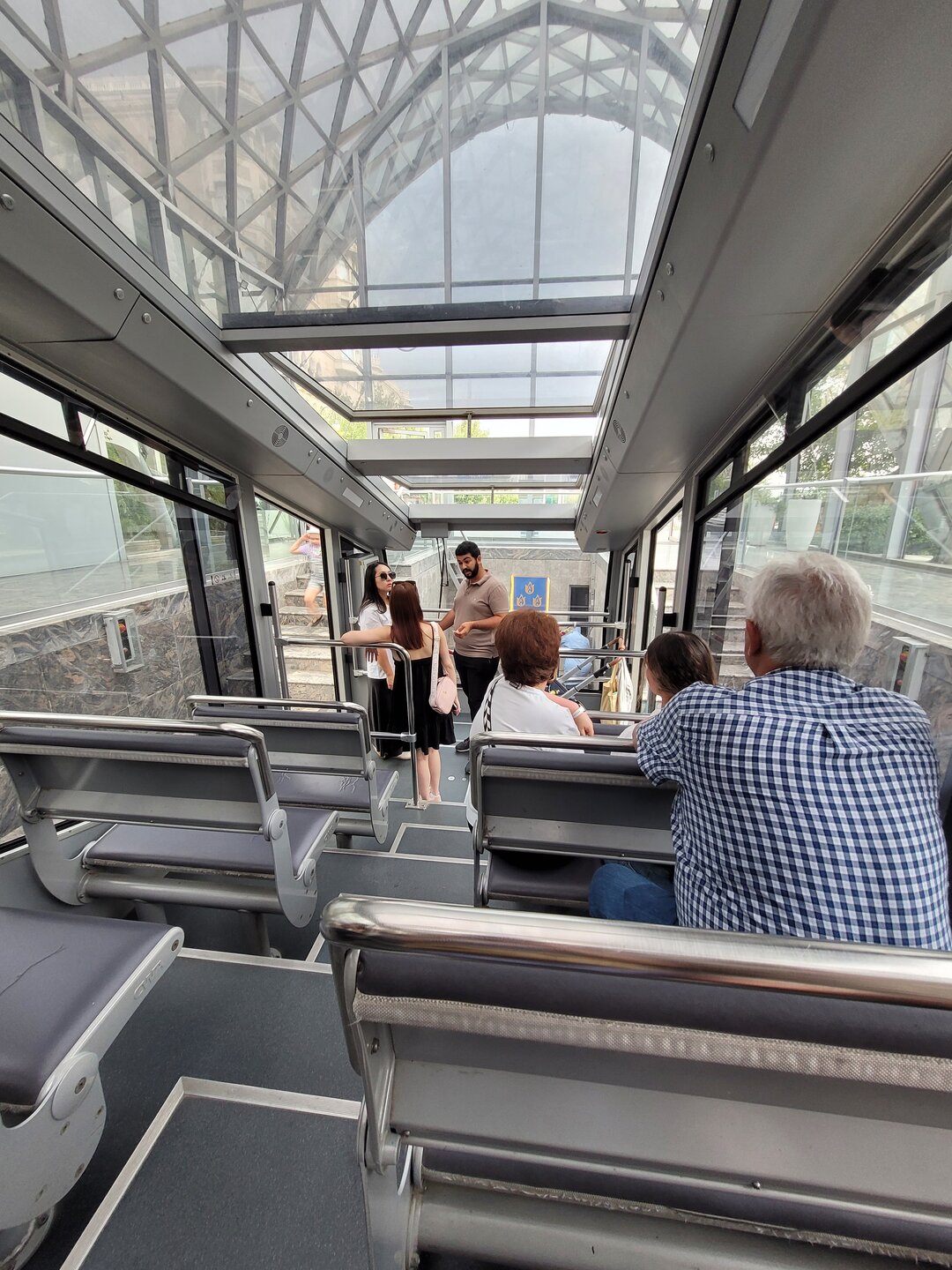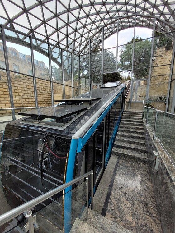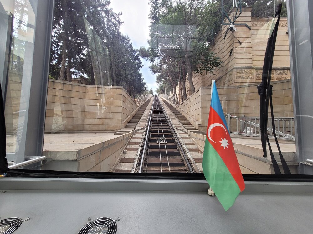 И о радость, нам повезло, станция фуникулёра работала с 10.00. Мне кажется мы минуты три постояли и нас начали пропускать. И нам ещё раз повезло, людей практически не было. Это я опять к тому, кто рано встаёт, тому везёт. Ну хоть что-то. Как говорят, в каждом минусе можно найти плюс. И так, фуникулер в Баку построили в далеком 1960 году и впоследствии неоднократно модернизировали. Последняя на сегодняшний день крупная реконструкция проводилась в 2012 году к началу «Евровидения», а в будущем местные власти планируют значительно продлить маршрут фуникулера. На данный момент длинна железнодорожных путей составляет 455 метров, а на маршруте есть всего две станции: нижняя «Бахрам Гюр» и верхняя «Шехидлер Хиябаны». Неспешная поездка займёт несколько минут, в течение которых можно любоваться живописными склонами, поросшими хвойными лесами и кустарниками, а также из окна трамвайчика открываются панорамы на город и Бакинскую бухту Каспийского моря. Наиболее эффектно город выглядит в огнях вечерней подсветки. В эти часы к фуникулёру выстраиваются очереди туристов. Я подозреваю, если бы мы решили подняться в Нагорный парк вечером и была бы безразмерная очередь на фуникулёр, я бы пешком пошла. На линии курсируют два вагончика вместимостью по 28 пассажиров. Железнодорожный путь один, но где-то в середине дороги расходится на два. С нижней станции трамвайчик поднимается, а в это же время с верхней станции трамвайчик спускается. Чтобы подняться, мы заплатили 2 маната. Не могу сказать, это туда и обратно, или только в одну сторону, но когда готовилась к поездке кое-какую информацию записывала, и у меня в блокнотике записано, что фуникулёр стоит 1 манат, значит скорей всего это в обе стороны. Скорей всего так оно есть, ехать то всего 2.5 минуты. Не успел поехать, как уже приехал. Ну, а трамвайчик вот такой. Так как фуникулёр только открылся, людей было совсем мало, и мы ждали пока народ наберётся. Было интересно стоять и смотреть в лобовое стекло, но такие умные были не только мы. Когда народ набрался, то сотрудник попросил всех сесть, мы повернулись, и понимаем, что сесть уже некуда. И сотрудник махнул утвердительно рукой, что мы можем и здесь остаться. Но думаю, что и в другую сторону было смотреть не менее интересно. Ну, что поехали?