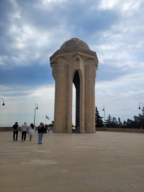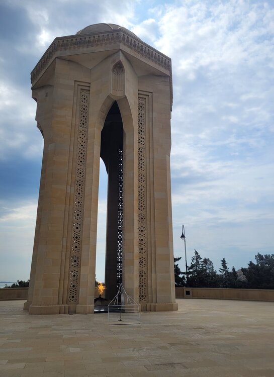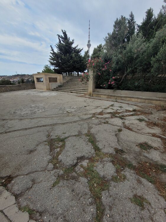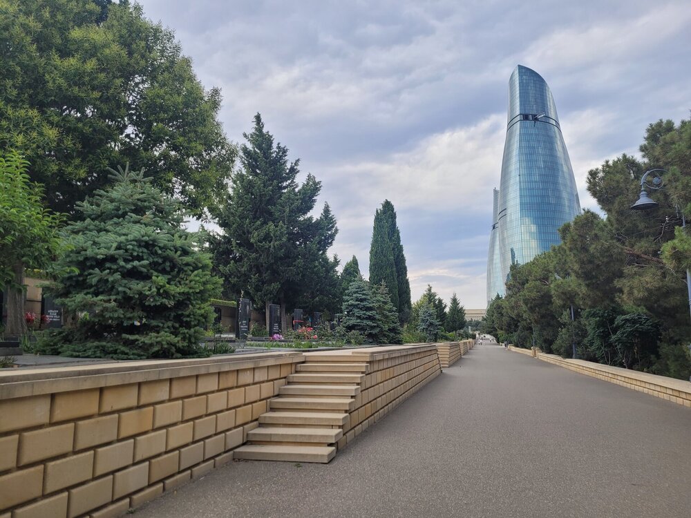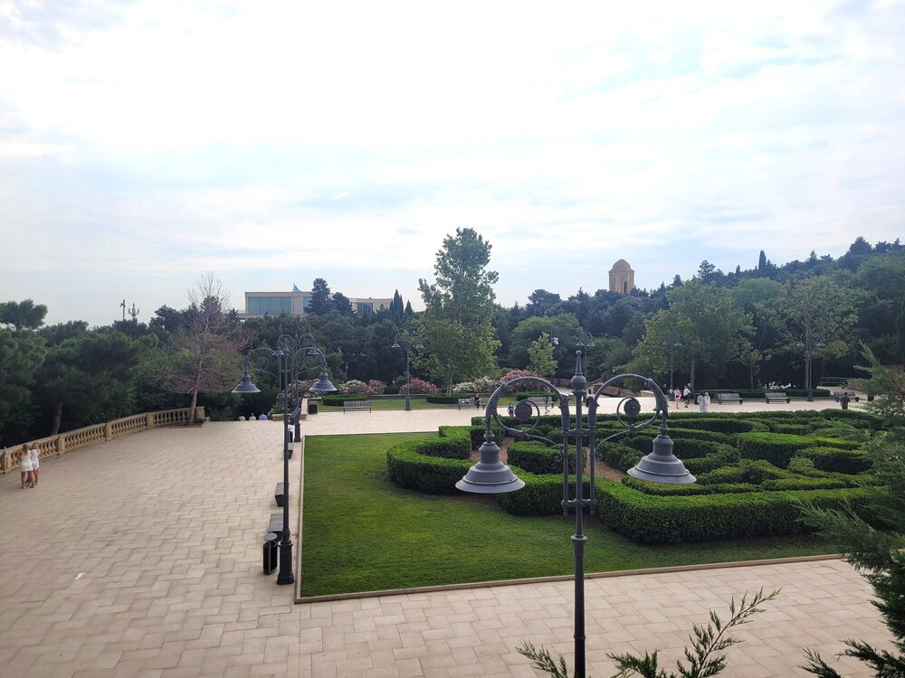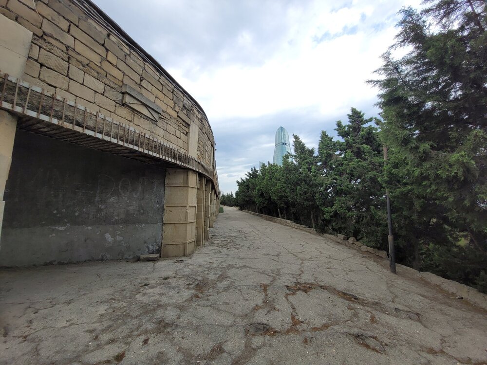 Нагорный парк был построен ещё в 1930-е годы выдающимся архитектором Львом Ильиным, и с тех пор его внешний облик практически не изменился. Речь, конечно, идет о сохранении исторического вида, ведь парк всегда выглядит аккуратным и ухоженным. Одними из самых популярных достопримечательностей парка являются турецкая мечеть «Шехидляр». Чуть позже я к ней вернусь. А первое, что мы увидели, это памятник Ази Асланову. И этот не просто памятник, именно здесь, в Нагорном парке, на Алле шахидов и похоронен Ази Асланов, единственный азербайджанец - дважды Герой Советского Союза. Каждый год, 9 мая, у памятника Азии Асланову проходит торжественная встреча президента Азербайджана Ильхама Алиева с ветеранами войны. В этот торжественный день здесь собираются ветераны Великой Отечественной войны с семьями, вспоминают товарищей по оружию, отдают дань памяти отважному азербайджанскому военачальнику Ази Асланову, вписавшему свое имя золотыми буквами в летопись войны с фашизмом и ставшему символом доблести и мужества для потомков. В честь Ази Асланова названа одна из станций бакинского метро, а также улица в Баку, в Ленкорани (откуда он родом), Габале, в Волгограде и др. городах. В память о нём на Мамаевом кургане установлена мемориальная гранитная плита. Когда я готовилась к поездке, знакомилась и читала о тех достопримечательностях, которые нужно обязательно посетить, также знакомилась с картой Баку, на которой я видела, что есть какая-то Аллея шахидов, но честно сказать, я не понимала, что это за аллея, пока о ней не прочитала. И несмотря на то, что это место мрачное и печальное, посетить его стоит. Аллея шахидов - это кладбище, где похоронены в основном жертвы "Чёрного января" и азербайджанцы погибшие в Первой карабахской войне. На Аллее существует также безымянная могила, в которой похоронены неопознанные тела убитых. Замыкает чёрную аллею Вечный огонь, торжественное открытие которого состоялось 9 октября 1998. И посвящён он январским кровавым событиям 1990 г. И именно отсюда отрываются потрясающие виды на Баку. Видна площадь государственного флага, виден Кристалл-холл, скоро мы там тоже будем. Также видно здание в виде полумесяца, насколько я поняла это большой красивый проект ещё в процессе реализации. Отель «Кресент» («Crescent Hotel») представляет собой здание в форме арки и выглядит, как месяц, упирающийся своими "рогами" в водную гладь Каспийского моря. Смотрится красиво, необычно. И именно там, рядом с этим отелем, торговым центром" Крескент - молл" и можно посмотреть свето-представление поющего фонтана. А мы тем временем идём дальше, куда, как мы поняли, уже никто не ходил. Доче тоже было не интересно, поэтому туда выше я поднялась одна. Ну мало ли, вдруг что-то важное пропустим не поднявшись наверх. Поэтому иду. Ну в принципе да, можно было не подниматься. Ничего интересного там уже не было. И никого. Ну да, чего я хотела. Если уж там внизу почти никого не было, а тут я думала будет много людей?