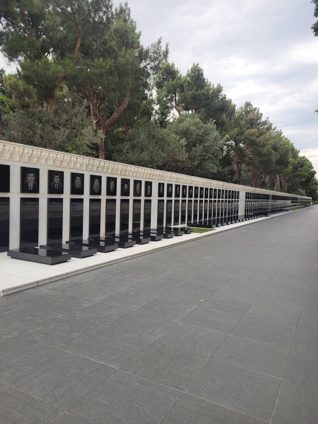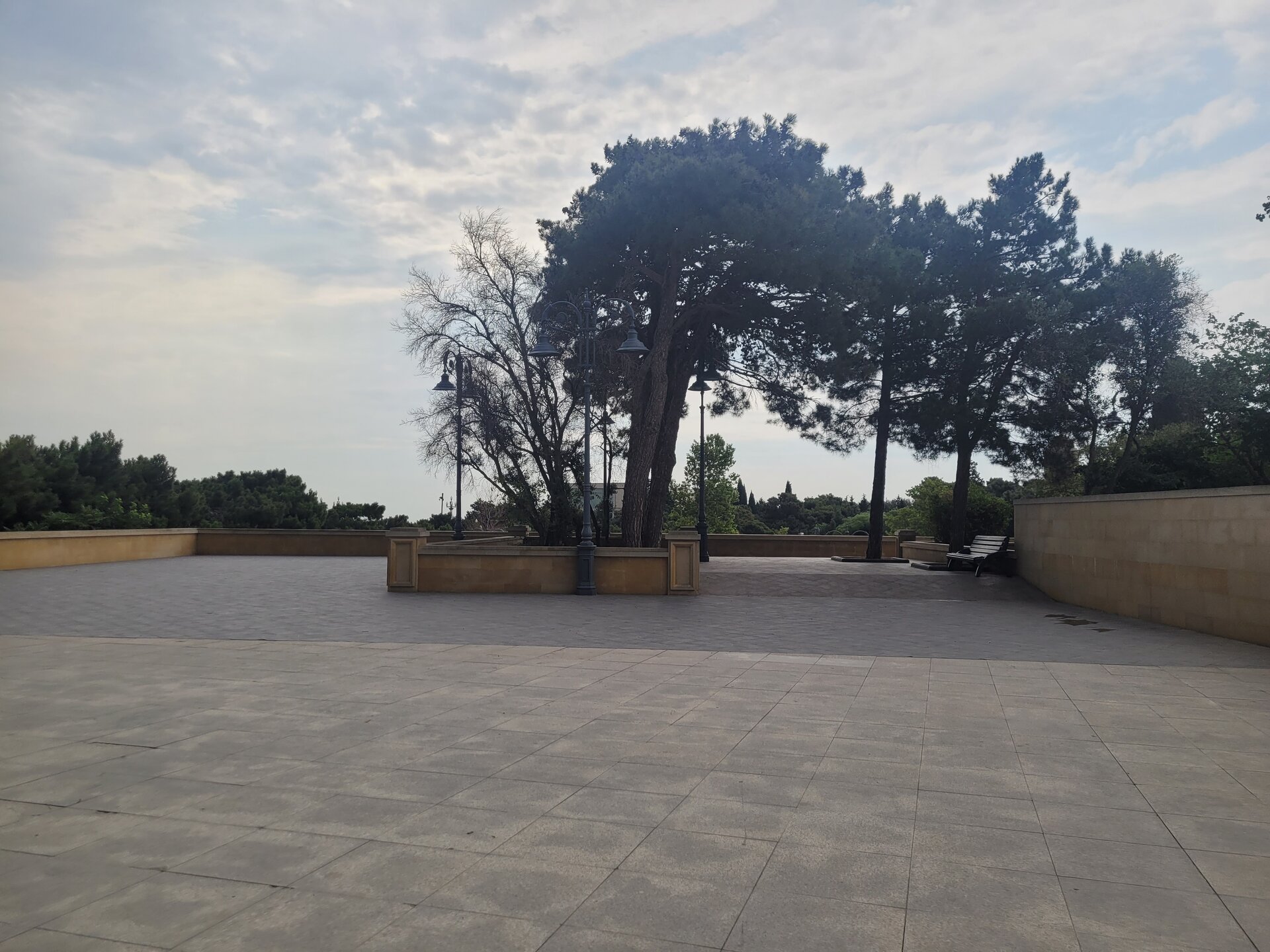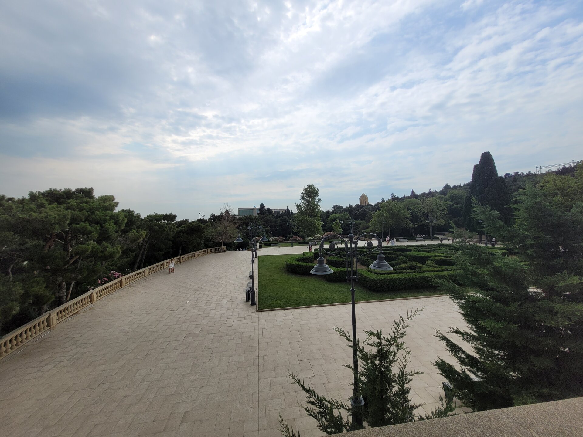 Нагорный парк был построен ещё в 1930-е годы выдающимся архитектором Львом Ильиным, и с тех пор его внешний облик практически не изменился. Речь, конечно, идет о сохранении исторического вида, ведь парк всегда выглядит аккуратным и ухоженным. Одними из самых популярных достопримечательностей парка являются турецкая мечеть «Шехидляр». Чуть позже я к ней вернусь. А первое, что мы увидели, это памятник Ази Асланову. И этот не просто памятник, именно здесь, в Нагорном парке, на Алле шахидов и похоронен Ази Асланов, единственный азербайджанец - дважды Герой Советского Союза. Каждый год, 9 мая, у памятника Азии Асланову проходит торжественная встреча президента Азербайджана Ильхама Алиева с ветеранами войны. В этот торжественный день здесь собираются ветераны Великой Отечественной войны с семьями, вспоминают товарищей по оружию, отдают дань памяти отважному азербайджанскому военачальнику Ази Асланову, вписавшему свое имя золотыми буквами в летопись войны с фашизмом и ставшему символом доблести и мужества для потомков. В честь Ази Асланова названа одна из станций бакинского метро, а также улица в Баку, в Ленкорани (откуда он родом), Габале, в Волгограде и др. городах. В память о нём на Мамаевом кургане установлена мемориальная гранитная плита. Когда я готовилась к поездке, знакомилась и читала о тех достопримечательностях, которые нужно обязательно посетить, также знакомилась с картой Баку, на которой я видела, что есть какая-то Аллея шахидов, но честно сказать, я не понимала, что это за аллея, пока о ней не прочитала. И несмотря на то, что это место мрачное и печальное, посетить его стоит. Аллея шахидов - это кладбище, где похоронены в основном жертвы "Чёрного января" и азербайджанцы погибшие в Первой карабахской войне. На Аллее существует также безымянная могила, в которой похоронены неопознанные тела убитых. Замыкает чёрную аллею Вечный огонь, торжественное открытие которого состоялось 9 октября 1998. И посвящён он январским кровавым событиям 1990 г. И именно отсюда отрываются потрясающие виды на Баку. Видна площадь государственного флага, виден Кристалл-холл, скоро мы там тоже будем. Также видно здание в виде полумесяца, насколько я поняла это большой красивый проект ещё в процессе реализации. Отель «Кресент» («Crescent Hotel») представляет собой здание в форме арки и выглядит, как месяц, упирающийся своими "рогами" в водную гладь Каспийского моря. Смотрится красиво, необычно. И именно там, рядом с этим отелем, торговым центром" Крескент - молл" и можно посмотреть свето-представление поющего фонтана. А мы тем временем идём дальше, куда, как мы поняли, уже никто не ходил. Доче тоже было не интересно, поэтому туда выше я поднялась одна. Ну мало ли, вдруг что-то важное пропустим не поднявшись наверх. Поэтому иду. Ну в принципе да, можно было не подниматься. Ничего интересного там уже не было. И никого. Ну да, чего я хотела. Если уж там внизу почти никого не было, а тут я думала будет много людей?