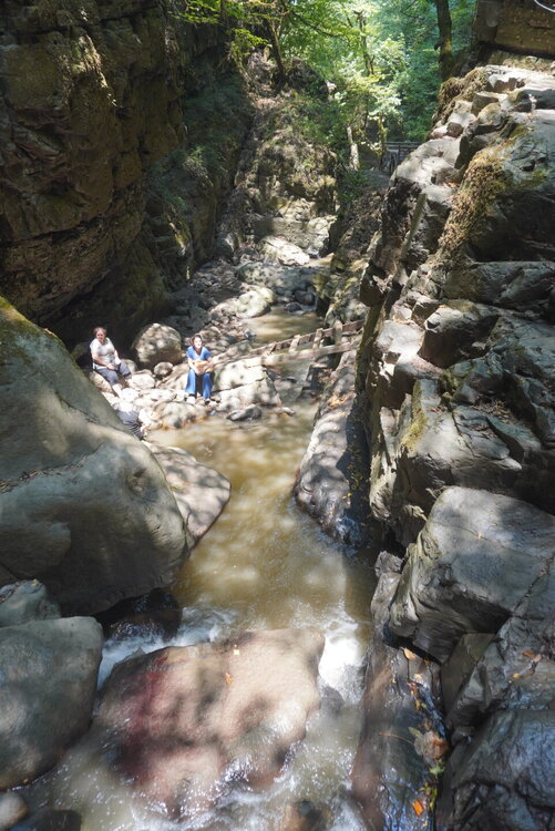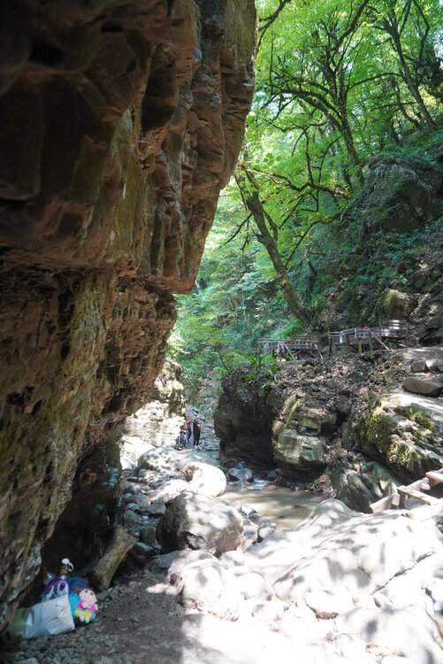 От парковки до первой нашей локации идти минут 5, не больше. Сначала надо было спуститься с горки. Видно, что в разных местах стоят столы. Не обратила внимание, где там что готовят. Но как поняла, здесь так принято, в туристических местах есть какая-то "едальня" и вот такие столы для посетителей стоят везде. На других туристических локациях мы тоже видели вот такую организацию кафе, назову это так. Санитария, конечно, вызывает сомнение, но каждый свой выбор делает сам. Далее надо было пройти вдоль скал. Всегда стараюсь фотографировать без каких-то лишних рук, но здесь никак не получилось. Несмотря на то, что данная достопримечательность, на мой взгляд, расположена совсем неудобно, но пользуется она большой популярностью, иначе здесь не было столько людей. Тут я немного не разобралась куда идти, люди были там, люди были здесь и я чуть не поползла вот по этой лестнице, протянутой от одной скалы до другой. Справа на фото видно эту деревянную лестницу. На этой фотографии эту лестницу видно лучше, и я ведь чуть не полезла по ней. Но наш водитель меня остановил. Вот для чего её тут положили? Ну раз что-то лежит, значит по этому что-то надо залезть.