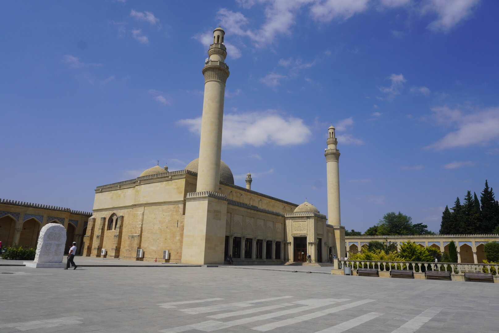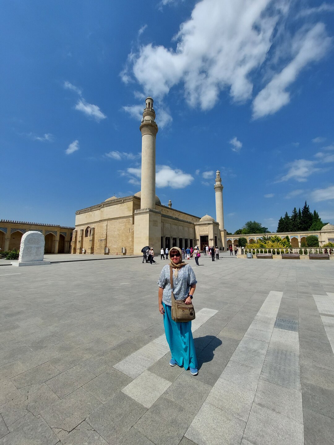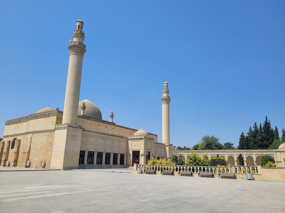 И вот мы почти приехали. Дорога сюда – это уже приключение. Горы, перемежающиеся сухими холмами, растительность, которая неожиданно сменяет пустынные участки, и даже виноградники по пути. Словно Азербайджан решил показать все свои ландшафтные контрасты сразу. И так, первая наша остановка - это был город Шемаха, первые упоминания которые относятся аж к 5- 6 веку до н.э. Город хоть и древний, но маленький. И, конечно, само название города Шемаха, мне напомнил одну сказку, да, да ту самую. Но приехали мы в этот город для того, чтобы посетить Джума мечеть, которая примечательна по нескольким причинам. Как известно, Джума (пятница) — священный день для мусульман, они ставят этот день превыше других. Вся мусульманская община собирается на коллективный Джума-намаз (в полдень пятницы), возносит хвалу Аллаху и просит милость его и защиту. В этот день принято оставлять все свои повседневные дела, посвятить день посещению родственников и налаживанию семейных связей. Именно поэтому Джума мечети всегда самые большие в округе, ибо должны вместить всех верующих. Джума-мечеть в Шемахе невероятно старинная, считается, что это самая ранняя мечеть на Кавказе после Дербентской. Последняя появилась в 734 году, а шемаханская в 743. Судьба у мечети незавидная. Она неоднократно ремонтировалась, особенно после землетрясения 1859 и 1887 гг. Сильно пострадала после разрушительного землетрясения 1902 г., тогда был разрушен почти весь город, также это здание пострадало в результата пожара 1918 г. В советские годы мечеть не использовалась по назначению и была отремонтирована лишь в 1980 году. А капитальная реконструкция мечети состоялась в 2010-2013 гг. Мечети был возвращён её первоначальный облик с сохранением старого строения (боковых и задних стен, колонн фасада и пр.). В общем, мечеть вроде и старинная, но то, что сейчас мы видим, это уже не та мечеть построенная в 743 году. Но примерно такой Джума мечеть была изначально и была восстановлена по сохранившимся рисункам, чертежам, а также по результатам археологических изысканий. Но несмотря на свой возраст, ощущение аутентичности и старины всё-таки сохранилось. Не могло не радовать, что при мечети есть гардеробная. Хотя по сути каких то прям строгих требований к посещению мечети нет. Я к тому, что можно зайти в брюках, но вот голова да, должна быть покрытой. А вот если шорты, то ноги надо прикрыть обязательно. Я решила всё прикрыть, поверх брюк юбочку надела, голову прикрыла. В общем, подготовилась. Наш водитель с нами не пошёл, он нам всё рассказал и остался в машине. И время нам дал на наше усмотрение. Ну что, идём смотреть одну из самых старинных мечетей в мире.