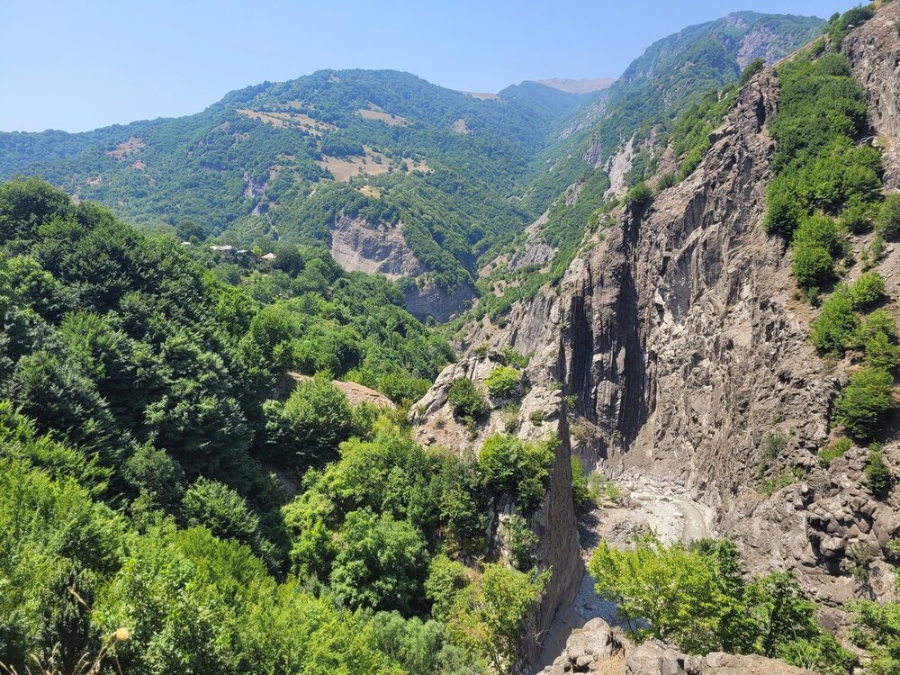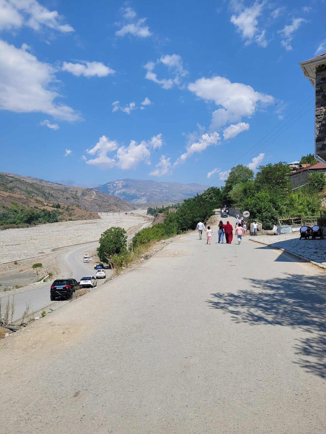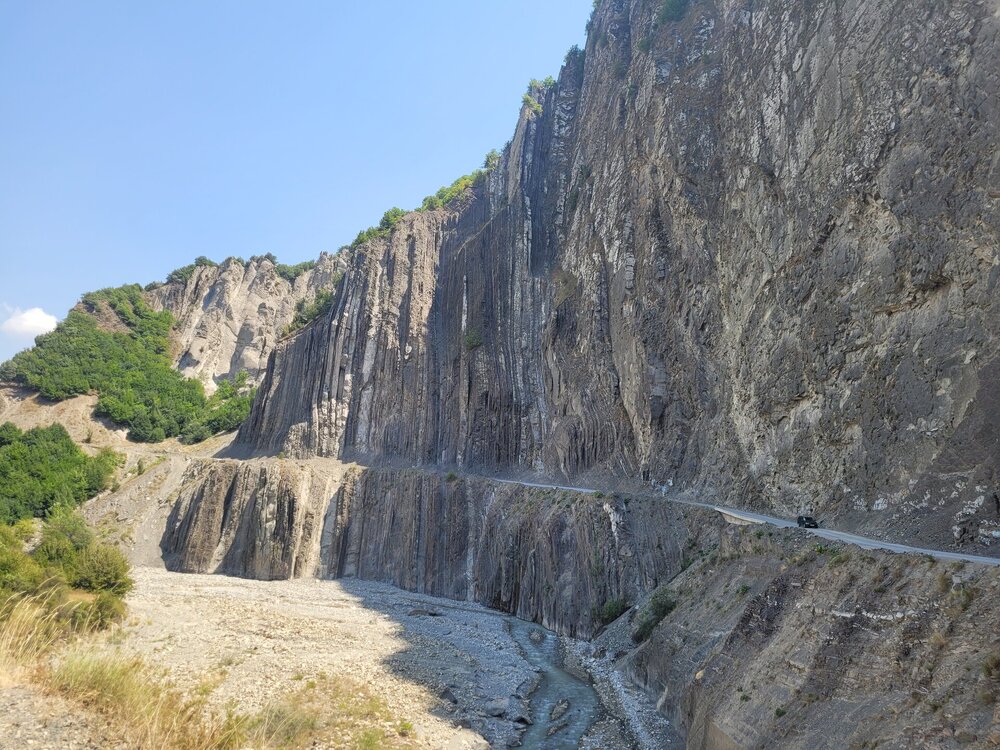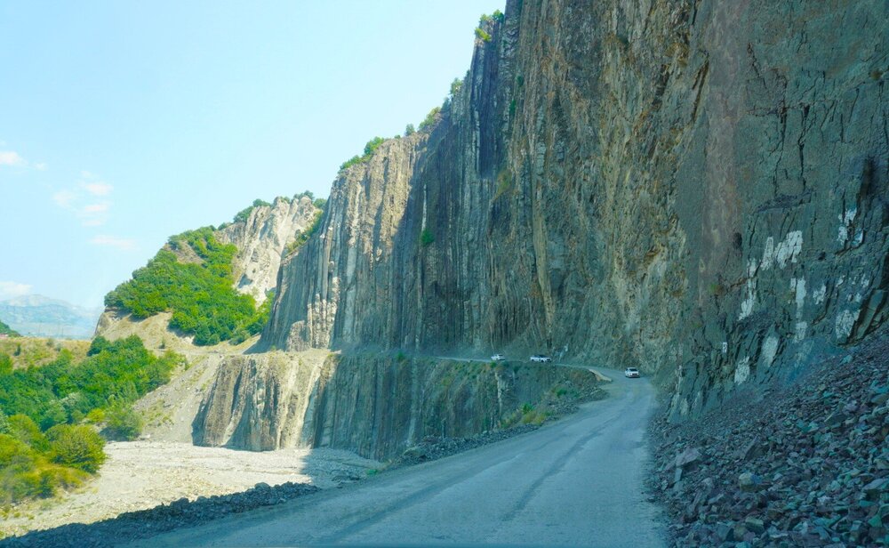 Мы едем дальше, нам предстояло проехать около часа, может чуть дольше. Но мы не просто ехали, наш водитель нам рассказывал о тех местах, что мы проезжали, про уклад местного населения, отвечал на наши вопросы. Рассказал и про свою работу, а работает он как с индивидуальными туристами, так и с группами. И особое впечатление у нашего водителя остались от работы с индусами. Как он нам сказал, что больше никогда, ни за какие деньги он не возьмёт группу индусов. А тем временем мы поднимались всё выше и выше, куда мы ехали, посёлок, расположен примерно на высоте 1300 метров над уровнем моря. 20250730_131707.mp4 И уже недалеко от посёлка сделали непродолжительную остановку на фотопаузу, здесь грех было не остановится. 20250730_132559.mp4 20250730_133310.mp4 Честно сказать, когда я увидела эту дорогу стороны, и я понимала, что именно по ней мы и поедем, в общем, дорога у меня не вызывала никакого доверия. Огромная скала над дорогой, сама дорога издалека больше походила на тропинку. Вот как пой ней ехать? На деле всё оказалось гораздо проще, По ней спокойно разъезжаются две машины. Но вот если будет дождь или другие нехорошие погодные явления, то дорога эта будет закрыта. А единственная дорога соединяющая Баку и посёлок Лагич. Именно туда мы и направлялись.