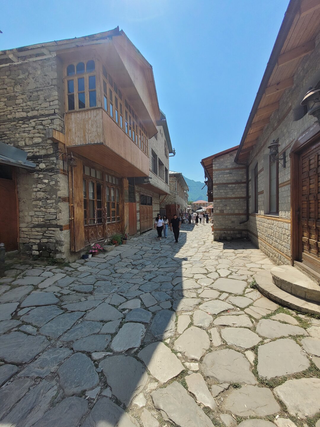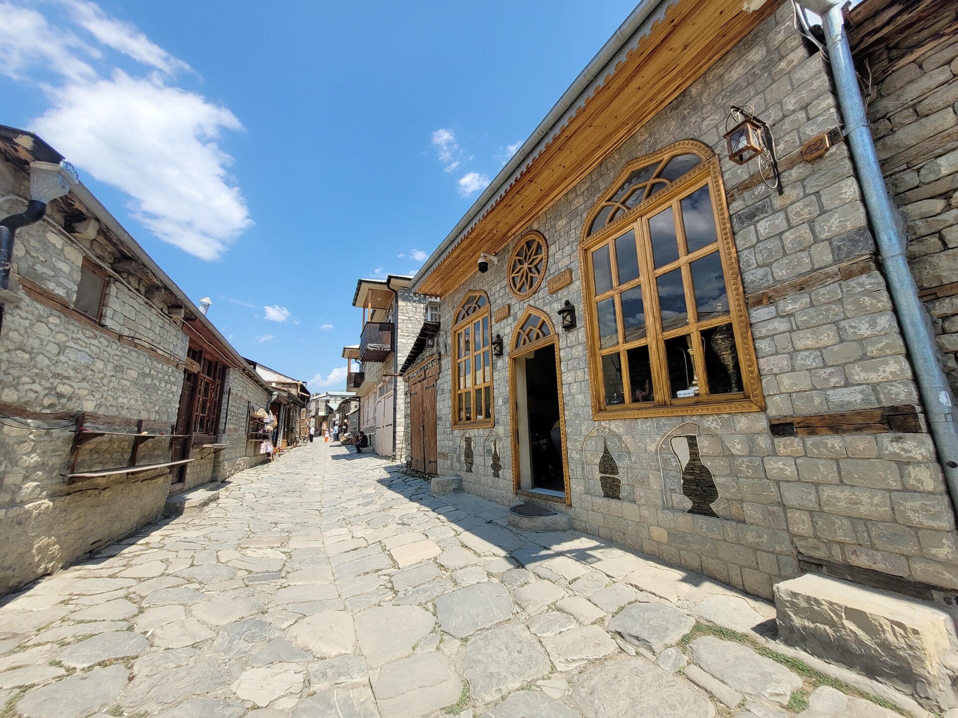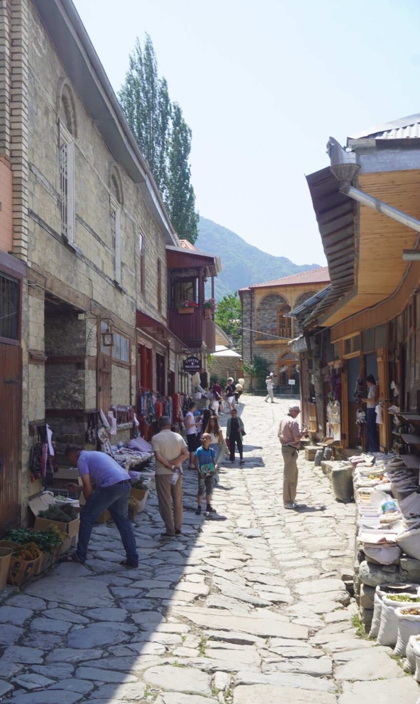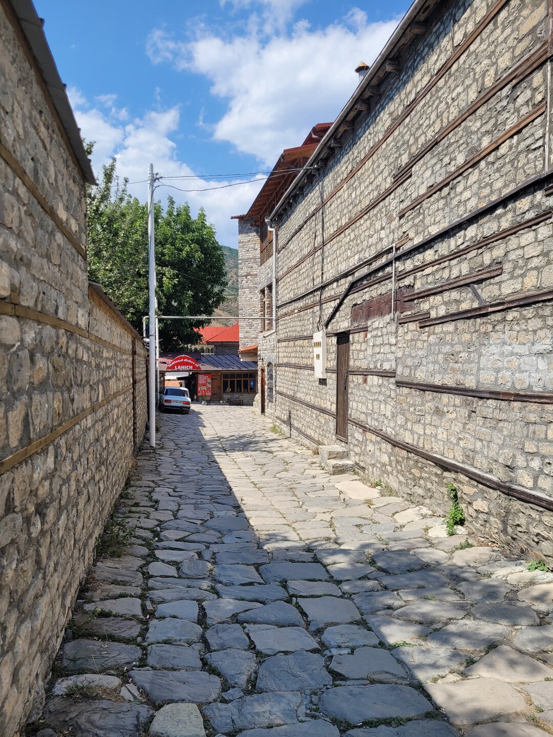 Лагич – это поразительное место в Азербайджане, являющееся культурным заповедником. Это село практически не тронутое современностью, а зависшее в прошлых эпохах. Чаще всего, ради знакомства с ним, в этот район страны приезжают туристы, интересующиеся историей и предпочитающие национальный колорит современной инфраструктуре. Мощёные улочки и площади, где в самобытных каменных домах живут мастера-ремесленники, занимающиеся коврами и медным промыслом. И здесь, среди гор, такие современные слова, как «смартфон», «каршеринг» и «кешбек» звучат не очень-то уместно. А уж как классно пройтись по узким переулкам, заглядываясь на детали незнакомой тебе жизни… ,,,,,,,,,,,,,,, И что меня больше всего поразило, так это архитектура. Можно пройтись только по главной улице, и уже будет понятно какой он Лагич. Именно здесь, на этой улице, практически каждое строение является историческим и уникальным. Все дома на этой улице самобытные, выложенные из камня и древесины, многие из них выделяются большими деревянными балконами. А ещё, здесь нет практически машин. Насколько помню, въезжать на транспорте сюда нельзя, в любом случае двум машинам тут не разъехаться. Но ведь прелесть в другом, не проехать на машине, а пройтись, прогуляться пешком. И было бы здорово, прогуляться ранними утром, мне кажется впечатления были бы совсем другими. Но в какой-то степени нам тоже повезло, когда мы приехали, людей было прям много, но чем дальше мы отходили, всё более пустынными становились улочки, а потом уже люди поразъехались, и даже в начале главной улицы их было не так много.