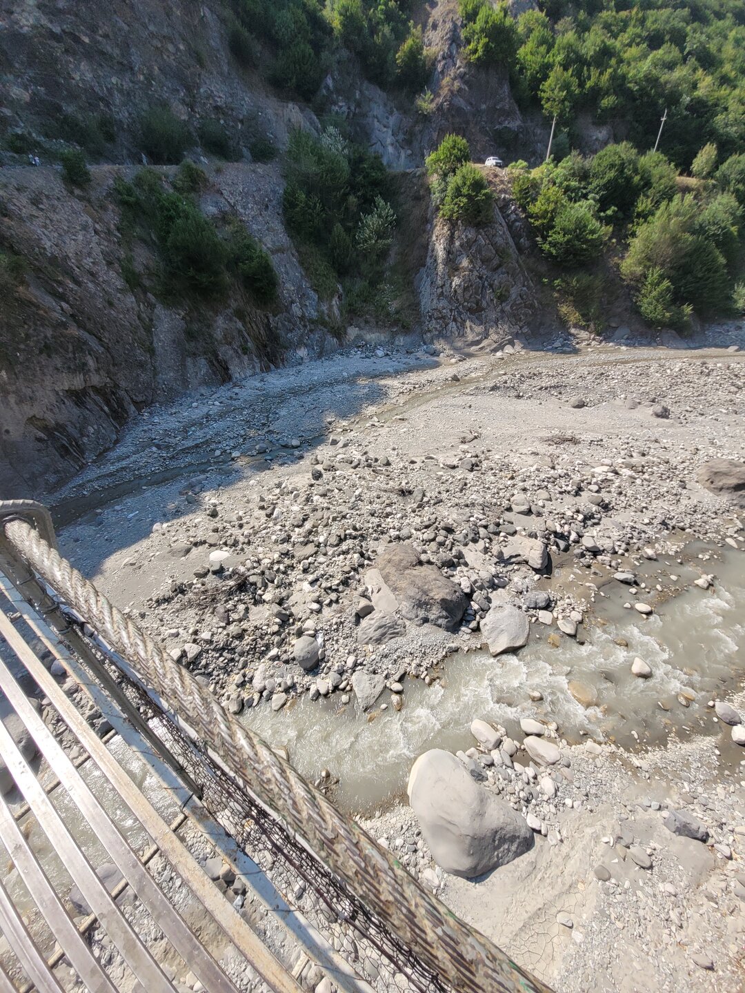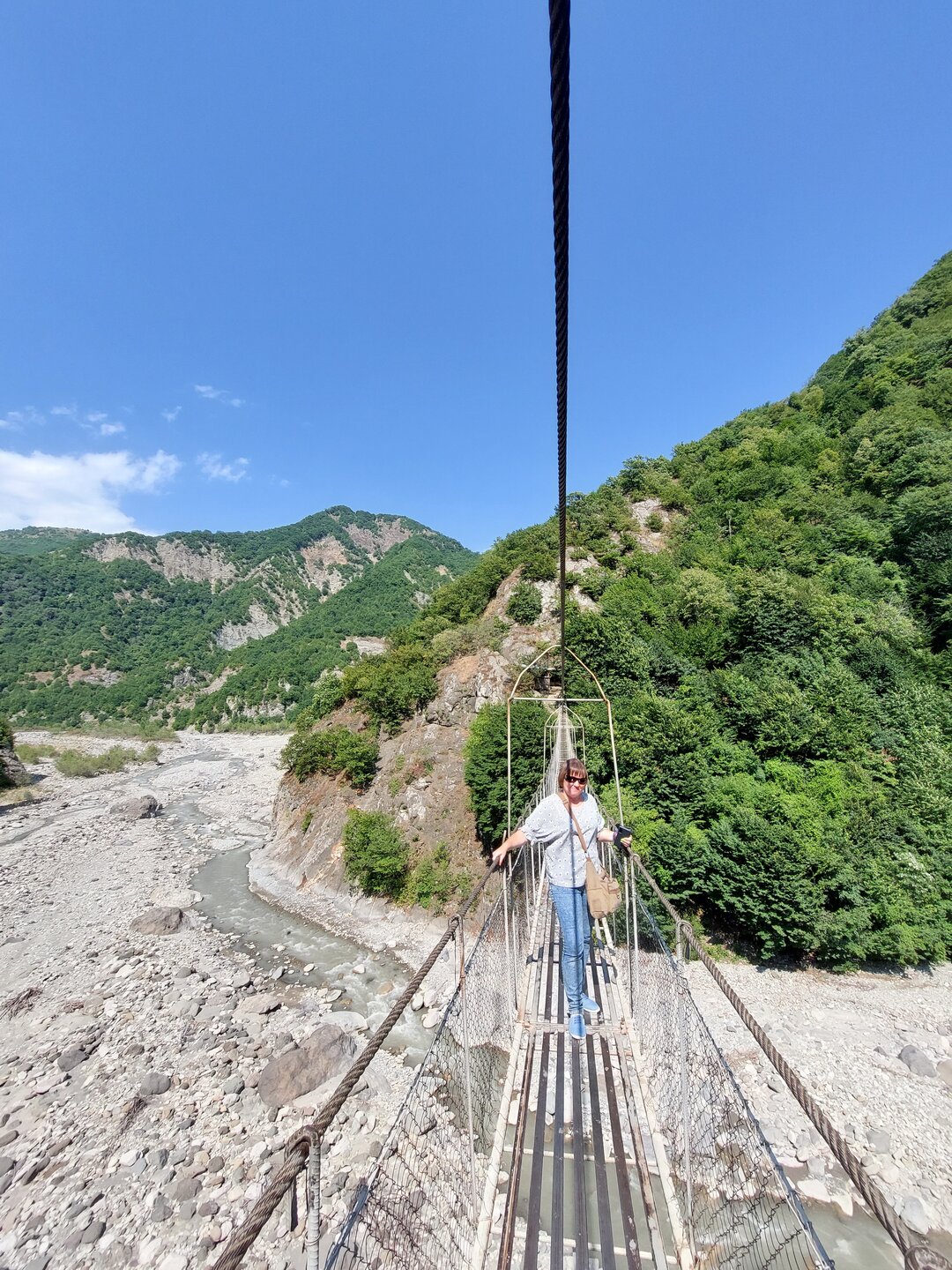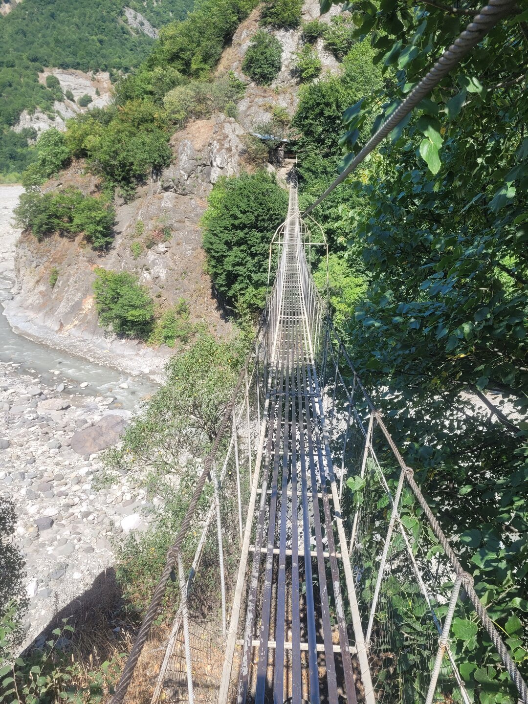 В начале своего рассказа я уже написала про дорогу до Лагича, что мне она не внушала доверия, но в хорошую погоду по ней можно спокойно проехать, но одно но всё-таки есть. Это камнепад. Не зря эта дорога мне с самого начала показалась не безопасной, реально может прилететь откуда-нибудь сверху, но это ещё считай, повезло. Гораздо хуже, если снесёт селевым потоком с узкой дороги в горную речку. Зря не пугаю, вполне реально. В горное селение Лагич, в котором люди живут полторы тысячи лет, дорогу проложили всего лет 50 назад. До этого туда добирались только горными тропами, отстреливаясь по пути от вечно голодных волков. 20250730_150758.mp4 И насколько знаю, в турах Туртрансвояжа по Азербайджану, есть выездная экскурсия куда входит и Лагич. Но в неблагоприятную погоду знакомство с Лагичем отменяется и заменяется другой локацией. Что, конечно, очень жаль, если такое случается. А мы тем временем доехали ещё до одной достопримечательности, не побоюсь этого слова. Ещё с дороги я увидела этот подвесной мост, или как я его назвала парящий. Немного истории про этот мост. Дорога в Лагич идет вдоль реки Гирдыманчай. Русло реки, пробитое среди гор - широкое, а сама река неширокая, но быстрая и бурлящая. Мост сделан полностью из металла, подвижный – раскачивается, от сильных порывов ветра, и когда идешь по нему. Называется мост - Асма, "Асма" переводится с азербайджанского - "подвесной". Этот мост построил за свои деньги один из жителей деревни Зернава, что находится через реку за горой. В 2004 году наводнение и оползень разрушили единственную дорогу, связывающую поселок Зернава с остальным миром, и 140 семей оказались изолированы. Тогда житель села Сарраф Абдуррагимов соорудил этот подвесной мост. Благодаря этому жители Зернавы смогли добираться до других населенных пунктов. Не знаю как для местных жителей, но для нас проход по мосту платный, 2 маната. Наш водитель спросил: "Пойдёте?" Ну что за вопрос? Конечно, пойдём, тем более и опыт у нас уже есть, по очень похожему мосту мы когда-то прогулялись в Кыргызстане. А это и есть та самая бурлящая река. Но как понимаю, бурлит она не всегда, думаю тогда ощущения были бы совсем другими. В принципе мне и так поначалу показалась страшно, как не говори, а внизу всё-таки пропасть. Но чем дальше я проходила, тем всё больше осознавала, что здесь не так страшно. Поначалу аж коленки дрожали, а потом уже даже ничего стало и я спокойно уже шла, где-то останавливалась и фотографировала. В Кыргызстане было совсем по-другому, там реально было страшно, там даже низа не было видна, да какой низ, я даже голову боялась нагнуть и посмотреть, что там внизу. Хотя какое посмотреть, я дышать боялась. Там реально была пропасть. А здесь вот так. 20250730_153504.mp4 Мы немного прогулялись на другой стороне и пошли обратно. 20250730_153958.mp4 В принципе интересно, да и цена вопроса смешная, поэтому почему бы и не прогуляться по такому мостику.