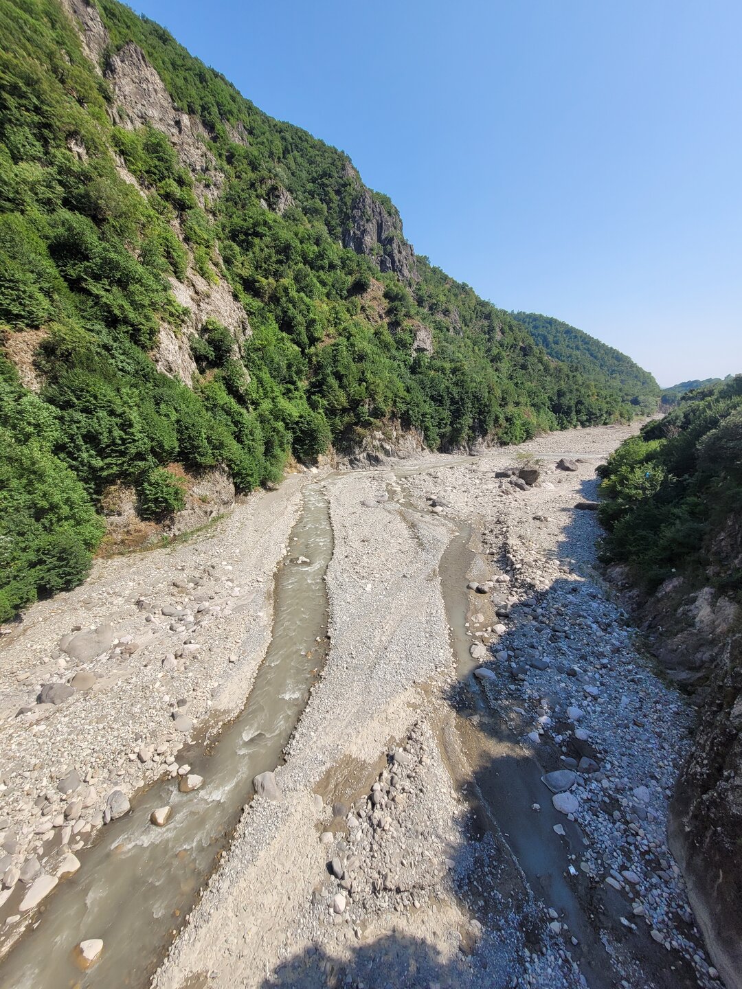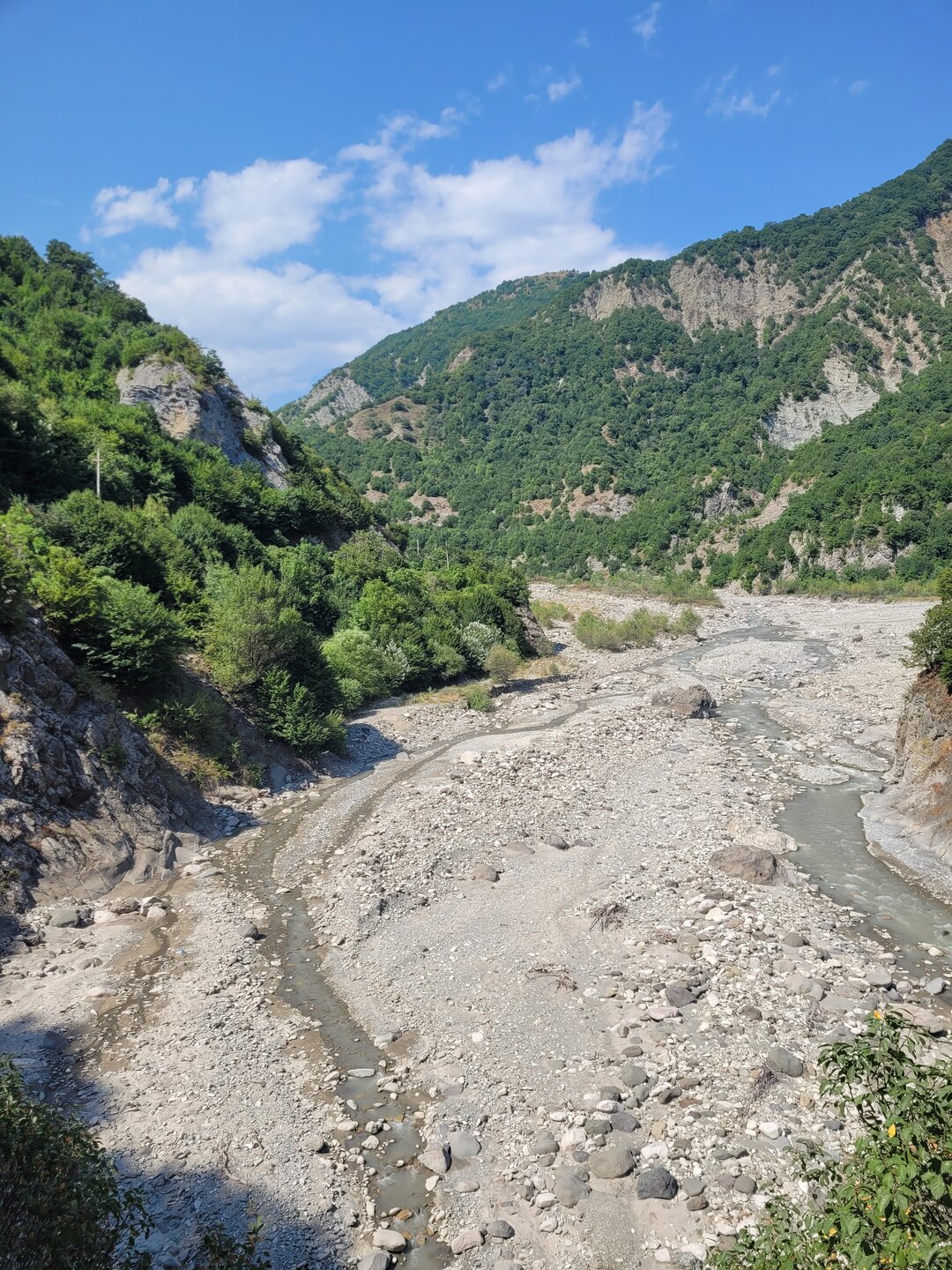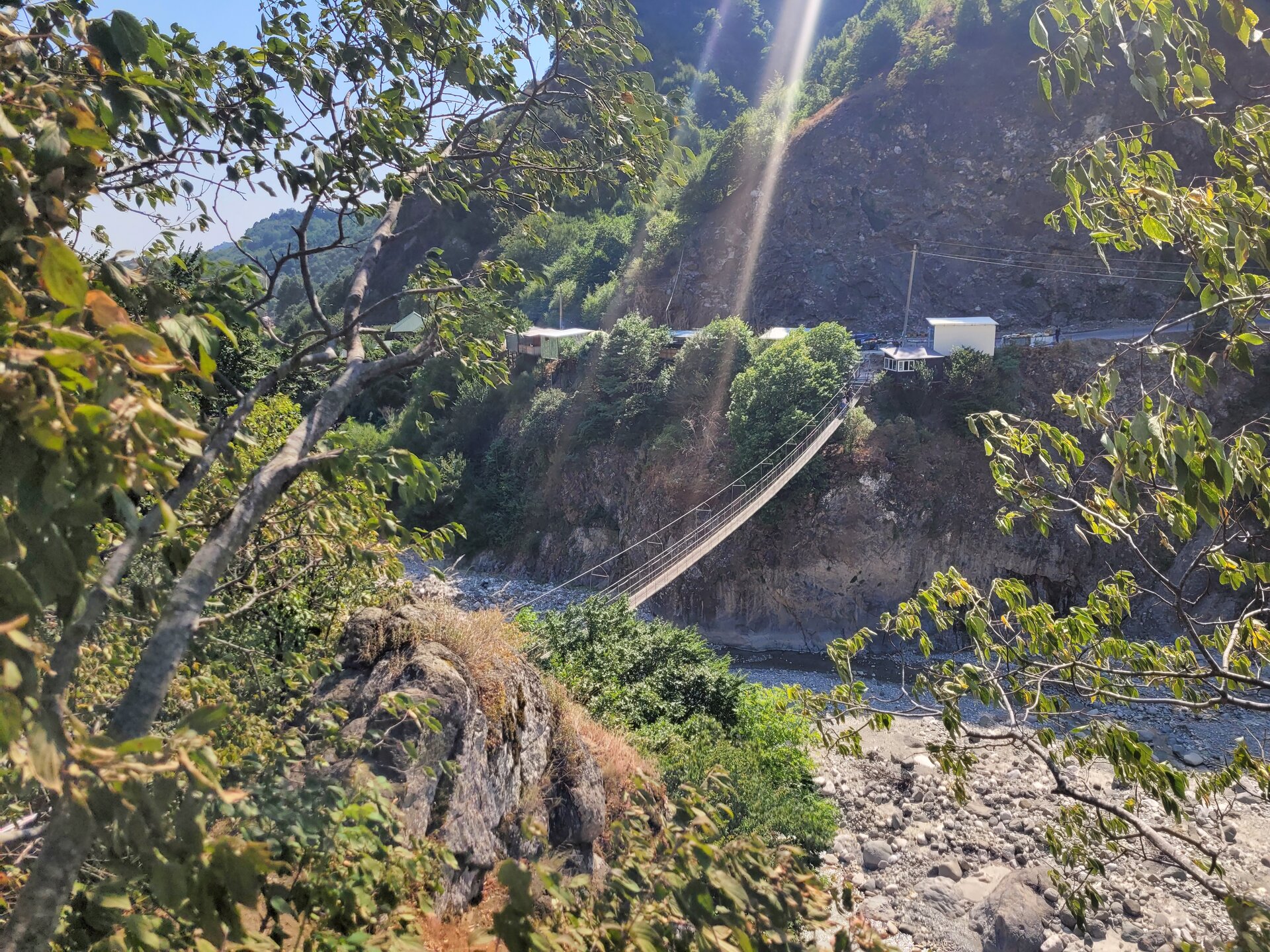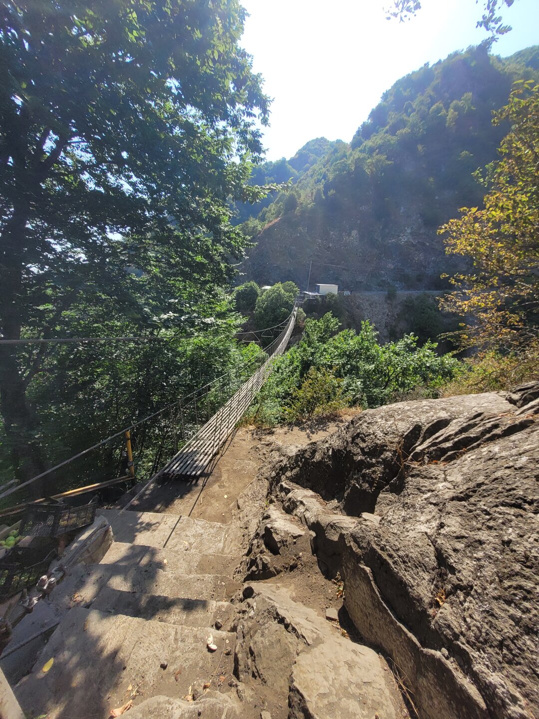 В начале своего рассказа я уже написала про дорогу до Лагича, что мне она не внушала доверия, но в хорошую погоду по ней можно спокойно проехать, но одно но всё-таки есть. Это камнепад. Не зря эта дорога мне с самого начала показалась не безопасной, реально может прилететь откуда-нибудь сверху, но это ещё считай, повезло. Гораздо хуже, если снесёт селевым потоком с узкой дороги в горную речку. Зря не пугаю, вполне реально. В горное селение Лагич, в котором люди живут полторы тысячи лет, дорогу проложили всего лет 50 назад. До этого туда добирались только горными тропами, отстреливаясь по пути от вечно голодных волков. 20250730_150758.mp4 И насколько знаю, в турах Туртрансвояжа по Азербайджану, есть выездная экскурсия куда входит и Лагич. Но в неблагоприятную погоду знакомство с Лагичем отменяется и заменяется другой локацией. Что, конечно, очень жаль, если такое случается. А мы тем временем доехали ещё до одной достопримечательности, не побоюсь этого слова. Ещё с дороги я увидела этот подвесной мост, или как я его назвала парящий. Немного истории про этот мост. Дорога в Лагич идет вдоль реки Гирдыманчай. Русло реки, пробитое среди гор - широкое, а сама река неширокая, но быстрая и бурлящая. Мост сделан полностью из металла, подвижный – раскачивается, от сильных порывов ветра, и когда идешь по нему. Называется мост - Асма, "Асма" переводится с азербайджанского - "подвесной". Этот мост построил за свои деньги один из жителей деревни Зернава, что находится через реку за горой. В 2004 году наводнение и оползень разрушили единственную дорогу, связывающую поселок Зернава с остальным миром, и 140 семей оказались изолированы. Тогда житель села Сарраф Абдуррагимов соорудил этот подвесной мост. Благодаря этому жители Зернавы смогли добираться до других населенных пунктов. Не знаю как для местных жителей, но для нас проход по мосту платный, 2 маната. Наш водитель спросил: "Пойдёте?" Ну что за вопрос? Конечно, пойдём, тем более и опыт у нас уже есть, по очень похожему мосту мы когда-то прогулялись в Кыргызстане. А это и есть та самая бурлящая река. Но как понимаю, бурлит она не всегда, думаю тогда ощущения были бы совсем другими. В принципе мне и так поначалу показалась страшно, как не говори, а внизу всё-таки пропасть. Но чем дальше я проходила, тем всё больше осознавала, что здесь не так страшно. Поначалу аж коленки дрожали, а потом уже даже ничего стало и я спокойно уже шла, где-то останавливалась и фотографировала. В Кыргызстане было совсем по-другому, там реально было страшно, там даже низа не было видна, да какой низ, я даже голову боялась нагнуть и посмотреть, что там внизу. Хотя какое посмотреть, я дышать боялась. Там реально была пропасть. А здесь вот так. 20250730_153504.mp4 Мы немного прогулялись на другой стороне и пошли обратно. 20250730_153958.mp4 В принципе интересно, да и цена вопроса смешная, поэтому почему бы и не прогуляться по такому мостику.