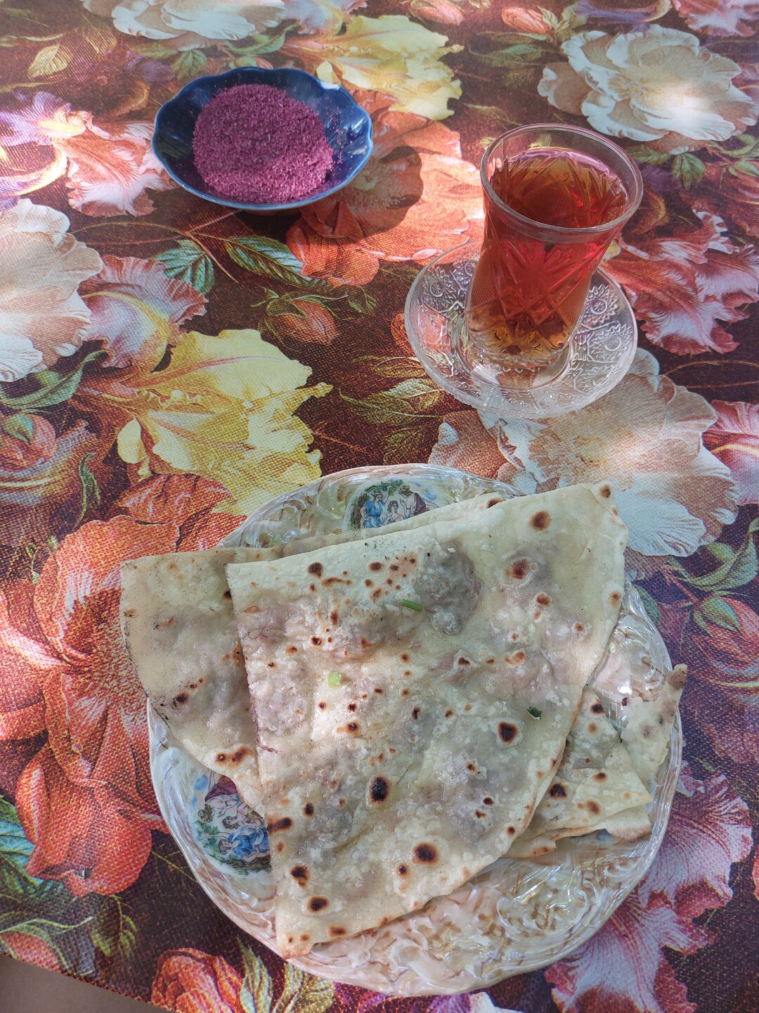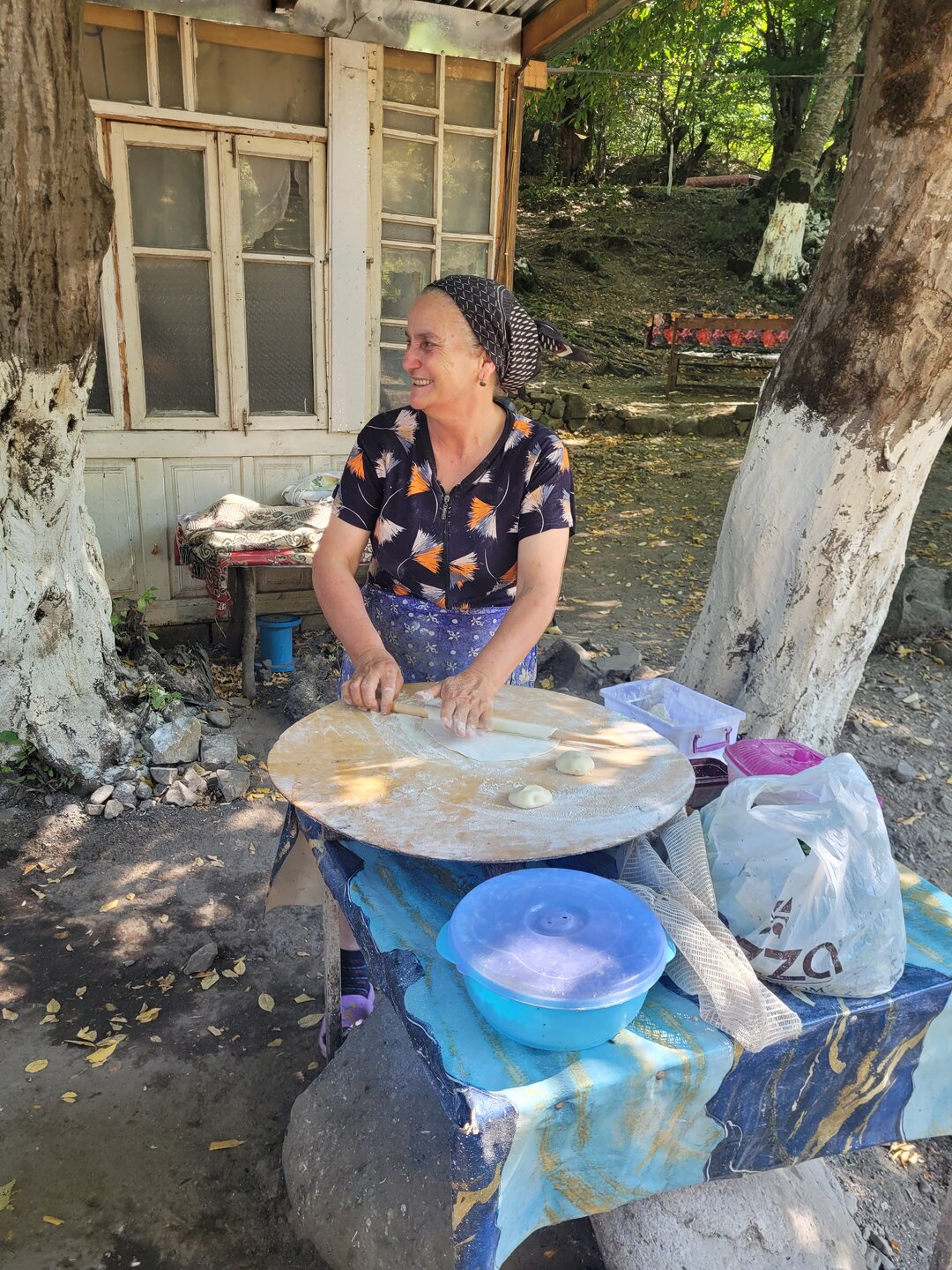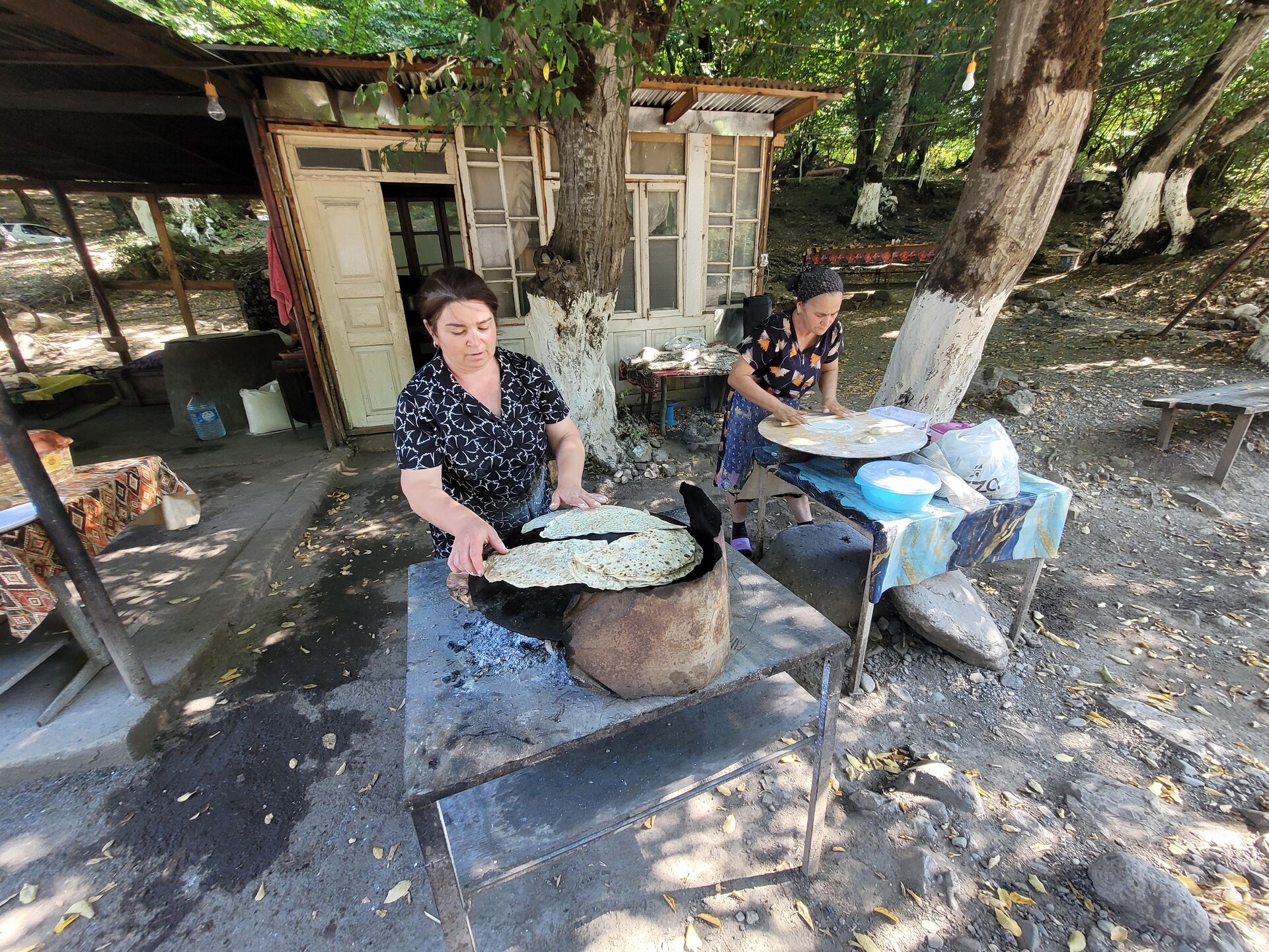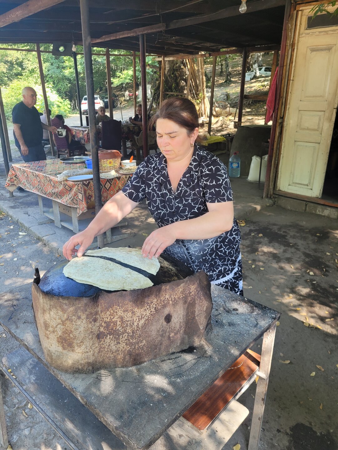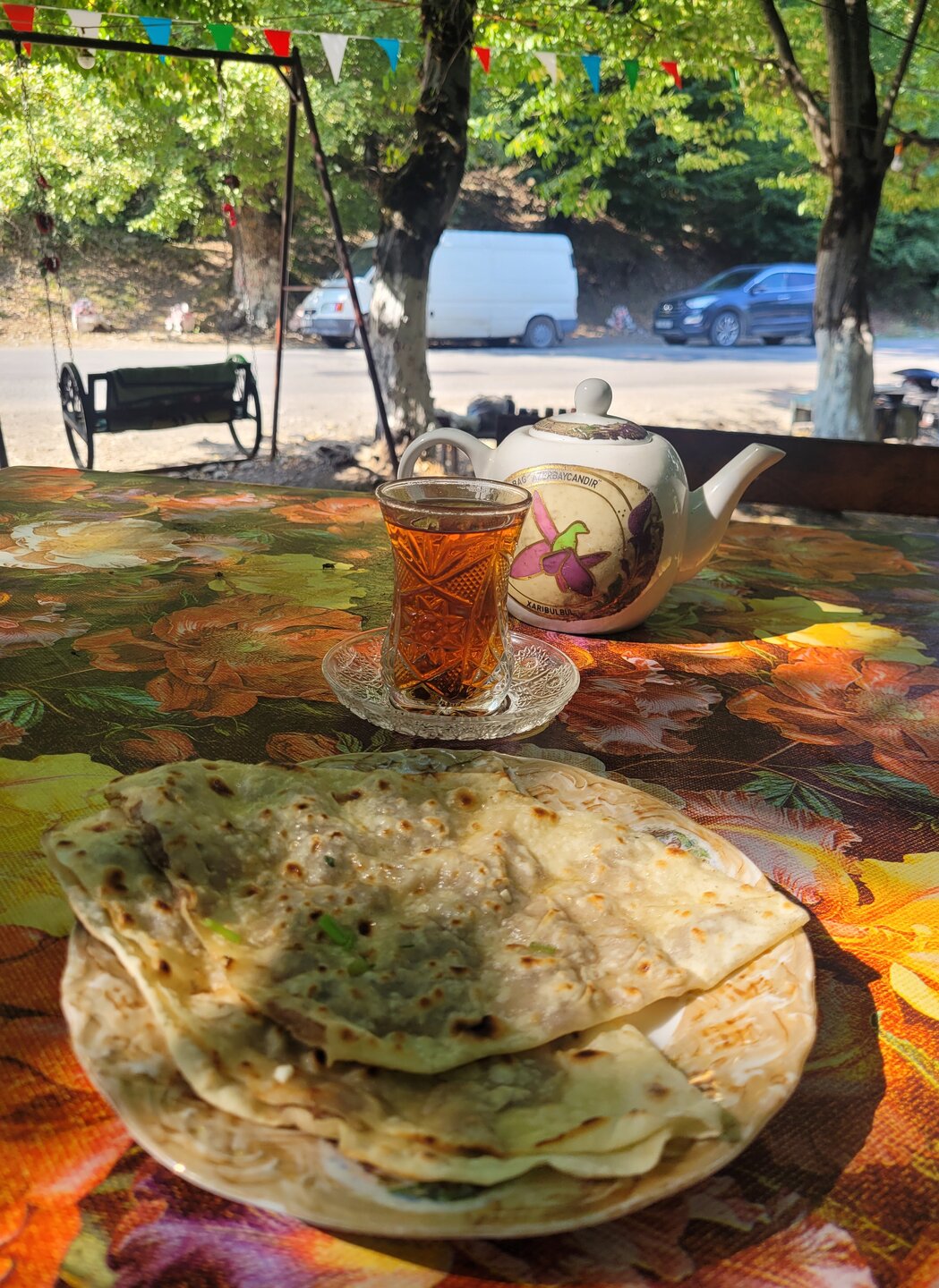 Кто не ел кутабы, тот не был в Азербайджане. Так в принципе можно сказать про любое блюдо. Но ведь это, действительно, так. Когда мы едем в хоть какую страну, одним из пунктиков ставим посещение кафе, ресторана, но хоть что-то, где можно попробовать блюда именно местной кухни. Так было и здесь, только в нашем случае это был не ресторан и ни кафе и даже ничего похожего на кафе, а что-то вот такое прям на трассе, где мы остановились по пути в Баку. Как нам говорил наш водитель-гид, здесь самые вкусные кутабы. Сравнить, конечно, нам было не с чем, но кутабы, действительно, оказались на высоте. Когда мы подошли, при нас тут же начали их готовить. Мы стояли и смотрели, наш водитель говорит: "Они обижаются". Господи, что случилось, что мы такого уже успели натворить за 5 секунд? Оказалось, что они не поняли почему мы их не снимаем на видео и не фотографируем. Мы быстренько это дело исправили. Вот такой тут семейный подряд. Пожилая женщина - это свекровь, молодая - сноха, они и занимаются тут всем. Но как нам говорили, они не готовят заранее, всё по факту. И мы в этом лично убедились, готовили прям при нас и честно сказать, было очень интересно посмотреть, как это всё происходит. 20250730_154924.mp4 20250730_154937.mp4 20250730_155012.mp4 Ели мы, конечно, не прям тут на ходу. Здесь всё организованно, наверху на горе, в разным местах стоят столы, вот за один из таких столов мы и прошли. Буквально, спустя минут 5 к нам подбежал мальчишка лет 13-15 и принёс нам наш заказ (на фотографии сверху видно этого ребёнка). Не женщинам же бегать по горам. А он прям так лихо, туда, сюда, в общем, здорово управляется. Вот так, вся семья задействована, ну насчёт мужчин не скажу, их не видела, только сидящими за столом внизу. И так, что же такой кутаб? Это тонкий пирожок в форме полукруга из пресного теста с начинкой. В качестве начинки используют мясо, зелень, тыкву, зёрна граната, сыр, лук. Готовят кутабы в основном весной и осенью. Обычно часто готовят весной с появлением молодой зелени. Главное в кутабах - это баланс между тонким тестом и сочной начинкой. Тесто должно быть настолько тонким, чтобы сквозь него можно было читать газету. Если тесто будет слишком толстым, то кутаб не прожарится. А если будет слишком толстый слой начинки, то вероятность, что кутаб порвётся. И в самом конце, как только готовый кутаб сняли со сковороды, его поверхность надо обязательно надо смазать маслом, это финальный, но очень важный штрих. Потом сложить стопочкой друг на друга, накрыв крышкой или тарелкой. Так они останутся мягкими, пропитаются маслом и ароматом друг друга. А ещё готовить кутабы нужно с душой, и тогда они ответят вам незабываемым вкусом. В общем, приготовление кутабов - это целое искусство. За наш вот такой ужин, хотя даже не знаю,что это было, но не столь важно, мы отдали 15 манат. 1 кутаб стоил 3 маната + чай 3 маната.