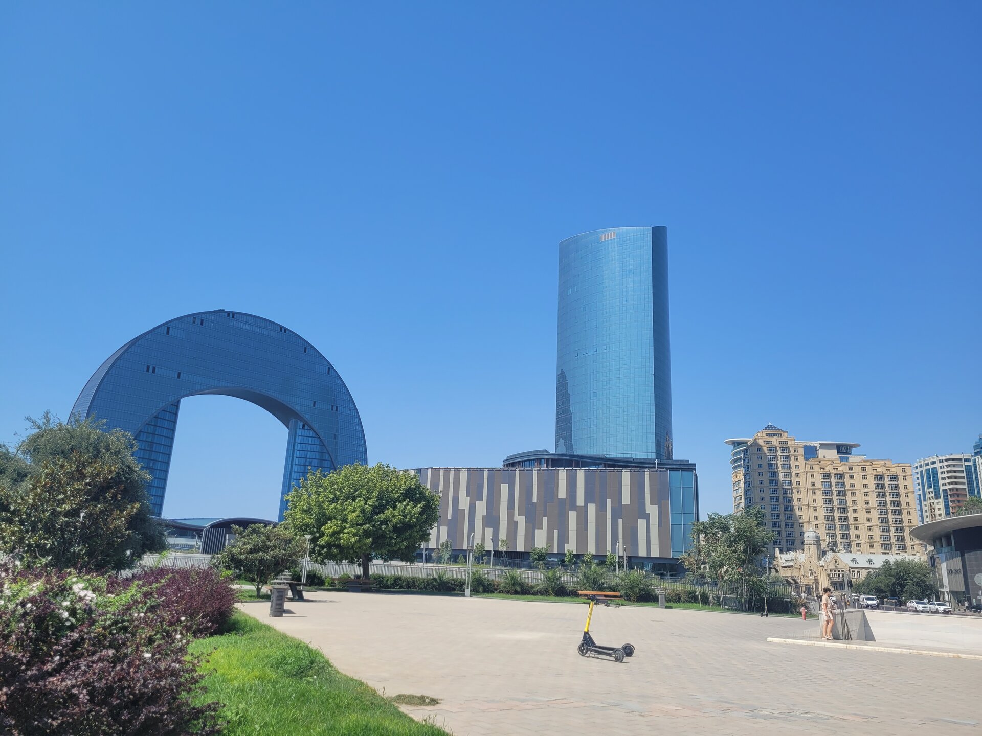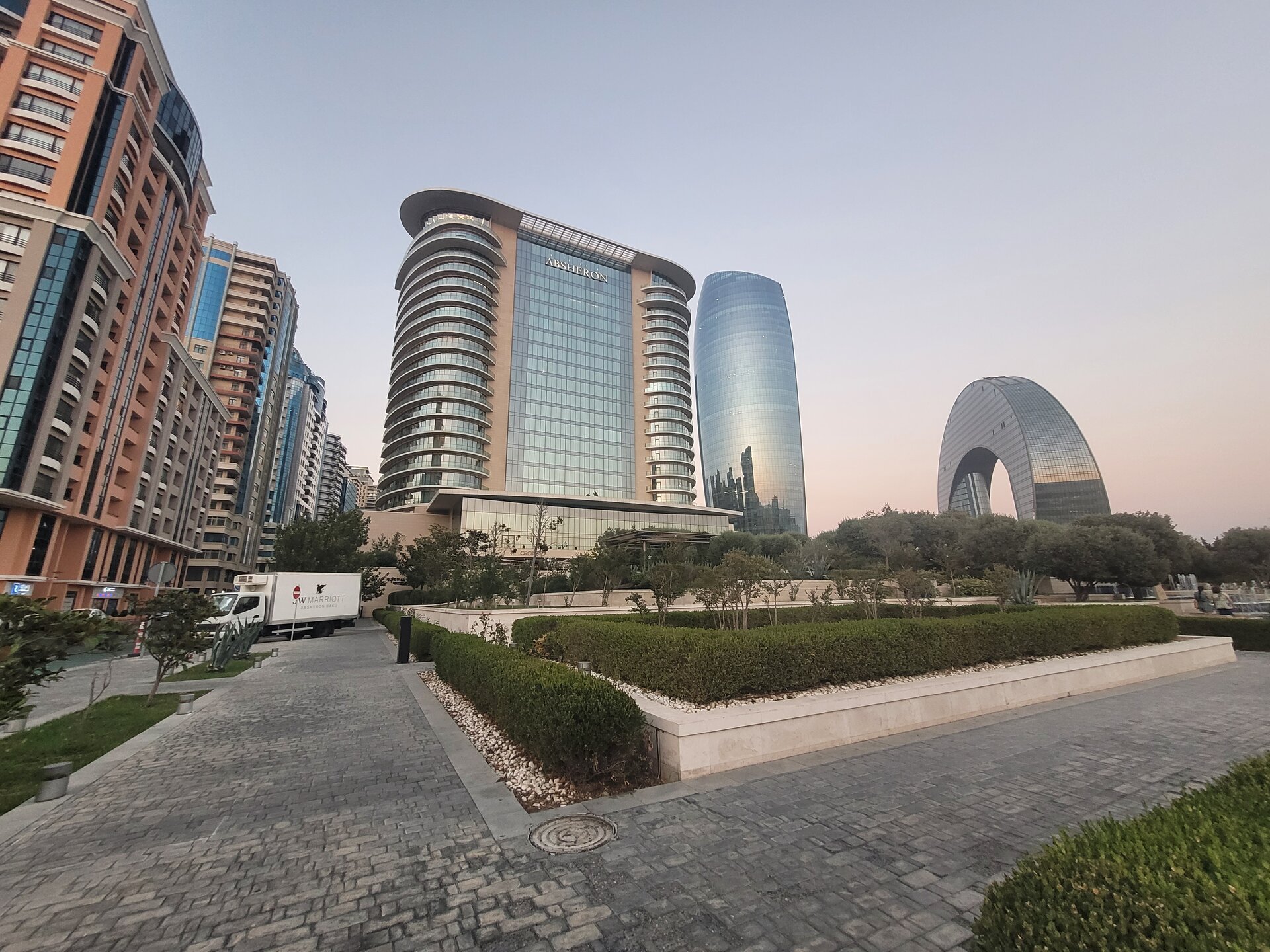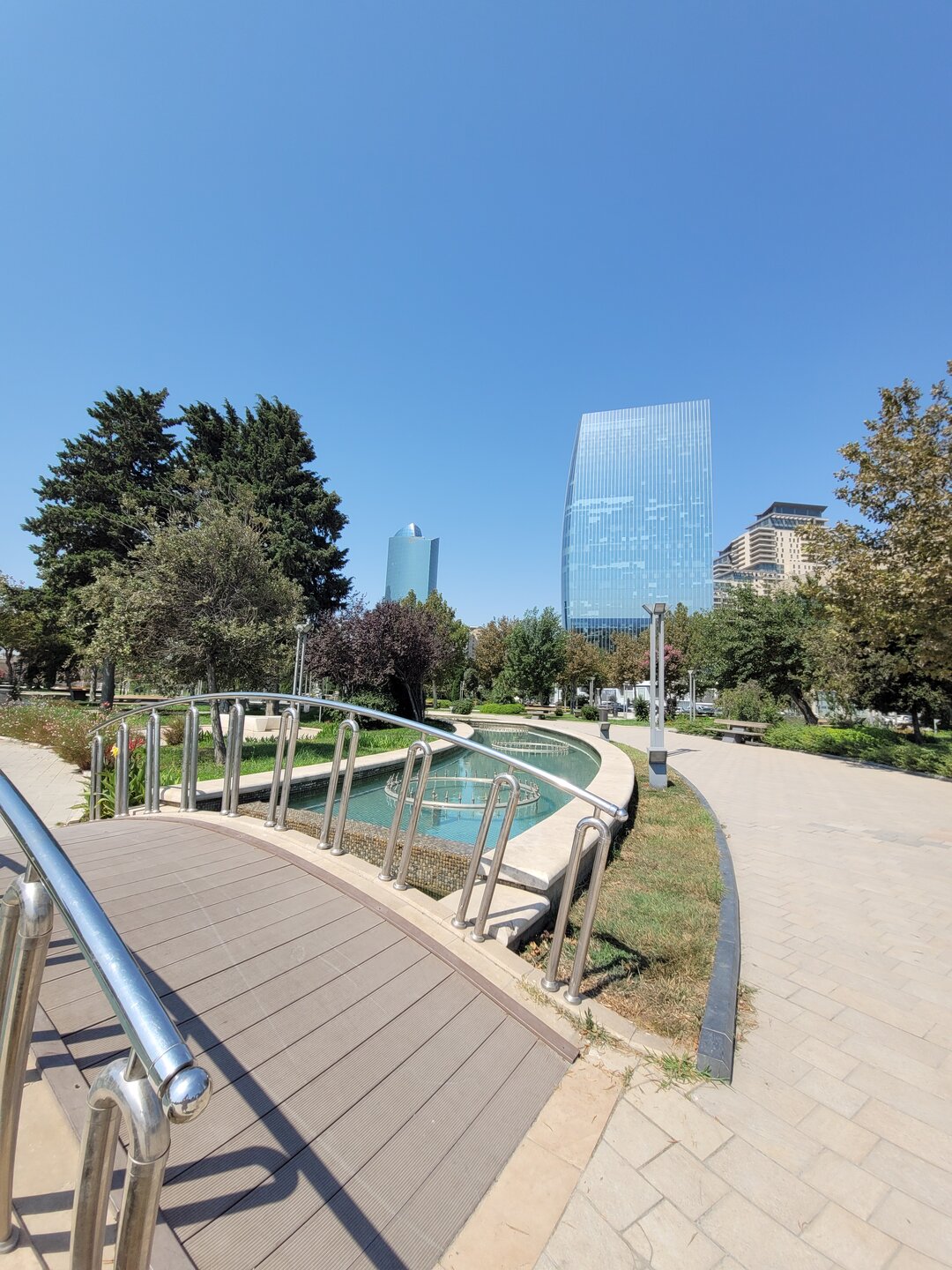 В этот день в наших была ещё одна достопримечательность. Когда я готовилась к поездке и просматривала, что нам необходимо будет посмотреть в Баку, как-то информация про эту достопримечательность не попадалась мне на глаза, о ней мы узнали от нашего гида-водителя на первой экскурсии. И вернувшись домой, чуть-чуть отдохнув, мы отправились в сторону Морского вокзала, рядом с которым расположен торговый центр "Кресент Молл". Как я сказала доче, сегодня нам хоть как надо туда, иначе мы уже никогда туда не попадём, завтра день заключительный и нам точно будет уже ни до чего. Так что идём. Благо и Морской вокзал и торговый центр были в пешей доступности. Хотя учитывая как мы ходили, от нас всё что можно было в пешей доступности, 20 минут идти или 50, но пешком доходили, значит в пешей доступности. Сколько раз мы видели это здание издалека, или чуть ближе, но вот мы совсем рядом с ним. Это здание гостиницы. Как я поняла проект ещё в ходе реализации, ни одного светящегося окошка замечено не было. Но нас волновал бассейн перед эти зданием. Именно здесь и проходят шоу-фонтанов, как когда-то я видела в Дубае. Честно сказать я не очень разобралась как часто эти шоу проходят. Нам сказали, что вроде начинаются с 21.00, но когда мы подходили на часах было что-то начало девятого, но представление уже шло. И вот что мы увидели. 20250730_200913.mp4 Честно сказать, я вообще не поняла, что это было. Это не шоу.....если сказать, что я была разочарована, это ничего не сказать. Меня когда-то фонтаны в Дубае не впечатлили, а тут даже слов не было, чтобы выразить своё разочарование. Ладно, подумали мы, не будем впадать в панику, подождём до 21.00, а там видно будет. И мы пошли в торговый центр. именно там решили провести время.