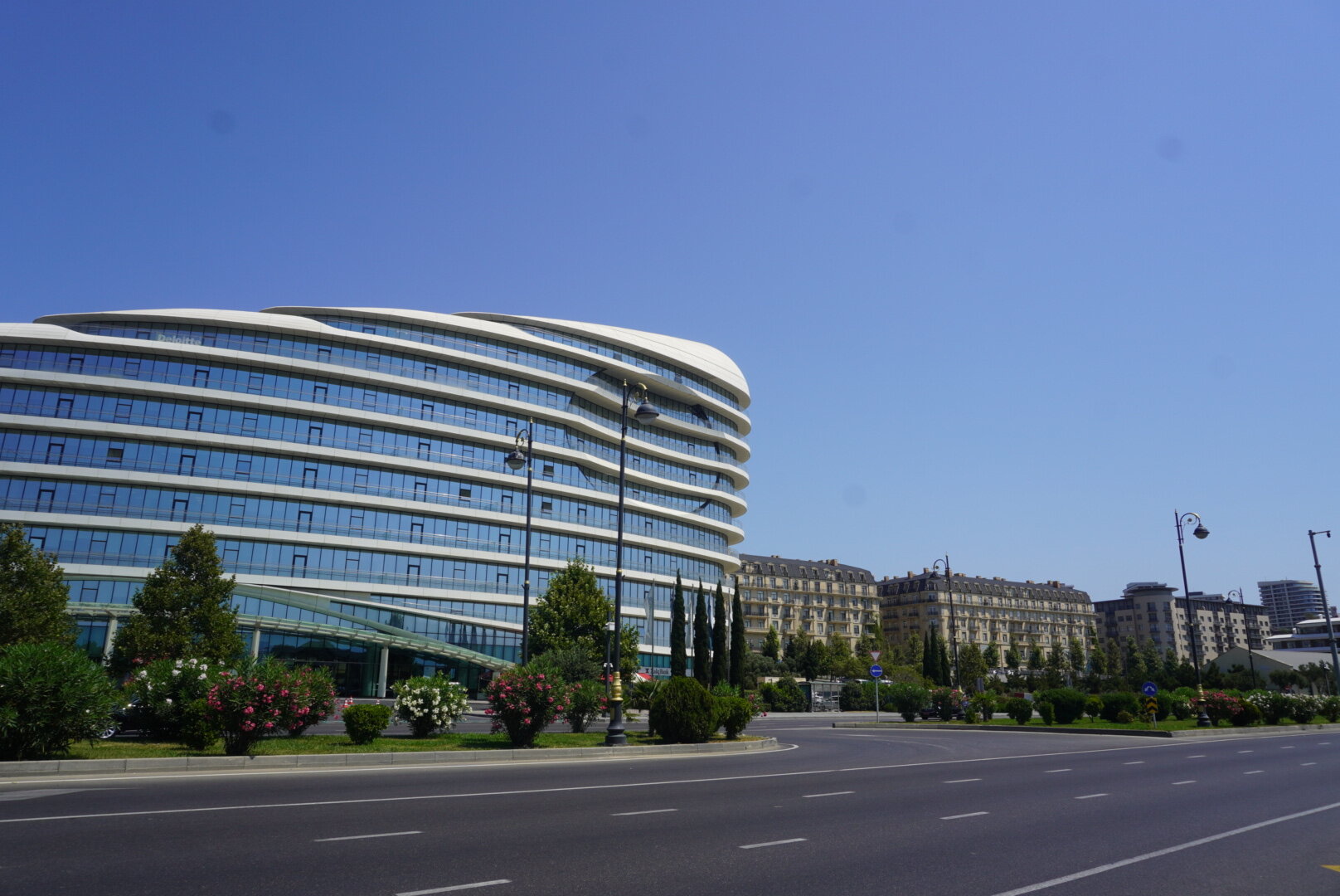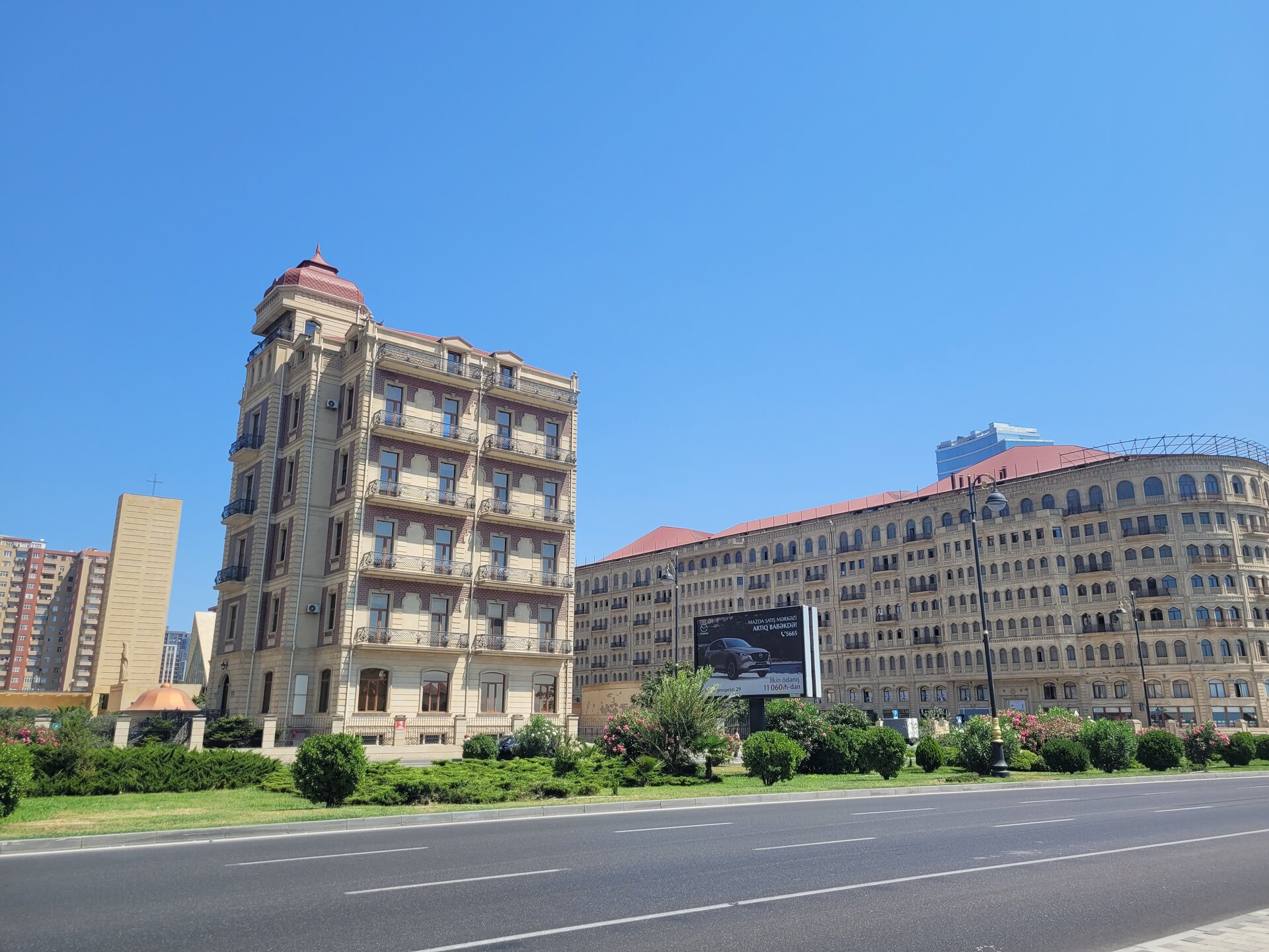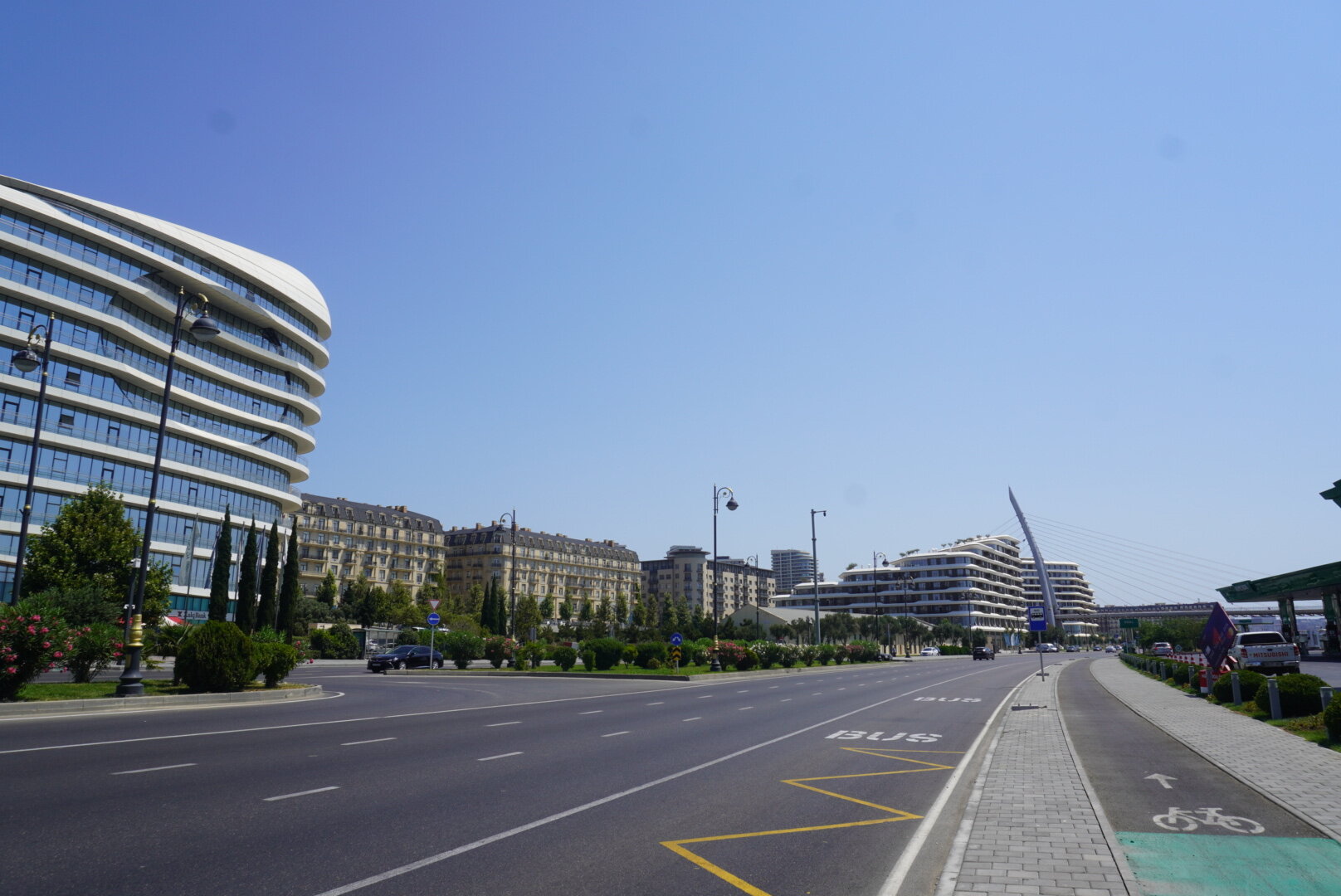 Наш заключительный 9-й день в Баку. Ну прям грустно было от этого. Как же здорово когда всё только начинается, и как же грустно когда всё заканчивается. Но как я себе говорю: "А почему заканчивается? Для того, чтобы начаться чему-то новому". И это что-то новое должно было начаться сразу через два дня после нашего прилёта из Баку. В первые такое было, чтобы мы сразу с одного корабля на другой. Передых был всего в два дня. И только следующая поездка грела мне душу. Это не то, что мы прилетим и на этом всё, а то что мы прилетим и почти сразу опять улетим. Впереди нас ждала Турция, а пока Баку. Тем более в этом городе у нас оставался ещё один пунктик нашей программы. И так, мы идём знакомиться ещё с одной достопримечательностью Баку, мы идём знакомиться с Белым городом. И я нисколько не преувеличиваю, именно идём, несмотря на то, что карта нам показывала, что идти больше часа. Но меня всегда меньше всего пугали прогулки пешком. Да и не увидели мы столько, если бы поехали на общественном транспорте или на такси. Можно было доехать до станции метро Шах Исмаил Хатай, а там почти рядом. Честно сказать, я не очень разобралась где граница Белого города. В любом случае мы изначально не рассматривали вариант транспорта, сразу решили, что пойдём пешком. Поэтому идём. Сначала дошли до Морского вокзала, до торгового центра "Кресент Молл", только вчера вечером мы были здесь, смотрели поющие фонтаны. А в то утро так тихо было здесь, на улице почти никого. Ну, если только машины.
