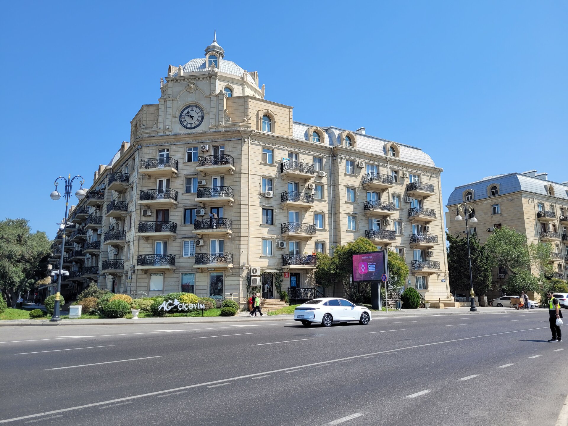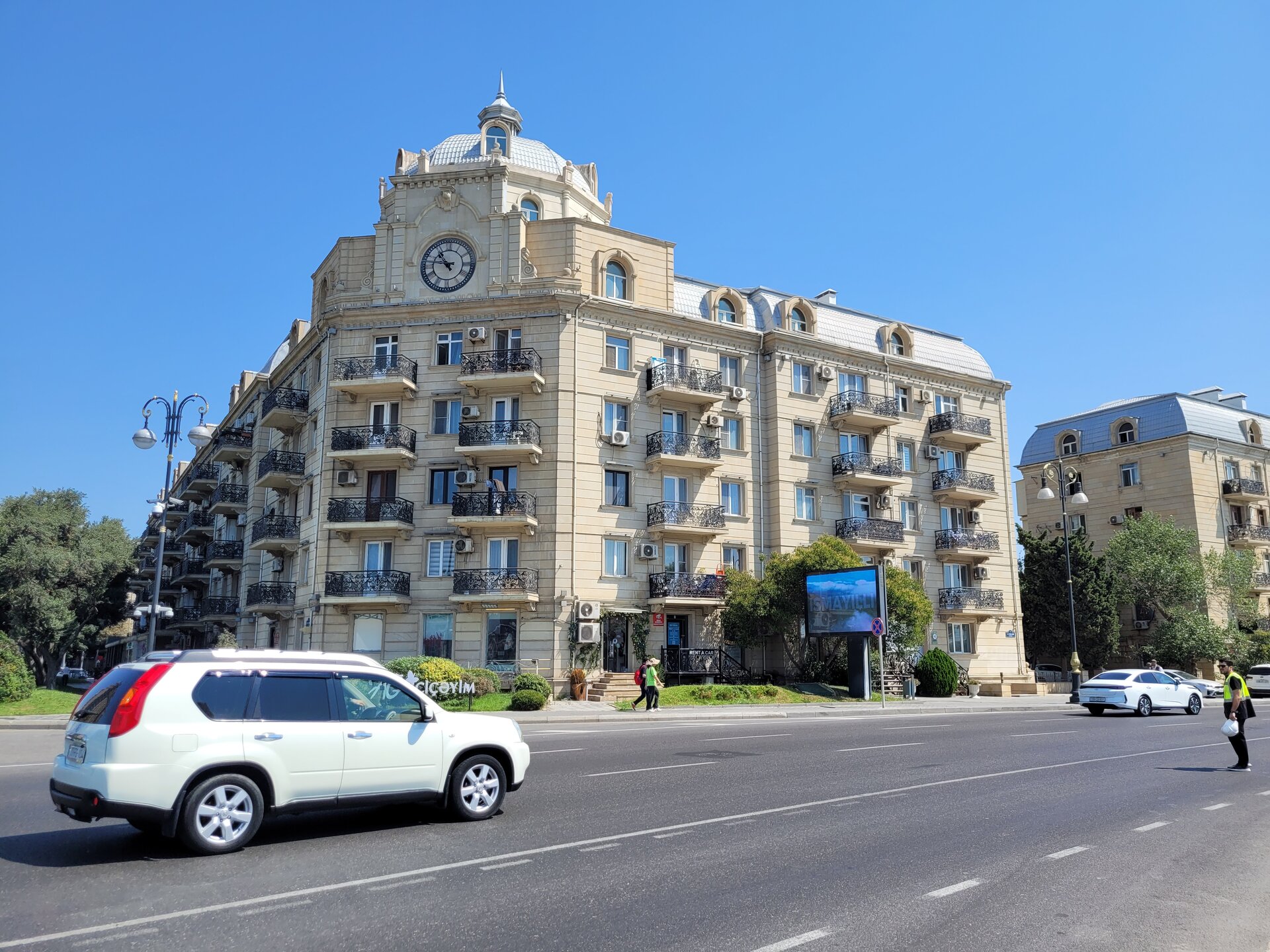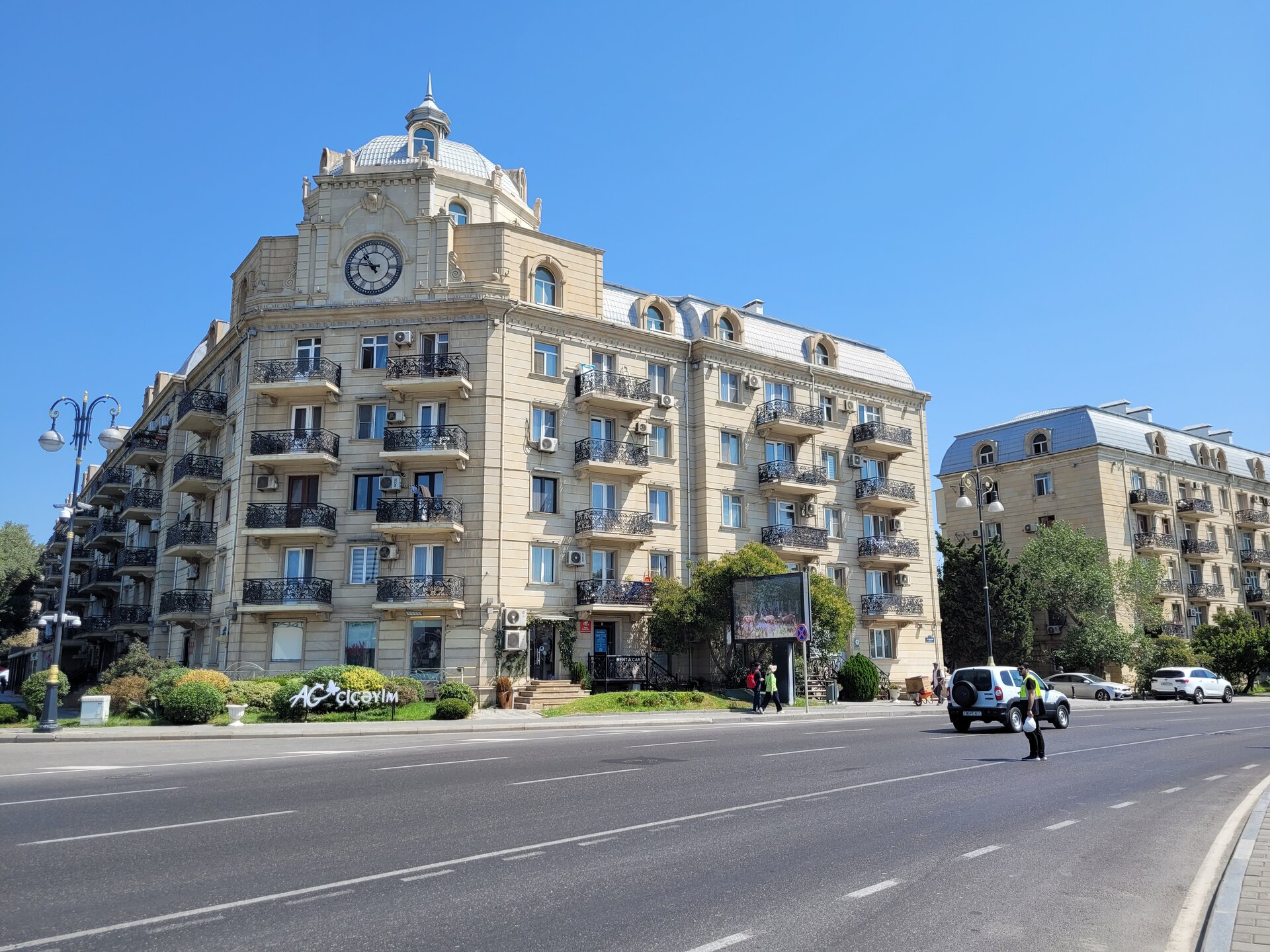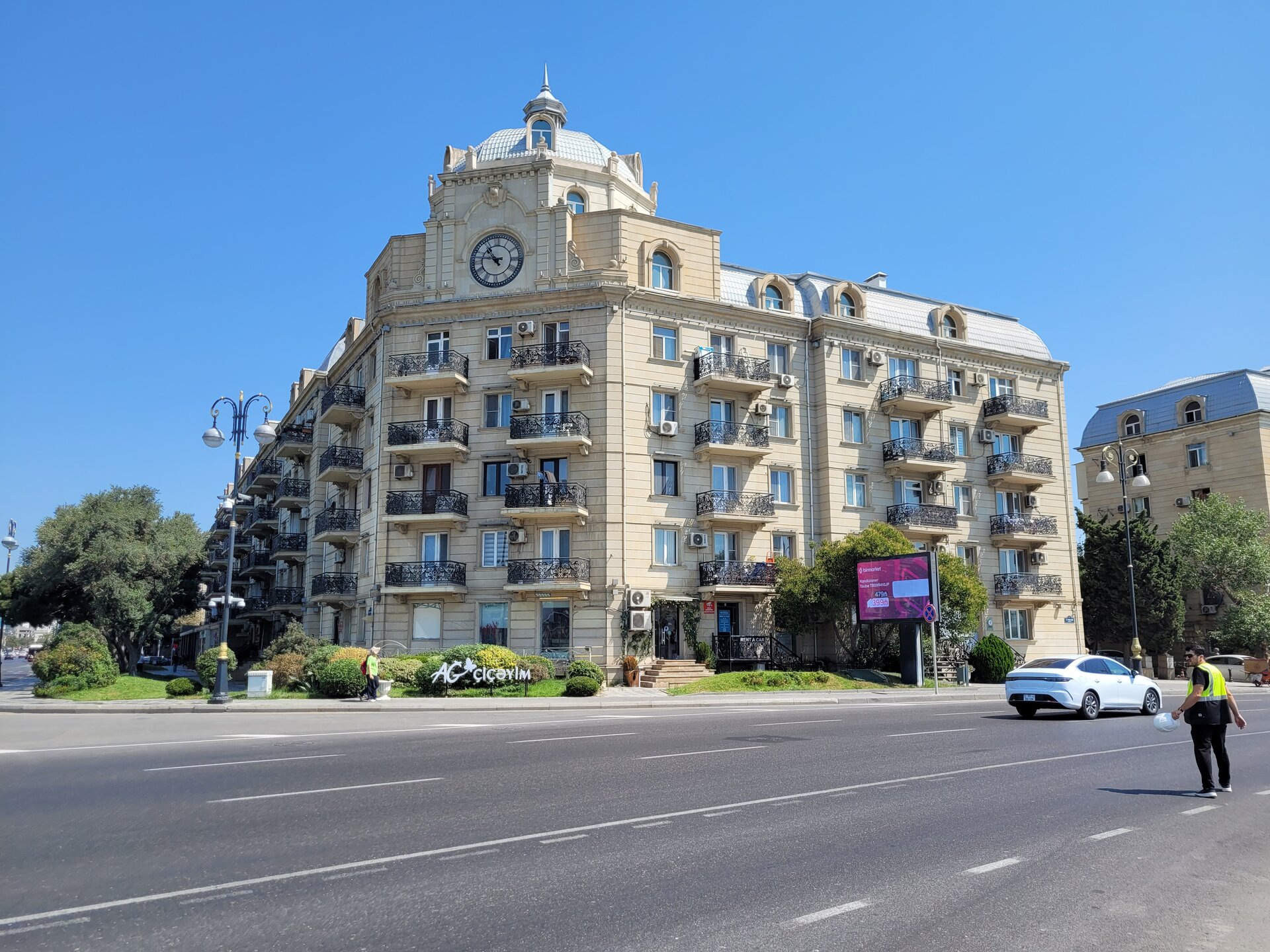 А вот то, что мы увидели дальше, это можно уже назвать классикой города Баку. Дорога очень оживлённая, но зачем идти до светофора, в Баку с этим всё-таки гораздо лучше, чем это было в Шардже, там прям беда была со светофорами, переходами, зебрами. Но нет, где приспичило, там люди и переходили дорогу, ну в крайнем случае перебегали. Ну или на худой конец руку выставляли вперёд, и не поверите, машины останавливались или хотя бы притормаживали. Как понимаю, у водителей не было выбора, не по людям же ехать. Хотя в той же Турции, даже пешеходные переходы водителей не останавливали. Как ехали, так и продолжали ехать. В данной ситуации этого молодого человека в жёлтом, ничего не остановило. Прям интересно было посмотреть на его квест. И таких ситуаций видели в Баку очень много. Ладно, когда сам бежит, но когда мы увидели как мужчина перебегал эту оживлённую дорогу с четырьмя детьми, перед близко идущим транспортом, вот тогда я аж дар речи потеряла. Ну что могу сказать, бесстрашные они что ли, ничего не бояться.