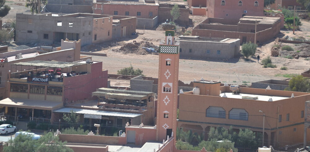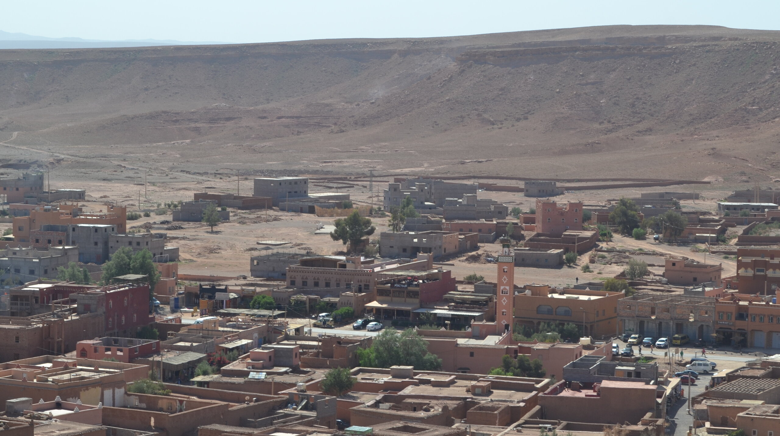 Горы, горы, долина, скалы, вершины. Остановка на смотровой площадке на фотопаузу… Красиво… А внизу дорога лентой вьётся. Неужели мы по такому серпантину проехали. И стойки с туристической всякой всячиной тут как тут. И вдоль дороги тоже прилепились Кое – где спрятались деревни … И как там люди живут? Вот и на осликах ещё и груз возят. Зелени не так много. Всё- таки уже осень. Но даже река есть Кое - где на вершинах снег Потом мы пересекаем Атласские горы., в том самом месте, где перевал Тизи – н Тишка на высоте 2260 метров над уровнем моря. Он расположен на старом караванном пути. Считается, что перевал этот самый высокий в Северной Африке. Туристы тут непременно останавливаются. Здесь можно, налюбовавшись горными пейзажами, отдохнуть. А мы дальше…. Мимо какого- то маленького города, в котором всего-то 60 человек проживает (названия не запомнила). Алексей рассказывает, что каждую среду сюда со всех окрестных деревень съезжаются люди на базар. И тогда здесь очень многолюдно. Едем уже 4,5 часа. До Айт – Бен –Хадду осталось чуть - чуть.