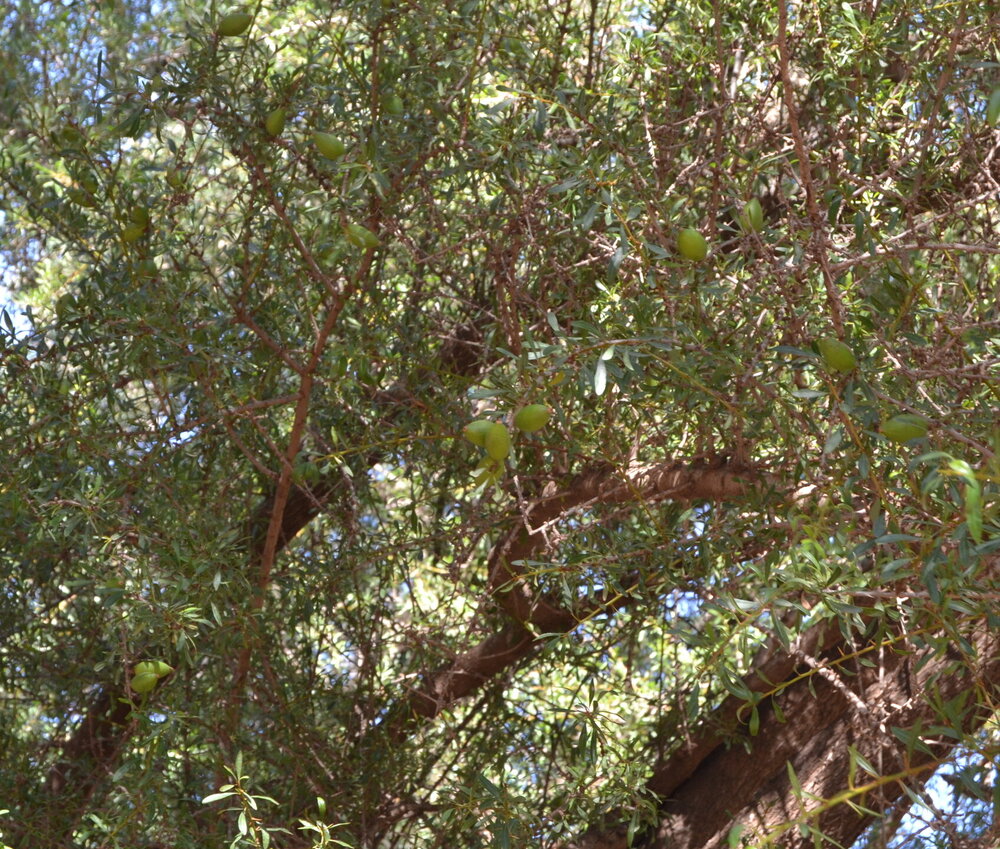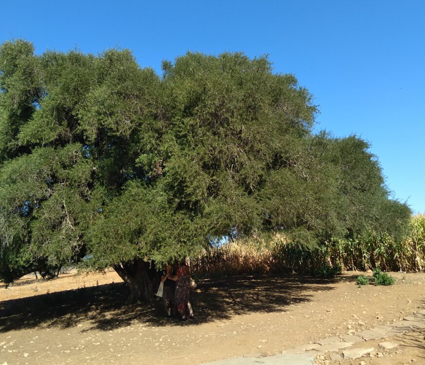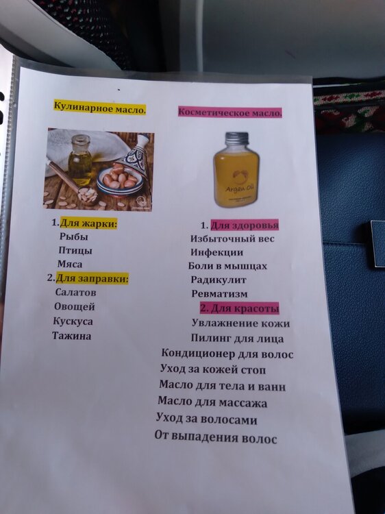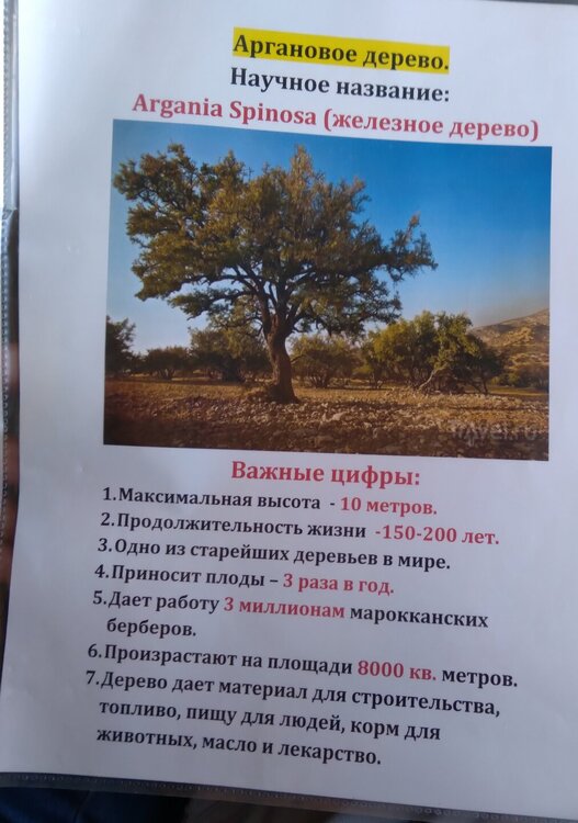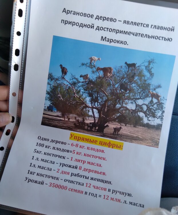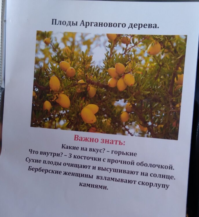 А по дороге в Эссуэйру нам предстоит остановка. Мы посетим аграрный кооператив, который занимается производством арганового масла. Алексей проводит подготовительный урок, рассказывая довольно подробно об аргановом дереве. Оказывается, дерево это нельзя культивировать, оно может расти только самостоятельно. А растёт оно только в части Марокко и в Мексике. А наглядные пособия у Алексея как всегда готовы. Вот они: Знакомимся. А вот снимок, где козы на дереве, привлекает внимание. Такое дерево и в реальности было. Говорили, что козы очень любят плоды арганового дерева. Но это не до такой же степени, чтоб на дерево аж до верхушки запрыгивать. Привязывали их, чтоб туристам показать. Теперь это запрещено. А вот и кооператив вдали показался, ещё чуток и мы у входа. Заходим на территорию. И. конечно, всем интересно увидеть огромное аргановое дерево, которому, как уверяют все вокруг, 500 лет. 500!!! Не верится! плоды есть!