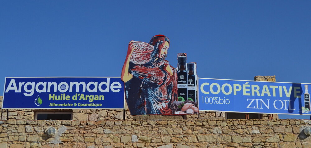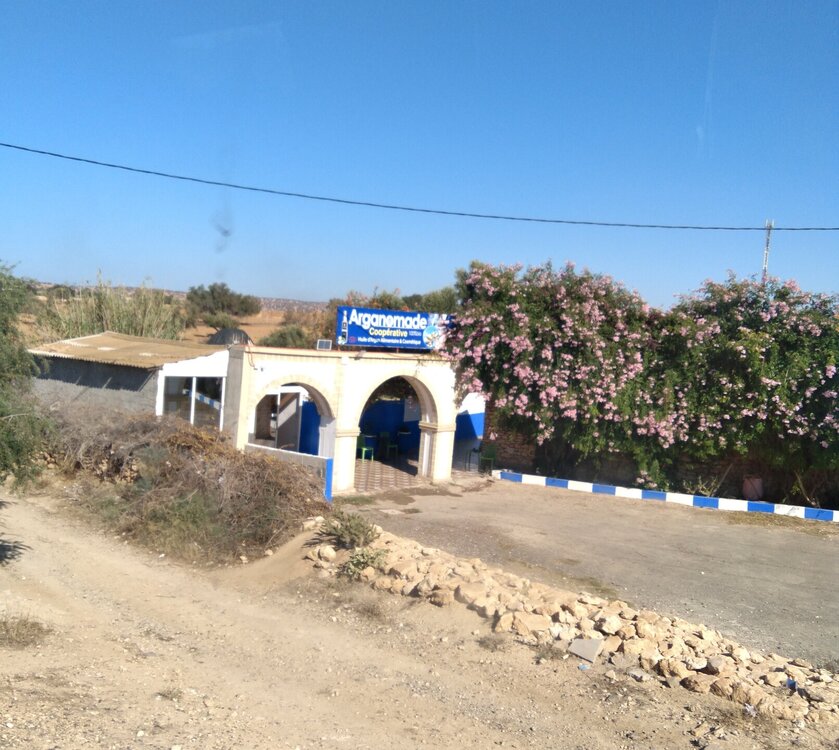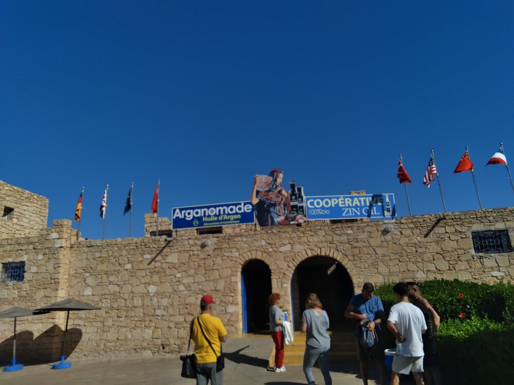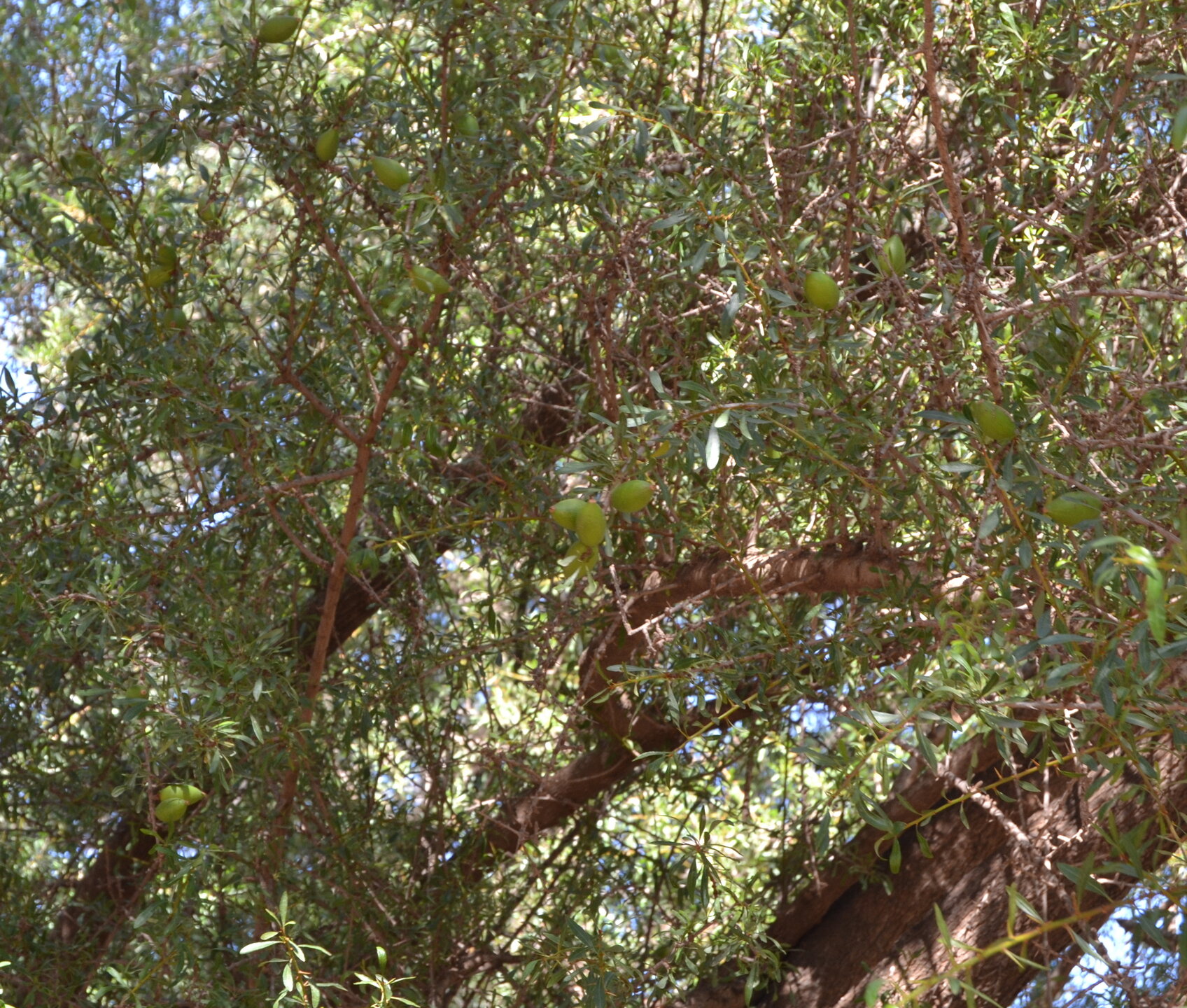 А по дороге в Эссуэйру нам предстоит остановка. Мы посетим аграрный кооператив, который занимается производством арганового масла. Алексей проводит подготовительный урок, рассказывая довольно подробно об аргановом дереве. Оказывается, дерево это нельзя культивировать, оно может расти только самостоятельно. А растёт оно только в части Марокко и в Мексике. А наглядные пособия у Алексея как всегда готовы. Вот они: Знакомимся. А вот снимок, где козы на дереве, привлекает внимание. Такое дерево и в реальности было. Говорили, что козы очень любят плоды арганового дерева. Но это не до такой же степени, чтоб на дерево аж до верхушки запрыгивать. Привязывали их, чтоб туристам показать. Теперь это запрещено. А вот и кооператив вдали показался, ещё чуток и мы у входа. Заходим на территорию. И. конечно, всем интересно увидеть огромное аргановое дерево, которому, как уверяют все вокруг, 500 лет. 500!!! Не верится! плоды есть!