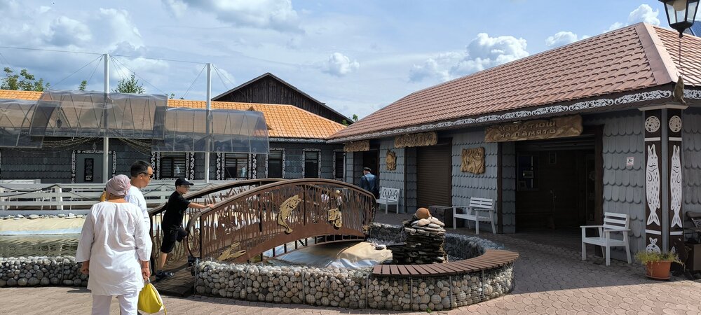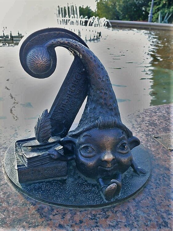 Где-то 20 минут у нас ушло на сувениры. Возвращаемся на Советскую площадь. Вниз от площади к набережной Саранки идет фонтанный спуск. Пока все собирались здесь с сувениров, я успела сбегать на еще одну смотровую площадку за Ленинским сквером. Отсюда виден монумент «Навеки с Россией» в окружении фонтанов. Скульптуры двух женщин в национальных нарядах, несущих один колосок. Символ единства, при котором сохраняются культурные особенности обоих народов. Вернулась к фонтанному спуску. Идем вниз на набережную. Памятник ремесленникам В фонтанный спуск прекрасно вписался памятник А.С.Пушкину. Александр Сергеевич хоть в Саранске и не был, но ездил по Мордовии, изучая историю крестьянской войны под предводительством Е.Пугачева. И Саранск упомянут им в «Истории Пугачева». На набережной поворачиваем направо. Рядом со спуском скульптура еще одного символа Мордовии – лисицы. Лиса изображена на гербе Саранска вместе с тремя стрелами, и обозначает богатство и ум. А стрелы - основное занятие местного населения - охоту. И изображения лисы здесь не только в скульптурах. Она и на ножках скамеек в центре, и на перилах мостов через Саранку Идем в Мордовское подворье. На территории подворья воссоздана типичная мордовская деревушка былых времен, где есть и жилые дома, и ремесленные мастерские, и скотный двор, и амбар, и даже баня. А еще многочисленные скульптуры, изображающие бытовые сцены, мордовских божеств, мифических существ и героев народных эпосов. Воссоздана и обстановка внутри домов, позволяющая своими глазами увидеть быт мокшан и эрзян — двух субэтносов, представляющих мордовский народ. Мы последней группой пришли в подворье. Шел уже четвертый час прогулки. Туалета в комплексе не оказалось (!) и пришлось за удобствами идти в краеведческий музей. Хоть нас и разделили на две группы, помещения в которые мы заходили настолько маленькие были, что даже этой подгруппе не хватало места. В общем, потолкавшись в жилом доме и бане, больше я никуда не пошла, просто сидела и ждала на скамейке. В наушники был слышен рассказ экскурсовода. Экскурсией по деревушке программа не закончилась. Кто захотел, нарядились в национальные костюмы, и начались игры, песни и танцы. Заняты в основном были переодевшиеся одногруппники, остальные были наблюдателями и видеооператорами. Но было весело. Фото не выкладываю, поскольку у меня нет согласия тех, кто на них. Программа заканчивается, автобус рядом на стоянке. Уезжаем. По дороге останавливаемся у одного из супермаркетов. Наталья дает время закупиться на ужин. И уезжаем уже в Ульяновск. Мимо «Мордовия – арена» и новых кварталов города. Дома все цветные, нет в Саранске серости. Прекрасный современный город. Точно достоин внимания. Совсем не помню, во сколько мы приехали в Ульяновск. Наверное, около 22.00, там время вроде переводится на час. Гостиница у нас «Азимут». Все вокруг нее в ремонте. И вход откуда-то со двора был.