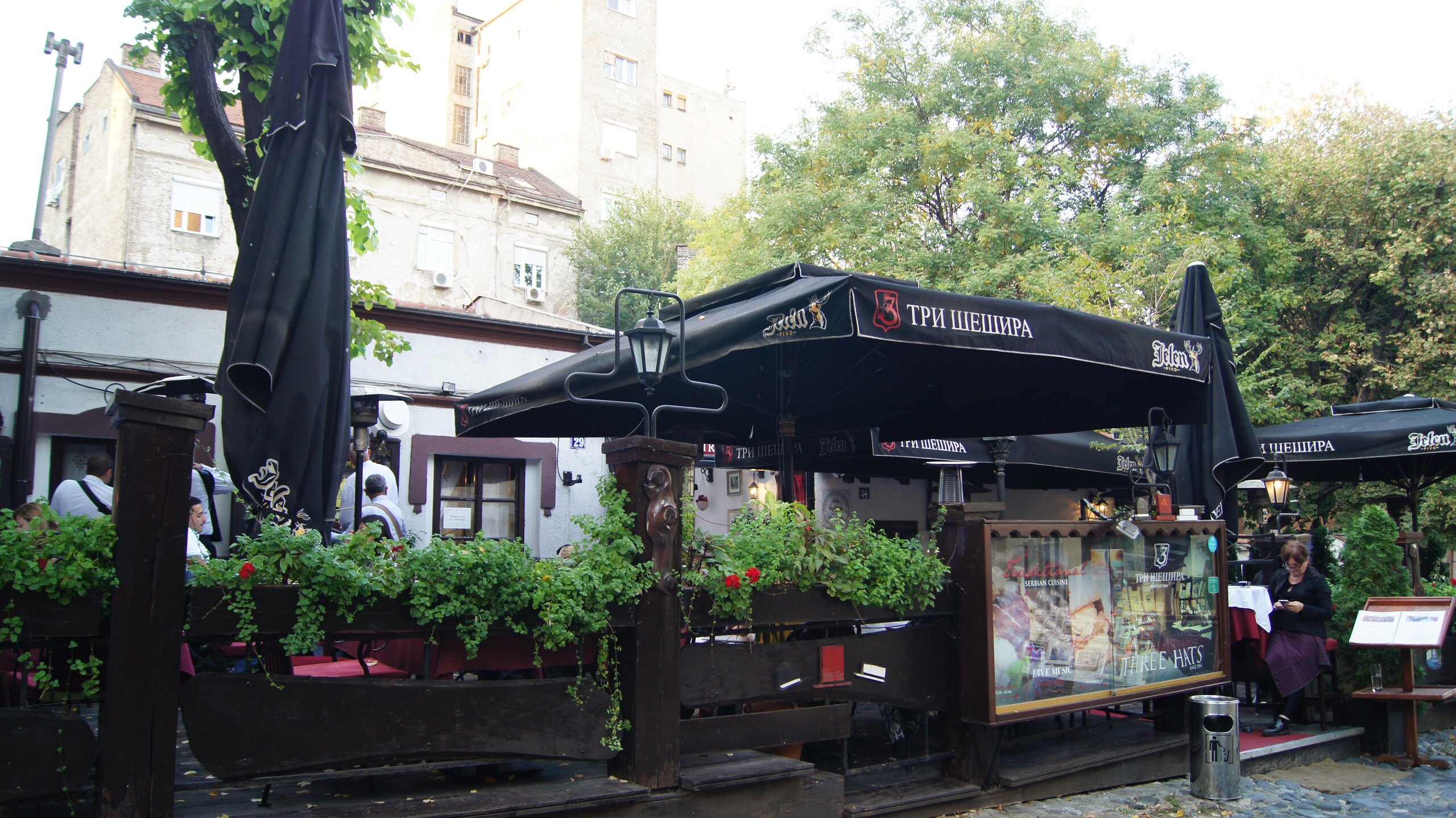 (Три шляпы) и (Два оленя).Ресторан «Шешир мой». Ресторан «Два jелена» Ресторан «Три шешира». Середина октября. Уже нет такого обилия цветов. Мы с Зиной в этот раз просто погуляли по Скадарлии при свете дня. А то в прошлый раз с Маргаритой и Миланом мы были вечером. Они там не редкие гости. А администратор всё тот же. Есть и такие красочные.