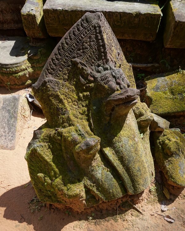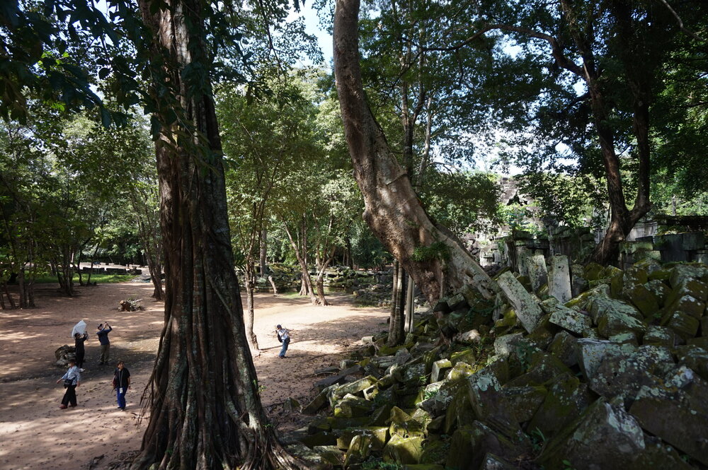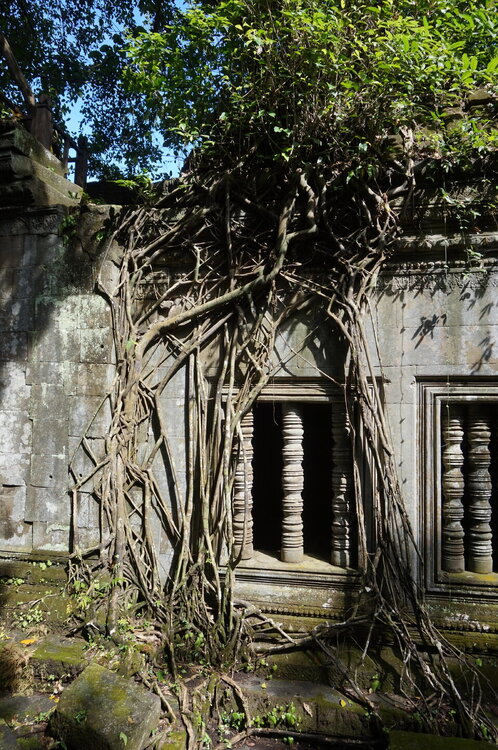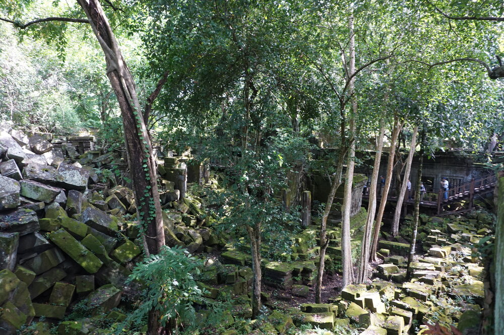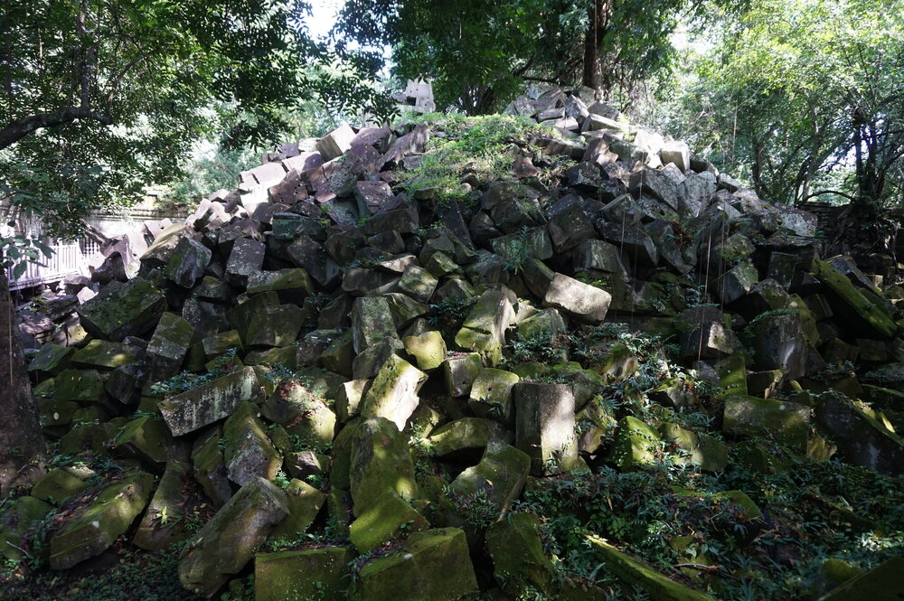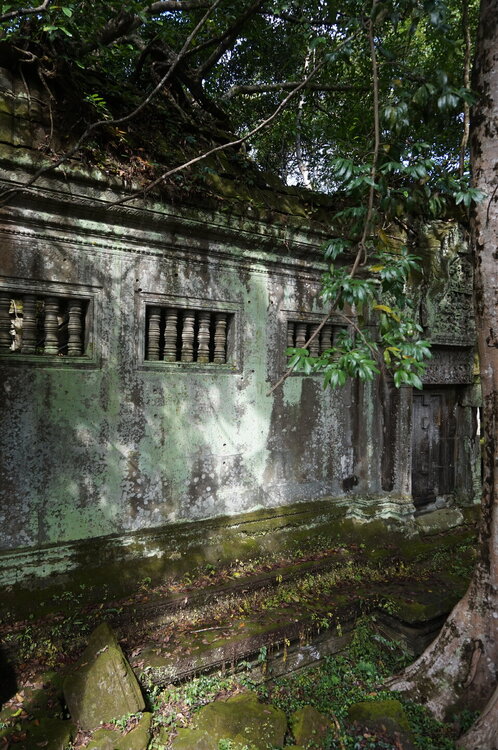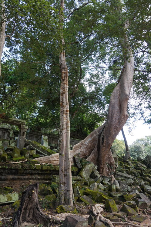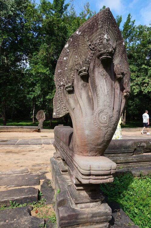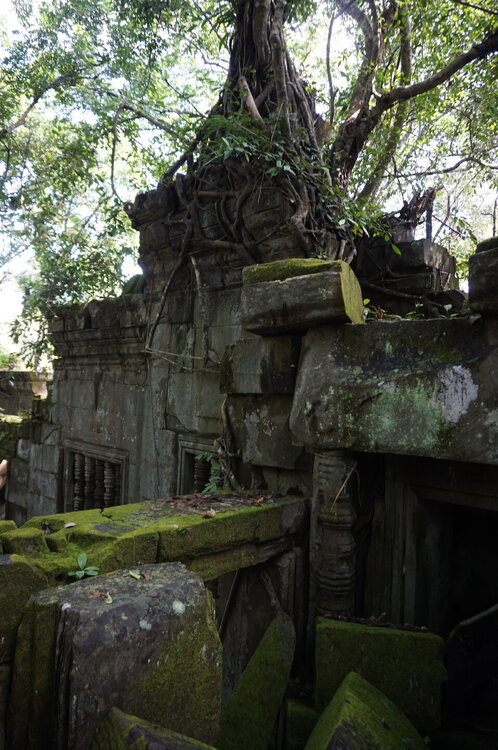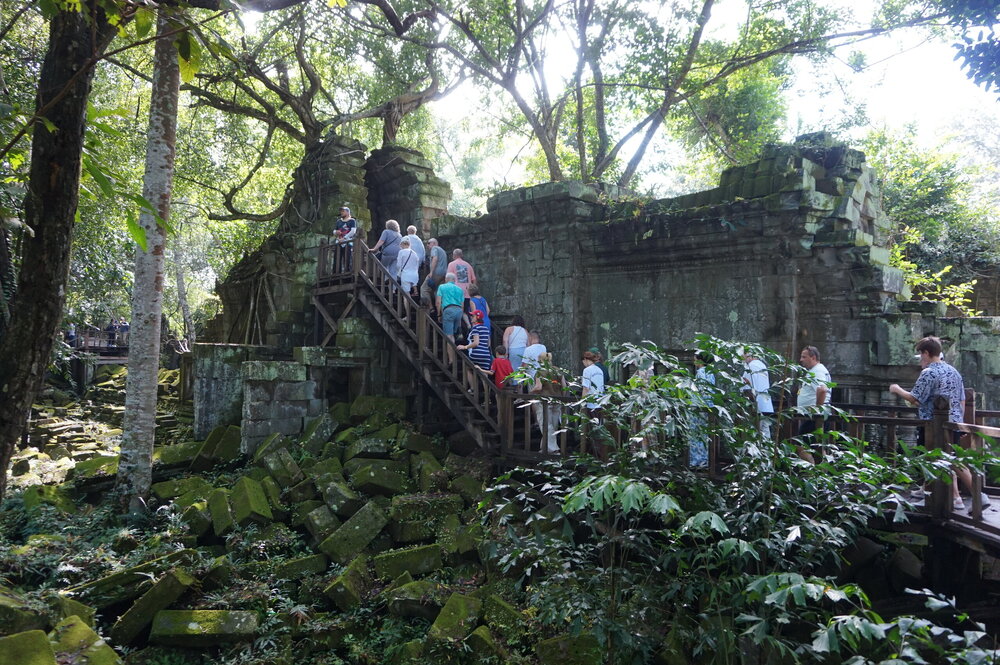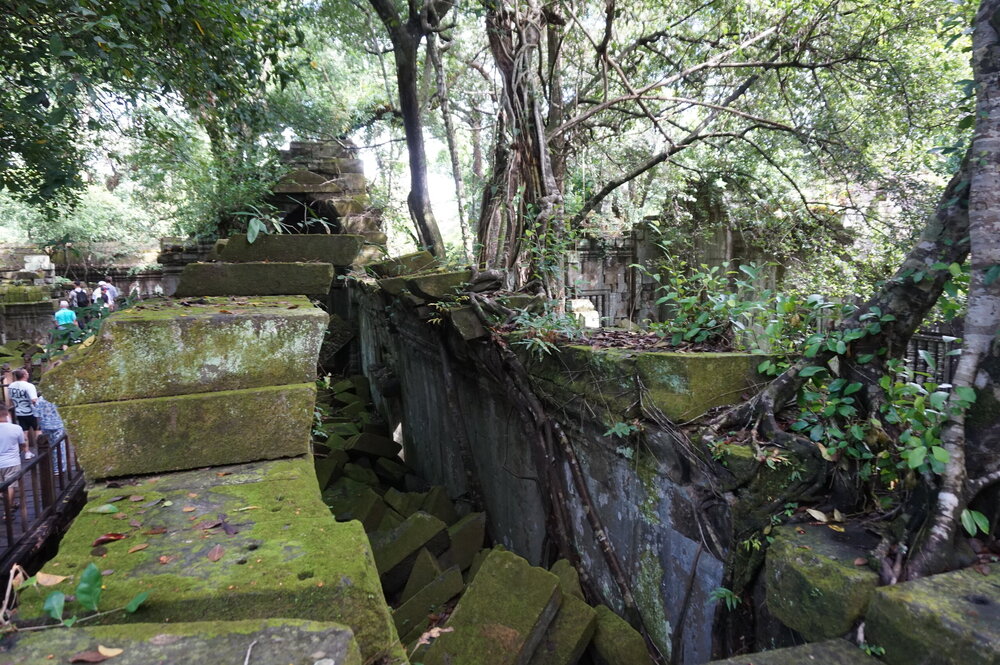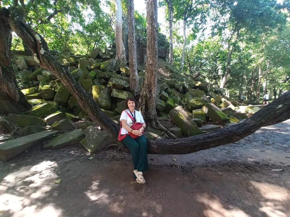День 8. Храмы Большого круга Ангкора. Озеро Тонлесап. Продолжаем знакомиться с храмами Камбоджи. И первый на сегодня- Бенг Мелеа, что в переводе- озеро лотосов. Уже на подступах нас встречают наги-охранники, большущие семиглавые змеи, тела которых образуют балюстрады, окаймляющие по обе стороны дорогу, ведущую ко входу в храм. Наги отлично сохранились. А дальше- первая мысль- какой же это храм, просто большая груда камней. Обнаружен храм совсем недавно-в 1990 г, а разминирован и открыт для туристов только в 2007г. С 1992 года Бенг Мелеа находится в листе ожидания на включение этого объекта в лист Всемирного наследия ЮНЕСКО. Территория расчищена от зарослей, но сам храм не восстанавливался, в чем и состоит его особая прелесть. И в этом храме мы были одни- только наша группа, и можно почувствовать себя первооткрывателями. В некоторых местах проложены мостки для туристов, идём за гидом, но как же хотелось полазить по этим развалинам, заглянуть в места, которые плохо видно с мостков. История храма неизвестна, и дата постройки тоже. Предположительно начало 12 века, т к архитектура схожа с Ангкор Ватом. Возможно, когда Бенг Мелиа будет восстанавливаться, найдутся и камни с надписями, которые прольют свет на историю этого города. Считается, что Бенг Мелиа был посвящен Вишну, однако в декоре присутствуют как индуистские, так и буддистские мотивы. Очень сложно представить структуру храма, может быть я не очень внимательно слушала Александра, но руины очень живописны и впечатляют не меньше Анкора. Камни покрыты мхом, только кончился сезон дождей, и поэтому цвет такой яркий, изумрудный. Известно, что здесь бывал известный английский писатель Редъярд Киплинг. По слухам, именно Бенг Мелиа послужил прообразом «Заброшенного города» из истории о Маугли. На осмотр храма у нас было около полутора часов, немного, но мы едем дальше.