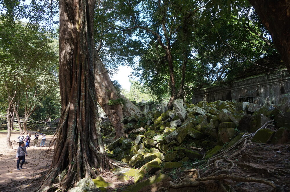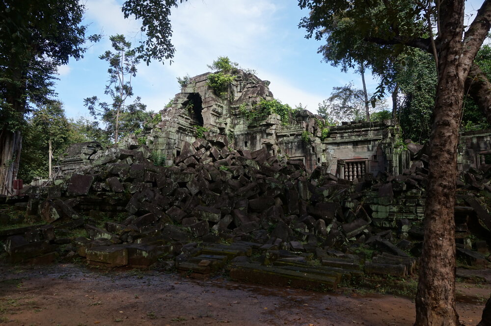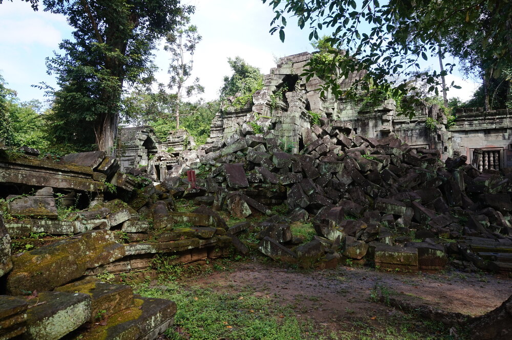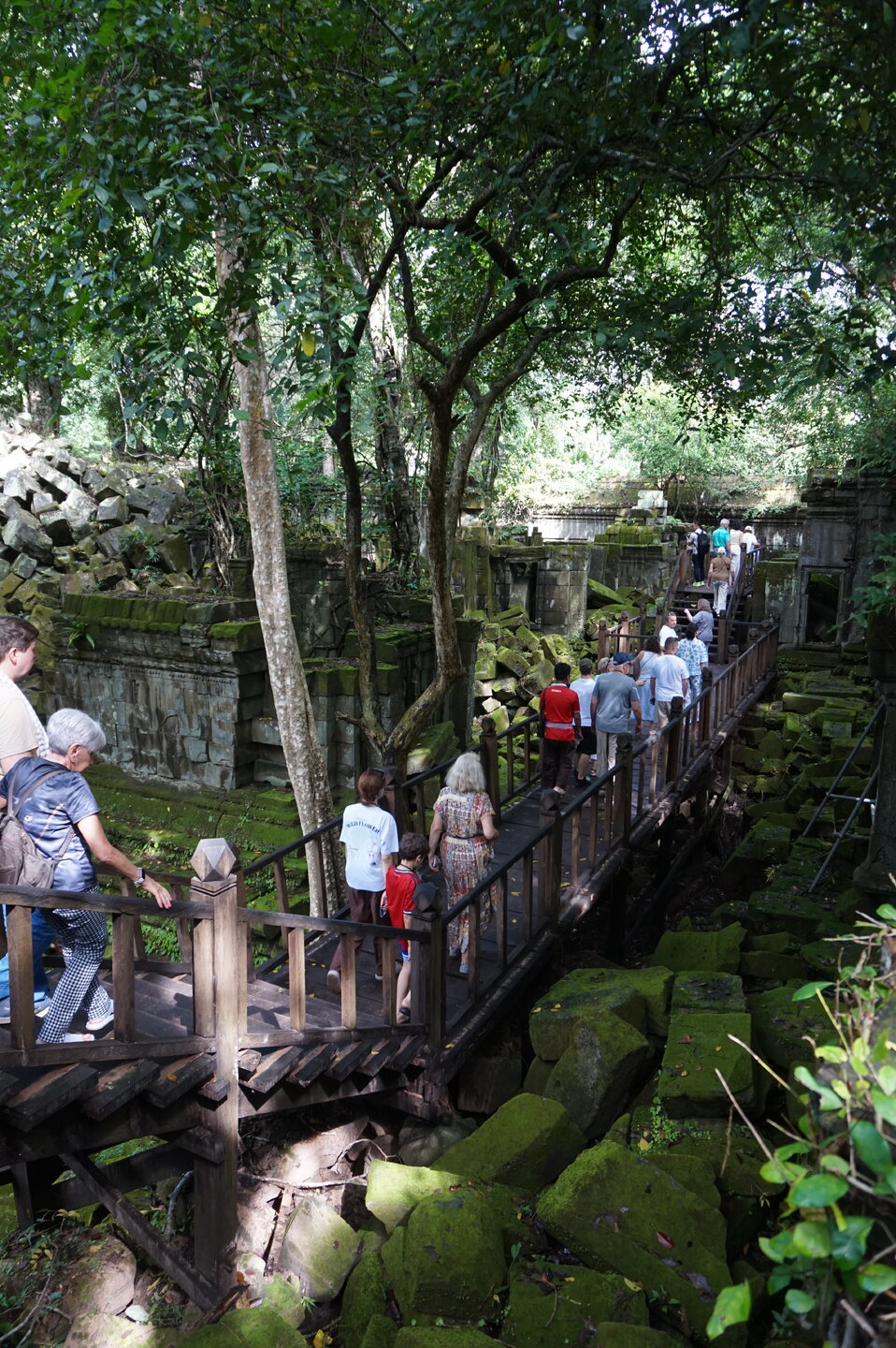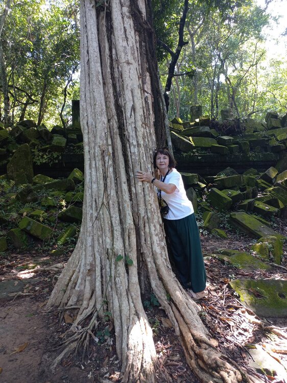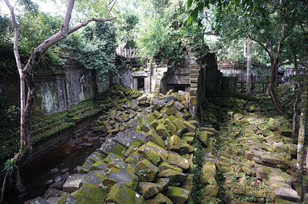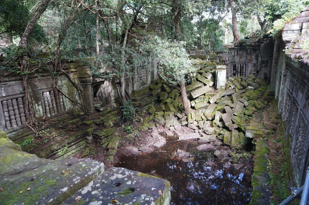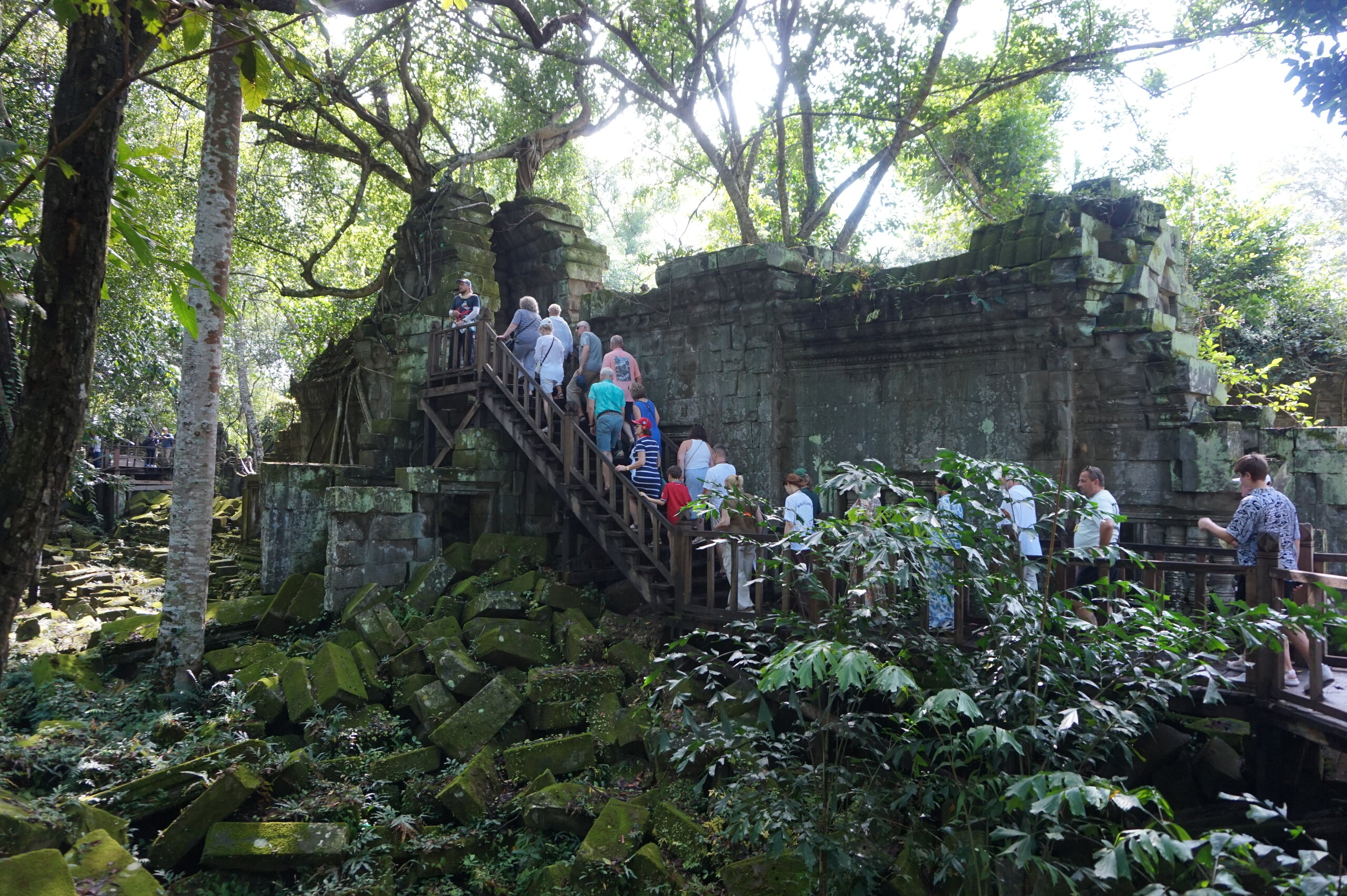 День 8. Храмы Большого круга Ангкора. Озеро Тонлесап. Продолжаем знакомиться с храмами Камбоджи. И первый на сегодня- Бенг Мелеа, что в переводе- озеро лотосов. Уже на подступах нас встречают наги-охранники, большущие семиглавые змеи, тела которых образуют балюстрады, окаймляющие по обе стороны дорогу, ведущую ко входу в храм. Наги отлично сохранились. А дальше- первая мысль- какой же это храм, просто большая груда камней. Обнаружен храм совсем недавно-в 1990 г, а разминирован и открыт для туристов только в 2007г. С 1992 года Бенг Мелеа находится в листе ожидания на включение этого объекта в лист Всемирного наследия ЮНЕСКО. Территория расчищена от зарослей, но сам храм не восстанавливался, в чем и состоит его особая прелесть. И в этом храме мы были одни- только наша группа, и можно почувствовать себя первооткрывателями. В некоторых местах проложены мостки для туристов, идём за гидом, но как же хотелось полазить по этим развалинам, заглянуть в места, которые плохо видно с мостков. История храма неизвестна, и дата постройки тоже. Предположительно начало 12 века, т к архитектура схожа с Ангкор Ватом. Возможно, когда Бенг Мелиа будет восстанавливаться, найдутся и камни с надписями, которые прольют свет на историю этого города. Считается, что Бенг Мелиа был посвящен Вишну, однако в декоре присутствуют как индуистские, так и буддистские мотивы. Очень сложно представить структуру храма, может быть я не очень внимательно слушала Александра, но руины очень живописны и впечатляют не меньше Анкора. Камни покрыты мхом, только кончился сезон дождей, и поэтому цвет такой яркий, изумрудный. Известно, что здесь бывал известный английский писатель Редъярд Киплинг. По слухам, именно Бенг Мелиа послужил прообразом «Заброшенного города» из истории о Маугли. На осмотр храма у нас было около полутора часов, немного, но мы едем дальше.