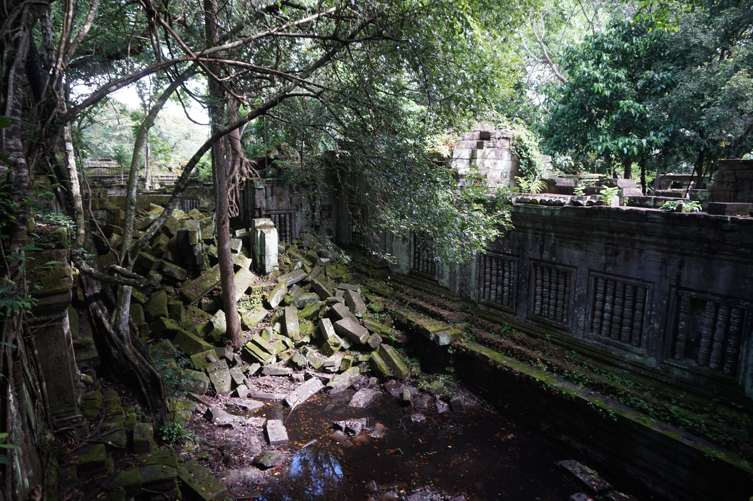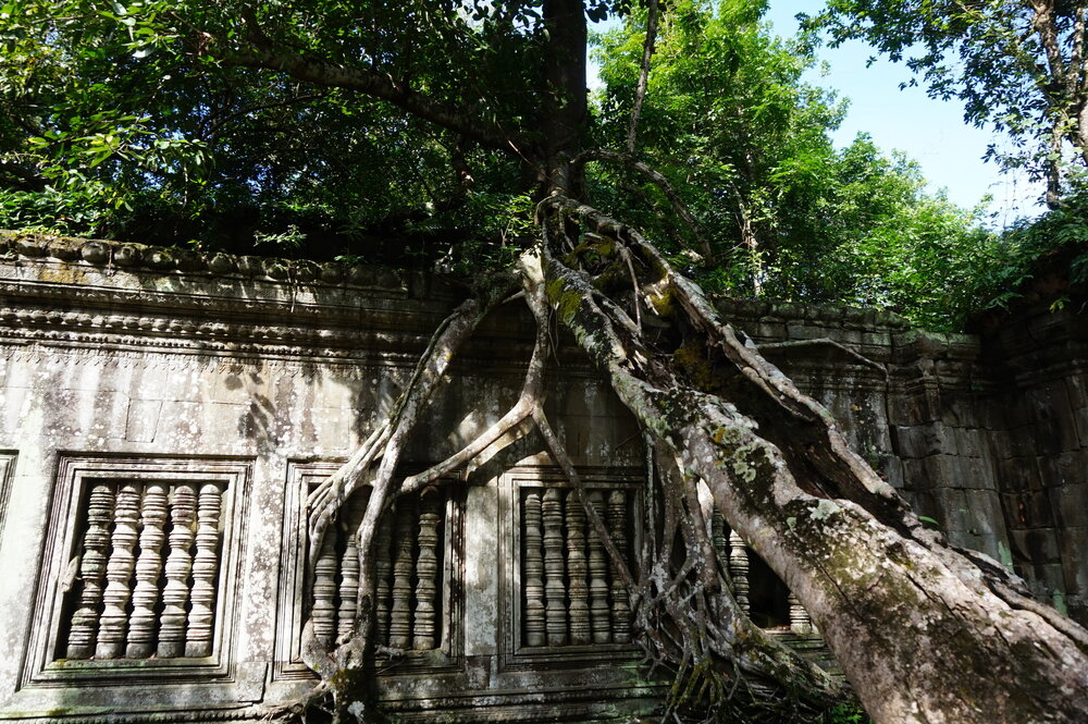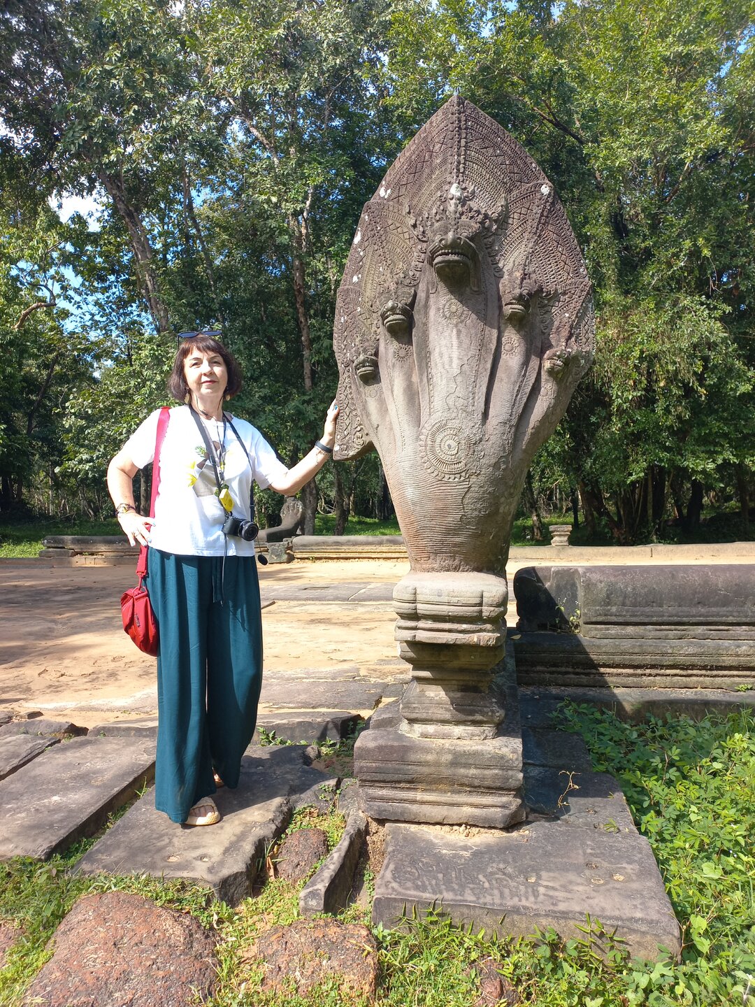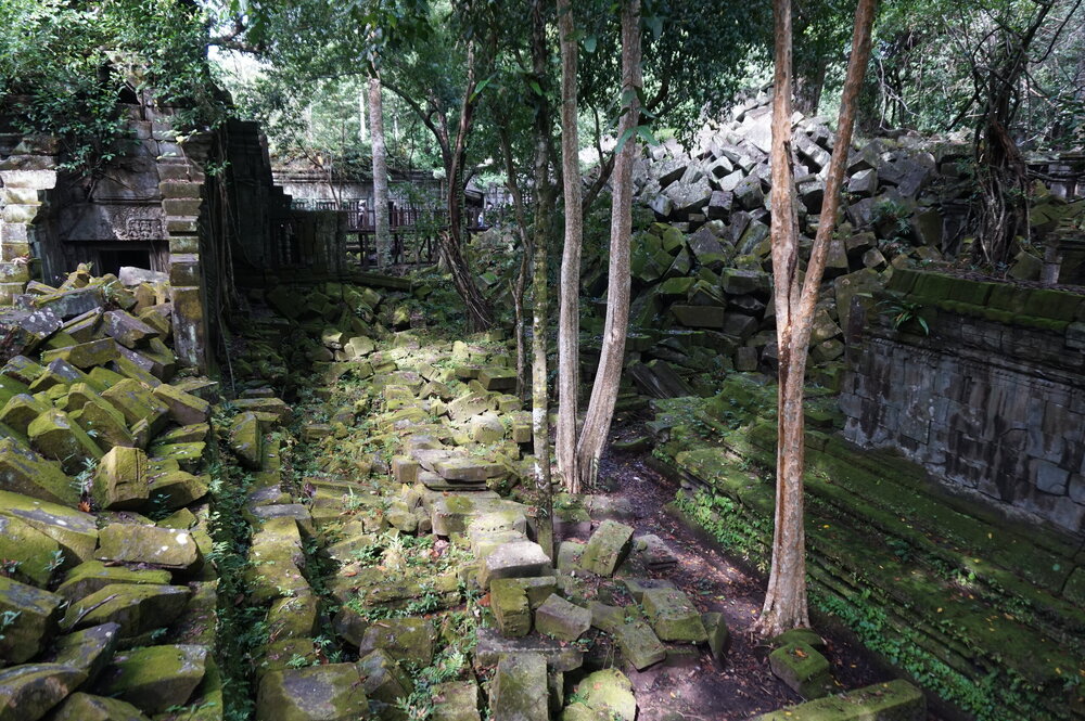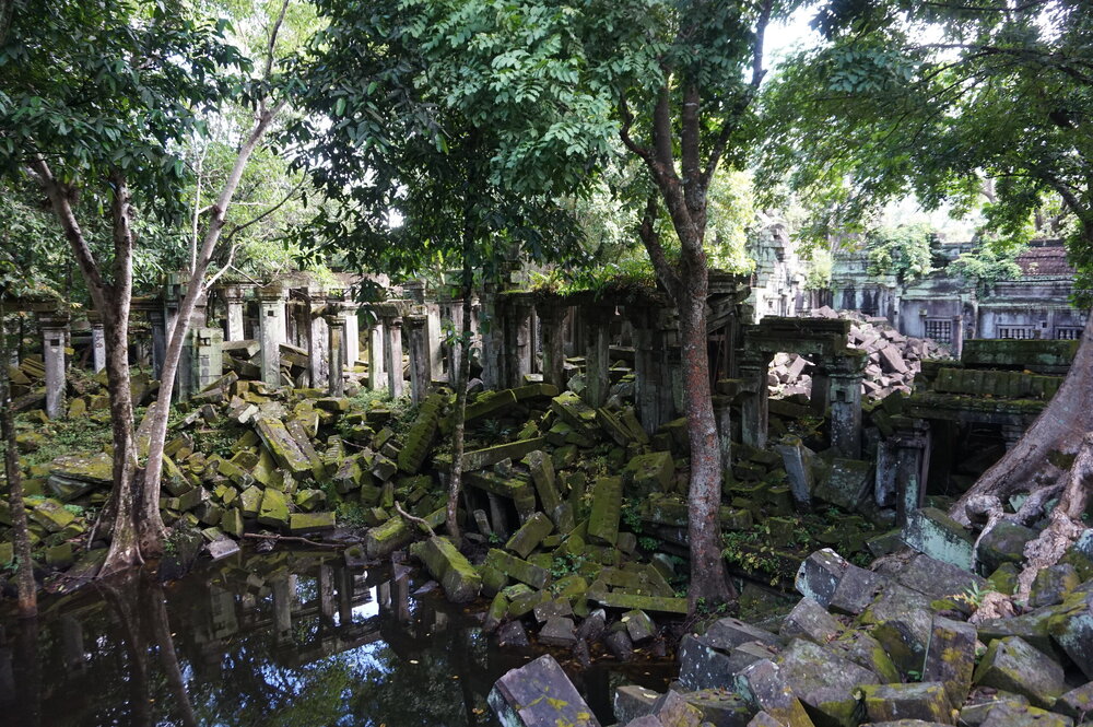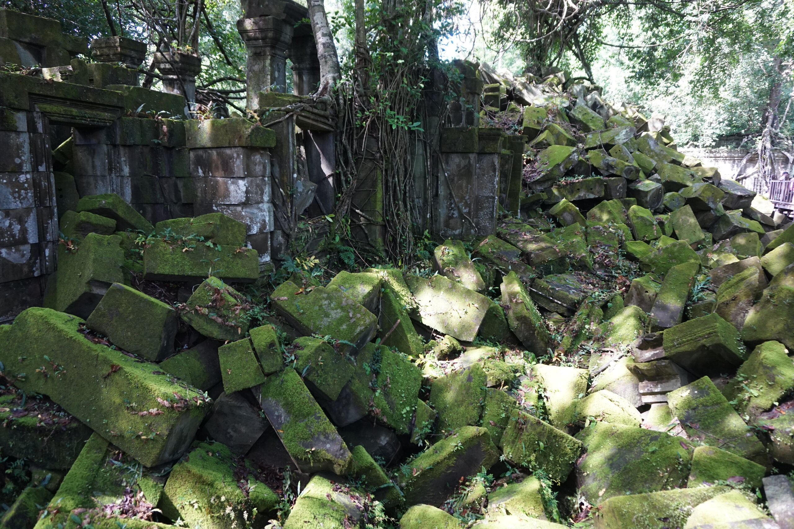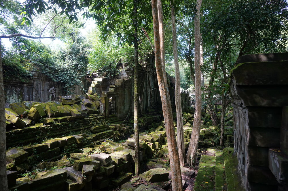 День 8. Храмы Большого круга Ангкора. Озеро Тонлесап. Продолжаем знакомиться с храмами Камбоджи. И первый на сегодня- Бенг Мелеа, что в переводе- озеро лотосов. Уже на подступах нас встречают наги-охранники, большущие семиглавые змеи, тела которых образуют балюстрады, окаймляющие по обе стороны дорогу, ведущую ко входу в храм. Наги отлично сохранились. А дальше- первая мысль- какой же это храм, просто большая груда камней. Обнаружен храм совсем недавно-в 1990 г, а разминирован и открыт для туристов только в 2007г. С 1992 года Бенг Мелеа находится в листе ожидания на включение этого объекта в лист Всемирного наследия ЮНЕСКО. Территория расчищена от зарослей, но сам храм не восстанавливался, в чем и состоит его особая прелесть. И в этом храме мы были одни- только наша группа, и можно почувствовать себя первооткрывателями. В некоторых местах проложены мостки для туристов, идём за гидом, но как же хотелось полазить по этим развалинам, заглянуть в места, которые плохо видно с мостков. История храма неизвестна, и дата постройки тоже. Предположительно начало 12 века, т к архитектура схожа с Ангкор Ватом. Возможно, когда Бенг Мелиа будет восстанавливаться, найдутся и камни с надписями, которые прольют свет на историю этого города. Считается, что Бенг Мелиа был посвящен Вишну, однако в декоре присутствуют как индуистские, так и буддистские мотивы. Очень сложно представить структуру храма, может быть я не очень внимательно слушала Александра, но руины очень живописны и впечатляют не меньше Анкора. Камни покрыты мхом, только кончился сезон дождей, и поэтому цвет такой яркий, изумрудный. Известно, что здесь бывал известный английский писатель Редъярд Киплинг. По слухам, именно Бенг Мелиа послужил прообразом «Заброшенного города» из истории о Маугли. На осмотр храма у нас было около полутора часов, немного, но мы едем дальше.