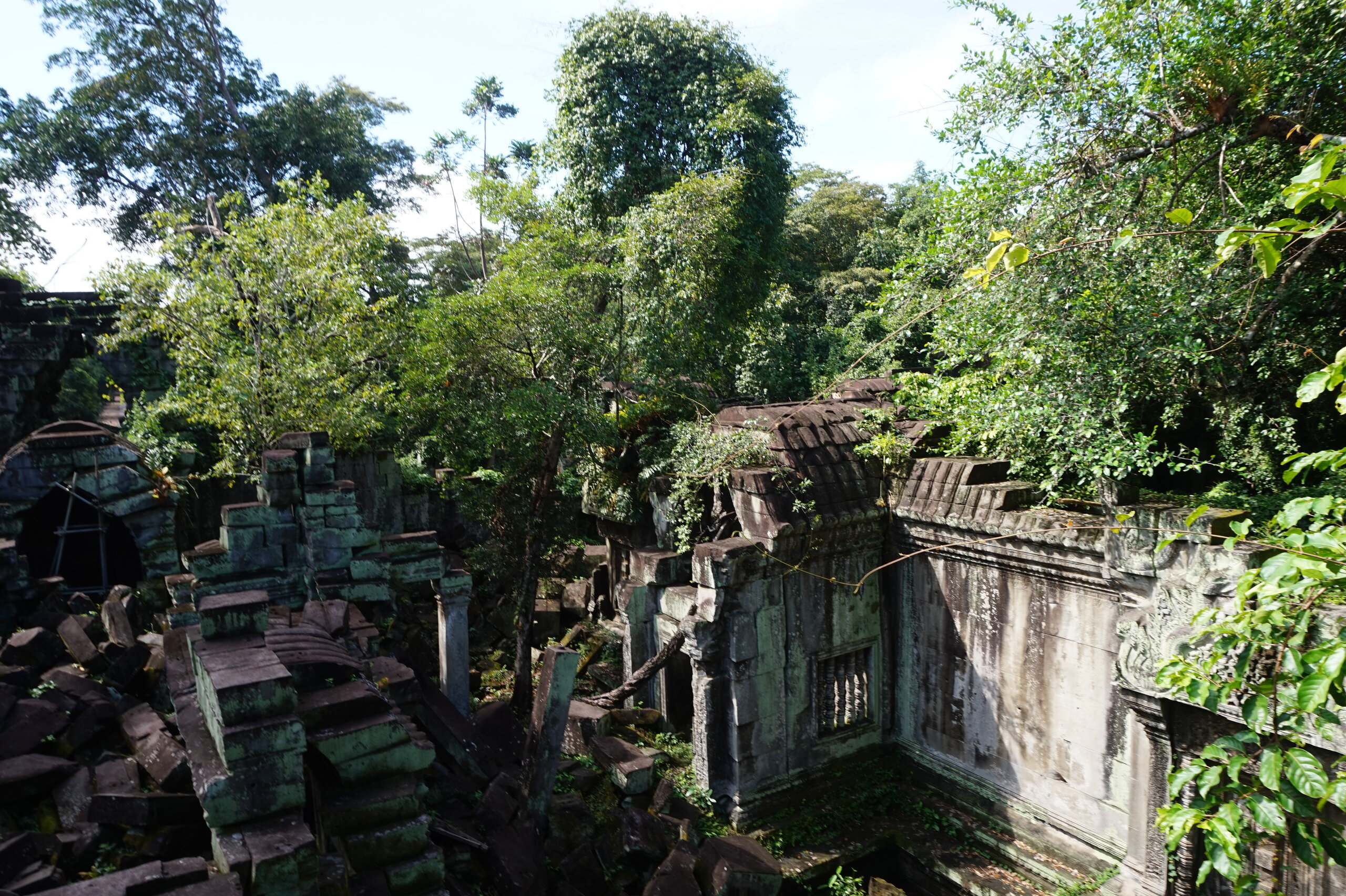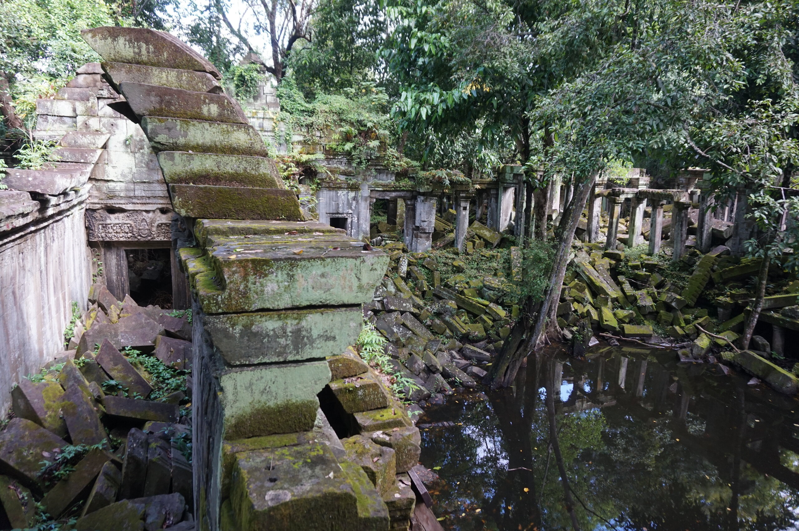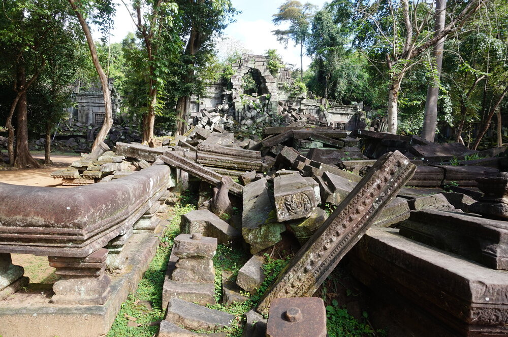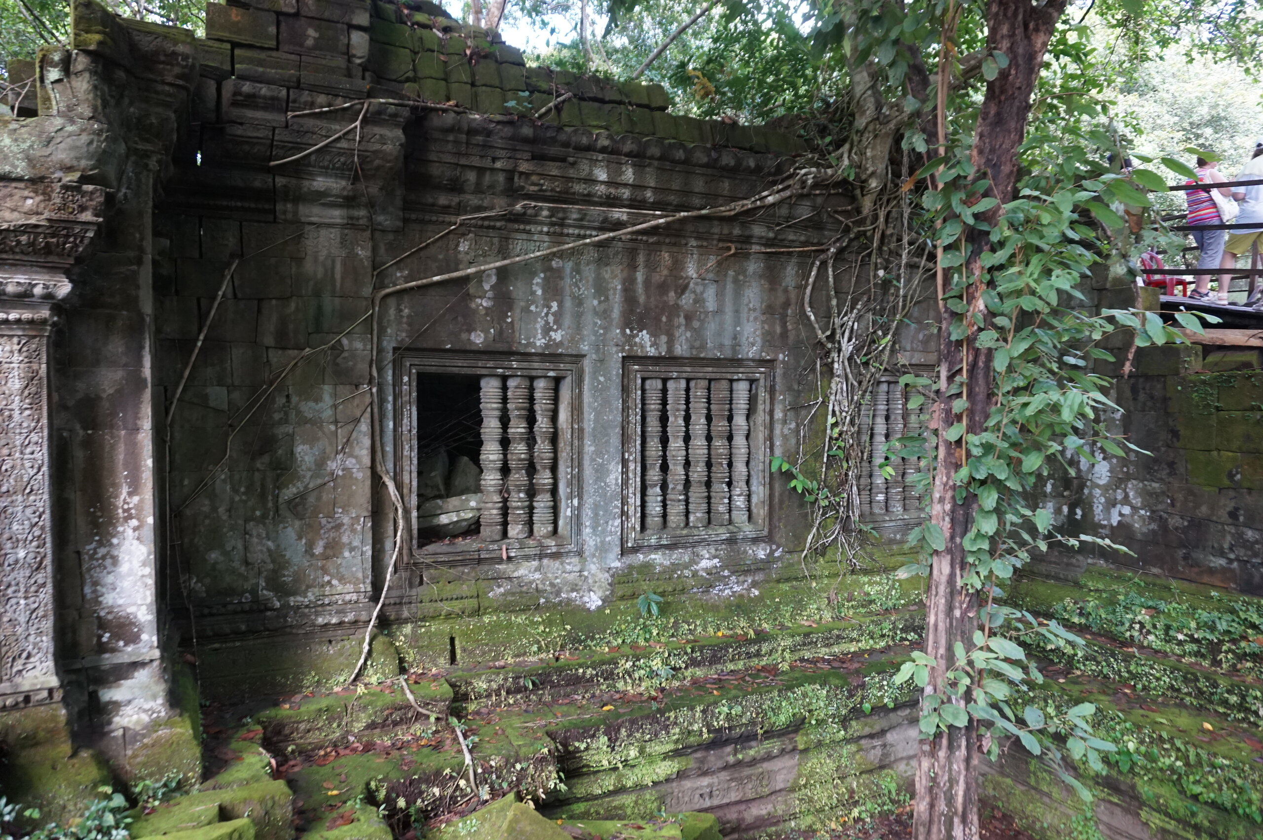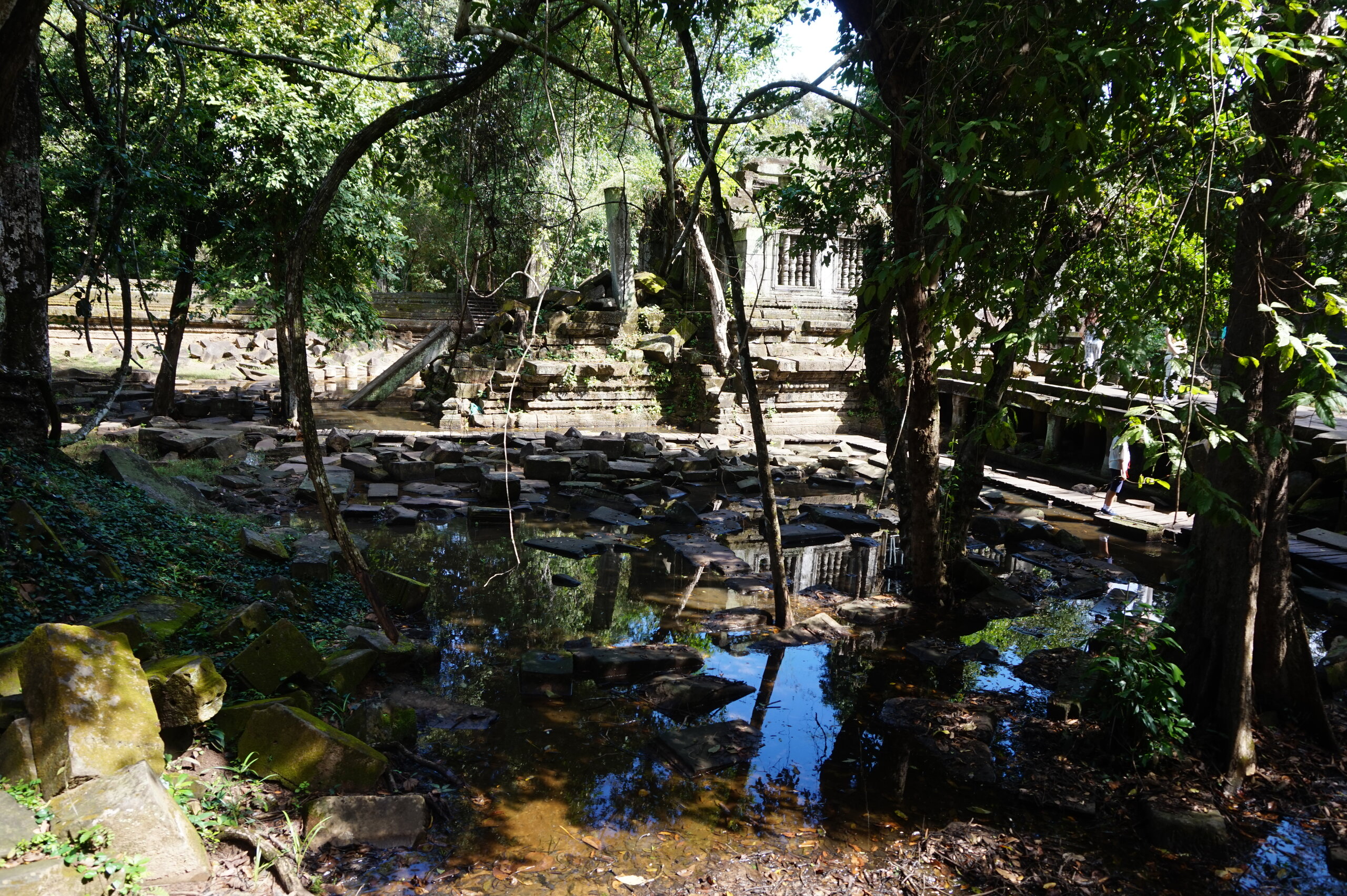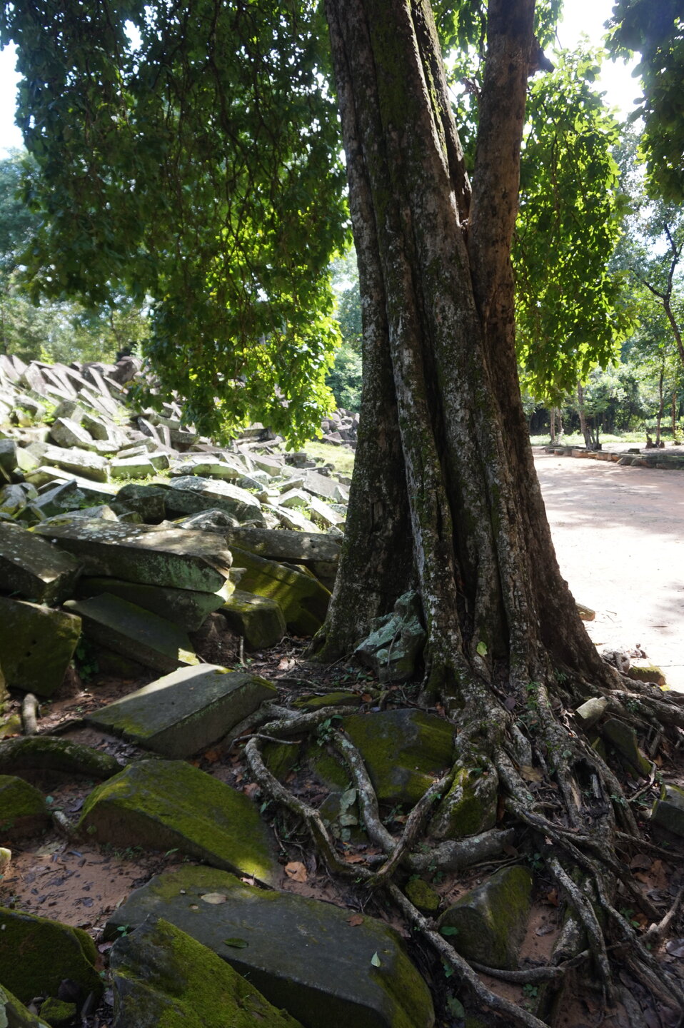 День 8. Храмы Большого круга Ангкора. Озеро Тонлесап. Продолжаем знакомиться с храмами Камбоджи. И первый на сегодня- Бенг Мелеа, что в переводе- озеро лотосов. Уже на подступах нас встречают наги-охранники, большущие семиглавые змеи, тела которых образуют балюстрады, окаймляющие по обе стороны дорогу, ведущую ко входу в храм. Наги отлично сохранились. А дальше- первая мысль- какой же это храм, просто большая груда камней. Обнаружен храм совсем недавно-в 1990 г, а разминирован и открыт для туристов только в 2007г. С 1992 года Бенг Мелеа находится в листе ожидания на включение этого объекта в лист Всемирного наследия ЮНЕСКО. Территория расчищена от зарослей, но сам храм не восстанавливался, в чем и состоит его особая прелесть. И в этом храме мы были одни- только наша группа, и можно почувствовать себя первооткрывателями. В некоторых местах проложены мостки для туристов, идём за гидом, но как же хотелось полазить по этим развалинам, заглянуть в места, которые плохо видно с мостков. История храма неизвестна, и дата постройки тоже. Предположительно начало 12 века, т к архитектура схожа с Ангкор Ватом. Возможно, когда Бенг Мелиа будет восстанавливаться, найдутся и камни с надписями, которые прольют свет на историю этого города. Считается, что Бенг Мелиа был посвящен Вишну, однако в декоре присутствуют как индуистские, так и буддистские мотивы. Очень сложно представить структуру храма, может быть я не очень внимательно слушала Александра, но руины очень живописны и впечатляют не меньше Анкора. Камни покрыты мхом, только кончился сезон дождей, и поэтому цвет такой яркий, изумрудный. Известно, что здесь бывал известный английский писатель Редъярд Киплинг. По слухам, именно Бенг Мелиа послужил прообразом «Заброшенного города» из истории о Маугли. На осмотр храма у нас было около полутора часов, немного, но мы едем дальше.