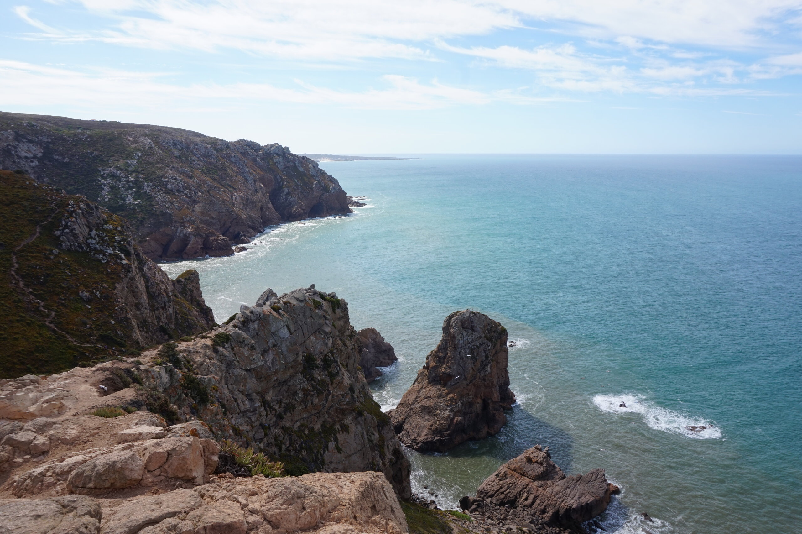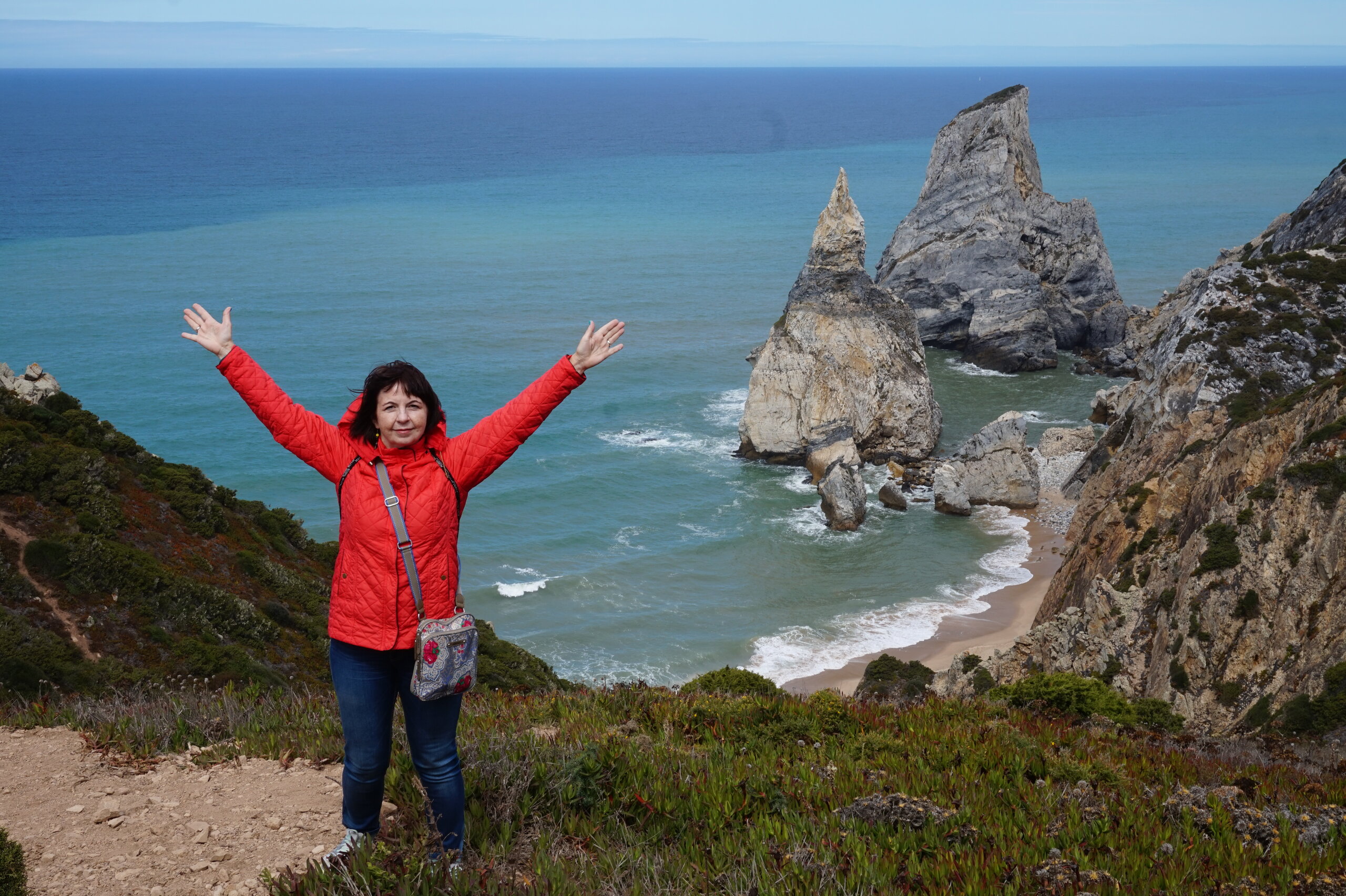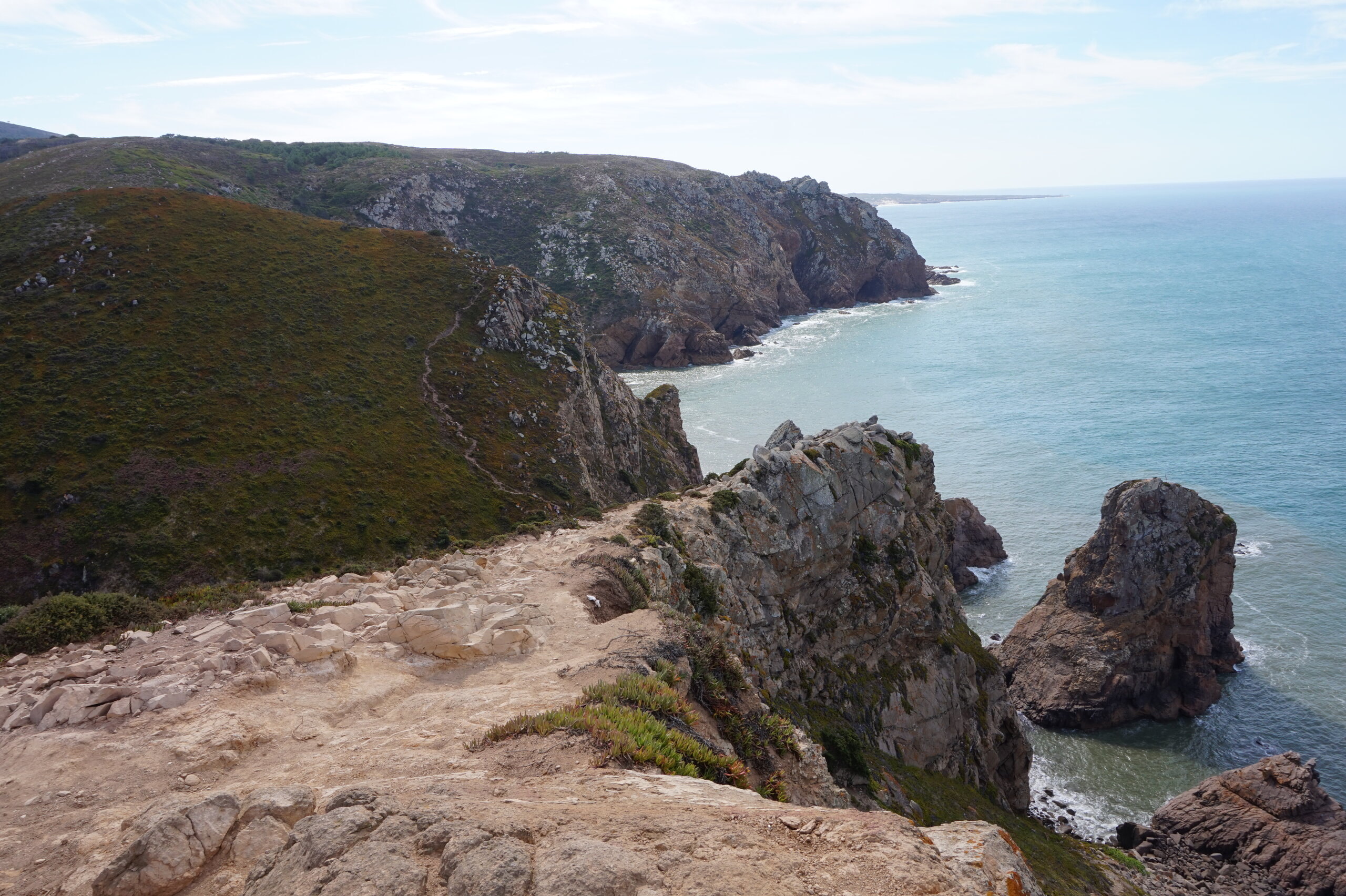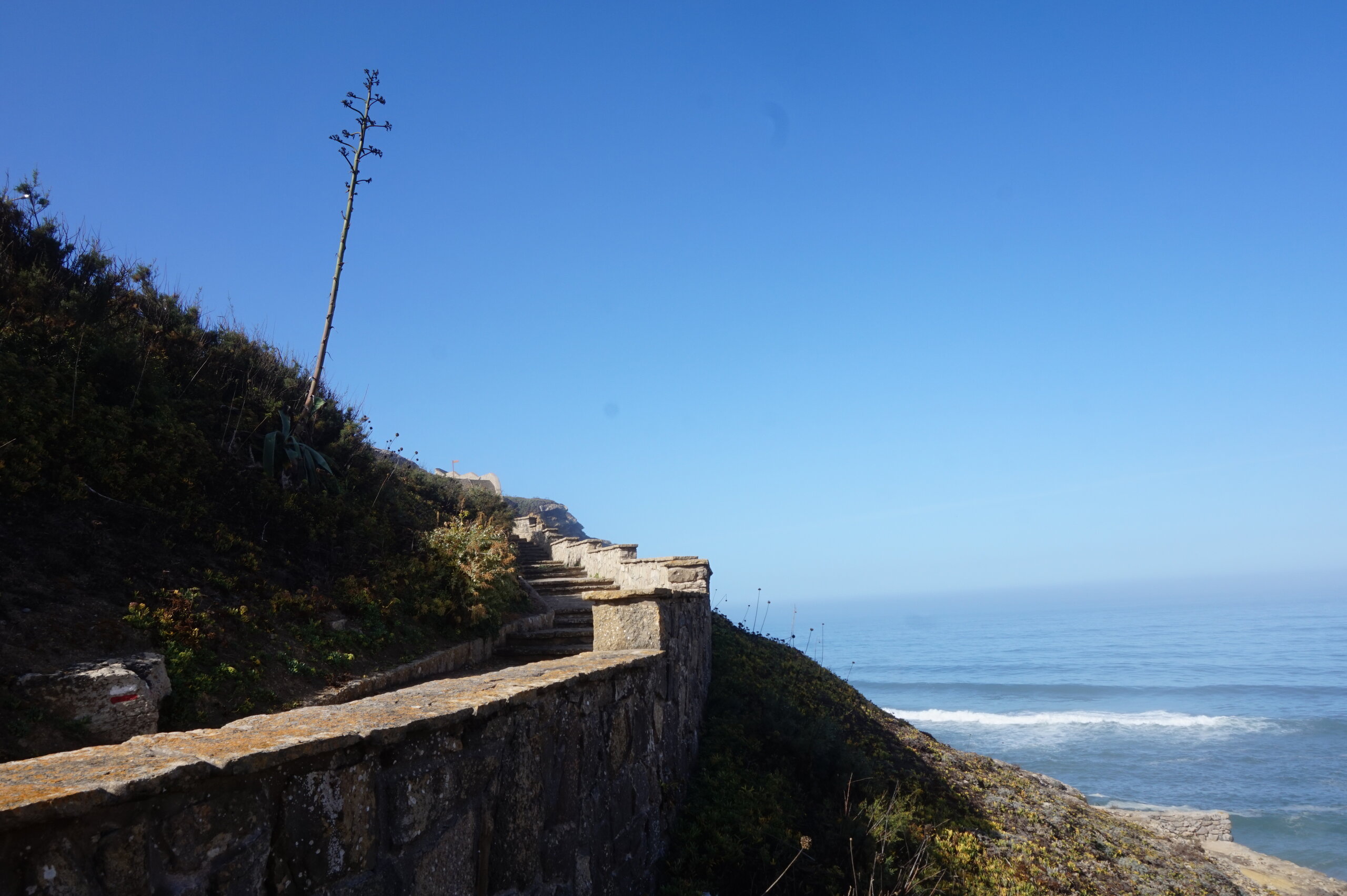 Добавлю немного фото мыса Рока. Галина подробно рассказала, но у нас был такой необыкновенный цвет океана, больше в поездке такого цвета не было. Непередаваемые ощущения, когда стоишь на краю земли. Недалеко от мыса Рока один из красивейших пляжей Португалии- пляж медведицы(прайя да урса) и мы решили до него дойти. Сначала было идти легко по тропинке, потом вот такая горка, с неё мы спутились. Вот уже и скалы пляжа вроде бы близко, но очень крутой спуск, а мы торопились ещё попасть в этот день в прекрасный замок Монсератт. И к сожалению дальше не пошли.