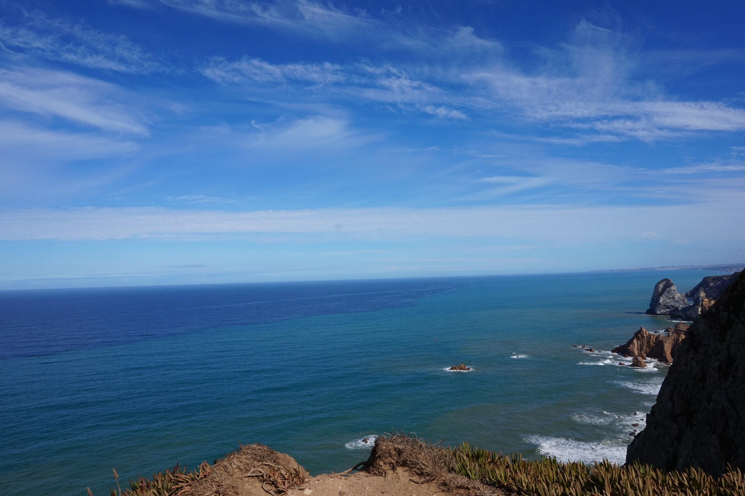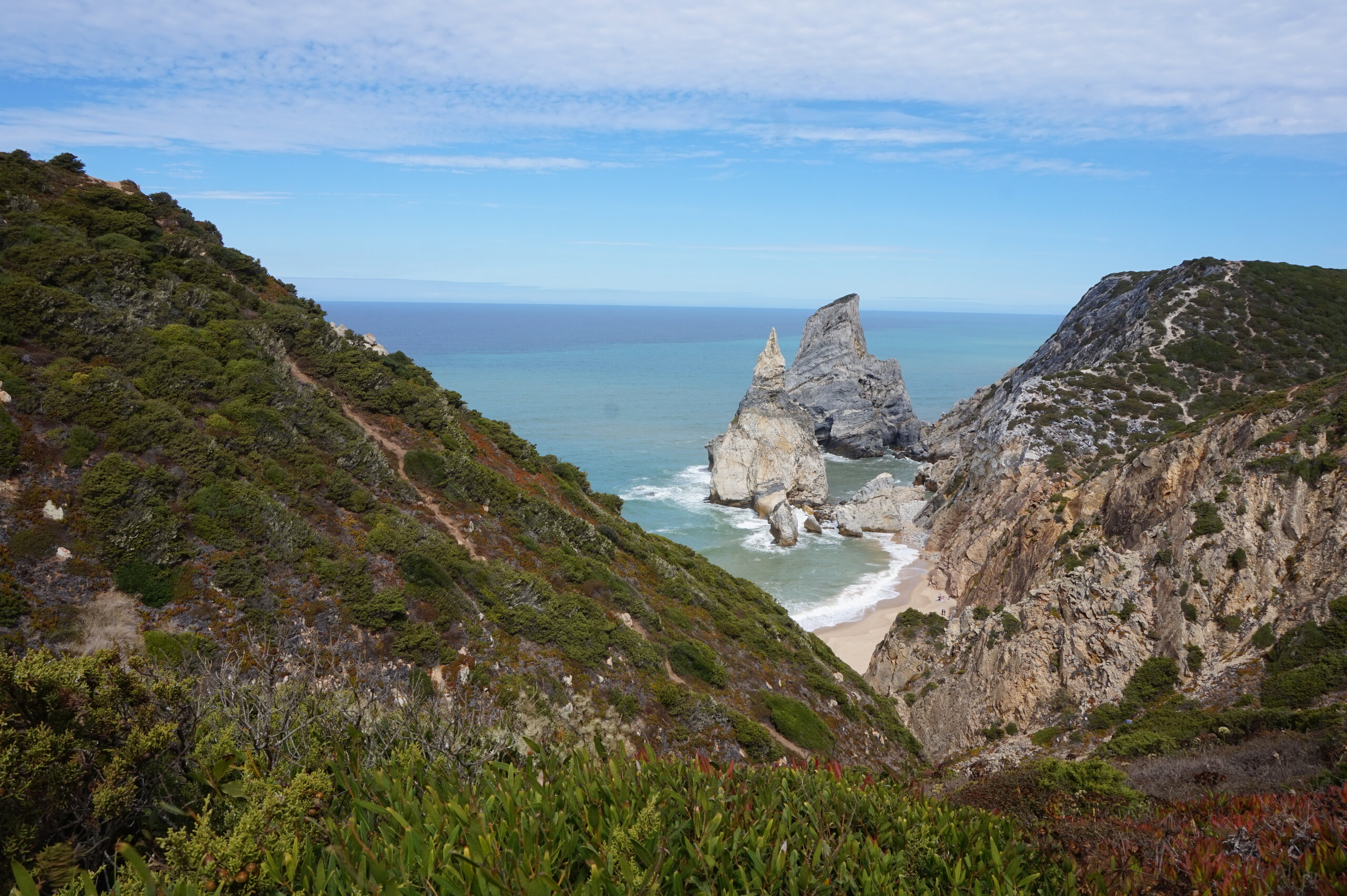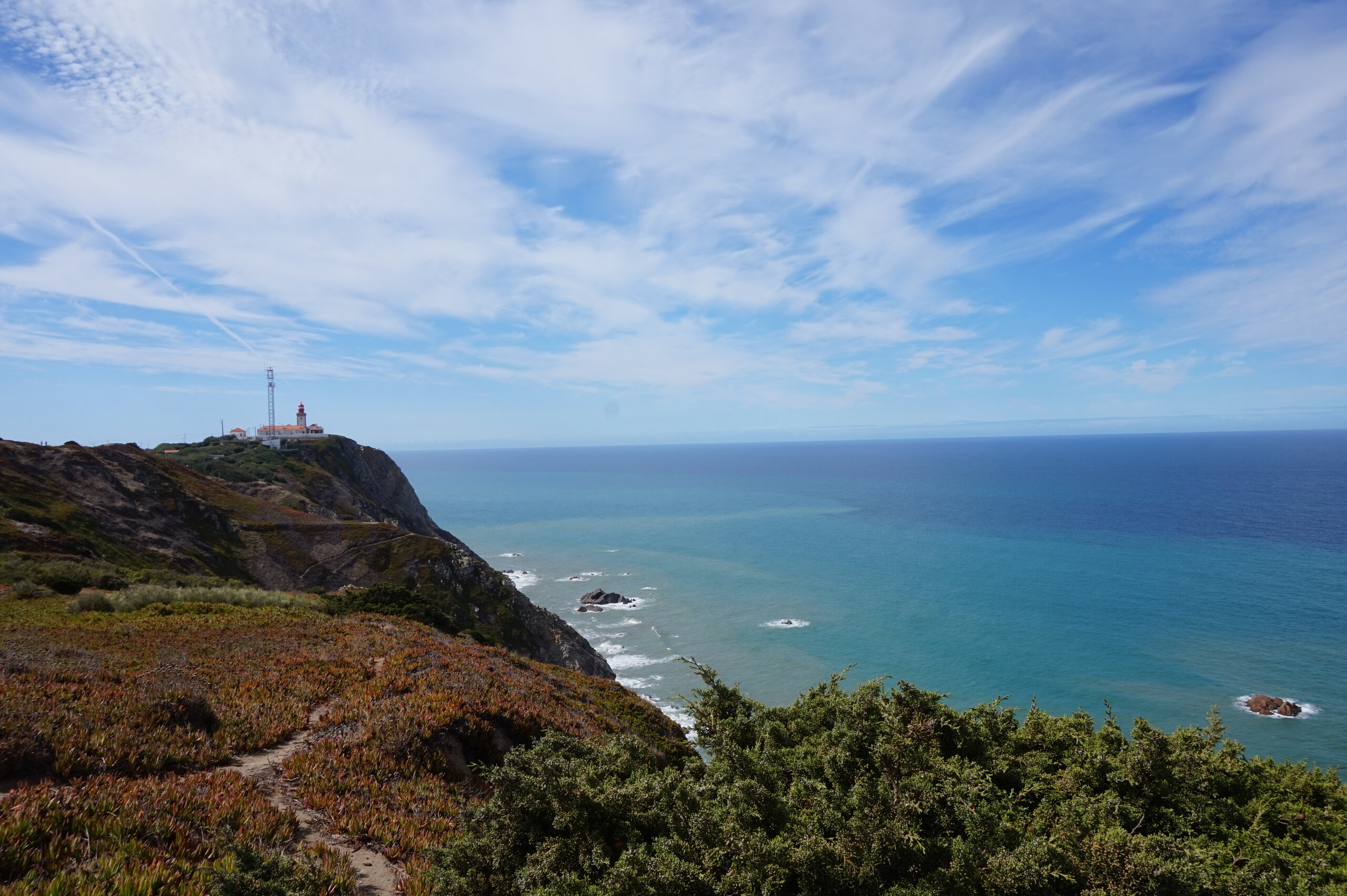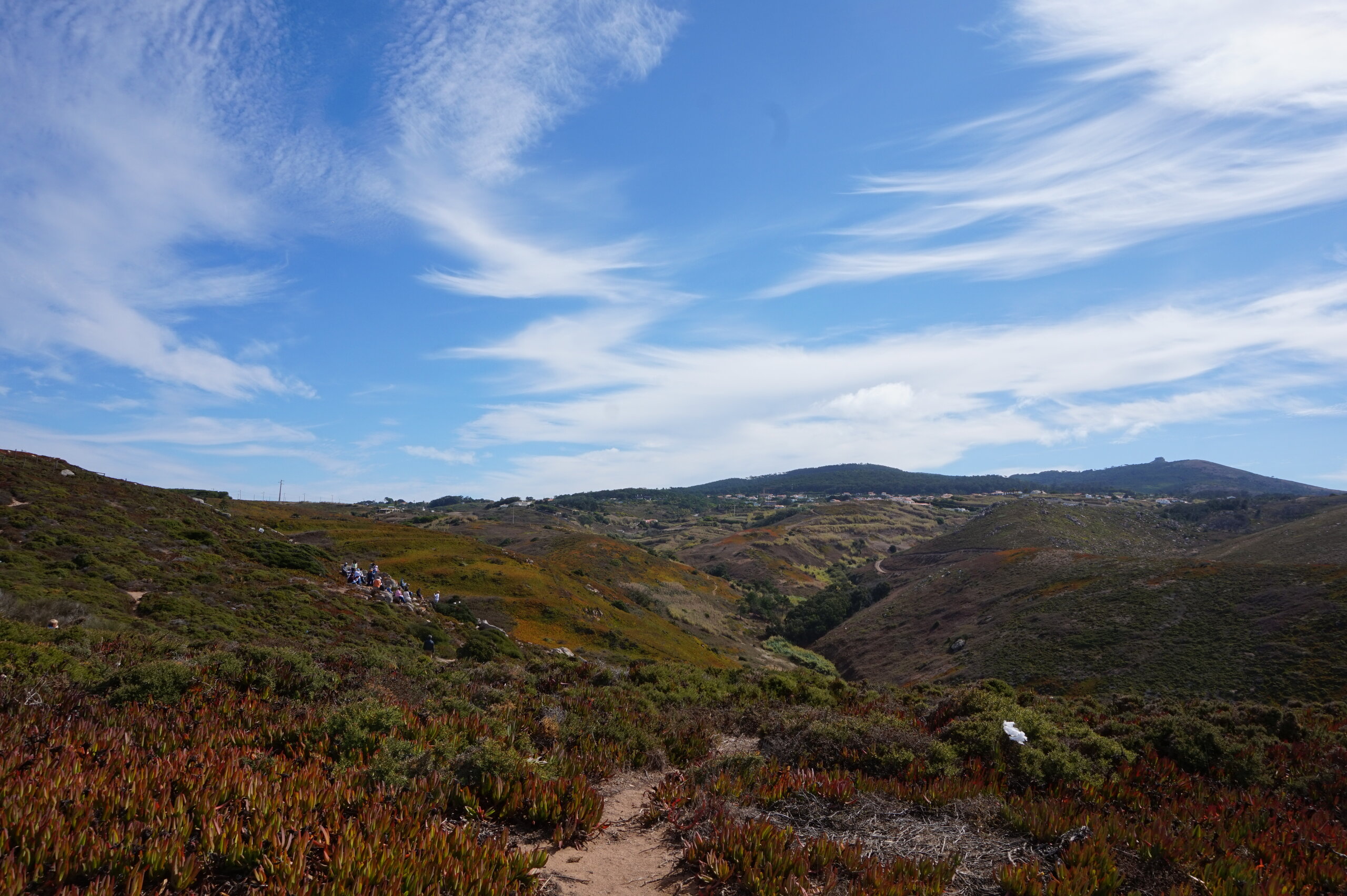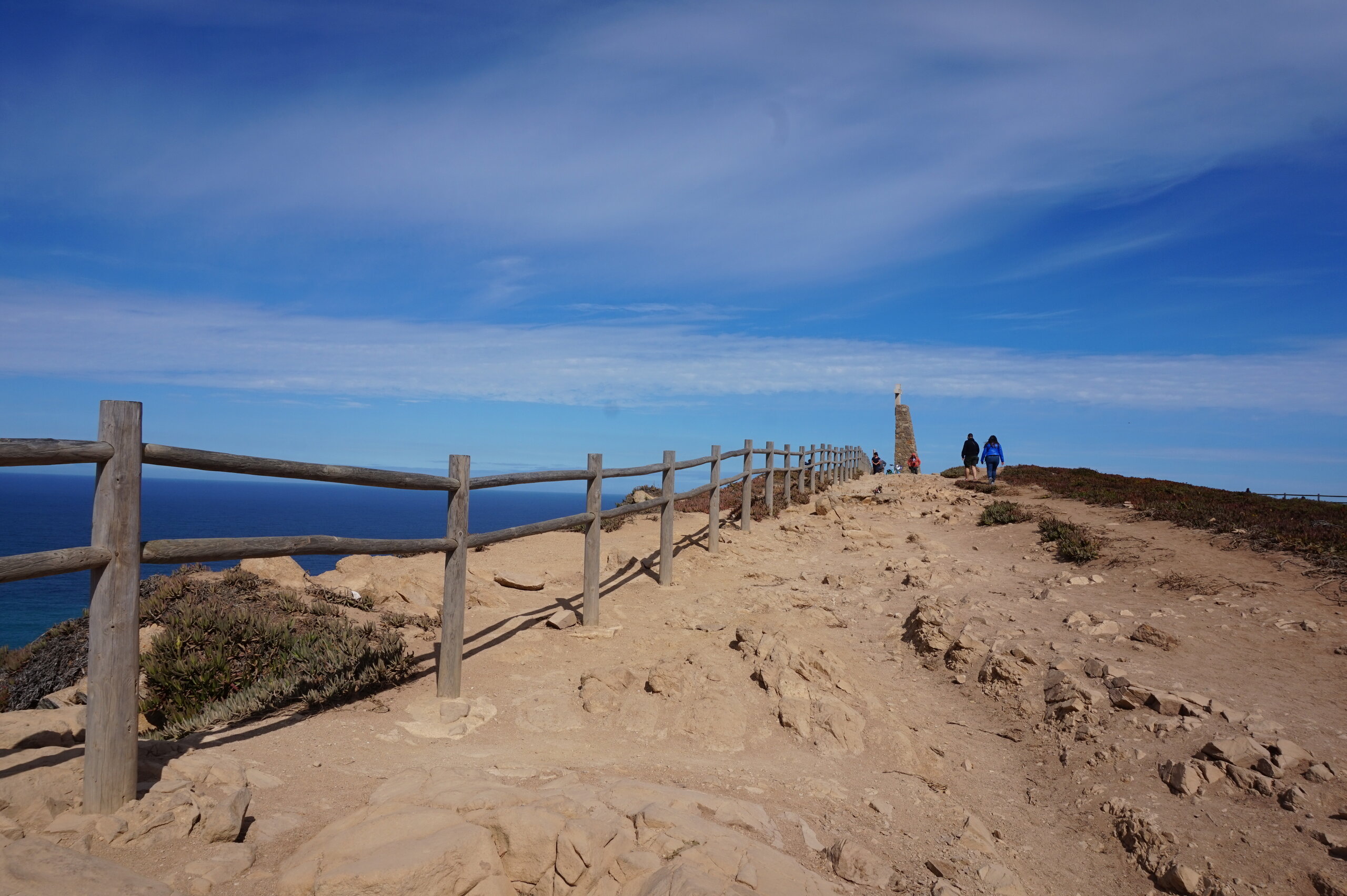 Добавлю немного фото мыса Рока. Галина подробно рассказала, но у нас был такой необыкновенный цвет океана, больше в поездке такого цвета не было. Непередаваемые ощущения, когда стоишь на краю земли. Недалеко от мыса Рока один из красивейших пляжей Португалии- пляж медведицы(прайя да урса) и мы решили до него дойти. Сначала было идти легко по тропинке, потом вот такая горка, с неё мы спутились. Вот уже и скалы пляжа вроде бы близко, но очень крутой спуск, а мы торопились ещё попасть в этот день в прекрасный замок Монсератт. И к сожалению дальше не пошли.