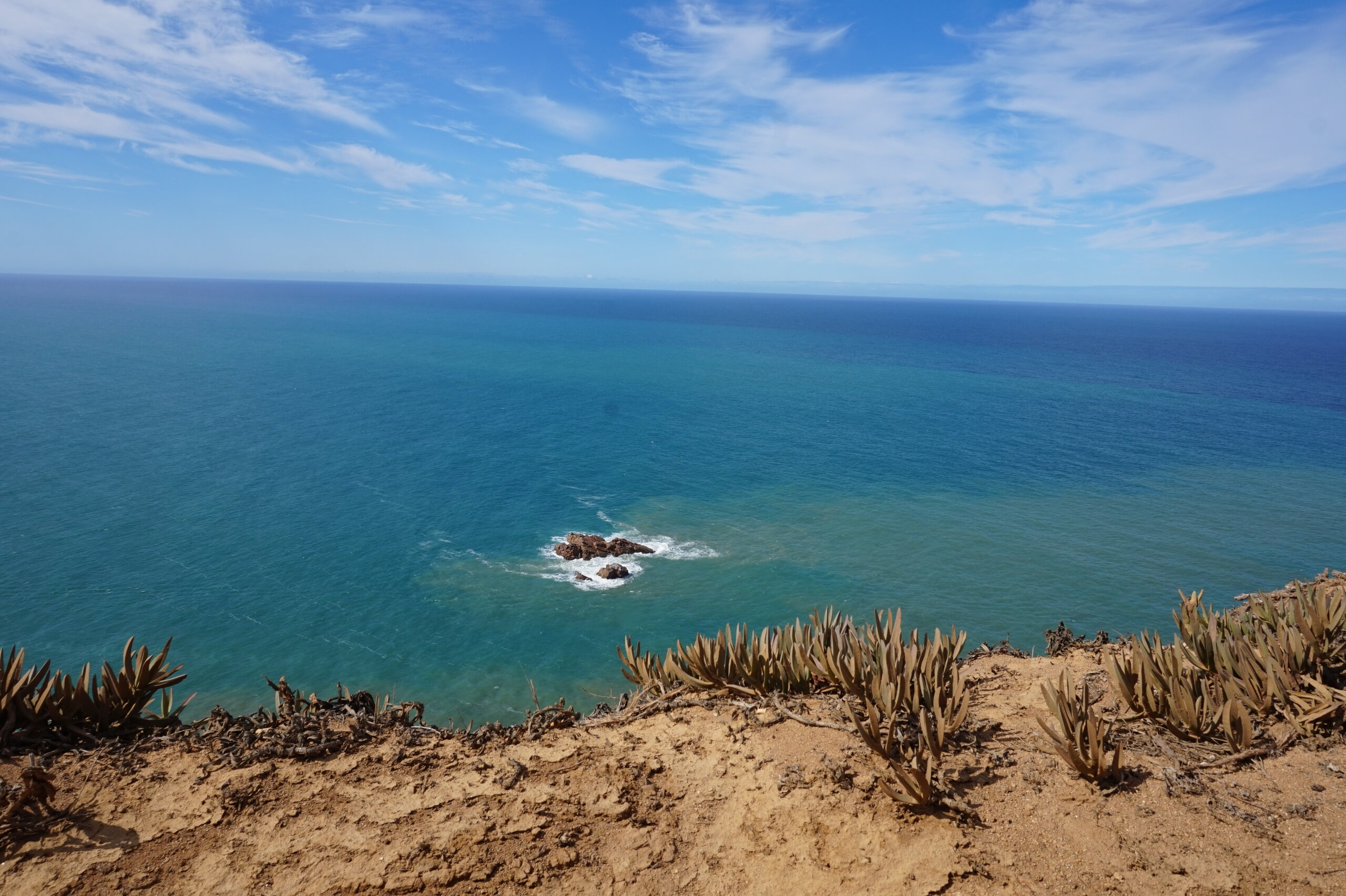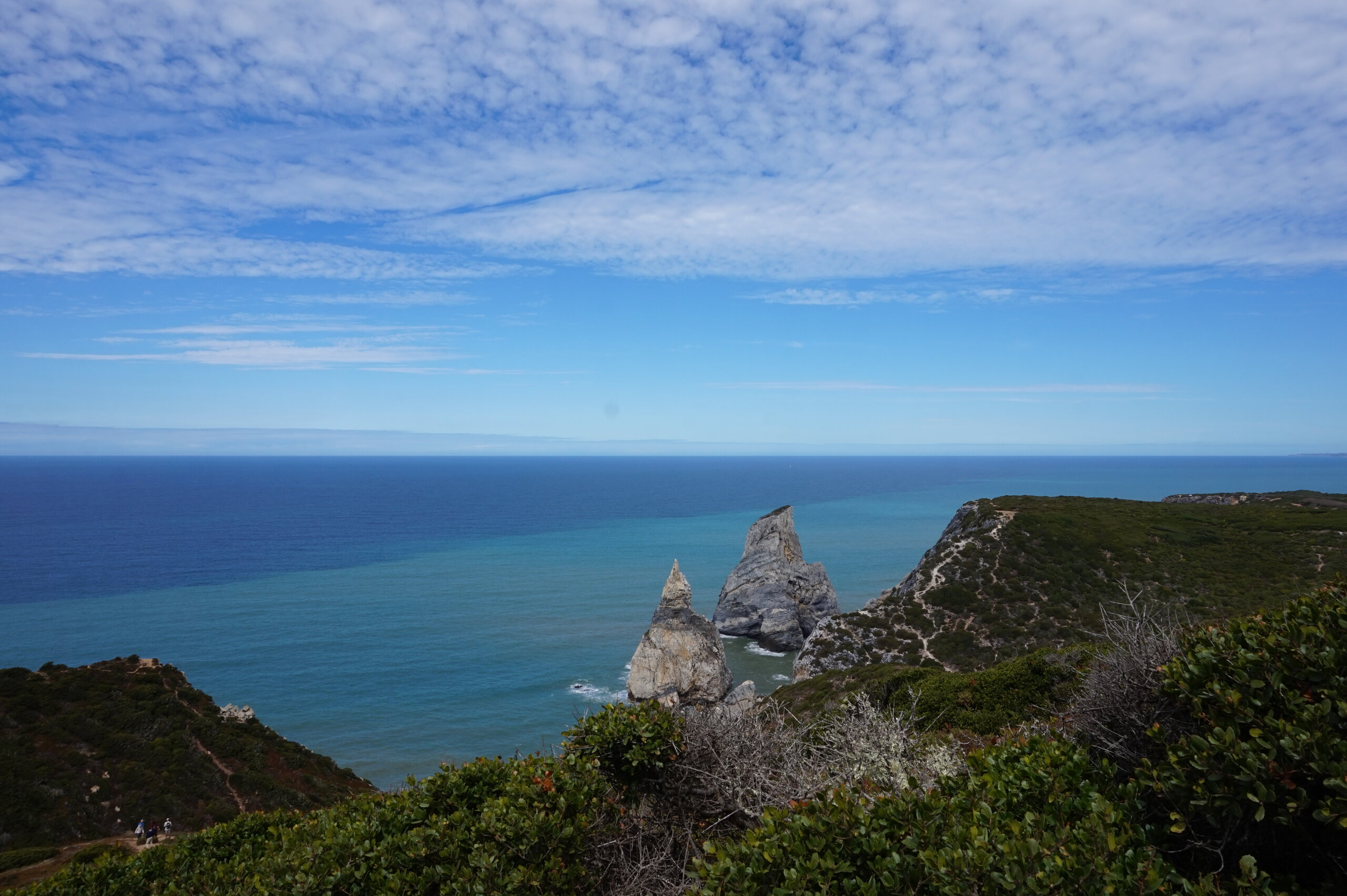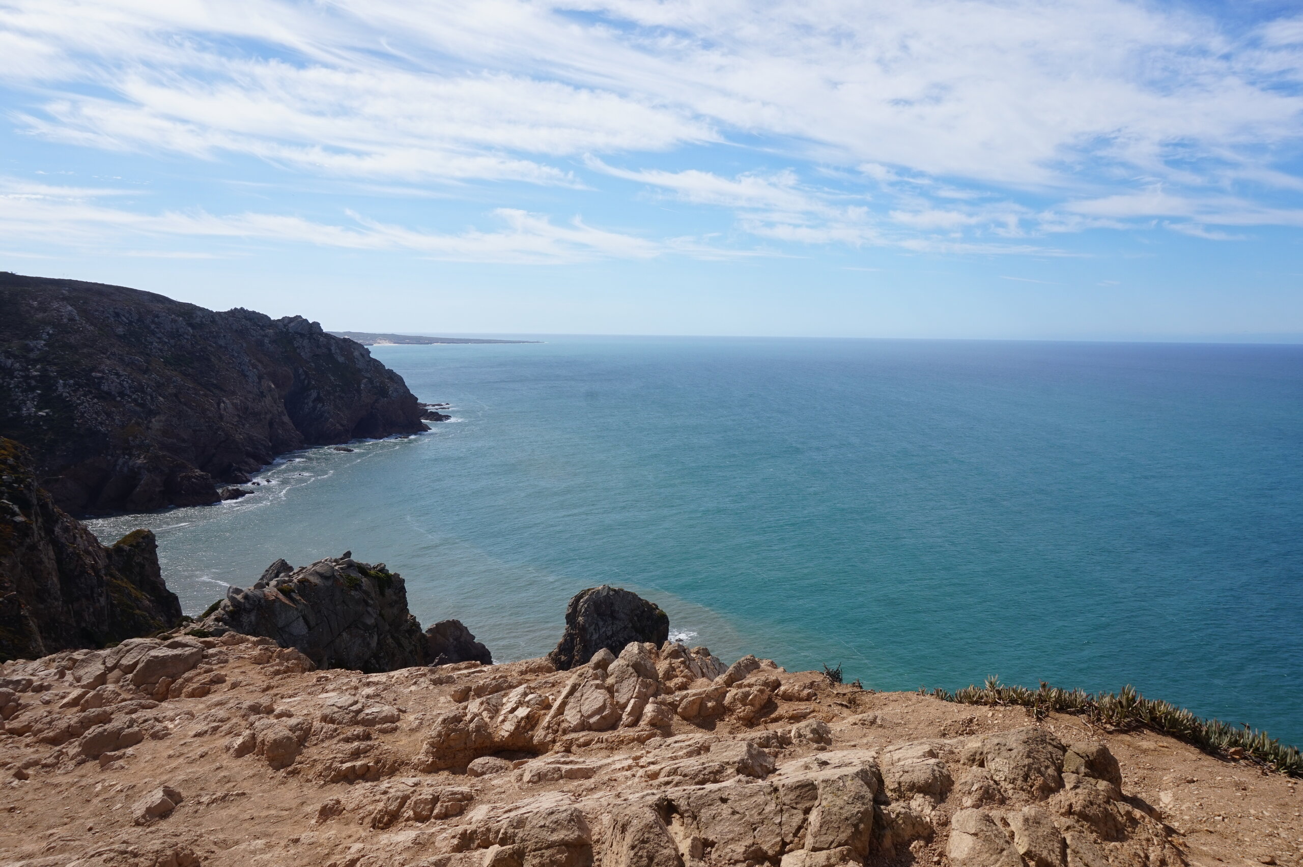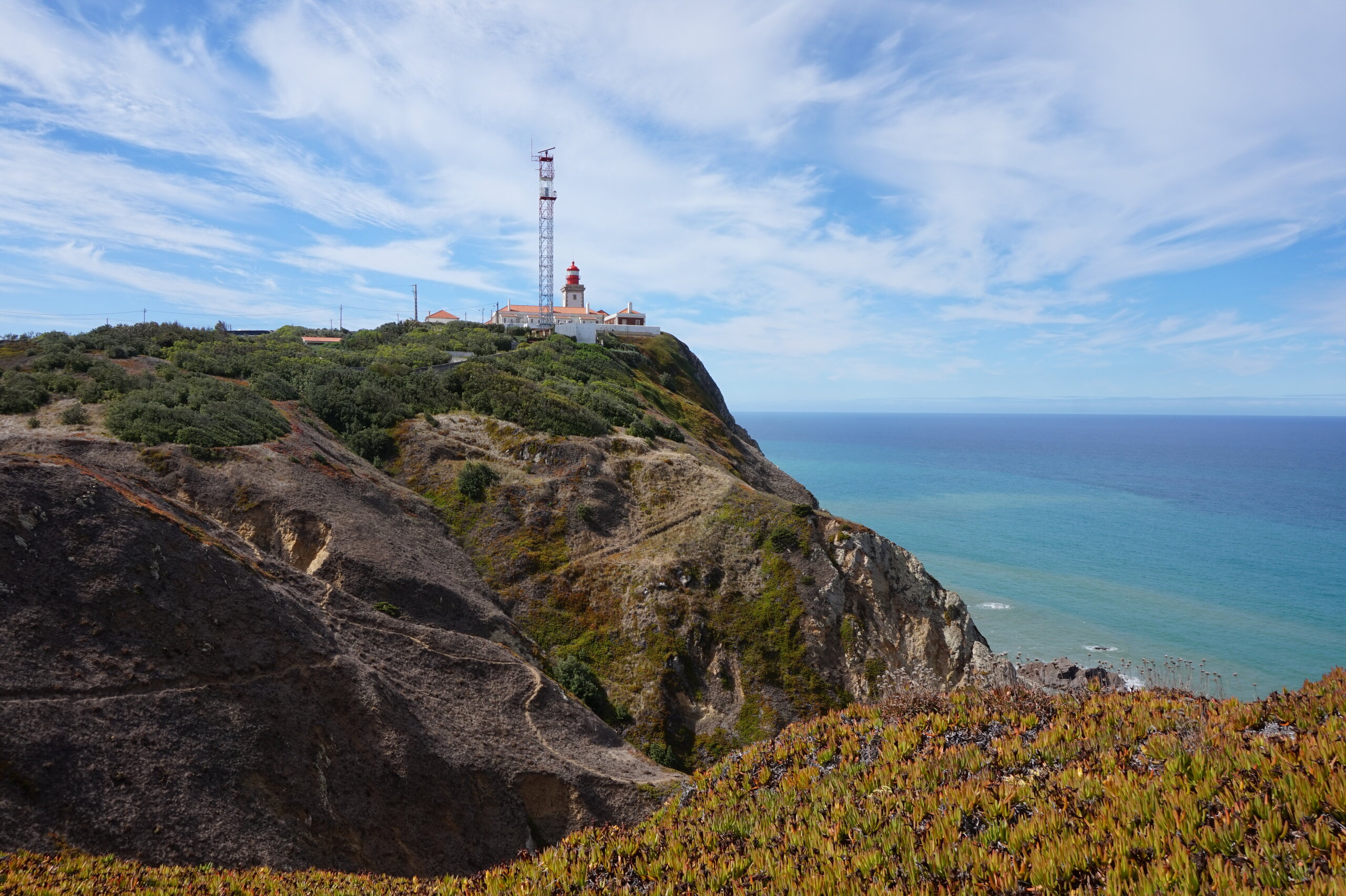 Добавлю немного фото мыса Рока. Галина подробно рассказала, но у нас был такой необыкновенный цвет океана, больше в поездке такого цвета не было. Непередаваемые ощущения, когда стоишь на краю земли. Недалеко от мыса Рока один из красивейших пляжей Португалии- пляж медведицы(прайя да урса) и мы решили до него дойти. Сначала было идти легко по тропинке, потом вот такая горка, с неё мы спутились. Вот уже и скалы пляжа вроде бы близко, но очень крутой спуск, а мы торопились ещё попасть в этот день в прекрасный замок Монсератт. И к сожалению дальше не пошли.